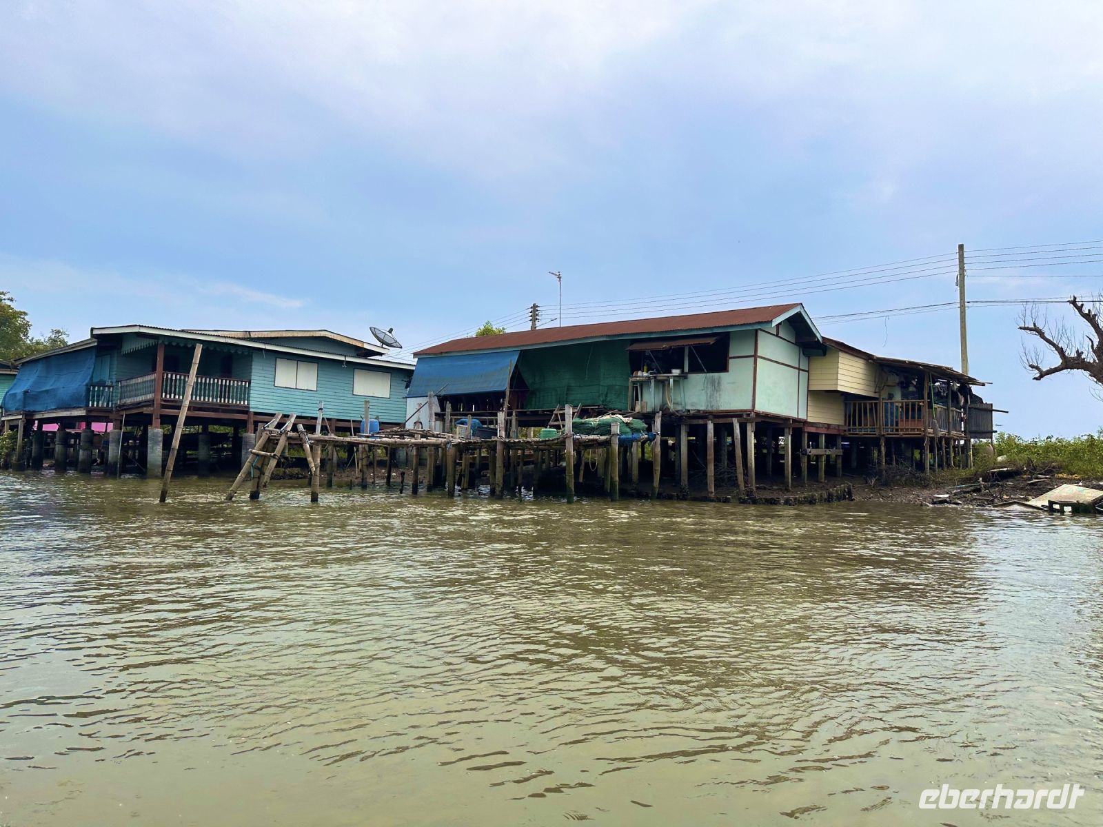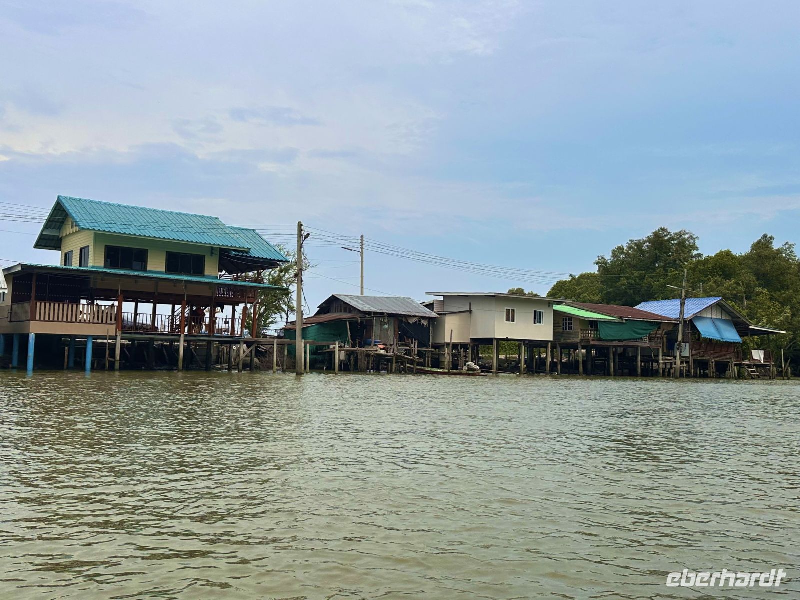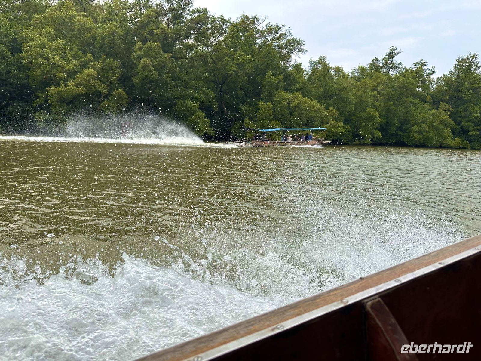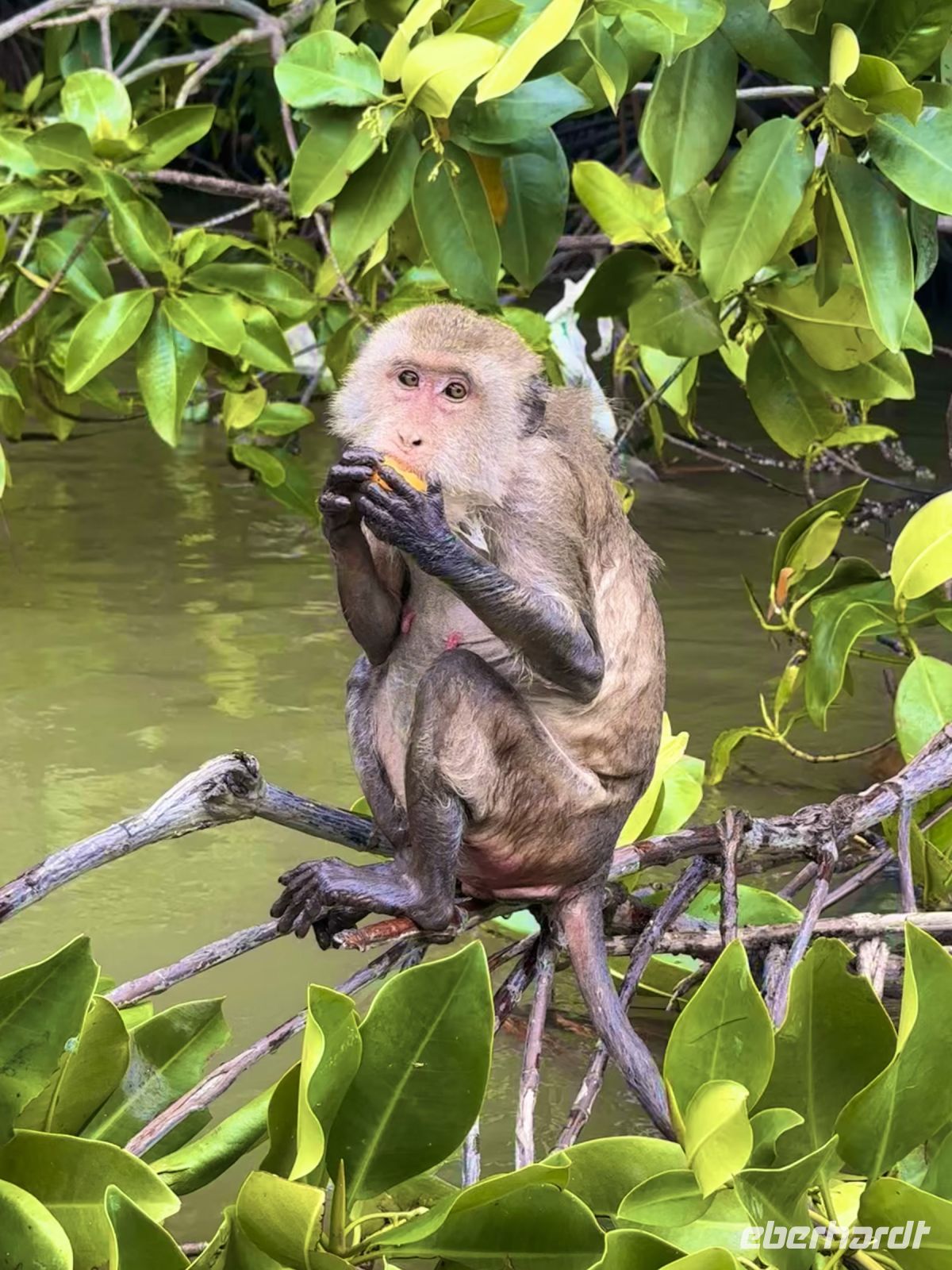 Unsere Fahrt führt uns nun weiter zum Mittagessen in einer sehr ruhig gelegenen Gaststätte am Fluss, bevor wir wieder in Longtailboote steigen und eingetrübt durch den Mangrovenwald machen der dann aufs offene Meer mündet. Die Besonderheit bei dieser Bootsfahrt sind die vielen Affen die in den Mangroven leben und sich mit frischem Obst auch von uns anfüttern lassen. Sie schwimmen bis zu unseren Booten und freuen sich über die Früchte. Ein wirklich sehr lustiges Schauspiel.
