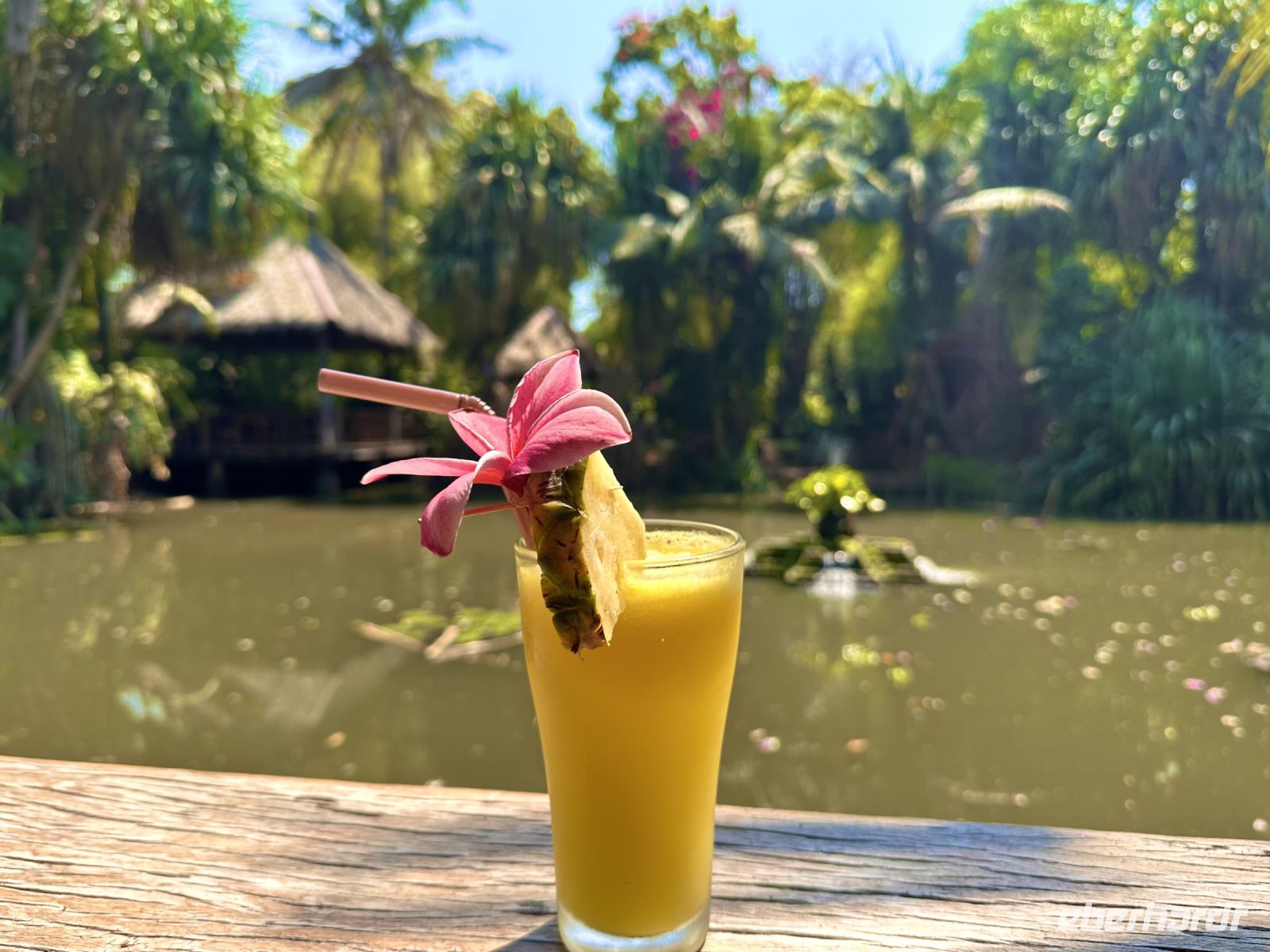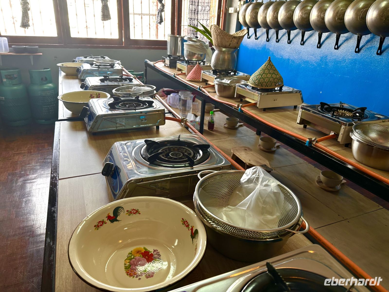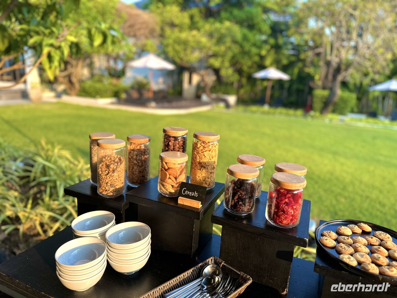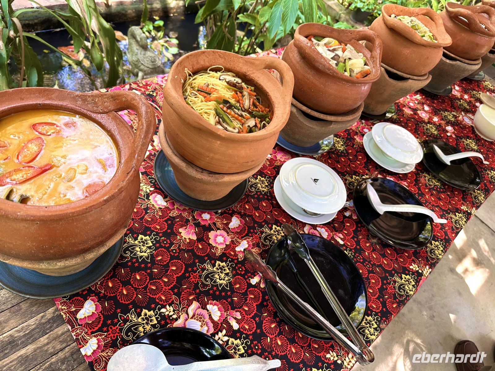 Nachdem wir nun bereits so einiges an Thai-Food verköstigen konnten, wollen wir heute mal schauen wir dies selber auch hinbekommen. Wir wählen aber zuerst den bequemen Weg und genießen das große Frühstücks-Buffett auf der Flussterrasse unseres Hotels.