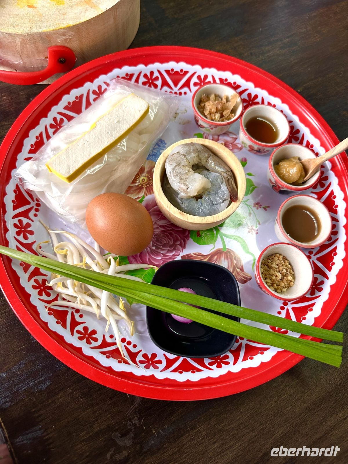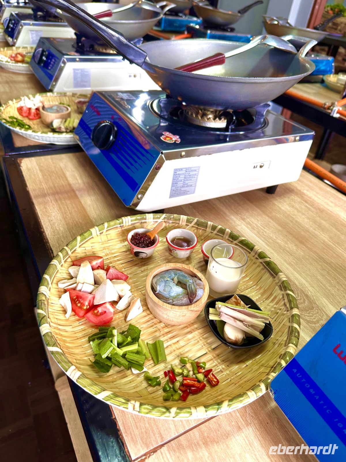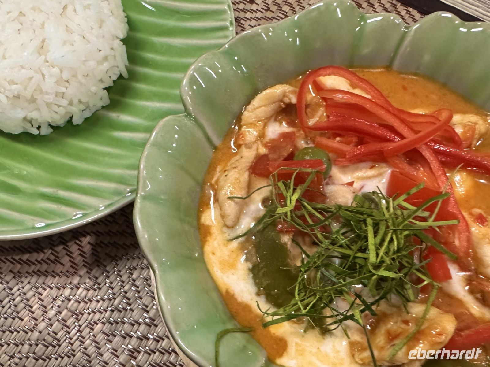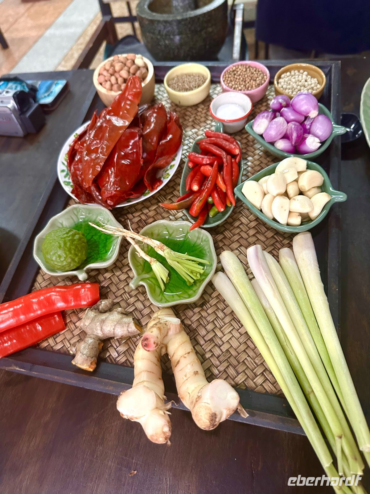 Damit wir gleich viele Eindrücke vom thailändischen Essen erhalten, wird uns die Tafel vollgestellt mit allem, was die Karte so hergibt und jeder kann von allem kosten.