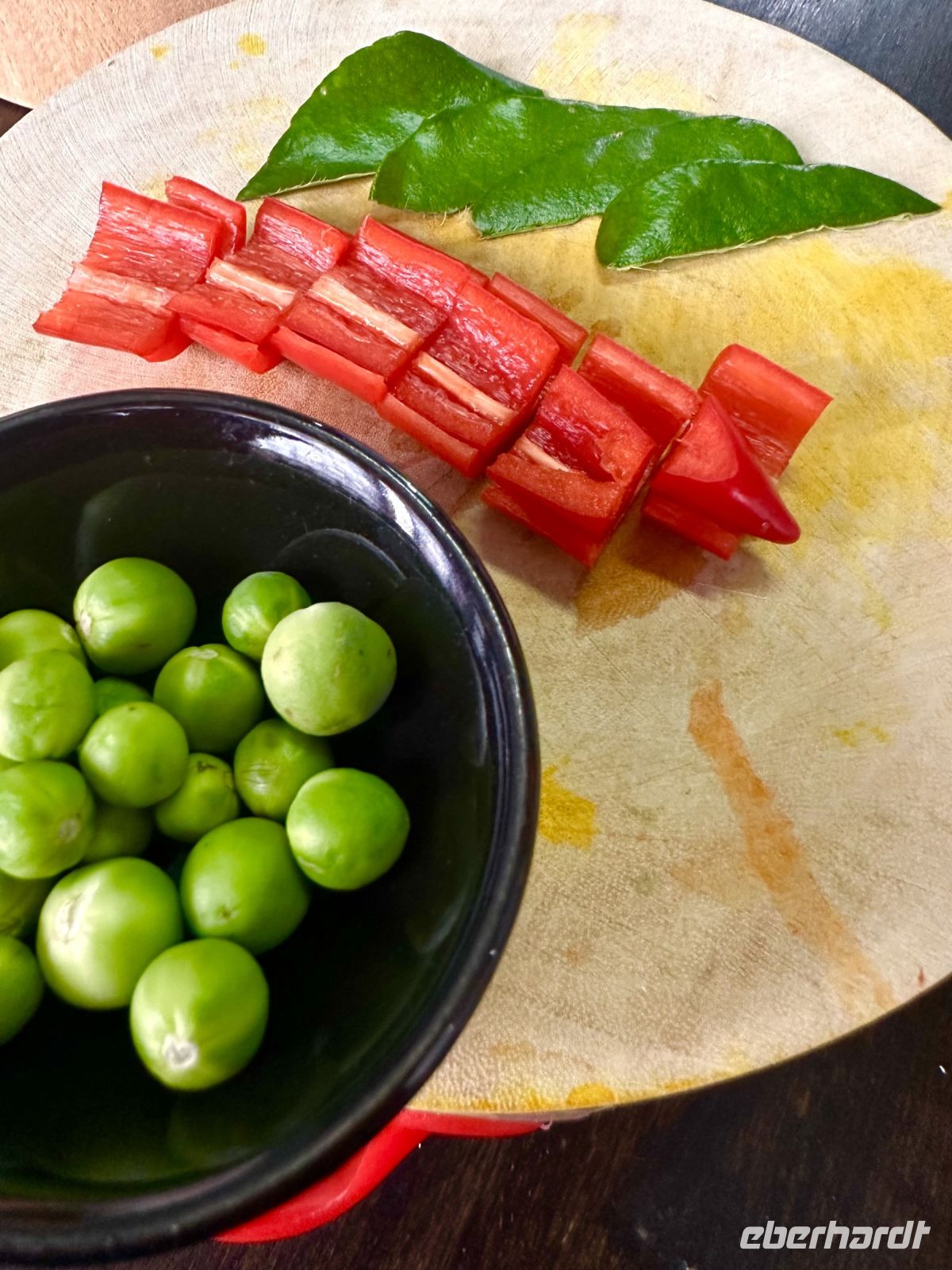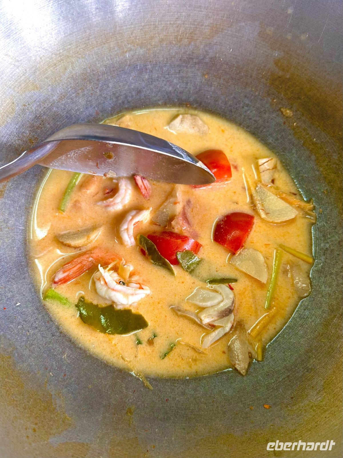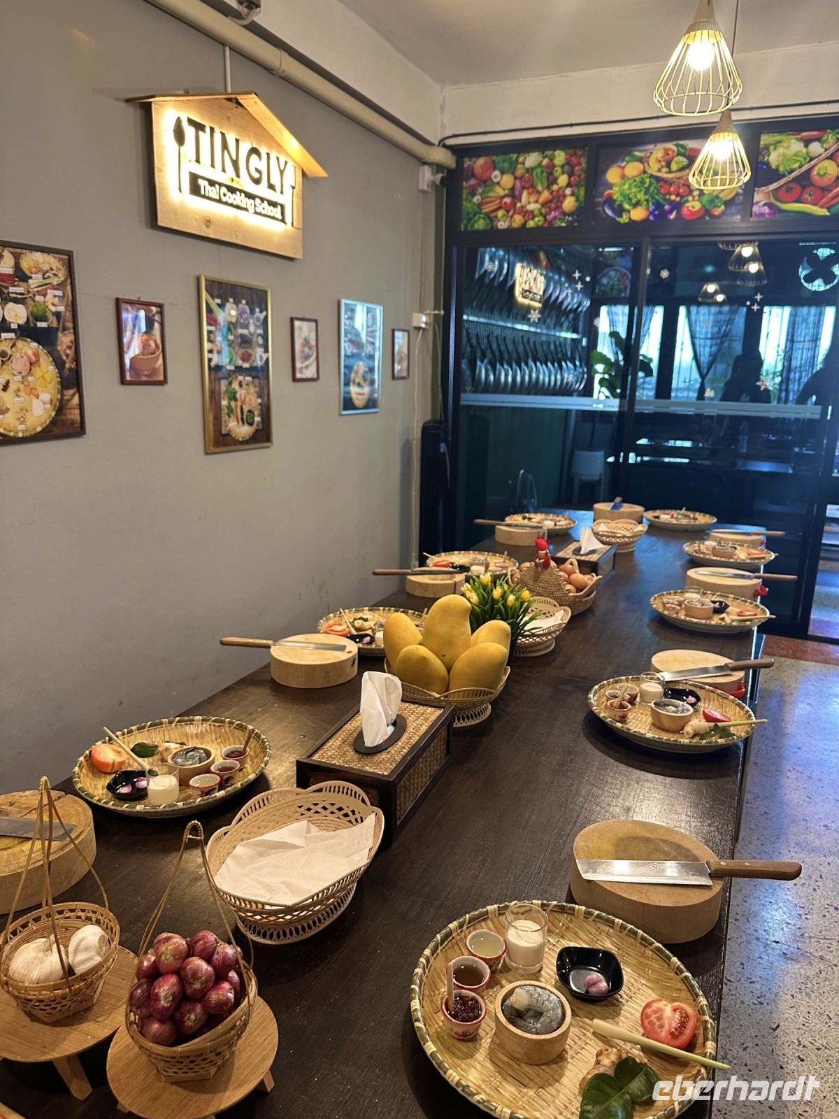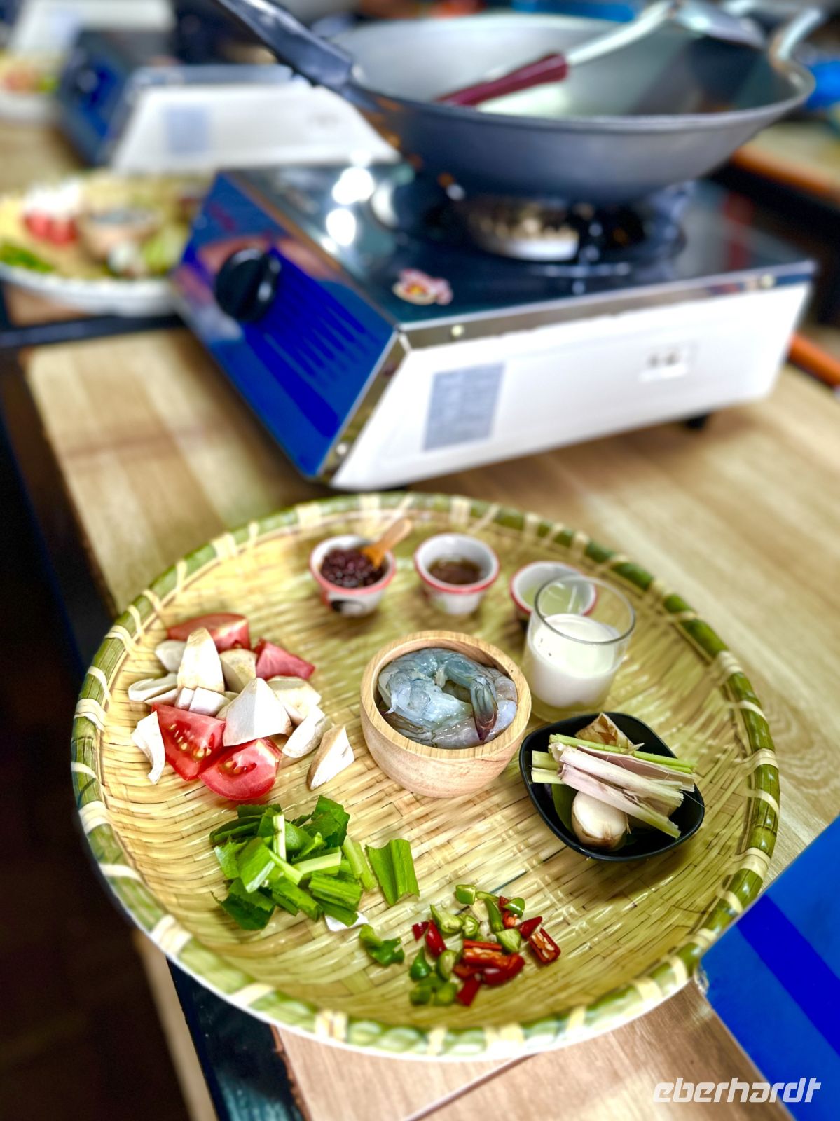 Damit wir gleich viele Eindrücke vom thailändischen Essen erhalten, wird uns die Tafel vollgestellt mit allem, was die Karte so hergibt und jeder kann von allem kosten.