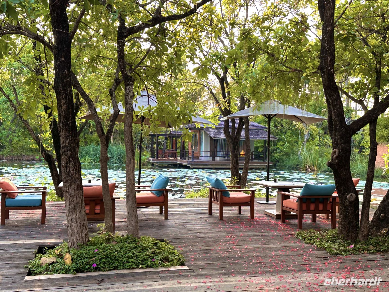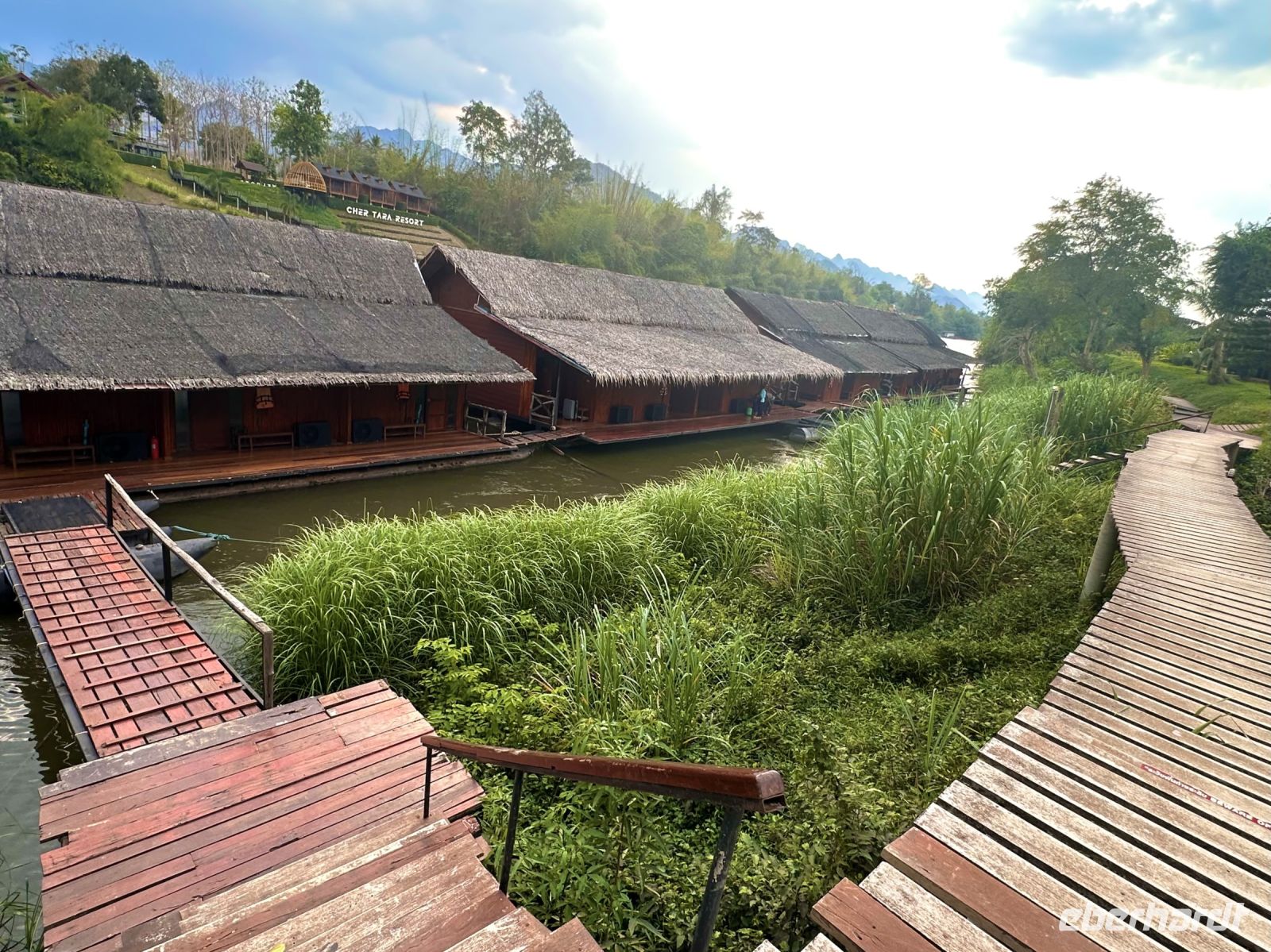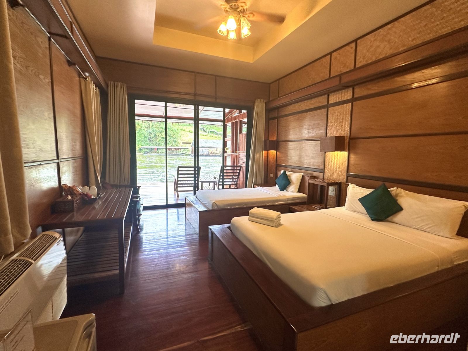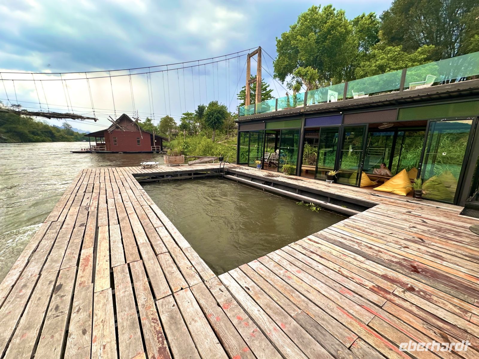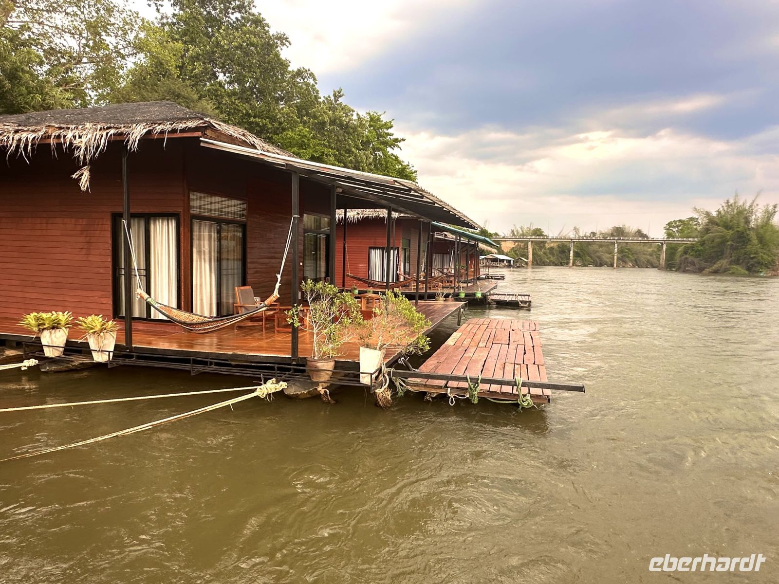 Wir verbringen die nächsten Tage in schwimmenden Bungalows im Fluss Kwai. Die komfortablen Zimmer mitten im Fluss haben je eine eigene Terrasse, die zum Verweilen zu jeder Tageszeit einlädt und so auch von uns intensiv genutzt wird. Der Pool befindet sich ebenfalls im Fluss Kwai in einem abgetrennten Bereich und sogt bei der Wärme für die entsprechende Abkühlung.