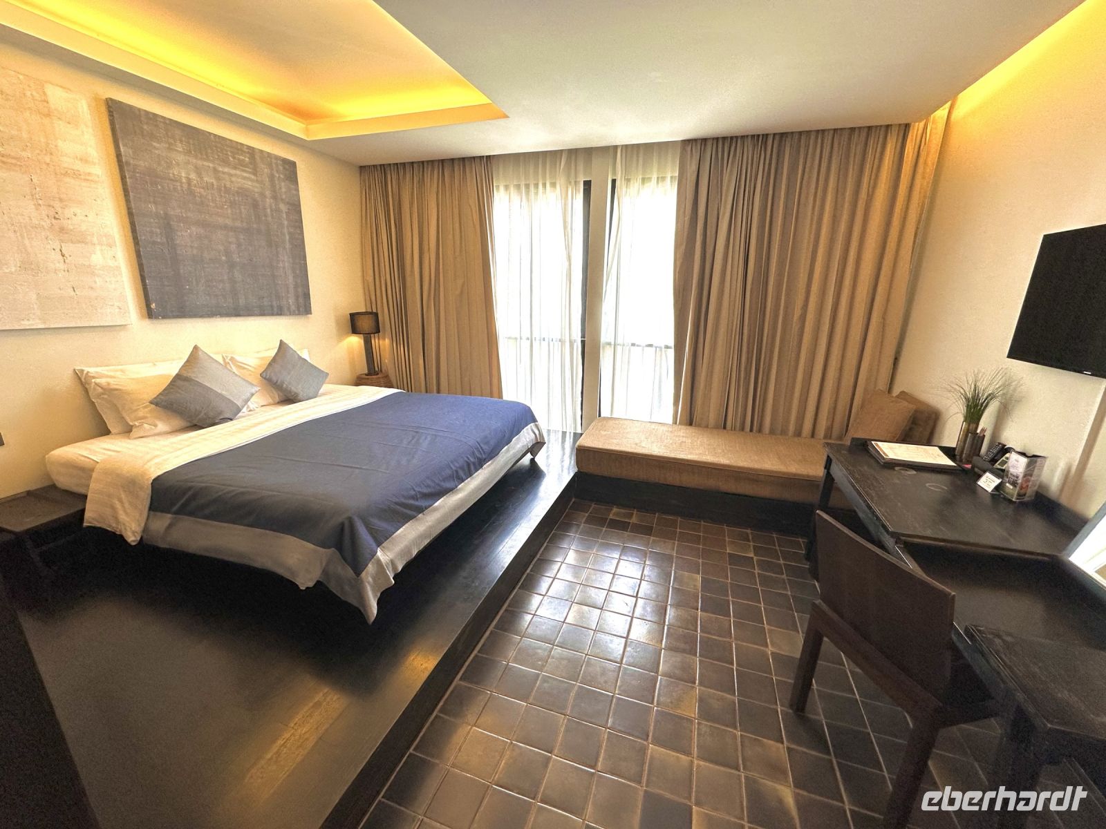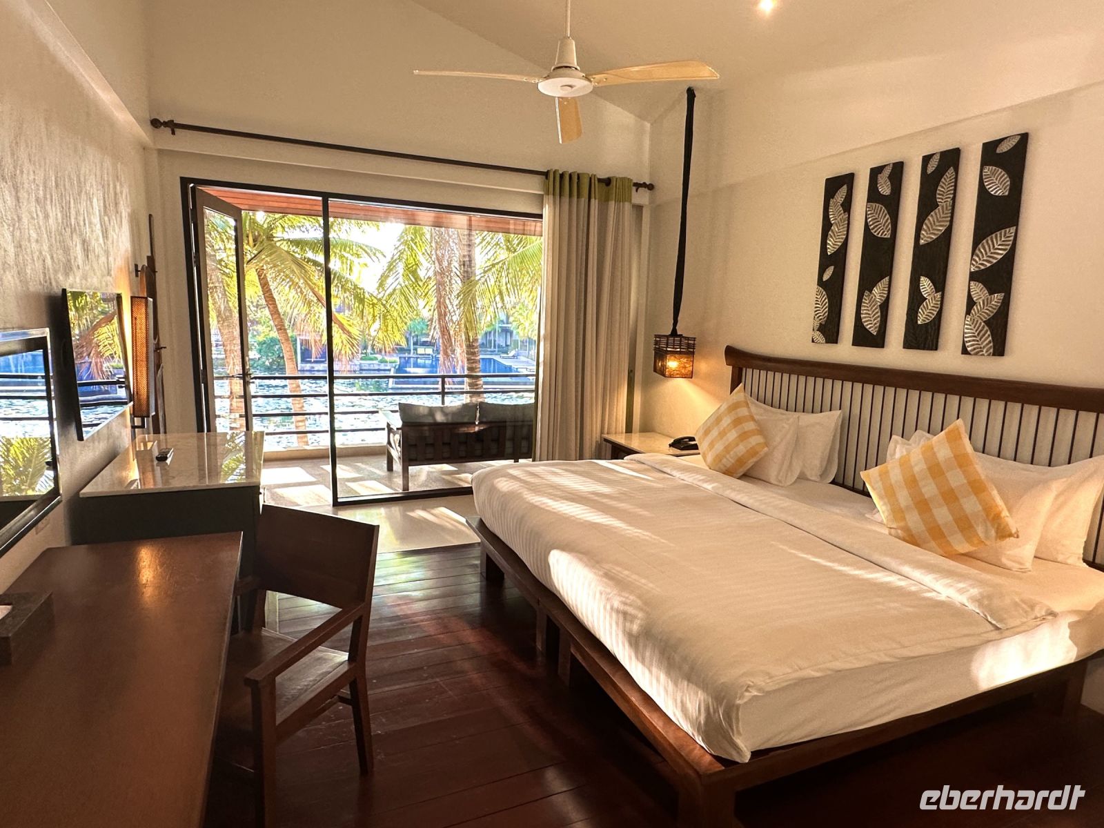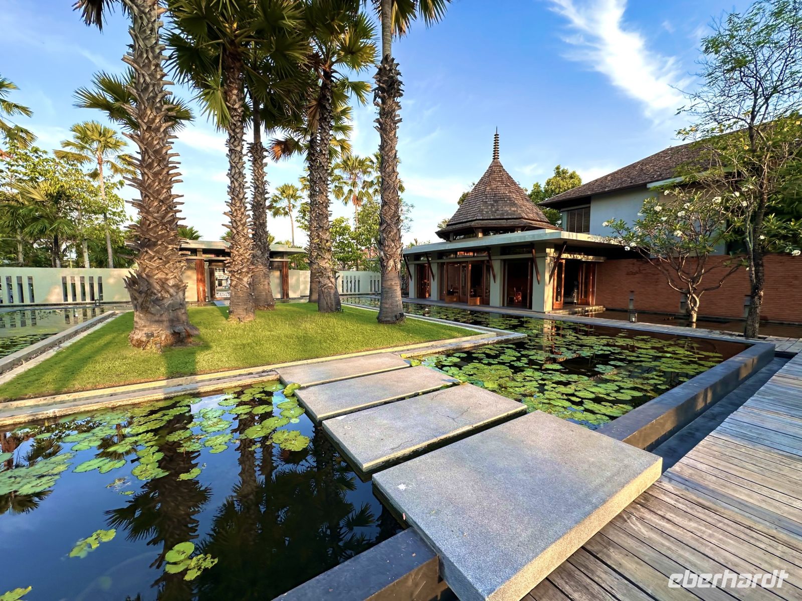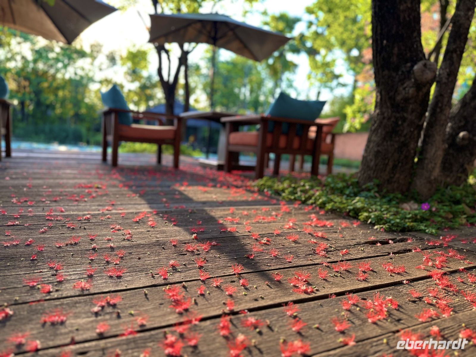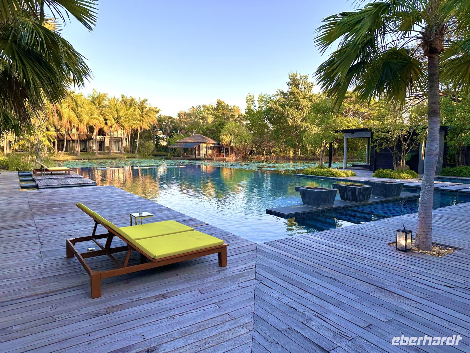 Wir verbringen die nächsten Tage in schwimmenden Bungalows im Fluss Kwai. Die komfortablen Zimmer mitten im Fluss haben je eine eigene Terrasse, die zum Verweilen zu jeder Tageszeit einlädt und so auch von uns intensiv genutzt wird. Der Pool befindet sich ebenfalls im Fluss Kwai in einem abgetrennten Bereich und sogt bei der Wärme für die entsprechende Abkühlung.
