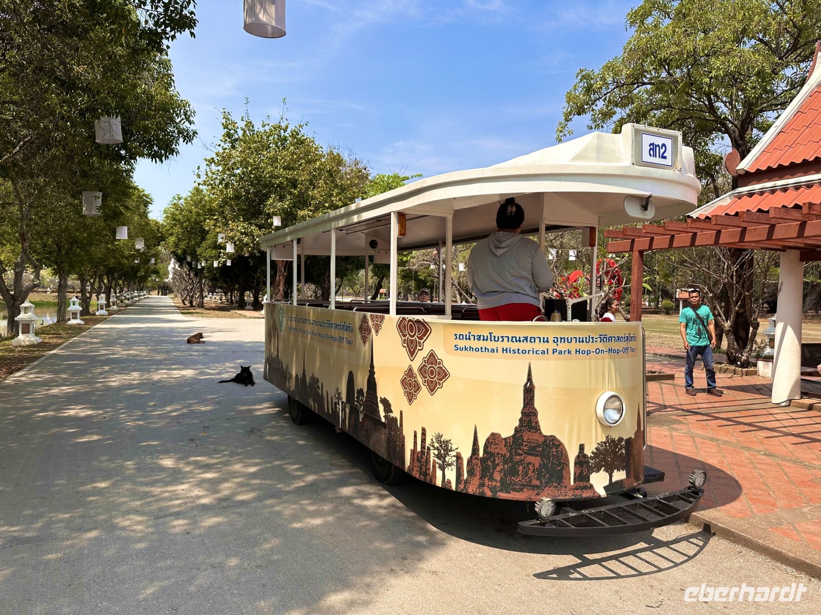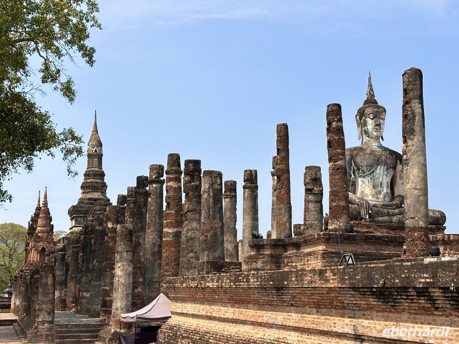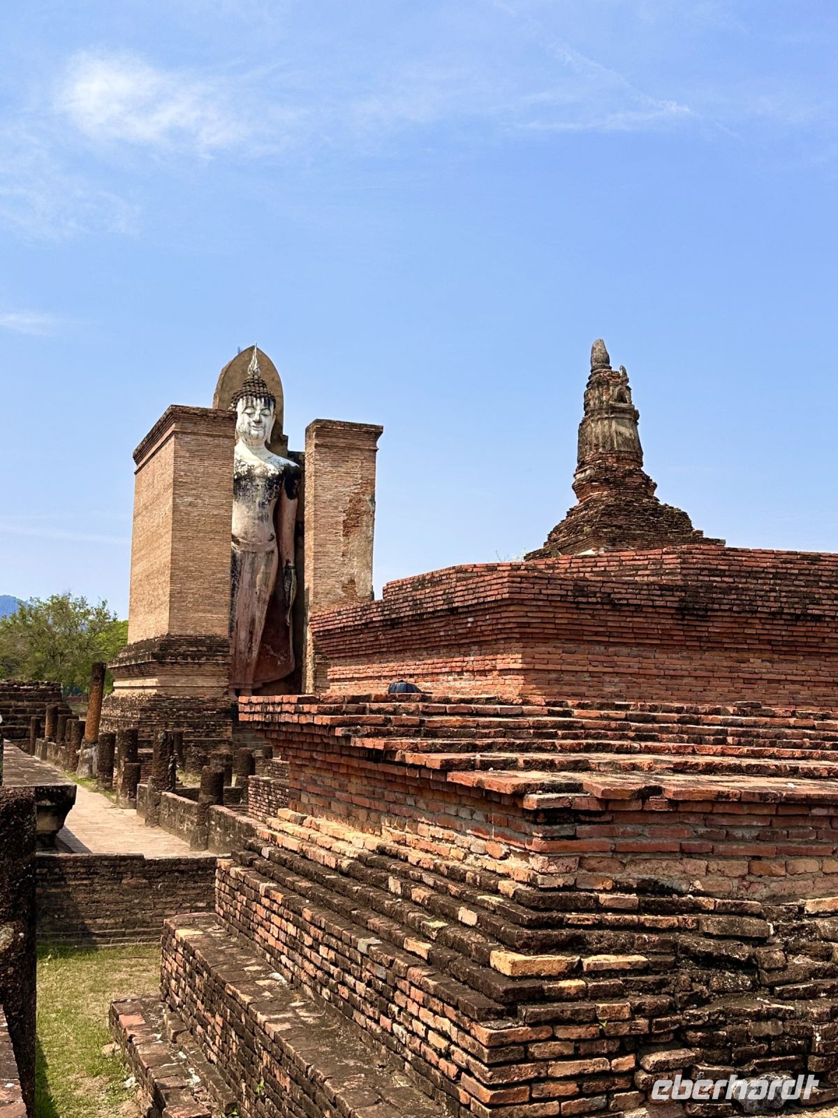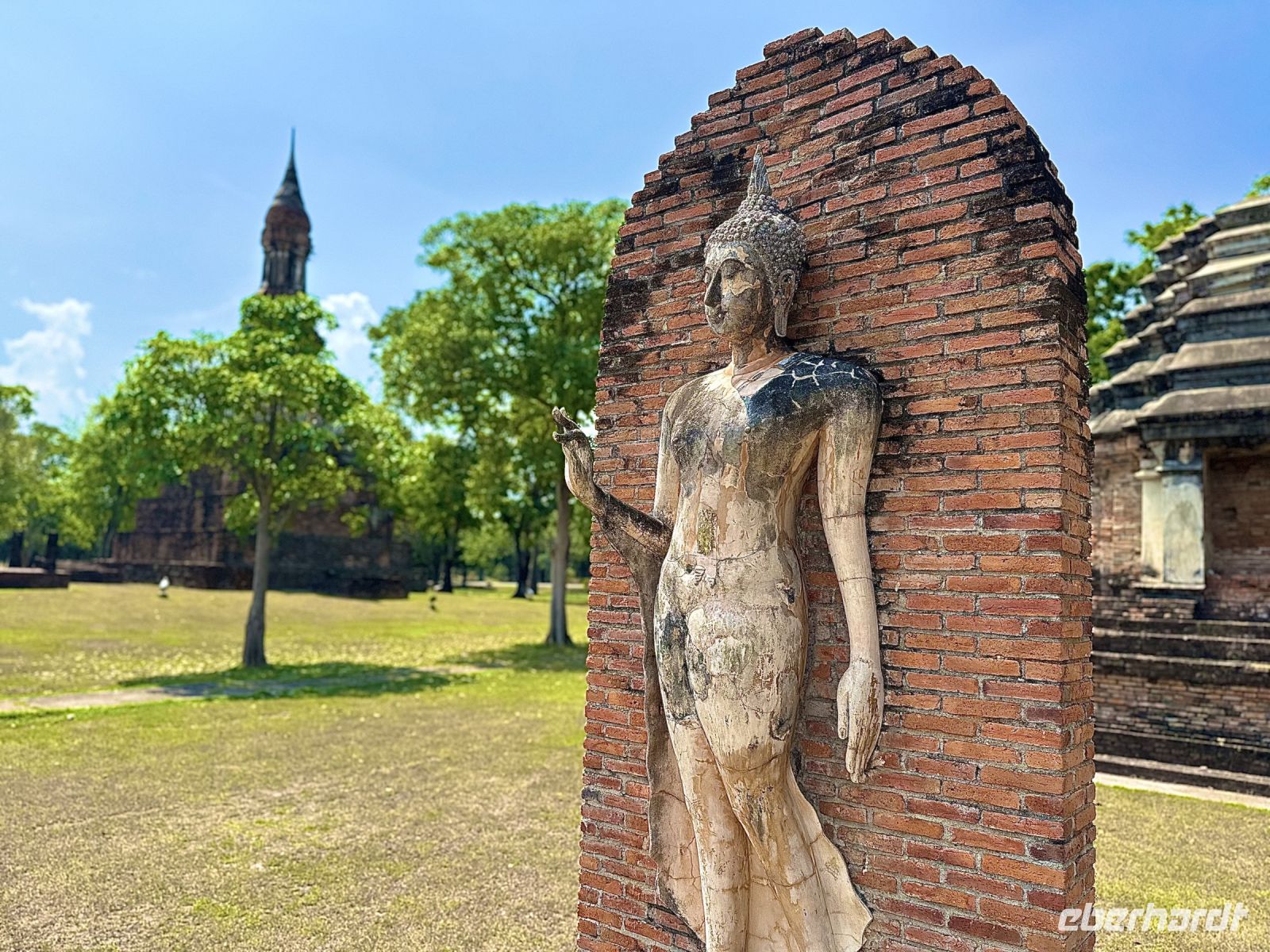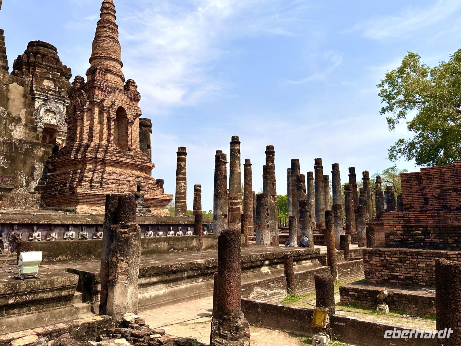 Auf unserem weiteren Weg durch die thailändische Landschaft entlang an Reisfeldern lassen wir uns deren Anbau von unserem Reiseleiter erklären und kommen nach Sukothai. In der riesigen Parkanlage besichtigen wir die Tempelruinen und genießen in den weitläufigen Anlagen die Ruhe. Auf Grund der Mittagssonne entscheiden wir uns die Anlage mit einer elektrischen Mini-Tram zu erkunden. Alternativ hätten wir dies aber auch mit dem Rad oder zu Fuß machen können.