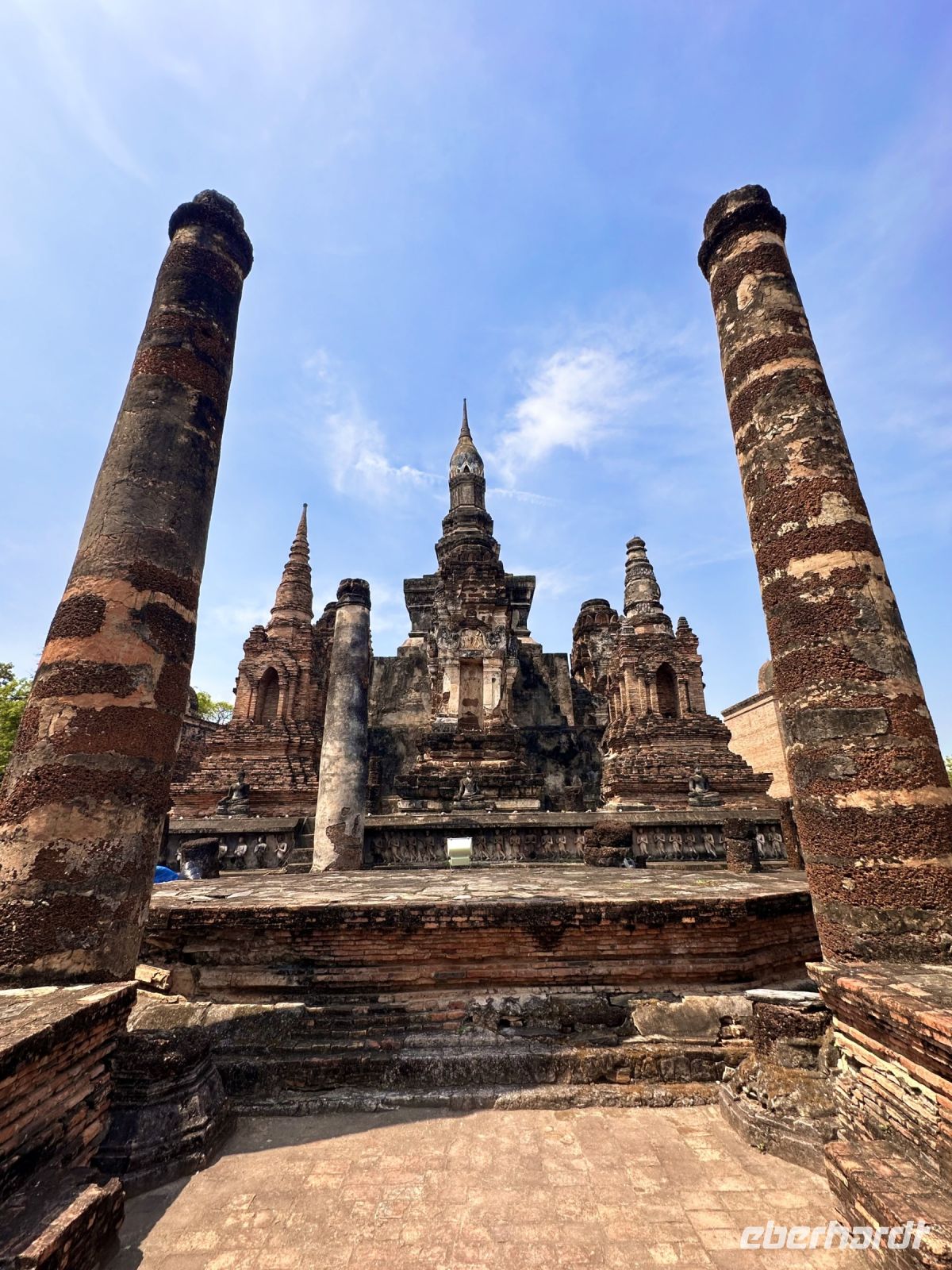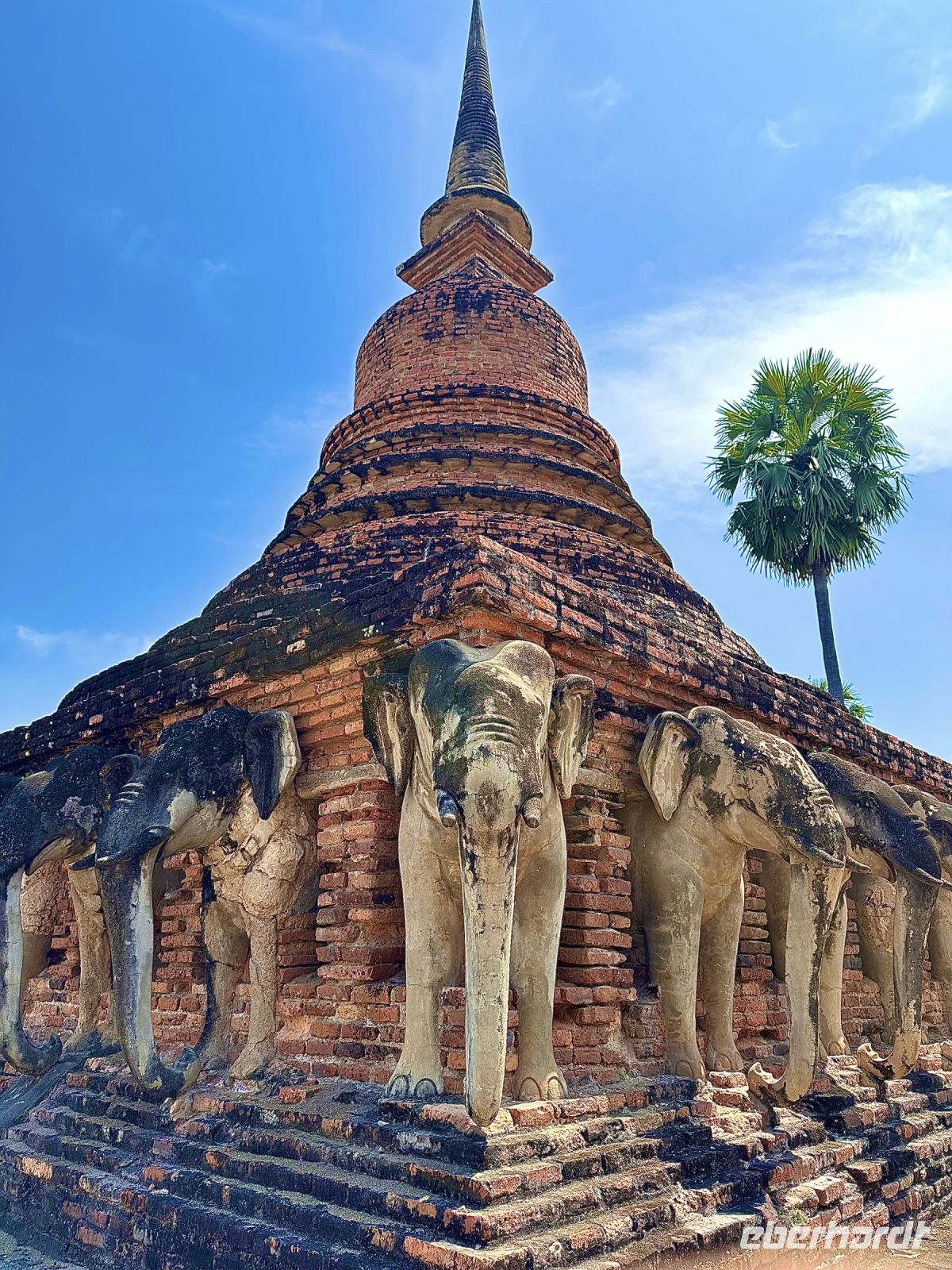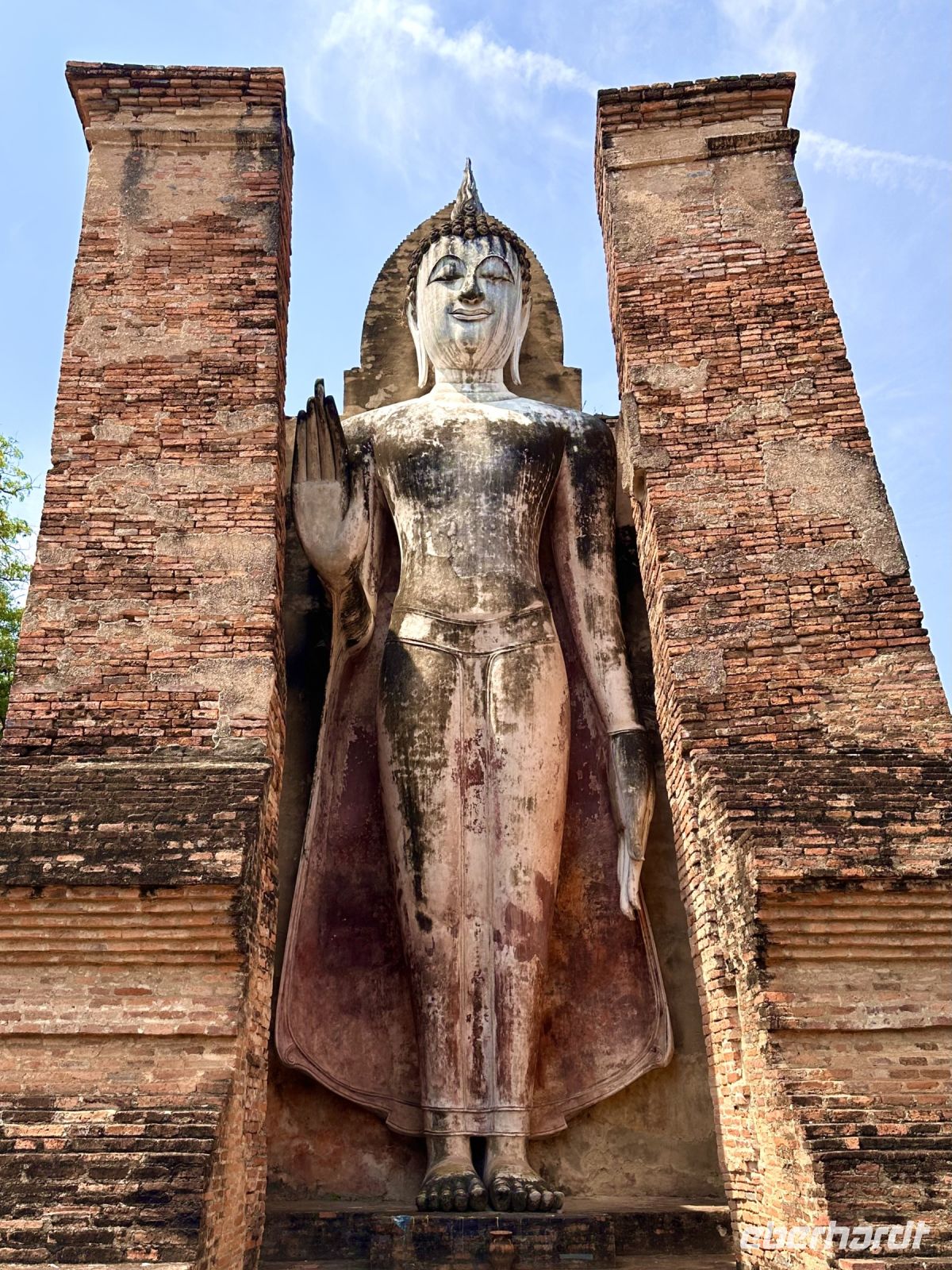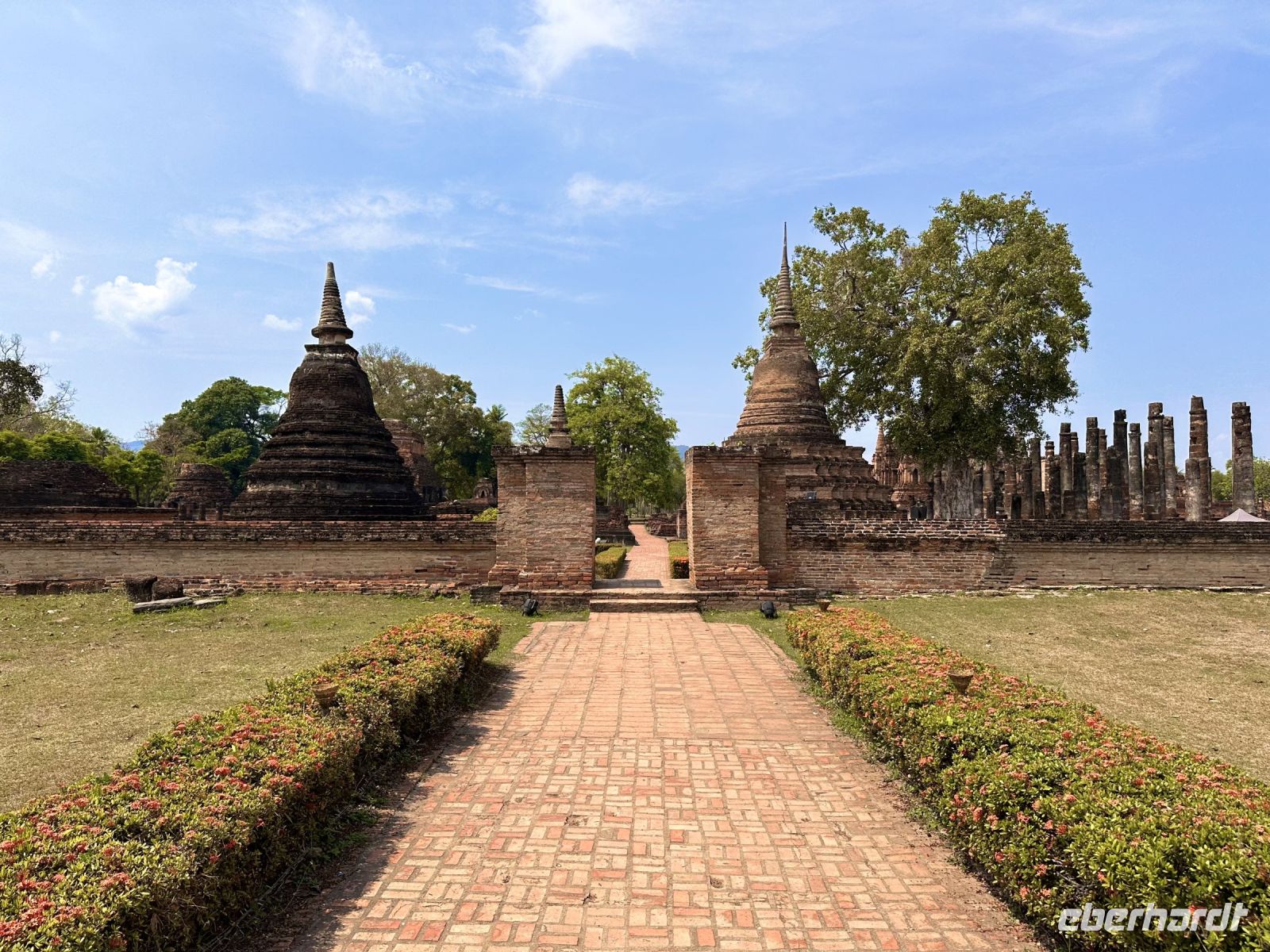 Auf unserem weiteren Weg durch die thailändische Landschaft entlang an Reisfeldern lassen wir uns deren Anbau von unserem Reiseleiter erklären und kommen nach Sukothai. In der riesigen Parkanlage besichtigen wir die Tempelruinen und genießen in den weitläufigen Anlagen die Ruhe. Auf Grund der Mittagssonne entscheiden wir uns die Anlage mit einer elektrischen Mini-Tram zu erkunden. Alternativ hätten wir dies aber auch mit dem Rad oder zu Fuß machen können.