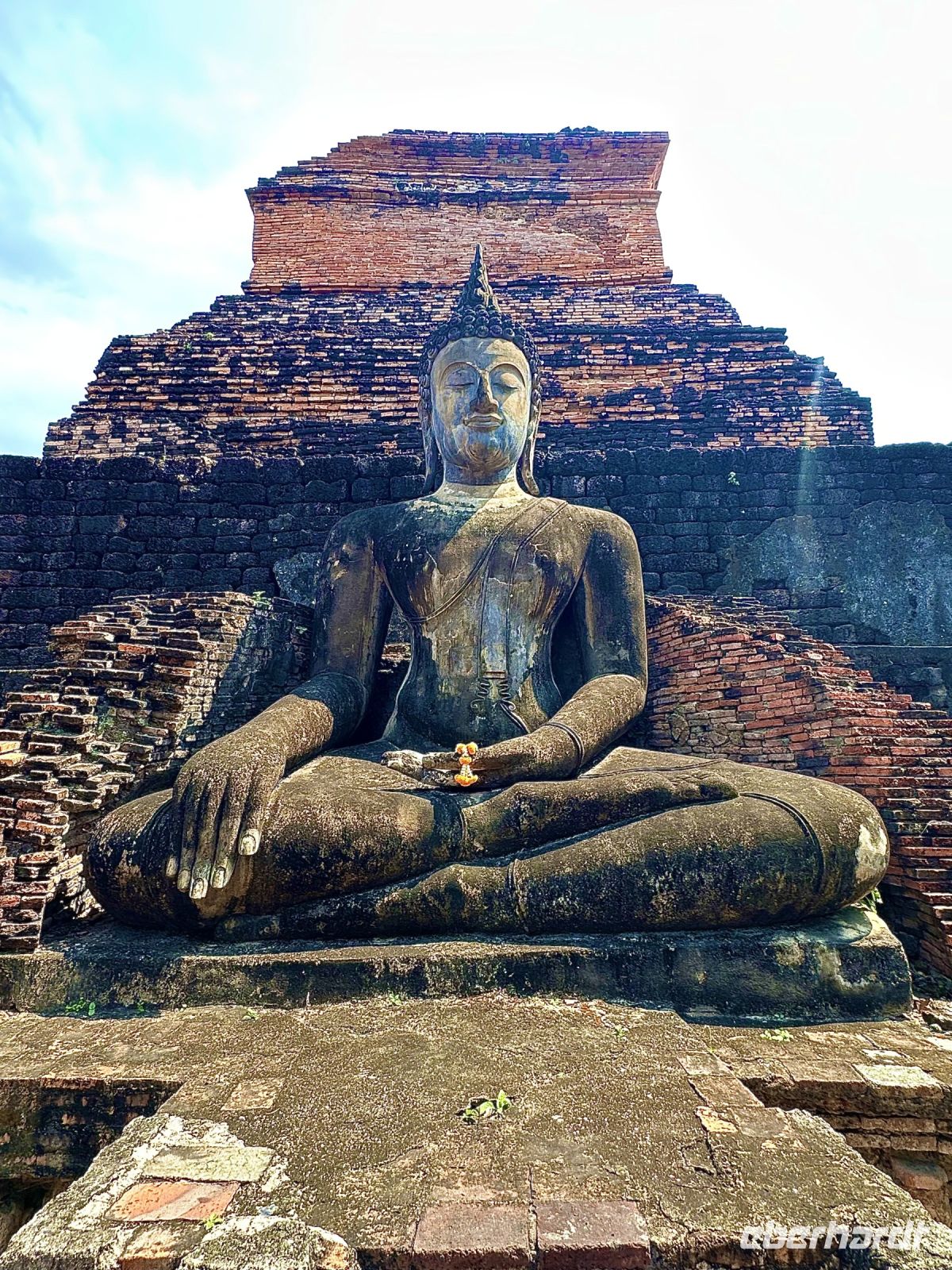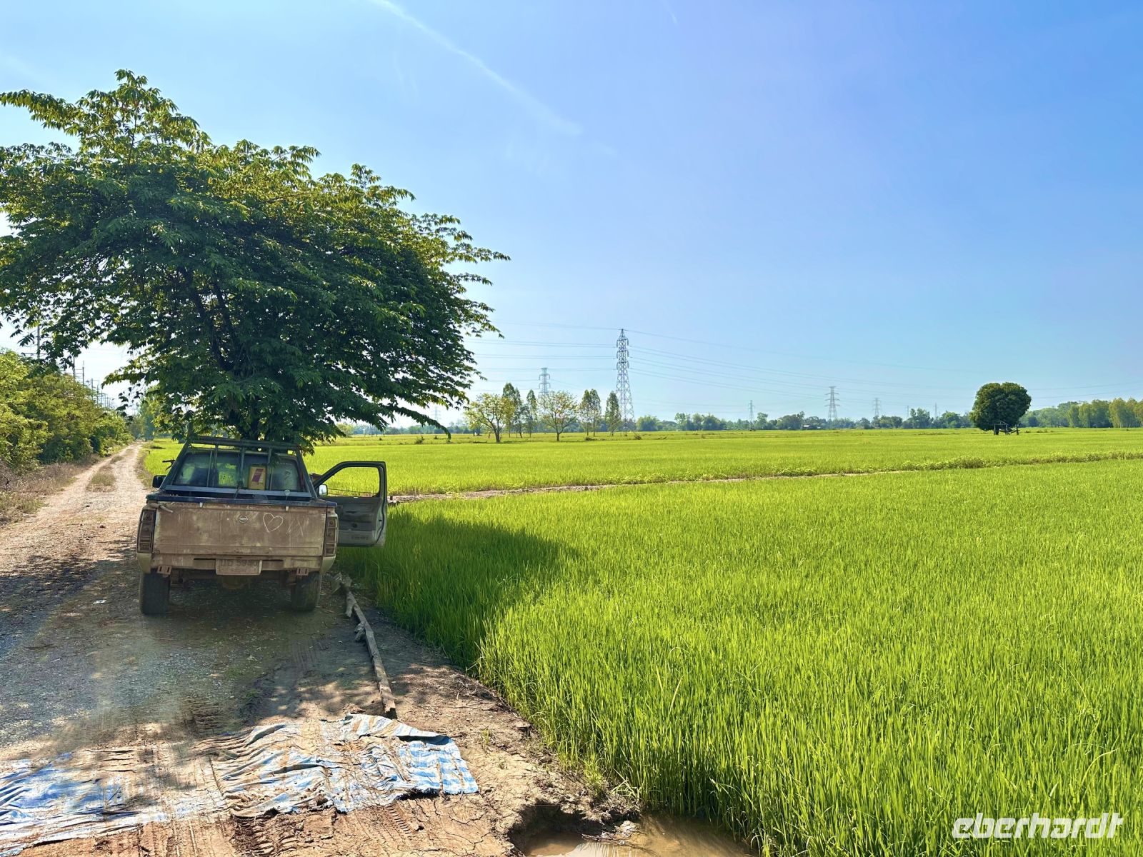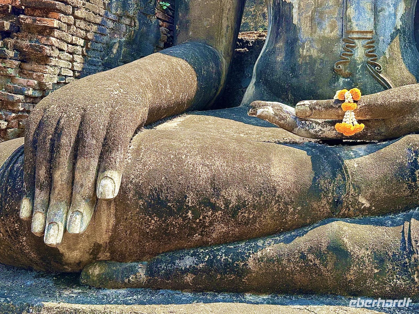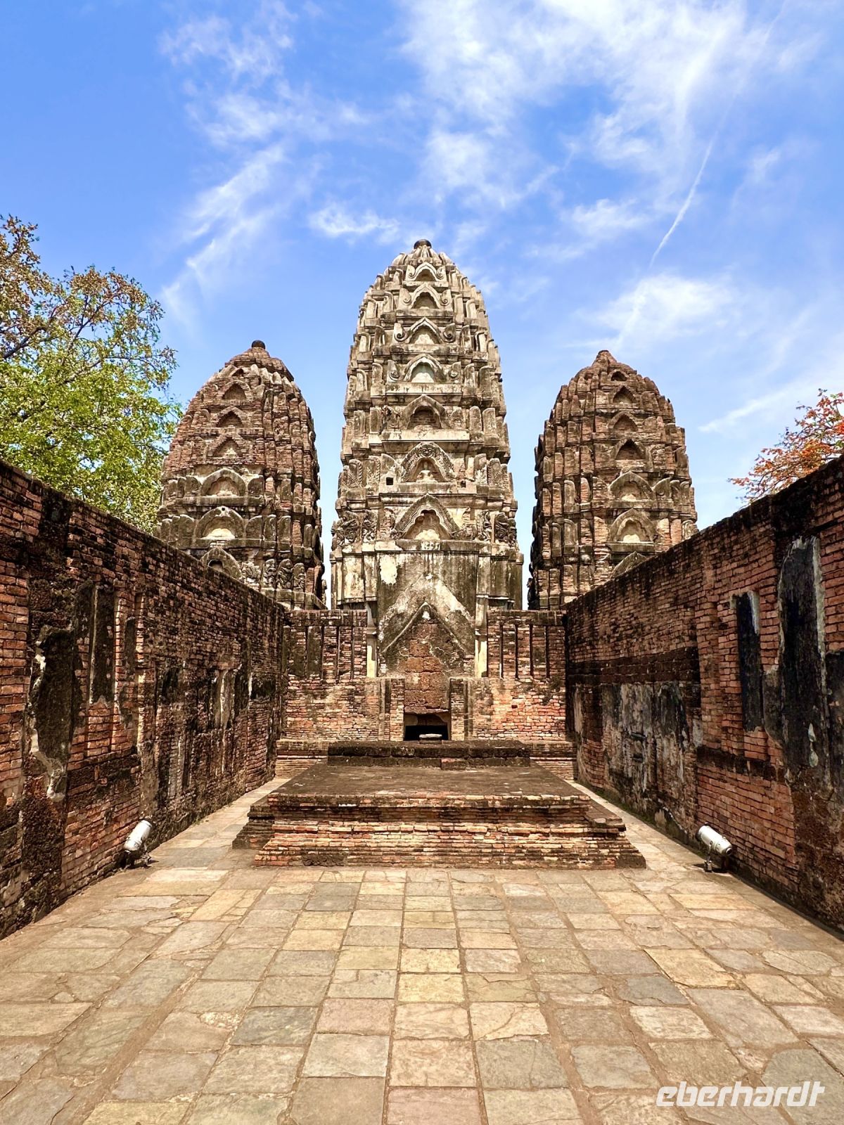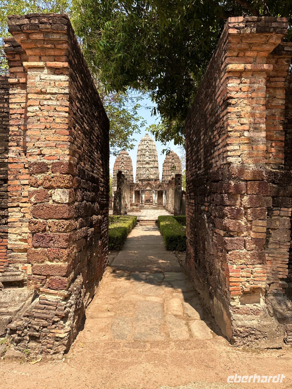 Auf unserem weiteren Weg durch die thailändische Landschaft entlang an Reisfeldern lassen wir uns deren Anbau von unserem Reiseleiter erklären und kommen nach Sukothai. In der riesigen Parkanlage besichtigen wir die Tempelruinen und genießen in den weitläufigen Anlagen die Ruhe. Auf Grund der Mittagssonne entscheiden wir uns die Anlage mit einer elektrischen Mini-Tram zu erkunden. Alternativ hätten wir dies aber auch mit dem Rad oder zu Fuß machen können.