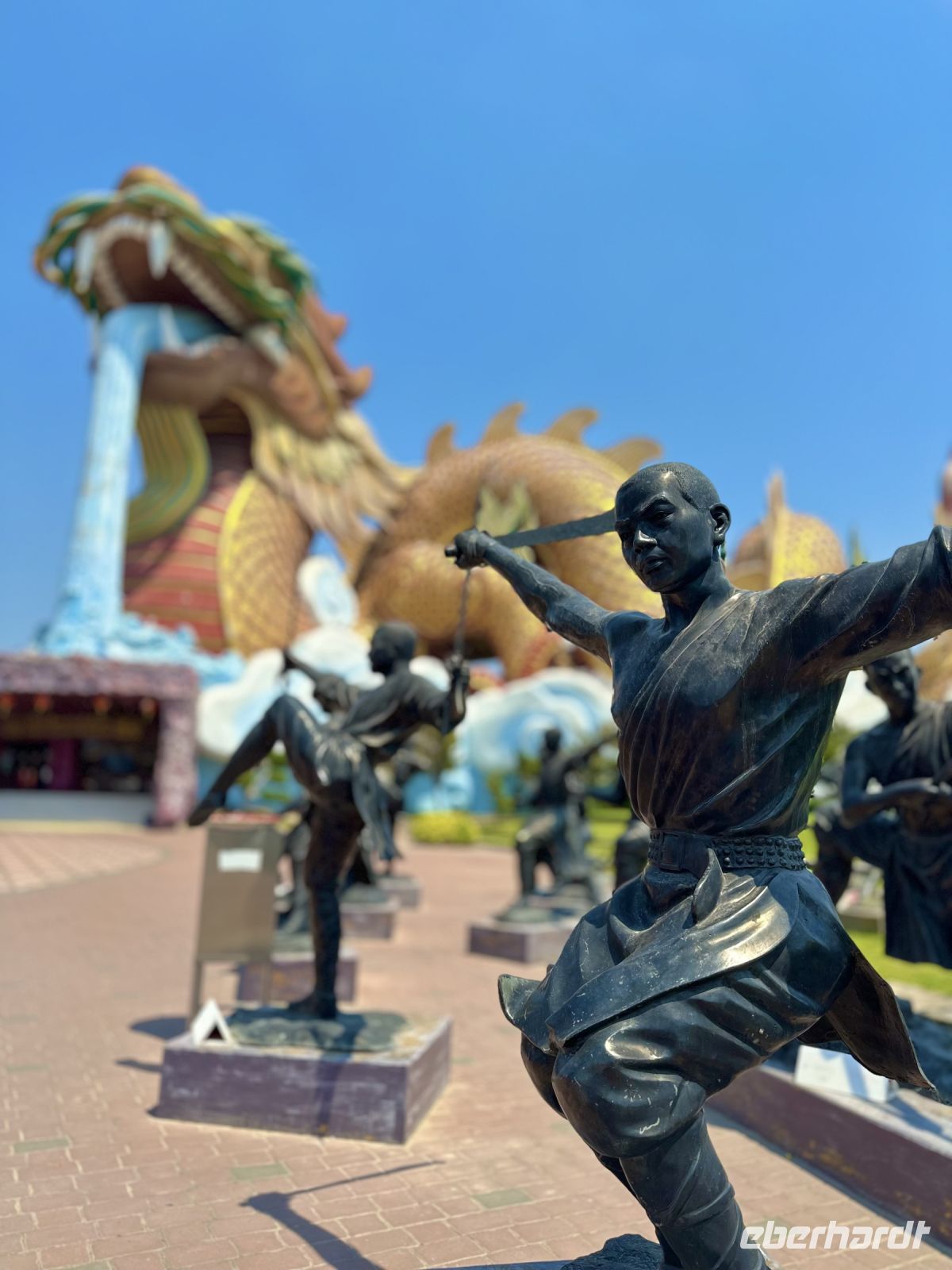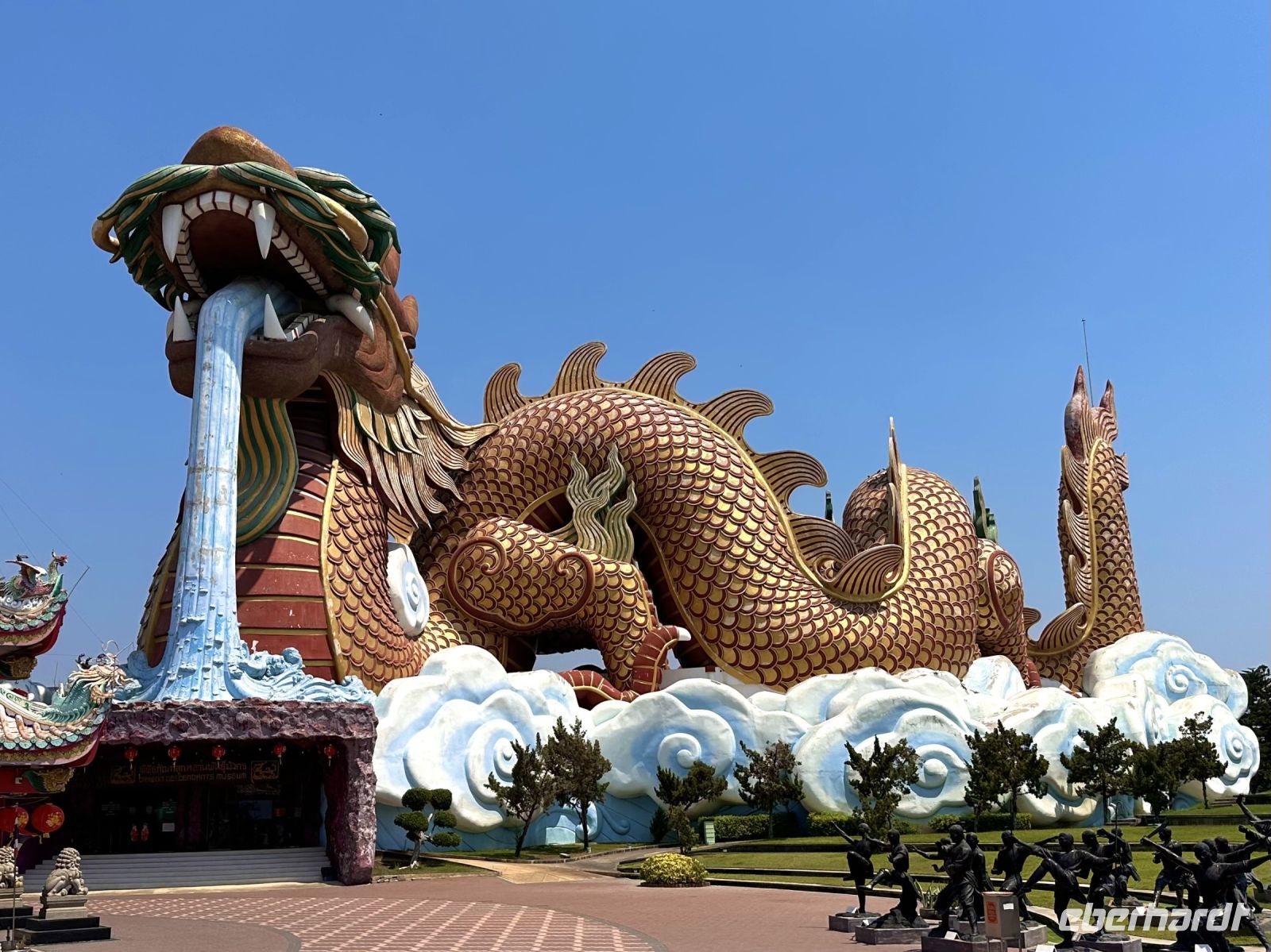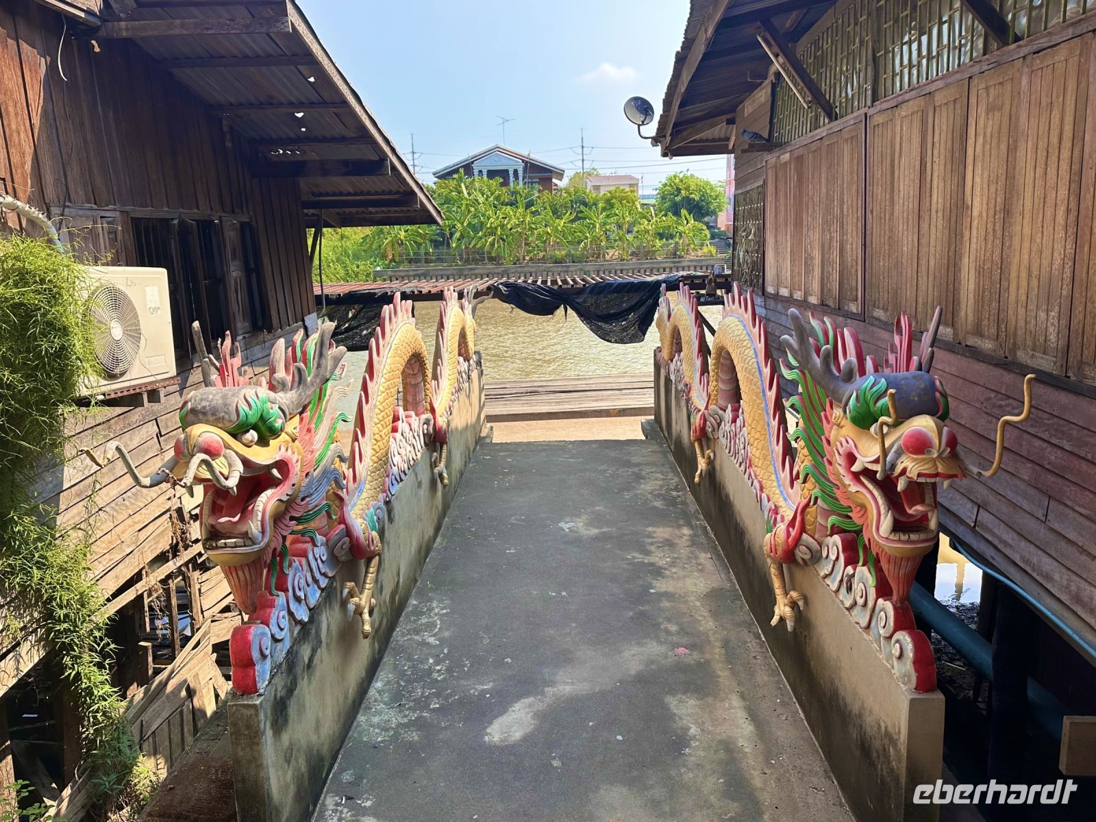 Wir starten heut nach dem Frühstück zum Markt in Sum Chuck. Dieser erstreckt sich durch mehrere Gassen inmitten über hundert Jahre alten Holzhäusern. Wir naschen wieder hier und das und finden auch das eine oder andere Souvenir zum Mitnehmen. Später geht unsere Fahrt weiter nach Suphan Buri zum Giant Dragon. Wir nutzen die Mittagszeit erst zum Essen in einem ausgesuchten thailändischen Restaurant um anschließend gestärkt die Anlage des Giant Dragon zu erkunden. Unsere Mittagsruhe finden wir dann wieder in unseren klimatisierten Bussen auf dem Weg nach Kanchanaburi. Hier besichtigen wir die Bahnbrücke über den Fluss Kwai und freuen uns bereits auf unsere neue ganz besondere Unterkunft, die wir heute beziehen werden.