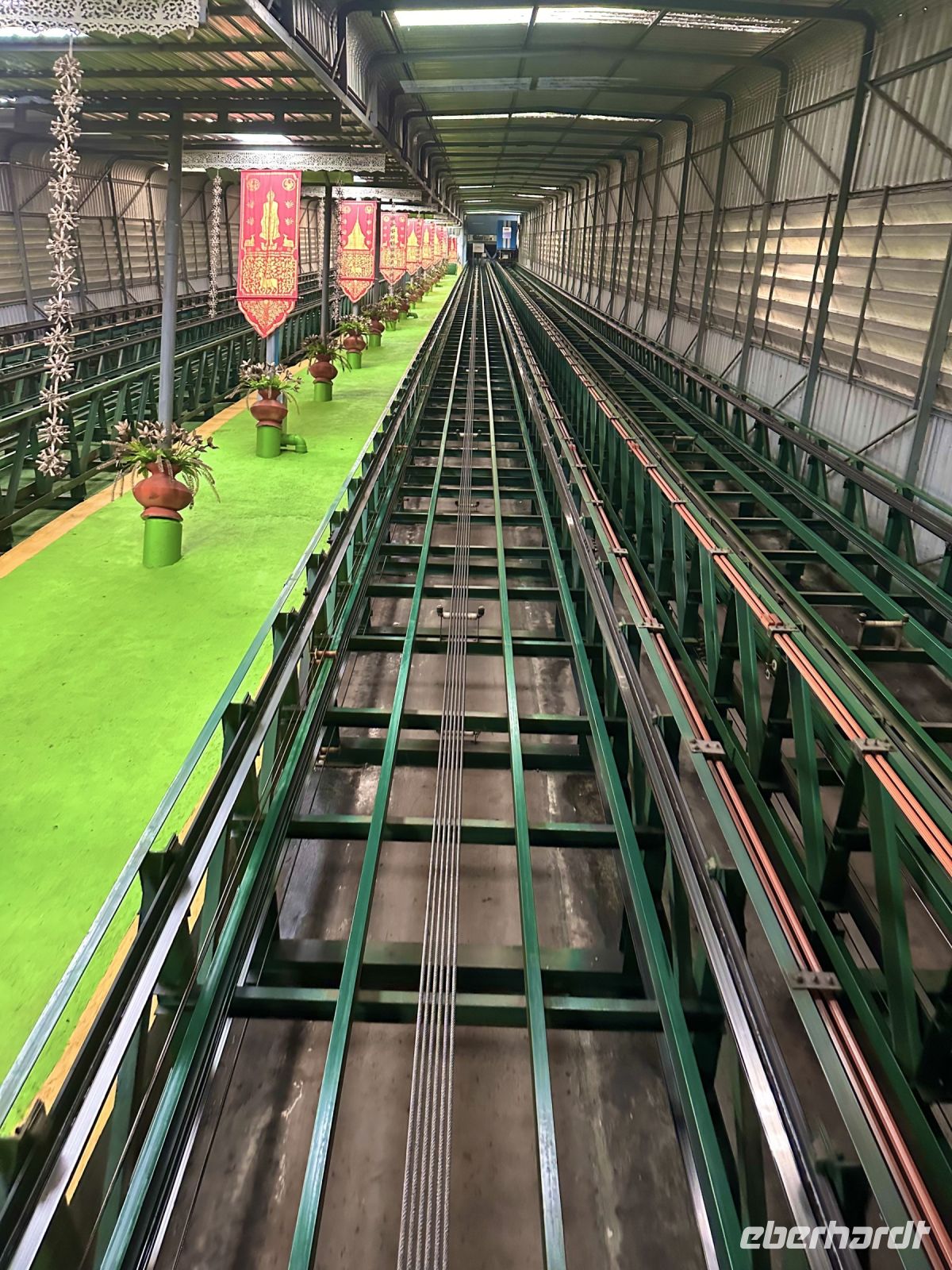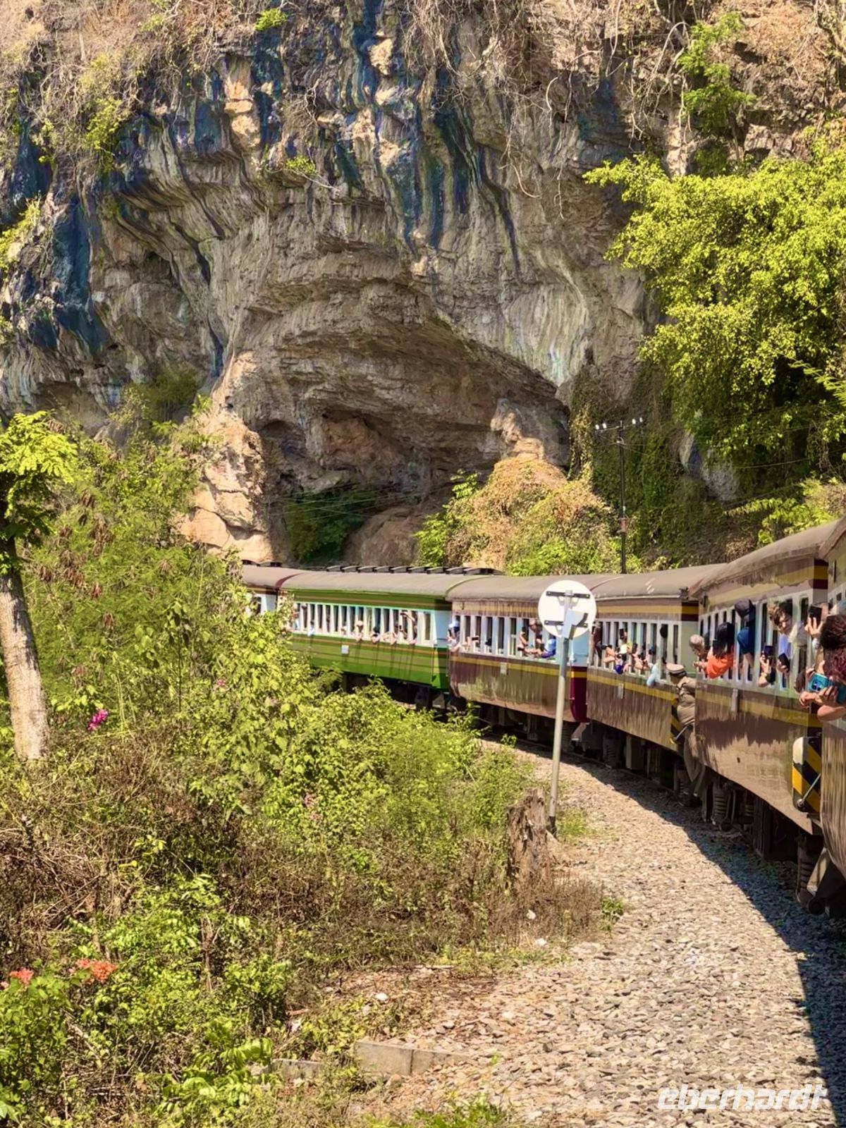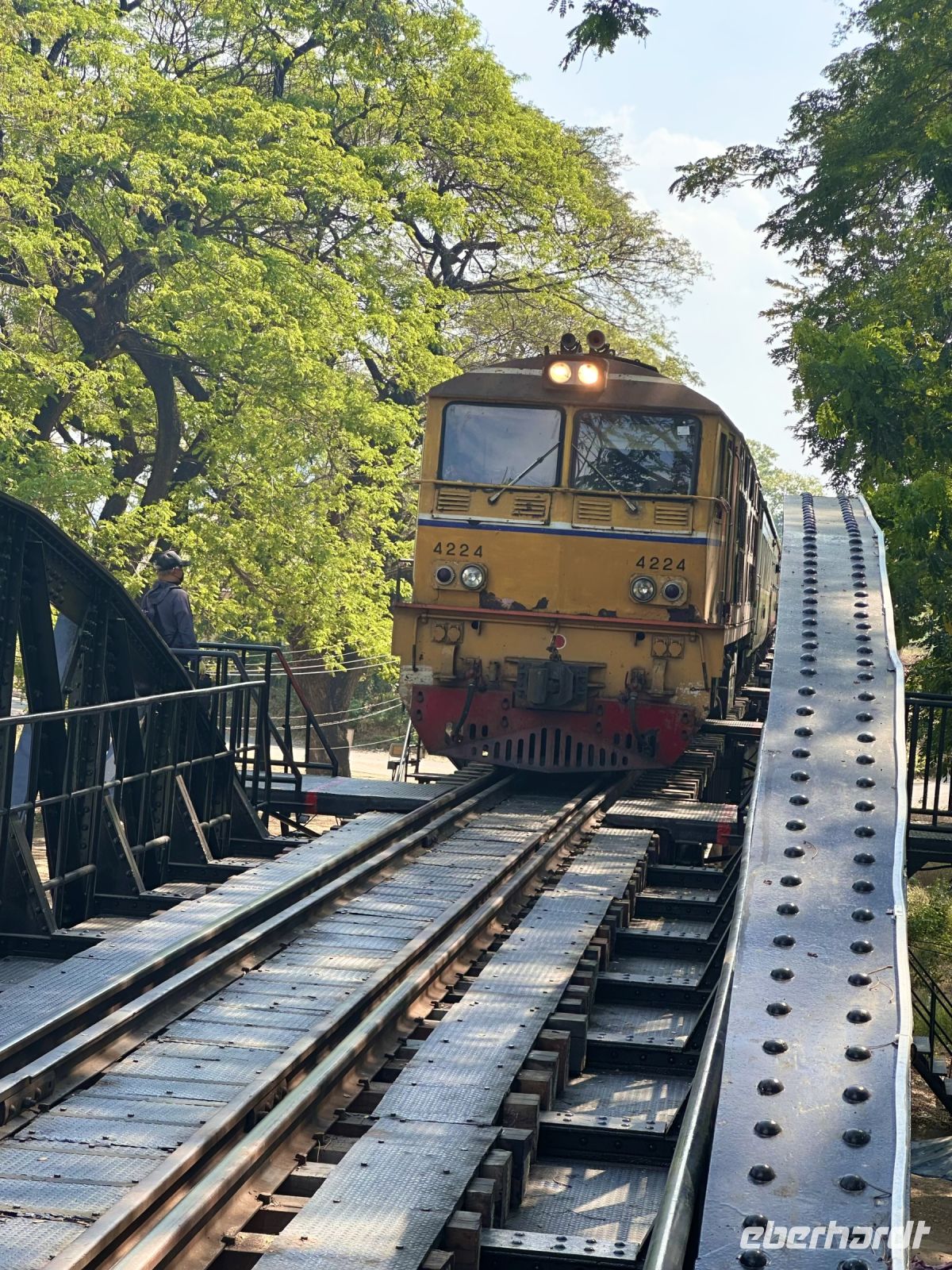 Am heutigen Morgen fahren wir wieder zurück in die Stadt Kanchanaburi. Wir besuchen auf dem Weg einen alten Soldatenfriedhof und finden uns anschließend zur Abfahrt für unsere heutige Zugfahrt am Bahnhof ein. Wir wollen heute auf dem Death Railway einige Stationen mit dem Zug fahren. Entlang der Strecke bekommen wir einen noch besseren Eindruck von der Landschaft links und rechts der Strecke sowie von der örtlichen Landwirtschaft. Wir steigen an der Station Tham Krasae aus und finden ein tolles Restaurant mit einem herrlichen Blick über das Tal mit Kwai und Zugbrücke. Das große Buffet ist wieder sehr liebevoll angerichtet und schmeckt sehr lecker.