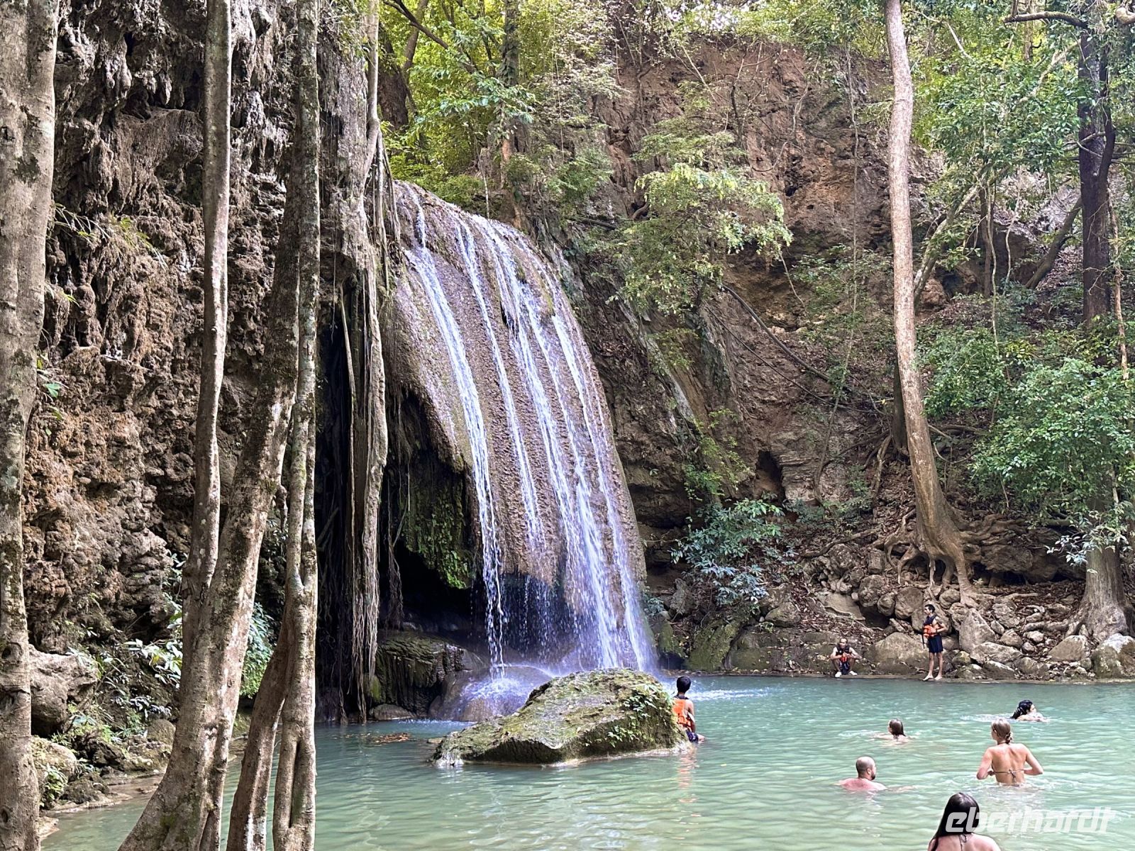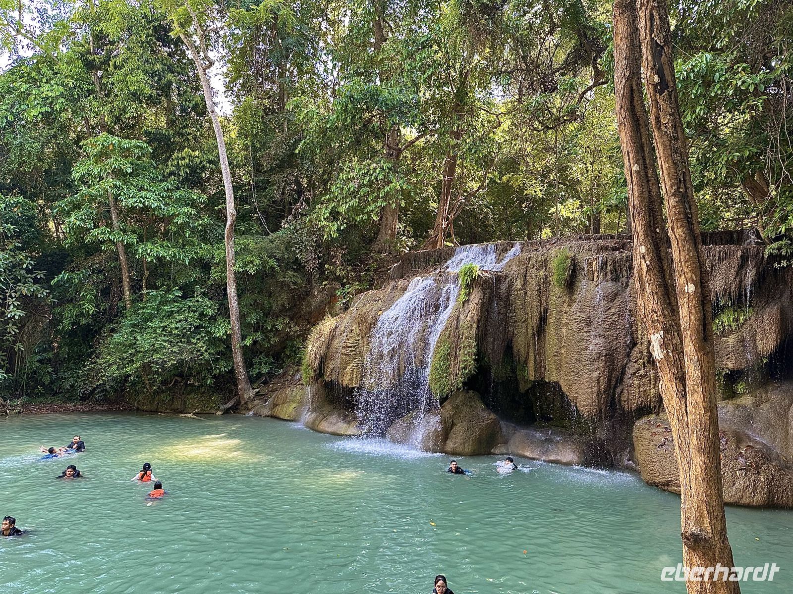 Frisch gestärkt starten wir dann weiter in Richtung Si Sawat und wollen dort den Wasserfallpark besuchen. Der Wasserfall besteht aus insgesamt 7 Ebenen, die man von unten nach oben step by step erklimmen kann. Die meisten von uns bleiben bei den Ebenen 1-3 und genießen das kühle Nass. Manche steigen sogar noch bis zur Ebene 4 auf. Erfrischt geht es wieder zurück in unsere Hotelanlage am Kwai und ab in den Naturpool im Fluss und zu einem geselligen Abendessen in unserer ruhigen Anlage.