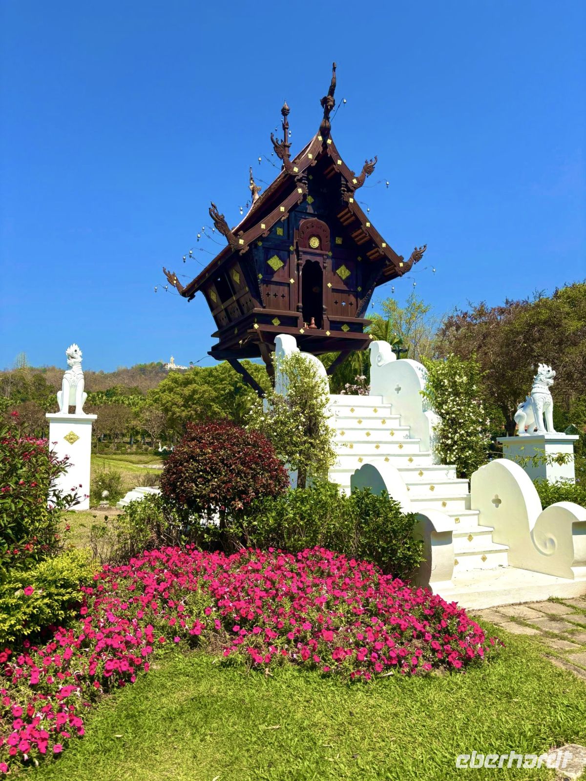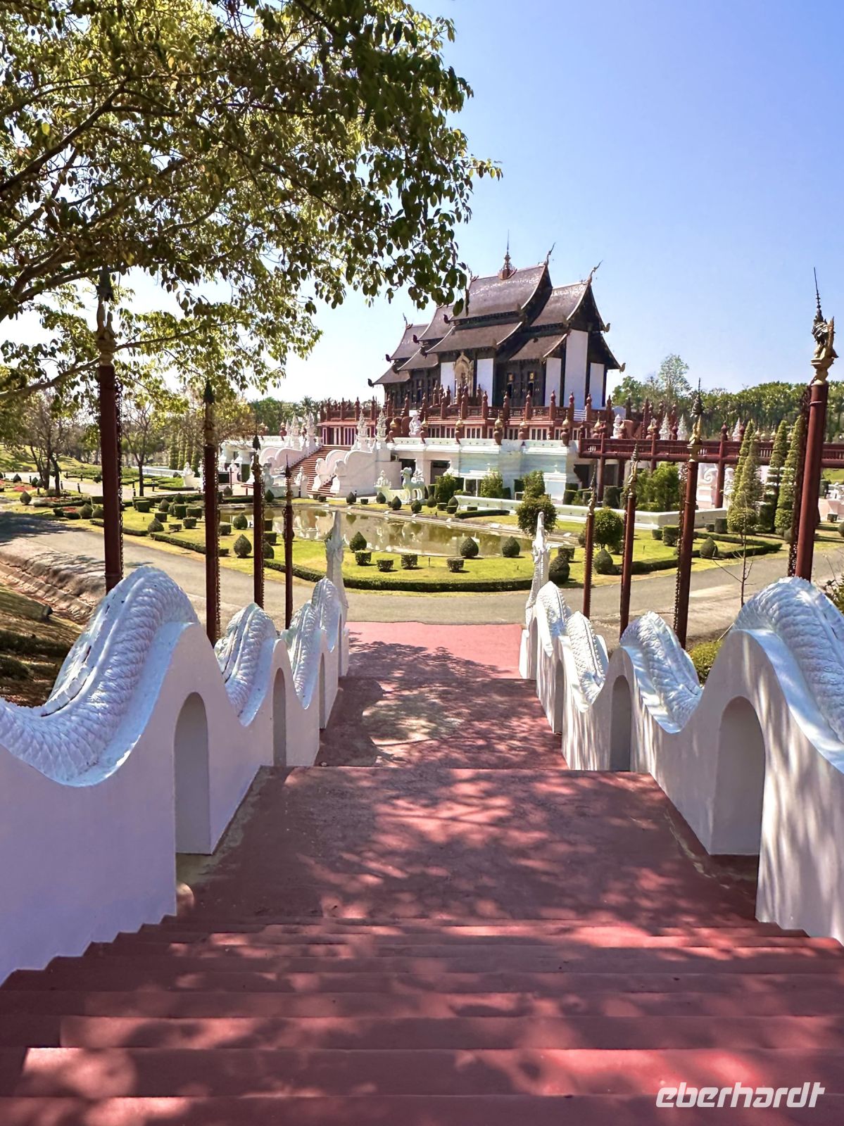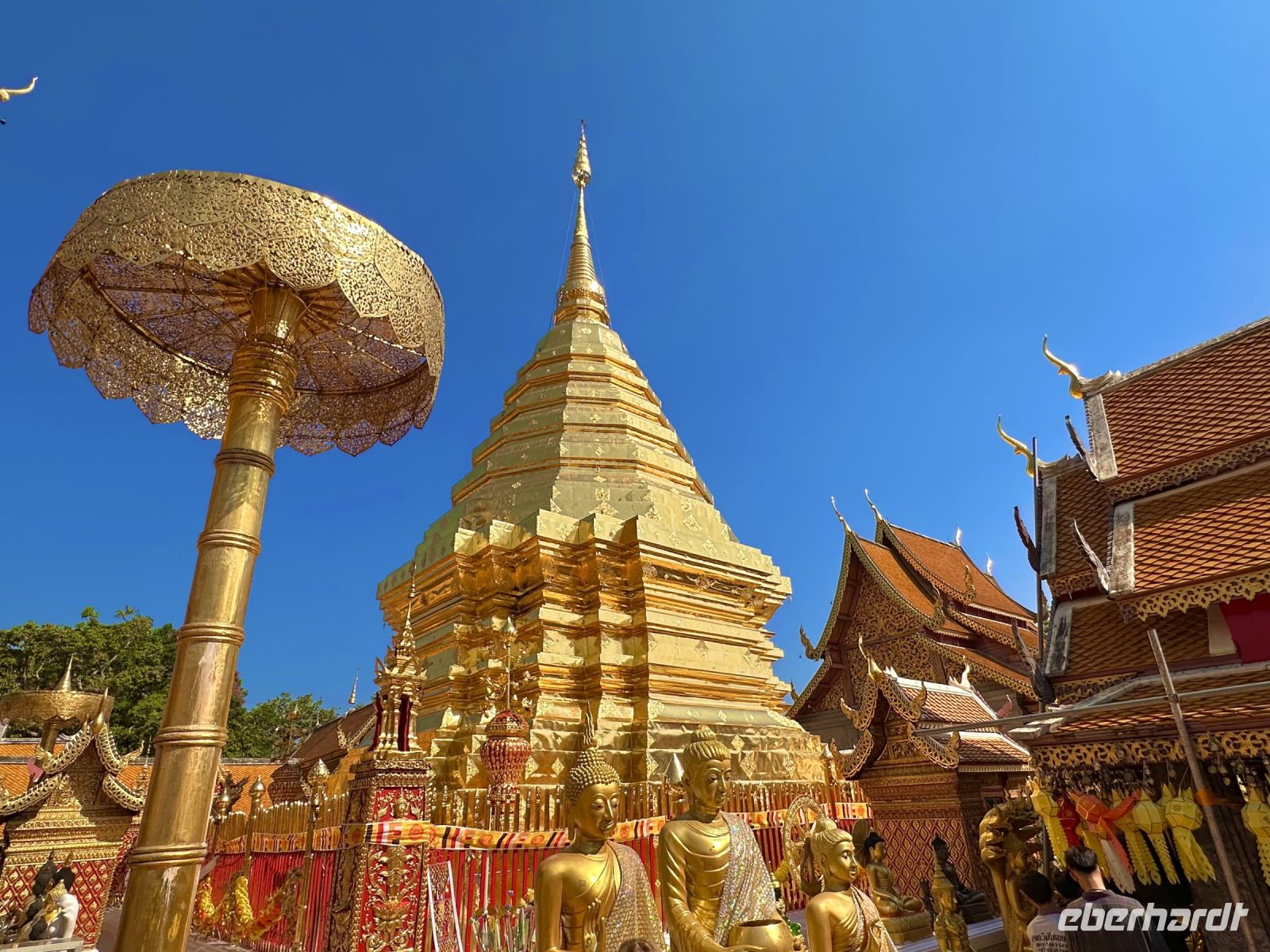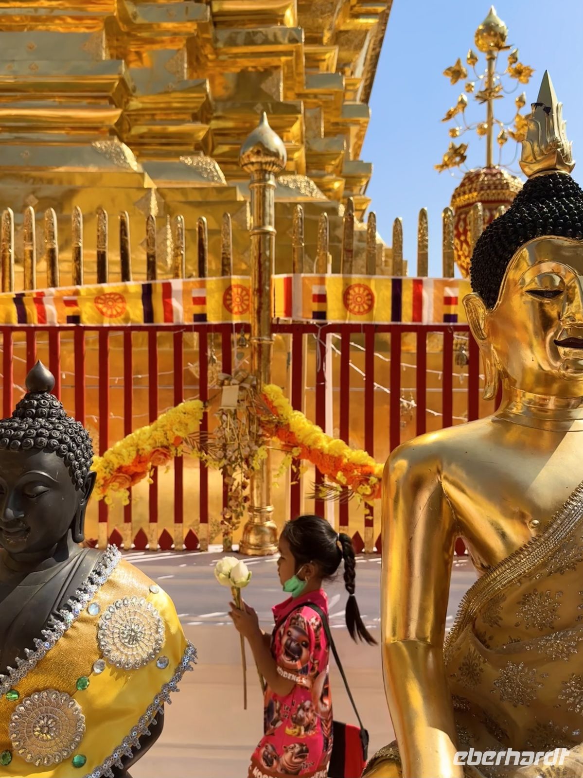 Das Frühstück genießen wir heute im ruhigen Hotelgarten, der sich direkt am Fluss Mae Nam Ping befindet. Danach starten wir mit unserem örtlichen Reiseleiter eine Fahrt hinauf zur Tempelanlage Wast Phra That Doi Suthep. Wir haben genügend Zeit diese ausführlich zu erkunden und dürfen anschließend noch Einblick nehmen in eine Manufaktur für die Verarbeitung von Jade-Stein zu hochwertigem Schmuck. Zurück in der Altstadt werden uns noch einige der unzähligen Tempelanlagen der Stadt gezeigt. Auch diese sind wieder sehr beindruckend und interessant anzusehen. Jeder Tempel ist halt anders und man stößt immer wieder auf neue interessante Elemente, die darin verbaut wurden. Bei einer Rikscha-Tour durch einen Teil der Altstadt bekommen wir noch einen Eindruck von längst vergessenen Transportmethoden.