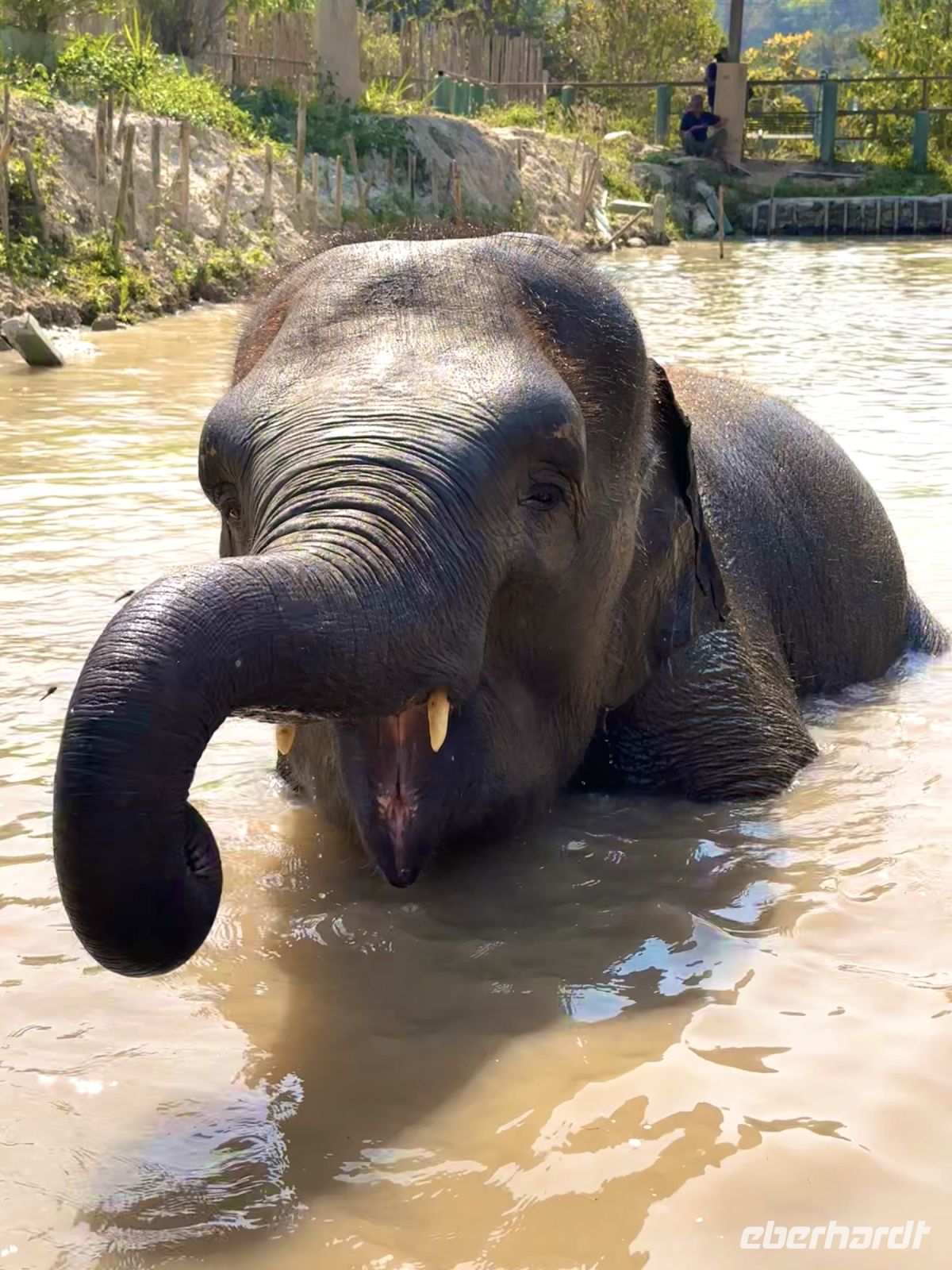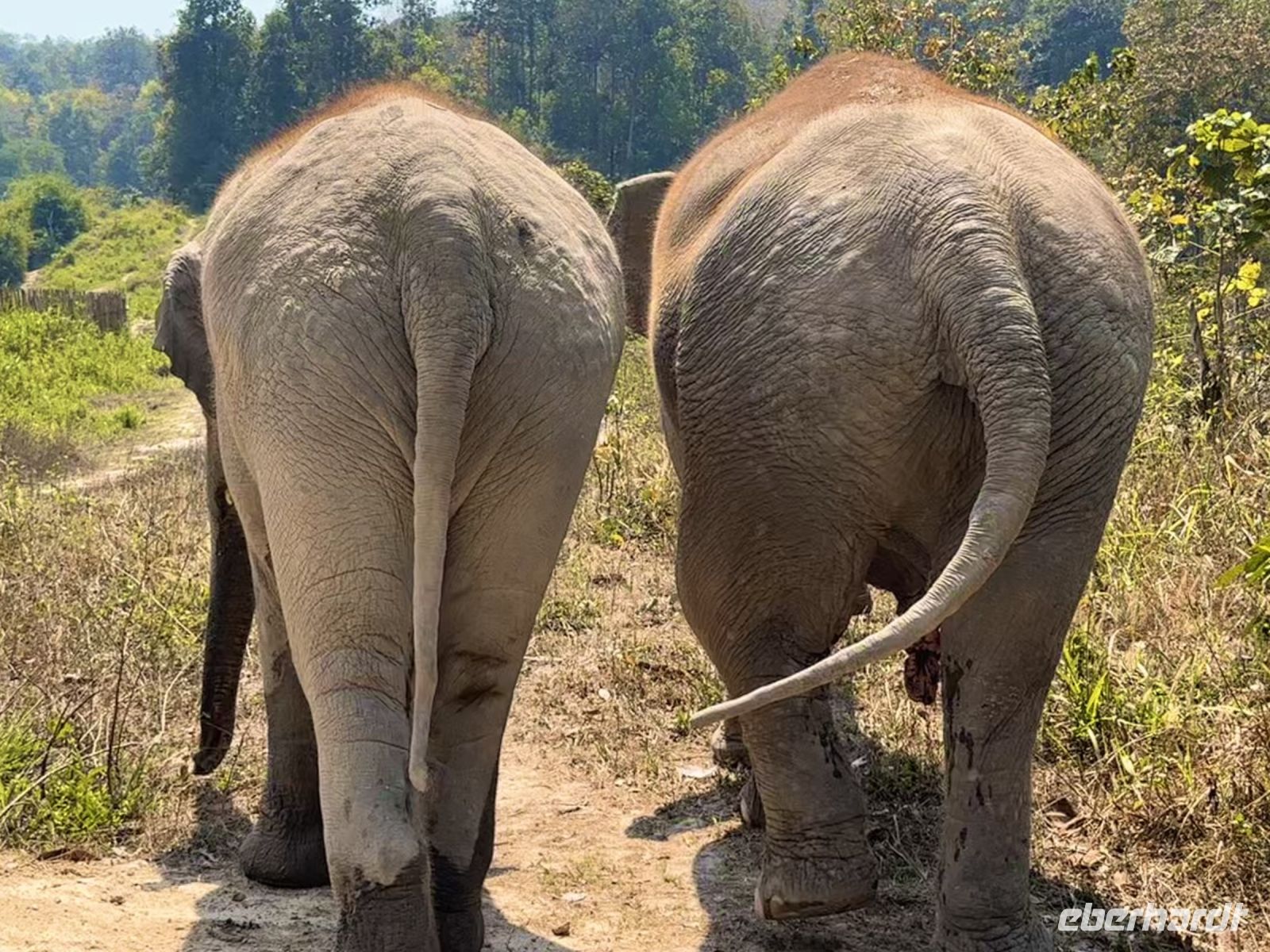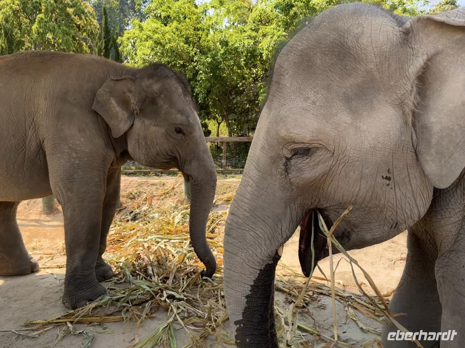 Auf den heutigen Tag freuen wir uns schon seit Tagen. Wir fahren in eines der vielen Elefanten-Camps, die es im Raum Chiang Mai gibt. Die Elefanten werden in den Camps liebevoll und artgerecht gepflegt und verwöhnt. Die Pfleger im Camp erklären uns ausführlich ihre tägliche Arbeit mit den Tieren und geben uns Einblicke in den Umgang und direkten Kontakt mit ihnen. Den ersten Kontakt zu den Tieren haben wir beim Verfüttern von unzähligen Bananen. Die Tiere haben es so gemocht, dass auch keiner Angst hatte so nah den Kontakt zu den Tieren zu haben. Später konnten wir die Tiere in ihrem weitläufigen Gehege besuchen und haben anschließend eine Wanderung mit ihnen unternommen. Die Elefanten kannten natürlich die spannendsten Ecken ihres Reviers und steuerten auch gezielt jedes Schlamm- und Wasserloch an in dem sie sichtlich Spaß hatten. Zurück im Camp konnten sie dann gleich im Teich baden und die Besucher konnten die Gelegenheit nutzen den Tieren bei der Wäsche zu helfen. Ab in die Badesachen und ab in den Teich zum plantschen mit den Dickhäutern. Nachdem wir uns an einem leckeren Essen im Camp stärken konnten, sollten die Elefanten auch noch etwas zum Naschen bekommen. Hierzu bereiteten die Teilnehmer unter Anleitung der Elefantenpfleger leckere Häppchen für die Tiere zu, die sie dann natürlich auch direkt an die Tiere verfüttern konnten.