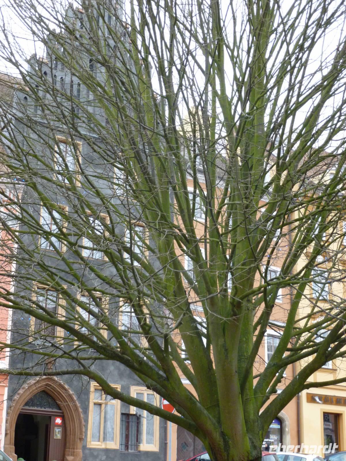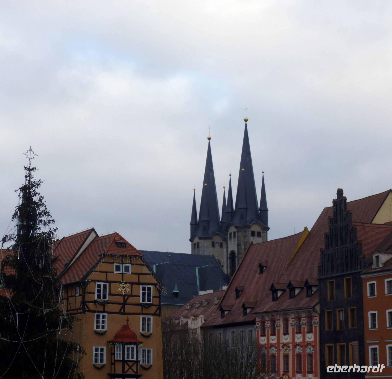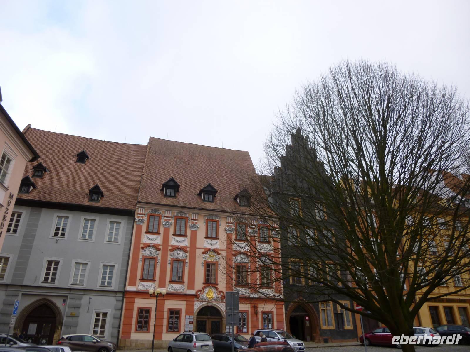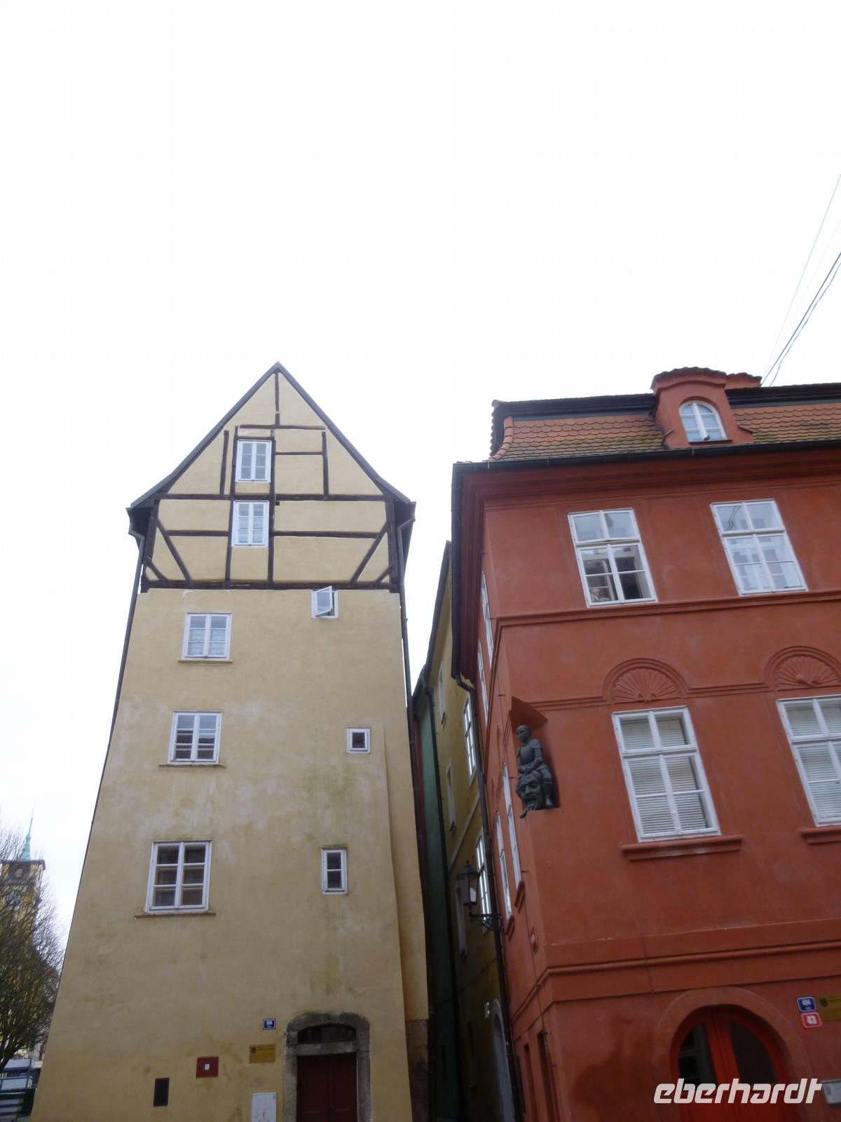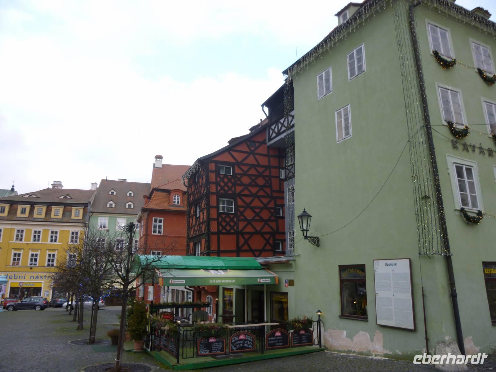 Nebenan die gotische St. Wenzels-Pfarrkirche, barock umgebaut und darunter die Bürgerhäuser noch aus dem 14. Jahrhundert.