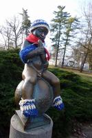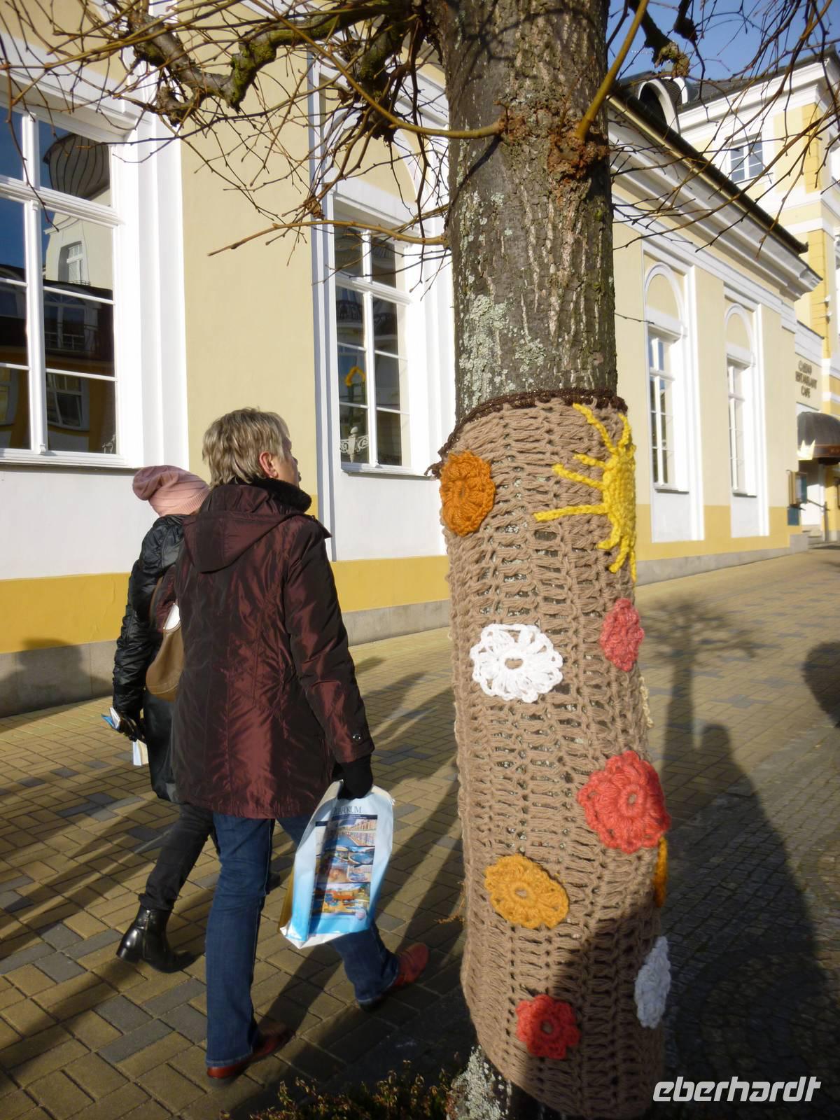 Franzensbad galt unser erster Besuch an diesem sonnigen kalt klaren Tag: als eines der drei Renommierbäder hat es sich erst im 19. Jahrhundert zum international gefragten Heilbad entwickelt. Wunderschöne architektonische Ensemble vom Empire, Klassizismus bis Jugendstil und Art Deco zieren den weitläufigen über 250 Hektar großen Kurpark. Unweit dem Empire-Pavillon der Franzensquelle (1832) grüßt der bronzene fruchtbarmachende? "Franzl" mit seinem Fisch herüber, umstrickt von einer Strickkünstlerin in den Farben Franzensbads.