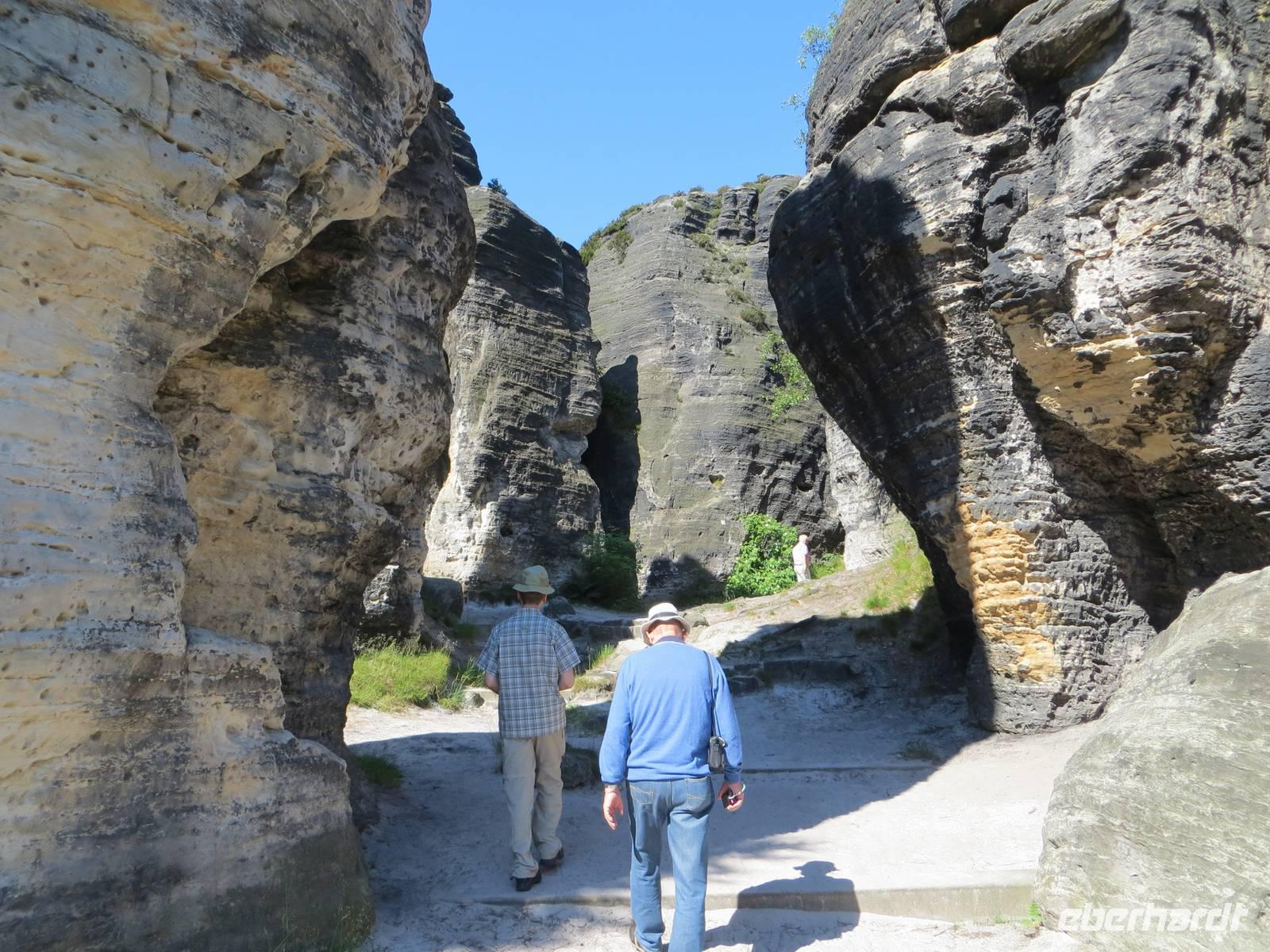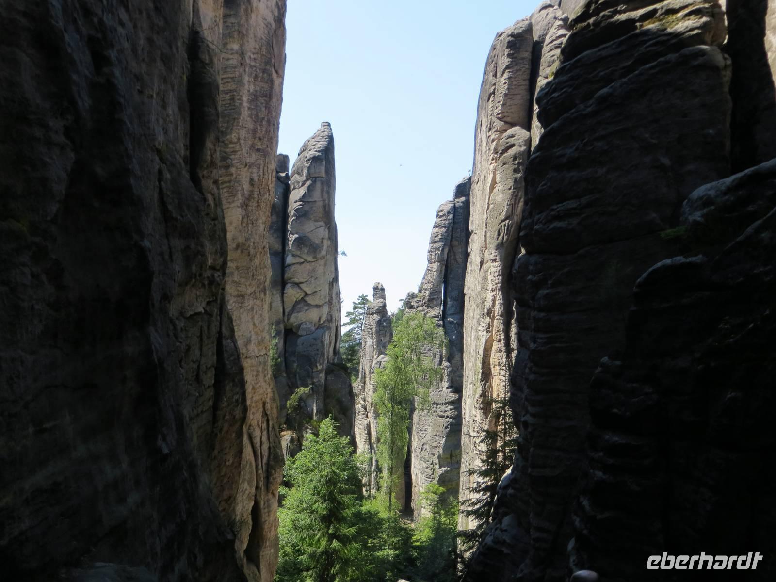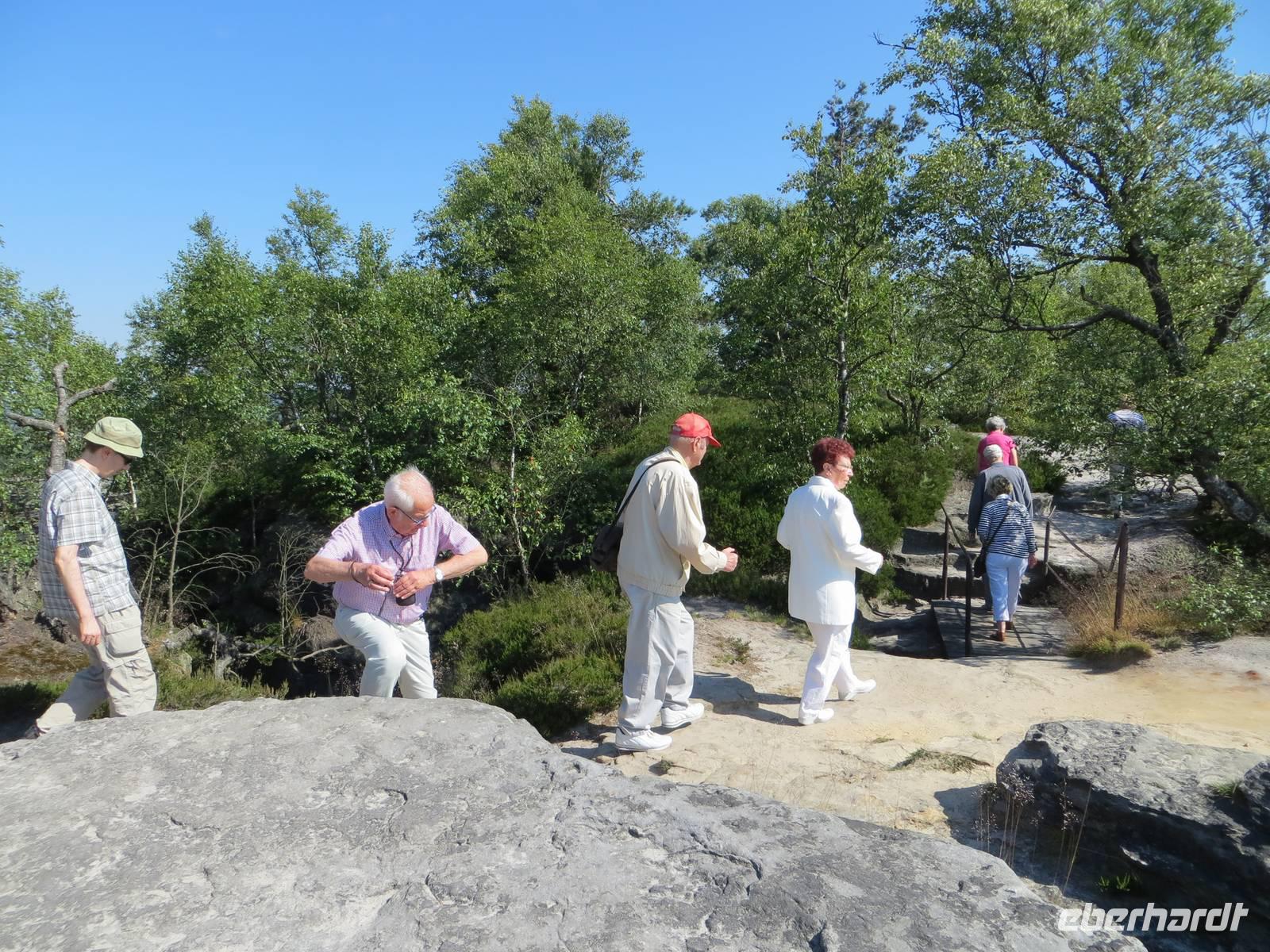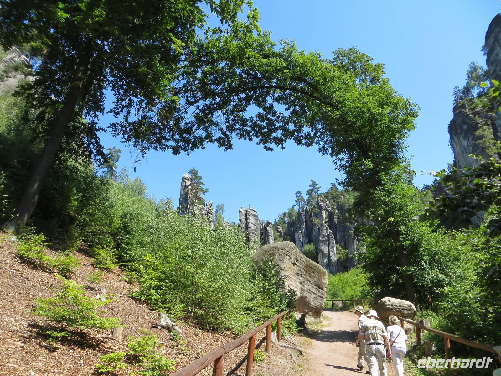 Nach einer Fahrt über Tanvald und Jablonec erreichten wir den westlichen Rand des Böhmischen Paradieses. An dessen Südseite befindet sich, in einem Gebirgstälchen abseits üblicher erhabener Burgen, die Burg Kost, eine der besterhaltensten gotischen Burgen Böhmens. Schon die Einordnung in die Felsenwelt mit Teichen voller Entengrütze ist romantisch. In der Renaissance wurden Wände des Burgpalastes mit einem „Briefumschlag-Sgrafito" verziert. Bei unserem Bummel durch Burgräume , die Küche und über einen Wehrgang zum markanten Weißen Turm erfuhren wir mehr über die jahrhundertealte Geschichte böhmischer Fürsten und ihrer Rückkehr auf die Schlösser nach 1991. Die Mittagspause verbrachten wir in der hübschen Innenstadt von Jicin. Wallenstein plante hier einst den Ausbau der Residenz des Herzogtums Frydlant. Am Nachmittag erreichten wir das Böhmische Paradies bei 30 Grad Hitze. Dennoch spazierten einige Unentwegte auf einem knapp zwei Kilometer langen Rundweg durch die Prachover Felsen: zunächst über Stufen ging es bald eine natürliche Treppe im engen Felsspalt nach oben. Der kleine Anstieg lohnte sich; von hier oben beeindruckende Blicke auf die Felsen des Böhmischen Paradieses bis hinüber zur Burg Trosky. Andere Gäste entschieden sich für einige hundert Meter des Bummelns in der Felsenwelt bis sie im Kessel einer prächtigen Arena aus Sandsteinnadeln im Angesicht deren Höhe den Rückweg antraten und gesellten sich zu jenen, die sich gleich für Kaffee oder Bier im Grünen entschieden hatten. An den Burgen Hruba Skala und Valdstein des Felsengebietes Hruba Skala und dann durch das Tal Mala Skala und den Ort Zelesni Brod fuhren wir zurück nach Harrachov.