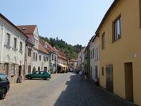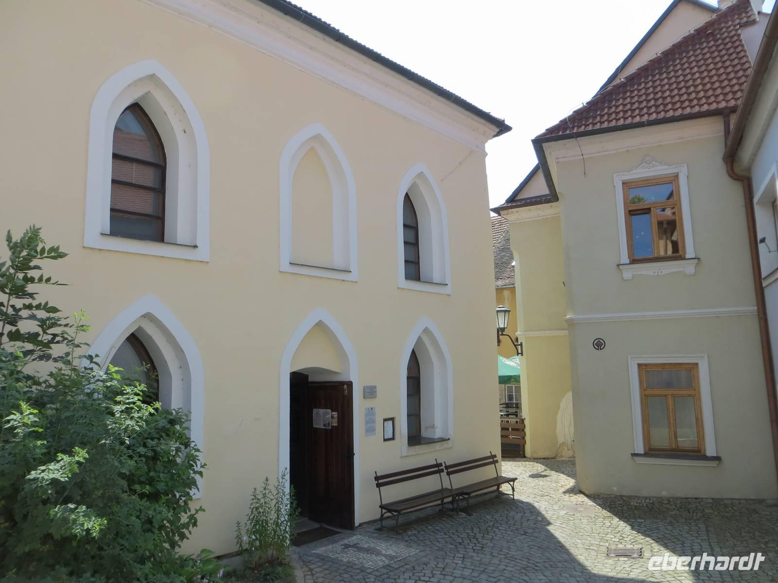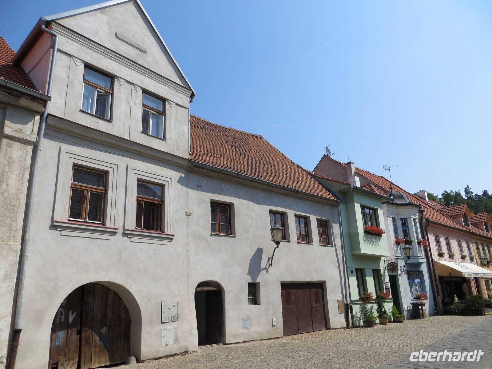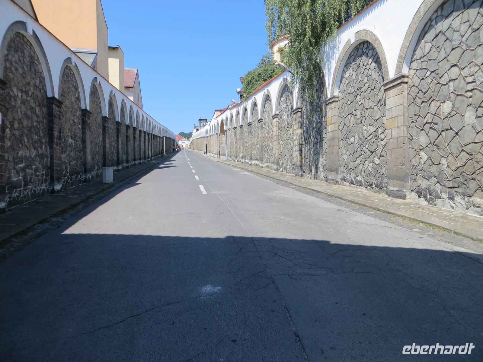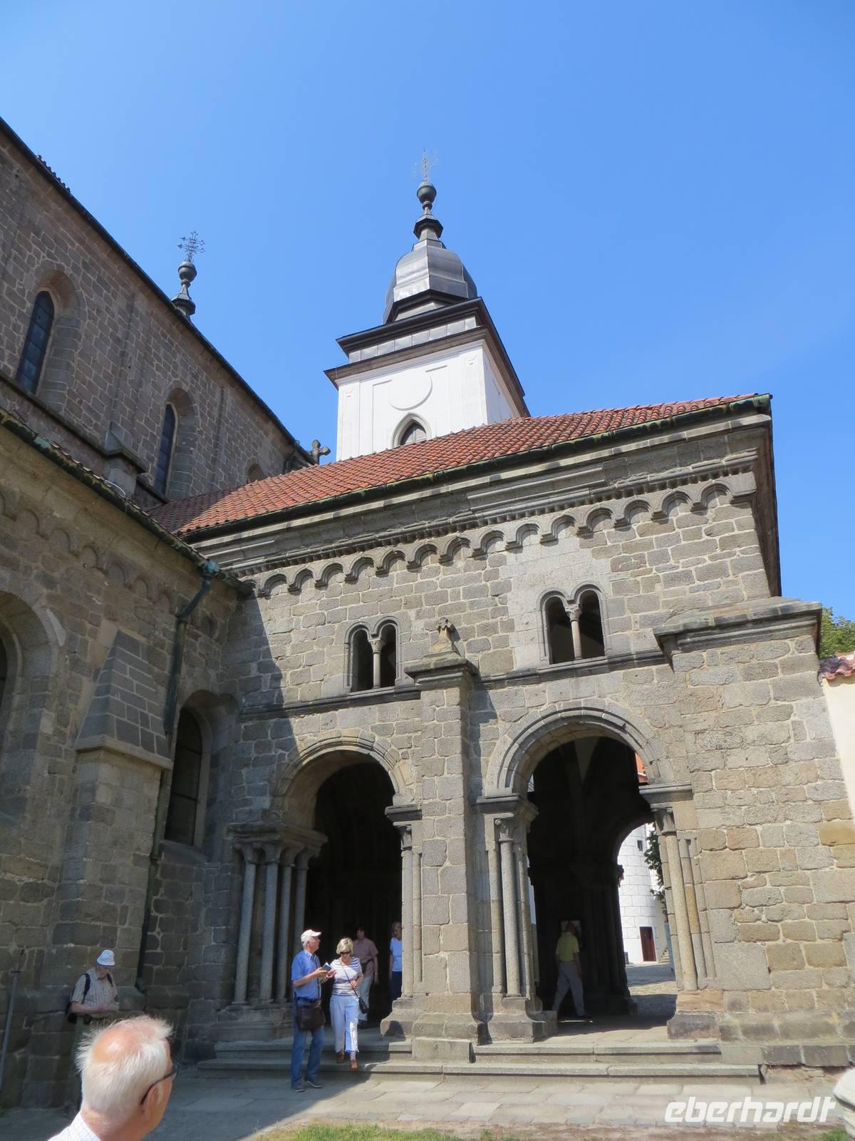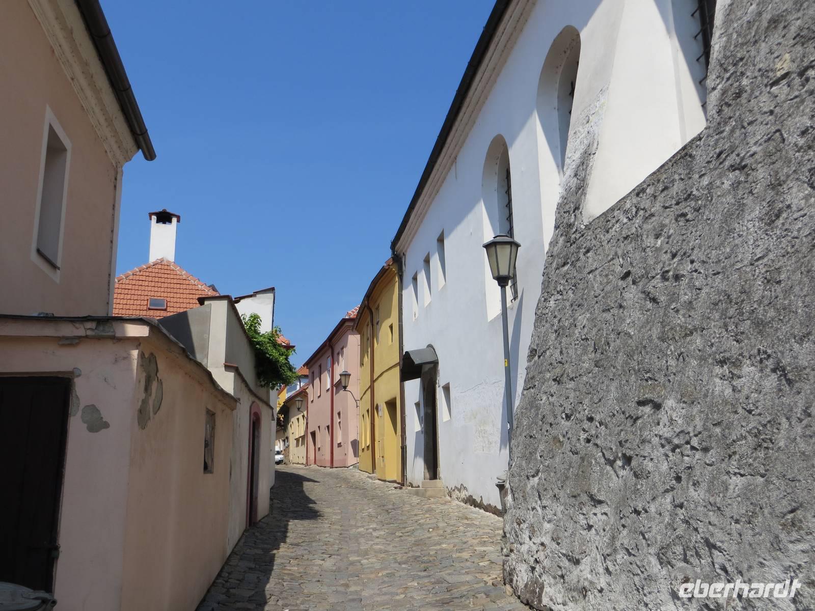 Bei schönstem Sommerwetter hatten wir die nötige Zeit, um in Trebic von der Bazilika zum Jüdischen Viertel zu laufen. Die spätromanisch-frühgotische Bazilika von Trebic ist wahrscheinlich die älteste Kirche auf unserem Reiseweg. Unter dem Schloss mit der Bazilika am Fluss liegt das ehemalige jüdische Viertel mit engen Gassen, rekonstruierten und leider schon wieder bedenklich beschädigten Häusern und zwei ehemaligen Synagogen. Vom Stadtviertel stiegen einige Gäste in wenigen Minuten hinauf auf den Hügelhang zu einem der größten jüdischen Friedhöfe in Tschechien. Weiter hinten am Hang des Friedhofes liegen alte, verwitterte und von der grünen Natur überzogene Grabsteine mit hebräischen Schriftzeichen.