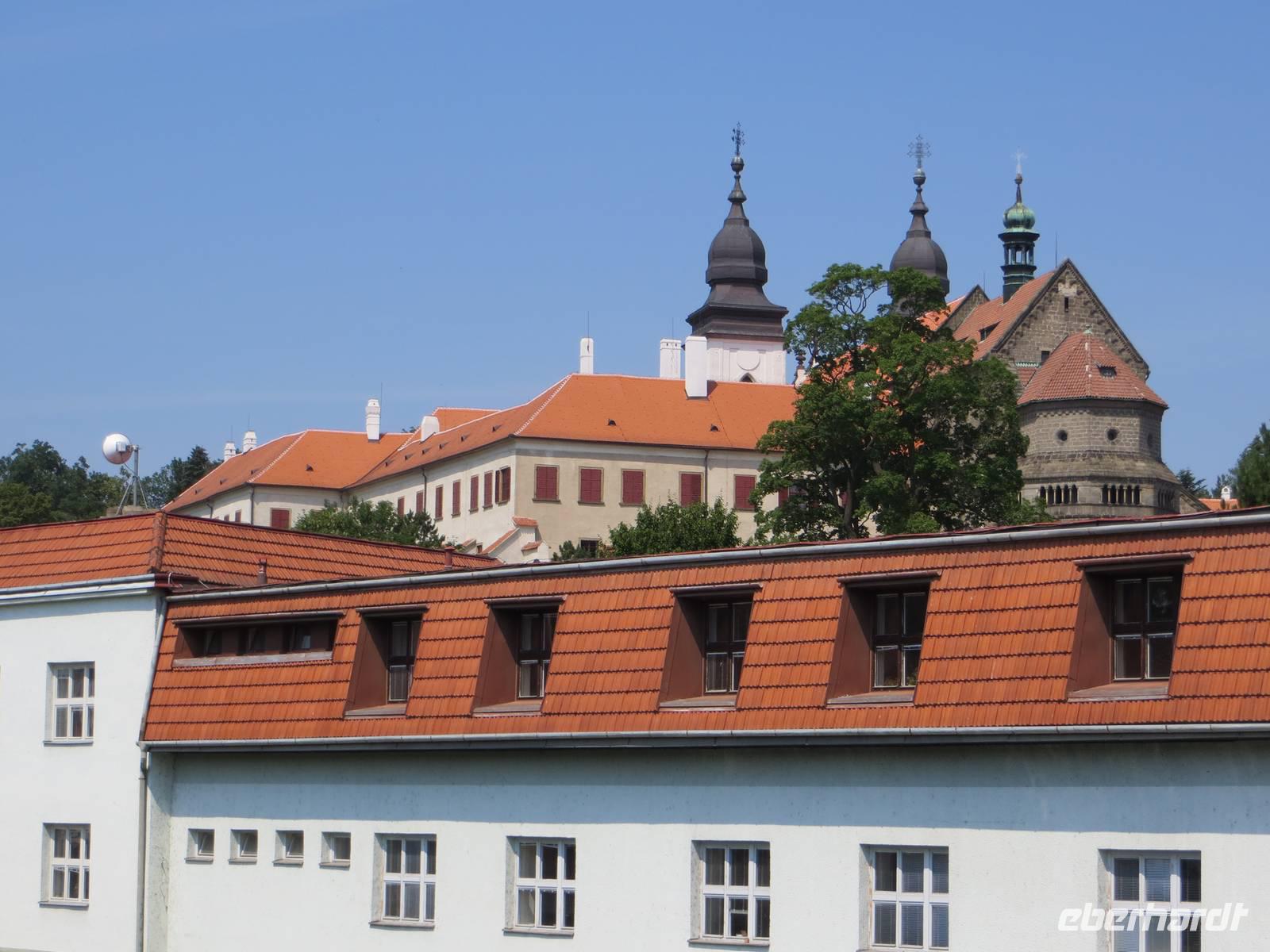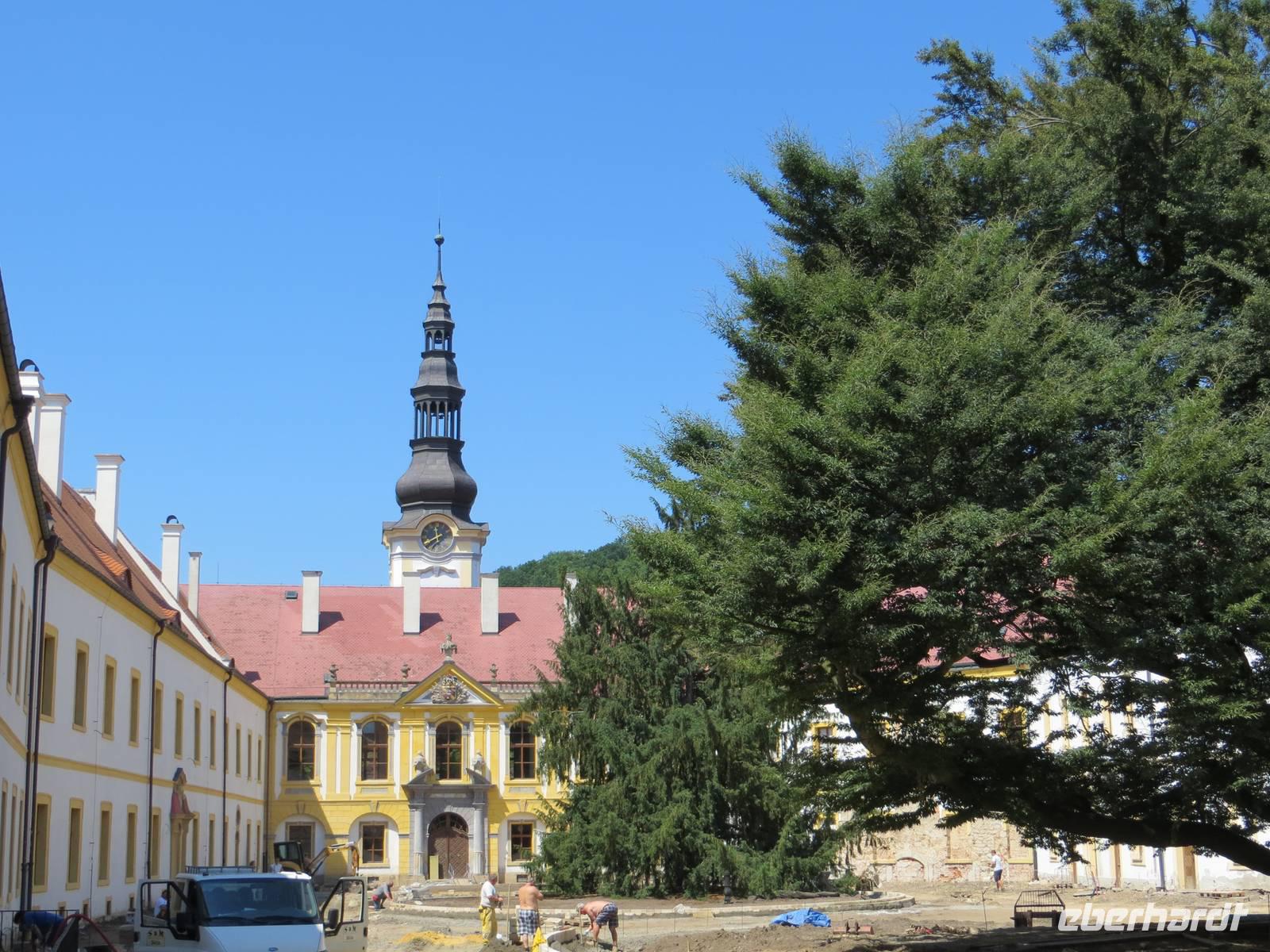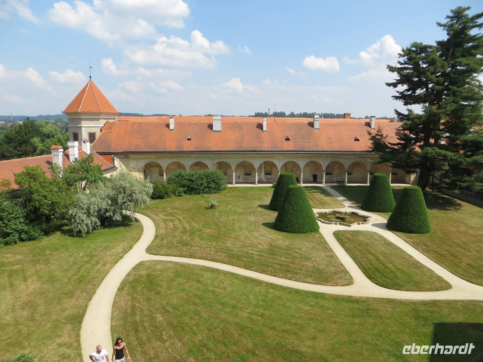 Selten beginnen wohl Rundreisen in andere europäische Länder bereits mit einem ersten Programmhöhepunkt bereits nach einer Reisestunde. Eine solche Ouverture genossen die dreiundzwanzig Gäste, die in Dresden starteten, um in zwölf Tagen die benachbarte Tschechische Republik kennenzulernen. Bereits wenige Kilometer hinter der Grenze stoppten wir in Tisa im Elbsandsteingebirge und stiegen hundert Höhenmeter bei einem kleinen Spaziergang nach oben auf die Tisaer Wände. Bei bereits warmen Sommerwetter schauten wir auf die Landschaft im Übergang von Sandstein zu Böhmischem Mittelgebirge; unter uns ein typisches Dorf des ehemaligen Sudentengebietes. In Decin nutzten wir die erste Chance zum Bevorraten mit Tschechischen Kronen für die kommenden Tage. Dann stiegen wir die „Lange Fahrt" hinauf zum Schloss, das hoch oben über der Mündung der Ploucnice in die Elbe steht. Die Lange Fahrt war eine gute Gelegenheit, um einige Phasen tausendjähriger böhmischer Geschichte zu erklären. Der große Innenhof des Schlosses, langzeitig in der Vergangenheit auch Kasernengelände, wird gerade restauriert. Bereits bestens begehbar sind die Terassen, die einstmals wohl italienische Landschaftsgärtner anlegten.