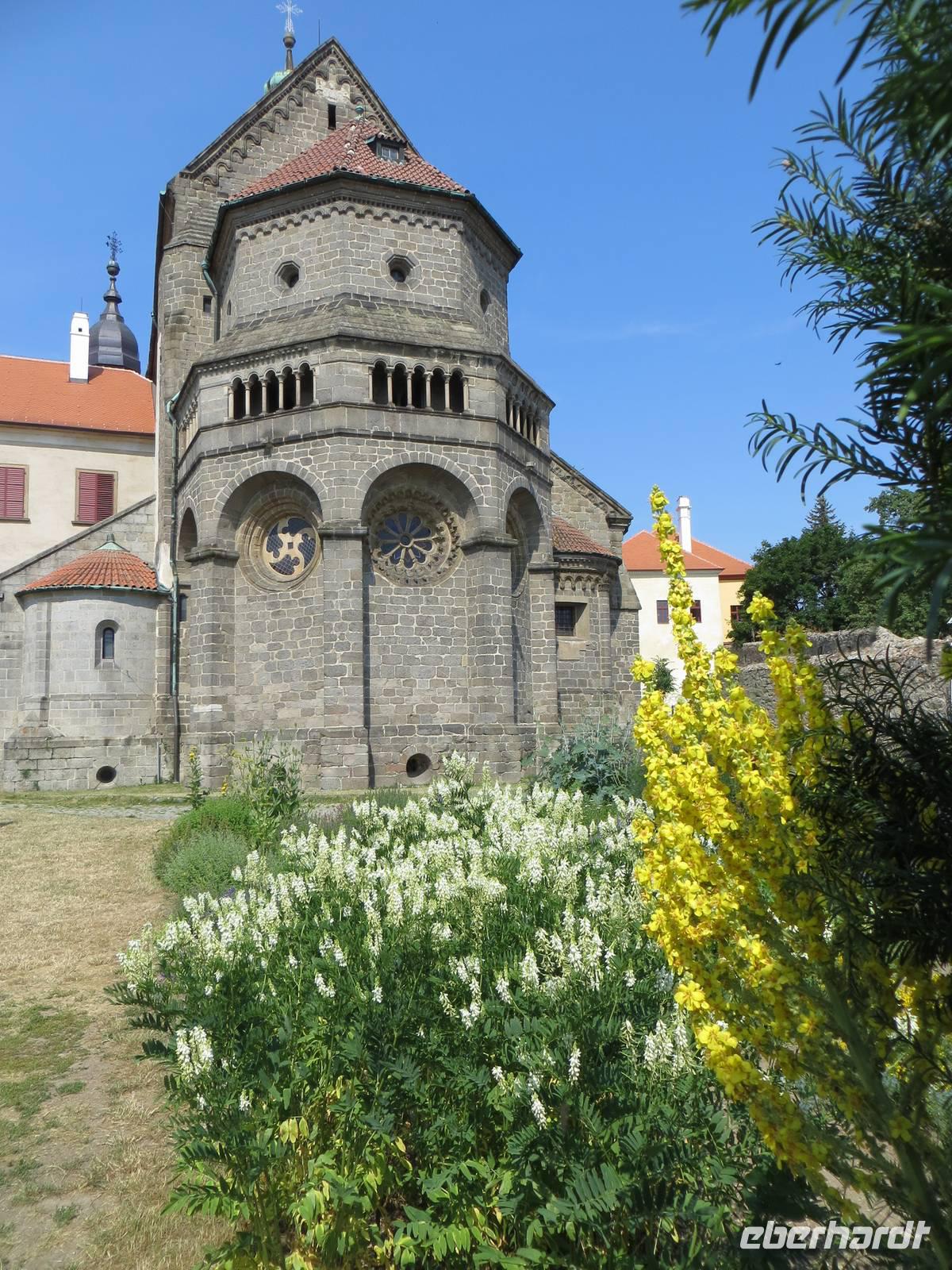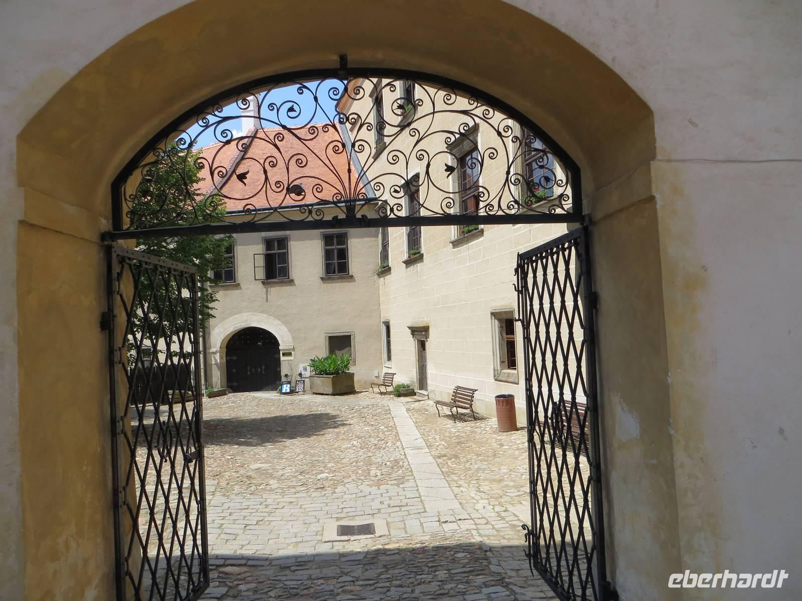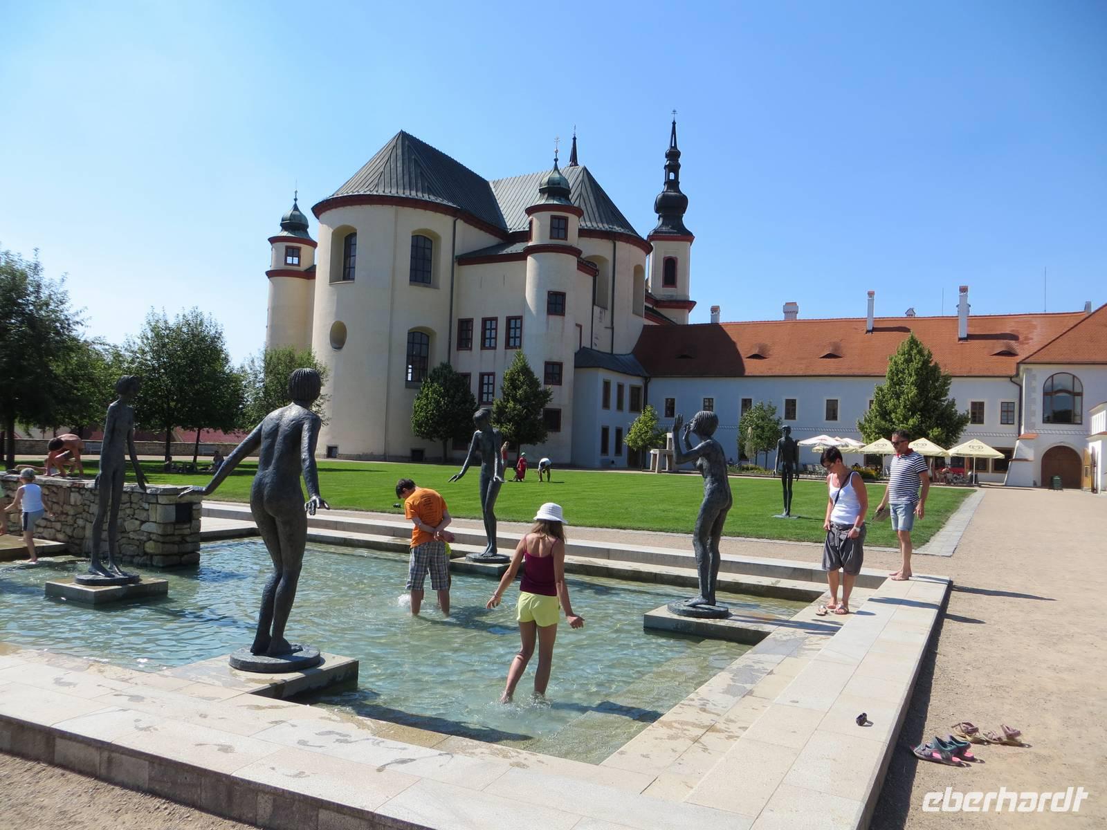 Selten beginnen wohl Rundreisen in andere europäische Länder bereits mit einem ersten Programmhöhepunkt bereits nach einer Reisestunde. Eine solche Ouverture genossen die dreiundzwanzig Gäste, die in Dresden starteten, um in zwölf Tagen die benachbarte Tschechische Republik kennenzulernen. Bereits wenige Kilometer hinter der Grenze stoppten wir in Tisa im Elbsandsteingebirge und stiegen hundert Höhenmeter bei einem kleinen Spaziergang nach oben auf die Tisaer Wände. Bei bereits warmen Sommerwetter schauten wir auf die Landschaft im Übergang von Sandstein zu Böhmischem Mittelgebirge; unter uns ein typisches Dorf des ehemaligen Sudentengebietes. In Decin nutzten wir die erste Chance zum Bevorraten mit Tschechischen Kronen für die kommenden Tage. Dann stiegen wir die „Lange Fahrt" hinauf zum Schloss, das hoch oben über der Mündung der Ploucnice in die Elbe steht. Die Lange Fahrt war eine gute Gelegenheit, um einige Phasen tausendjähriger böhmischer Geschichte zu erklären. Der große Innenhof des Schlosses, langzeitig in der Vergangenheit auch Kasernengelände, wird gerade restauriert. Bereits bestens begehbar sind die Terassen, die einstmals wohl italienische Landschaftsgärtner anlegten.