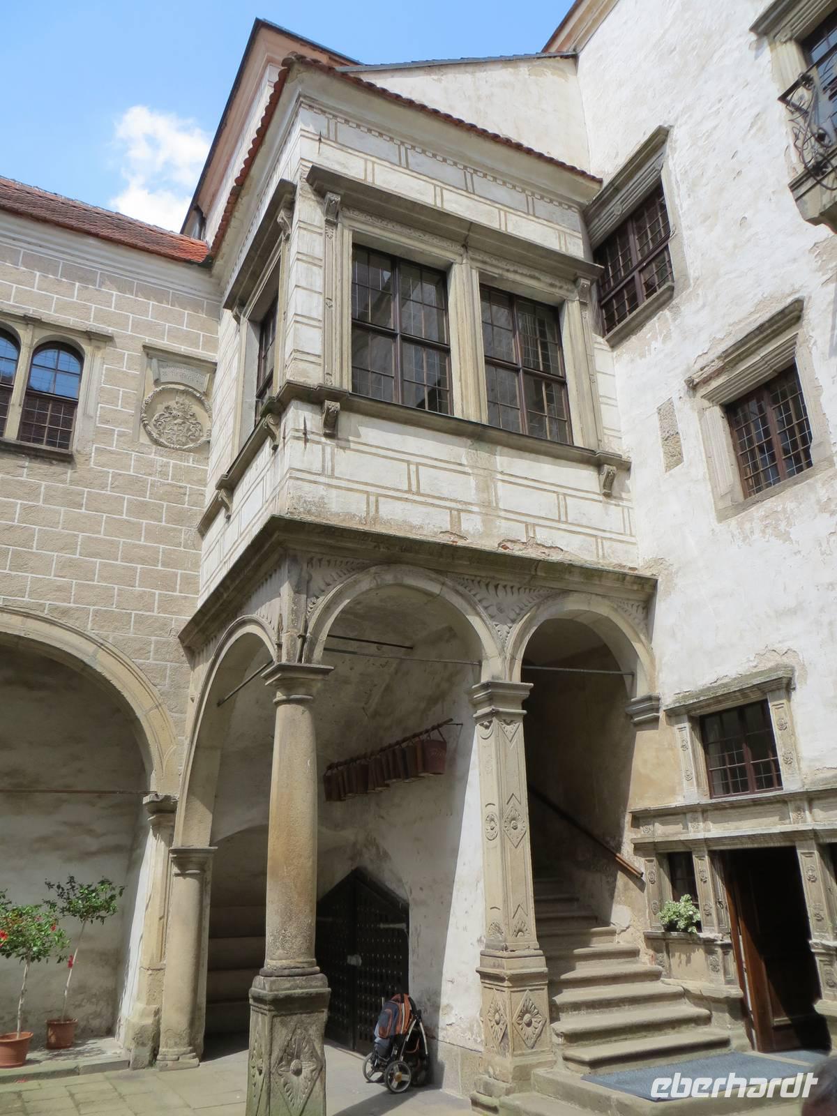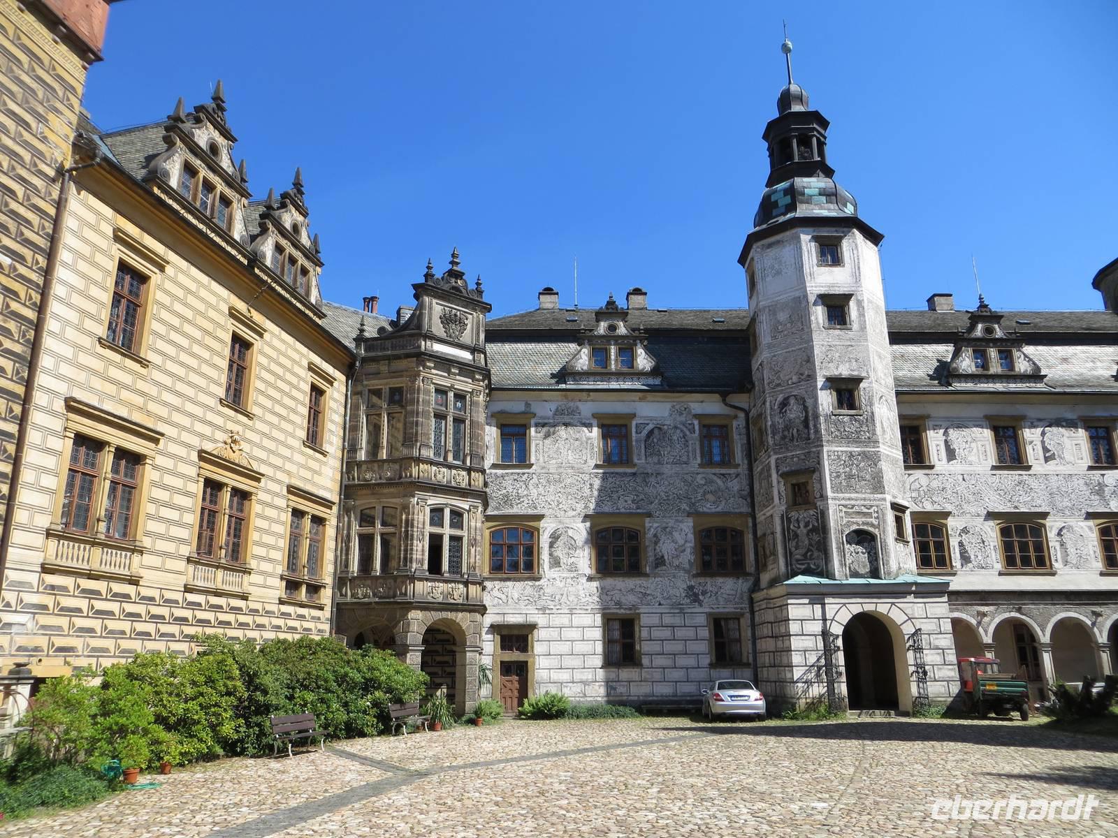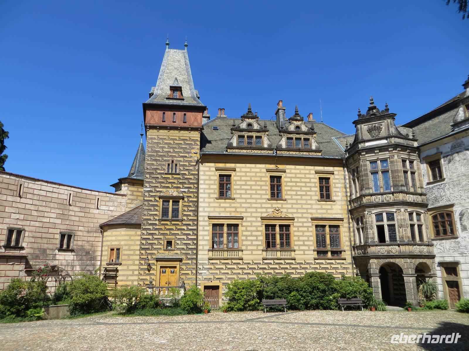 Von Decin ging es zwischen Elbsandstein und Böhmischen Mittelgebirge, am Rande der Lausitzer Berge mit seinen böhmischen Glaszentren - deren Produkte wir auf manchem Schloss als Kristallleuchter wiederfinden sollten - vorbei nach Frydlant. Im 16. Jahrhundert wurde hier ein Renaissanceschloss erbaut, das für sein Sgrafitto bekannt ist. Oft als das Schloss Wallensteins tituliert, erfuhren wir bei der Schlossbesichtigung, dass es zwar zwölf Jahre in dessen Besitz aber nie von ihm bewohnt war. Nach Wallensteins Ermodung fiel das Schloss an seine Widersacher. Die prägenden Einflüsse des 19. Jahrhunderts kann man heute gut beschauen; so gilt es heute auch als ein Beispiel der Neorenaissance.