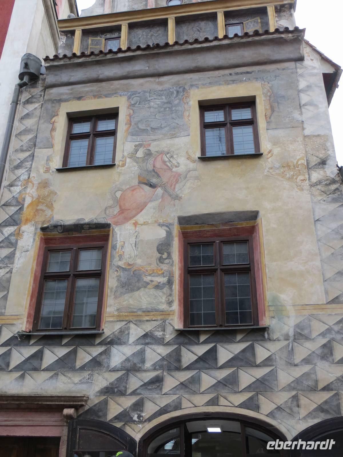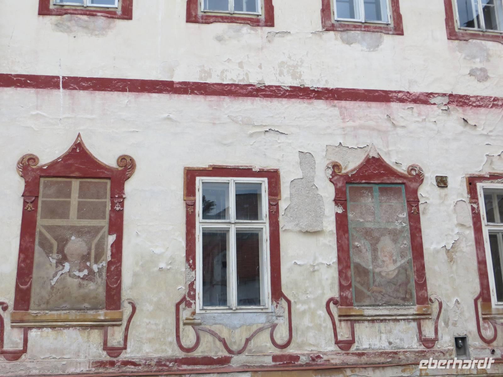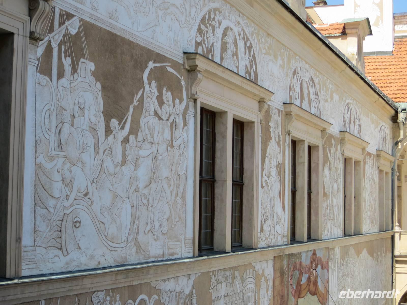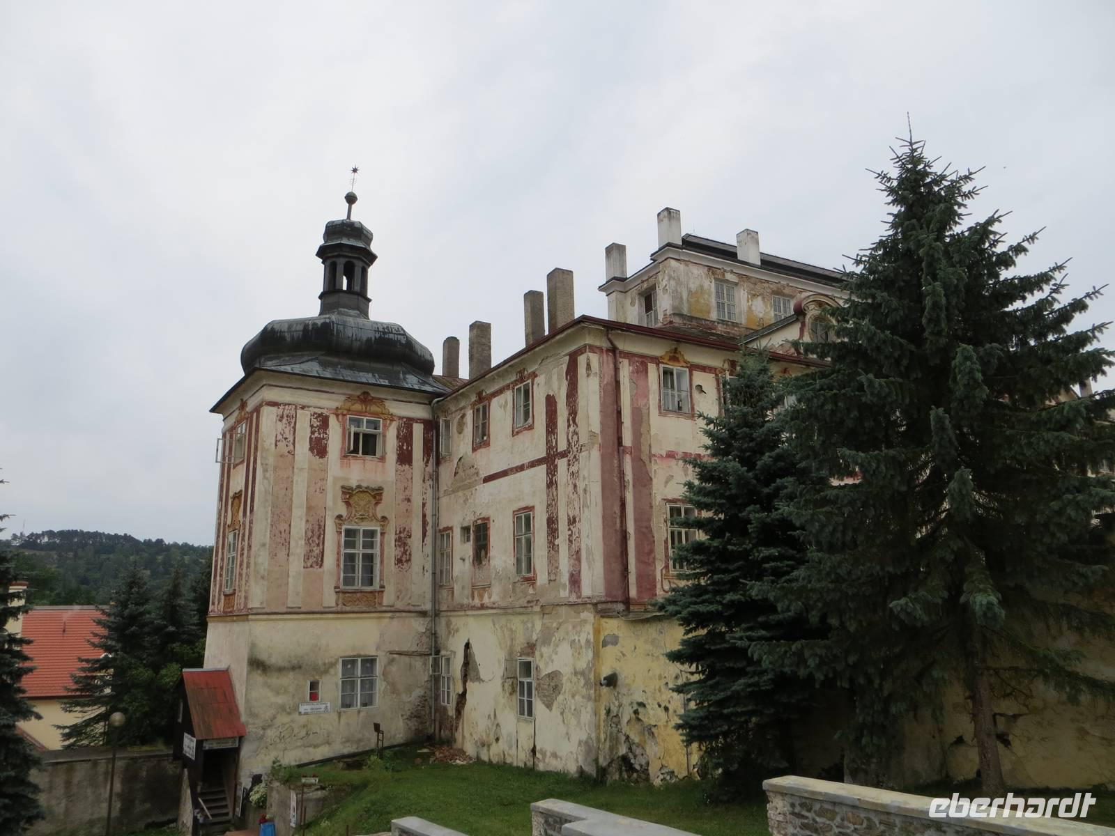 Von Decin ging es zwischen Elbsandstein und Böhmischen Mittelgebirge, am Rande der Lausitzer Berge mit seinen böhmischen Glaszentren - deren Produkte wir auf manchem Schloss als Kristallleuchter wiederfinden sollten - vorbei nach Frydlant. Im 16. Jahrhundert wurde hier ein Renaissanceschloss erbaut, das für sein Sgrafitto bekannt ist. Oft als das Schloss Wallensteins tituliert, erfuhren wir bei der Schlossbesichtigung, dass es zwar zwölf Jahre in dessen Besitz aber nie von ihm bewohnt war. Nach Wallensteins Ermodung fiel das Schloss an seine Widersacher. Die prägenden Einflüsse des 19. Jahrhunderts kann man heute gut beschauen; so gilt es heute auch als ein Beispiel der Neorenaissance.