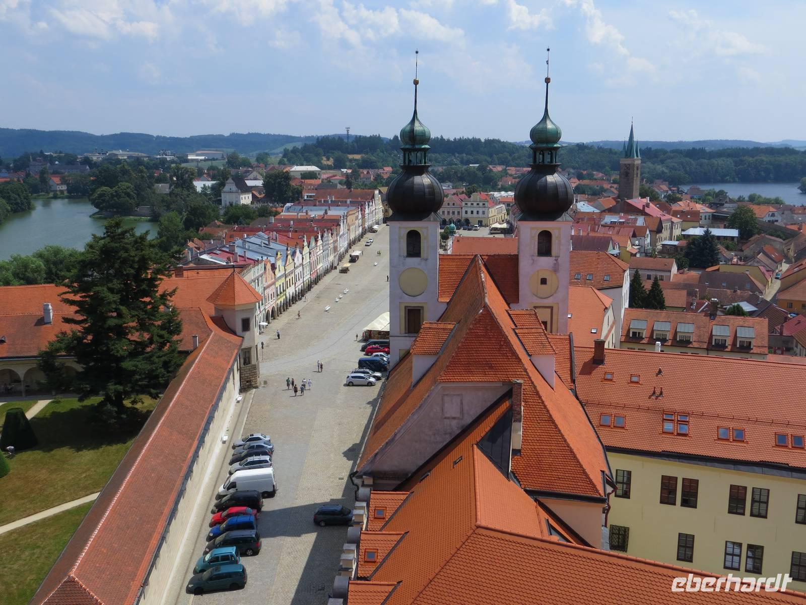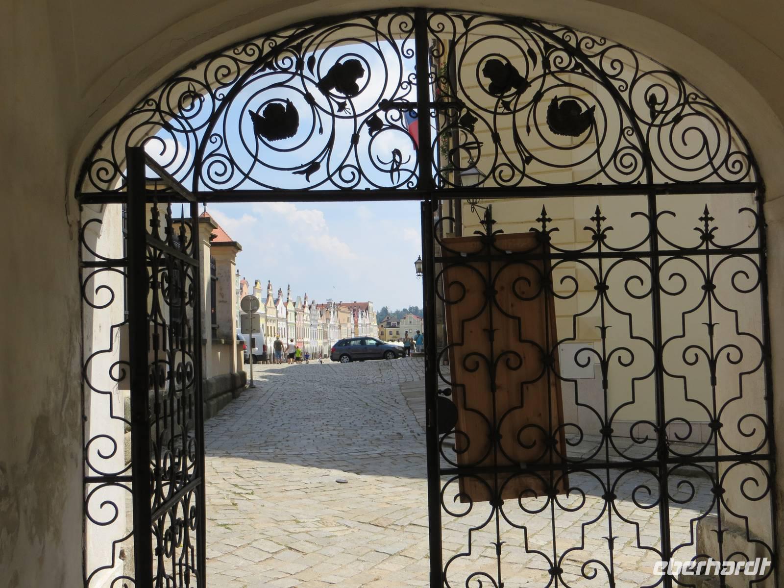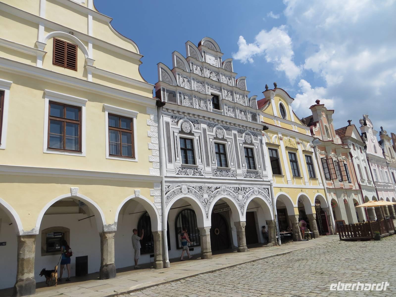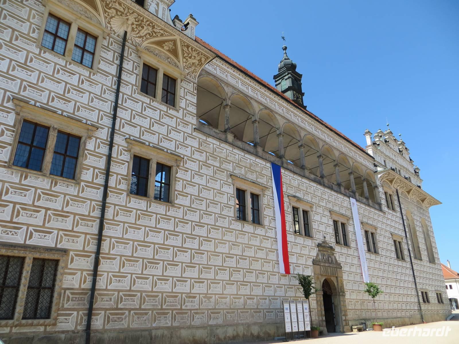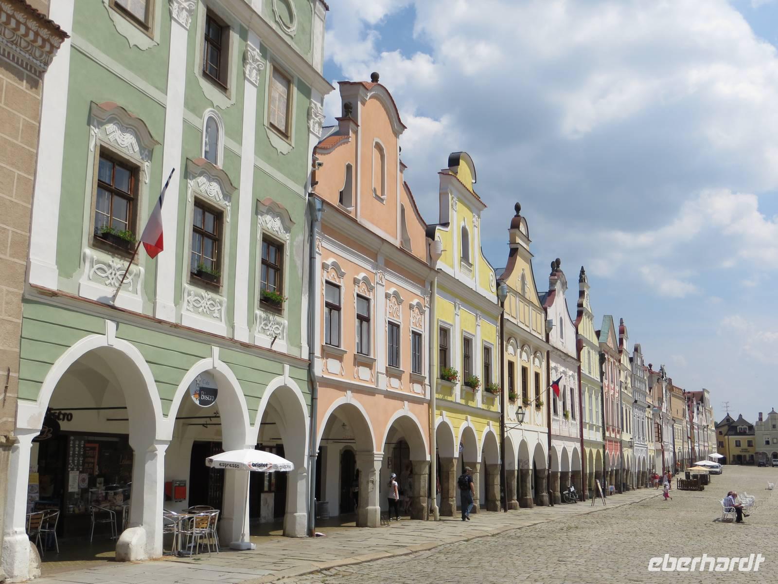Zur Mittagsstunde ging es weiter nach Telc. Wenige hundert Meter vom Parkplatz entfernt erreichten wir den wohl bedeutendsten Marktplatz Tschechiens, der ob seines Bestandes an Gebäuden der Spätrenaissance im Übergang zum Barock Welt(erbe)bedeutung hat. Die Schlossbesichtigung offerierte uns dann Schlossräume der Renaissance, oft noch im Originalzustand, mit eindrucksvollen Kasettendecken. Kein Wunder, dass in diesen Räumen mancher Film, insbesondere auch Märchenfilm, entstand.