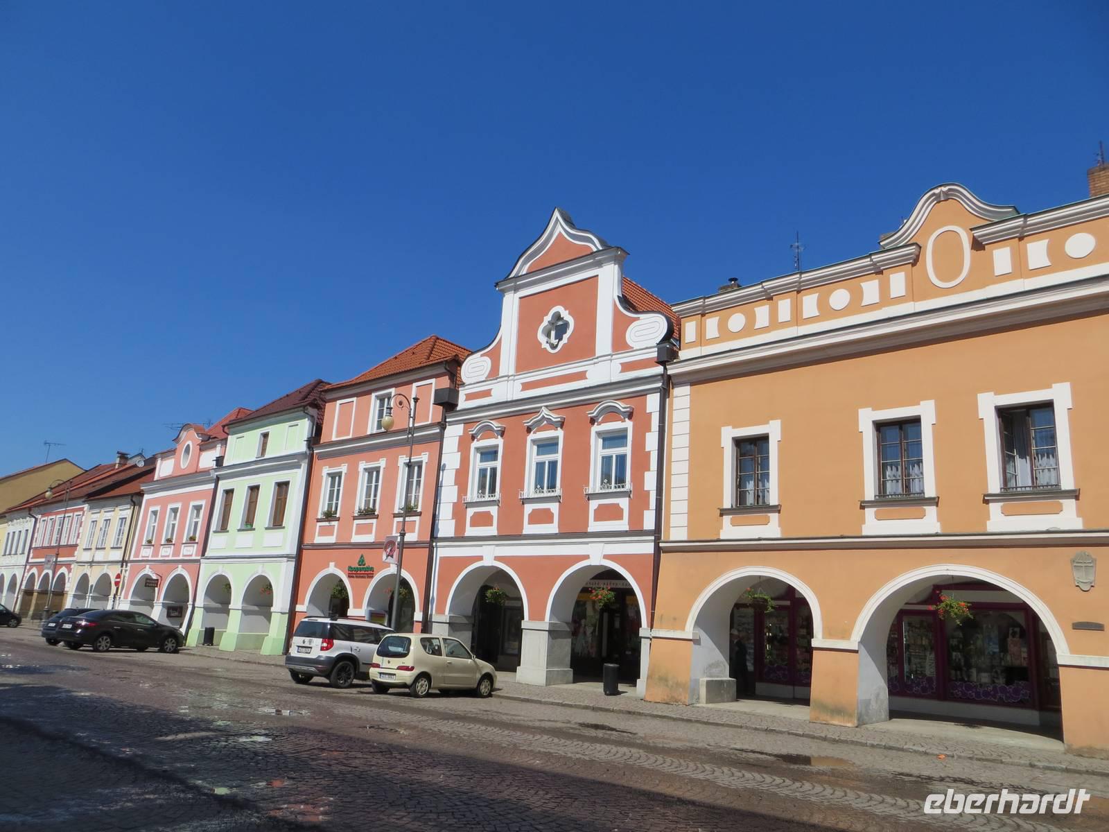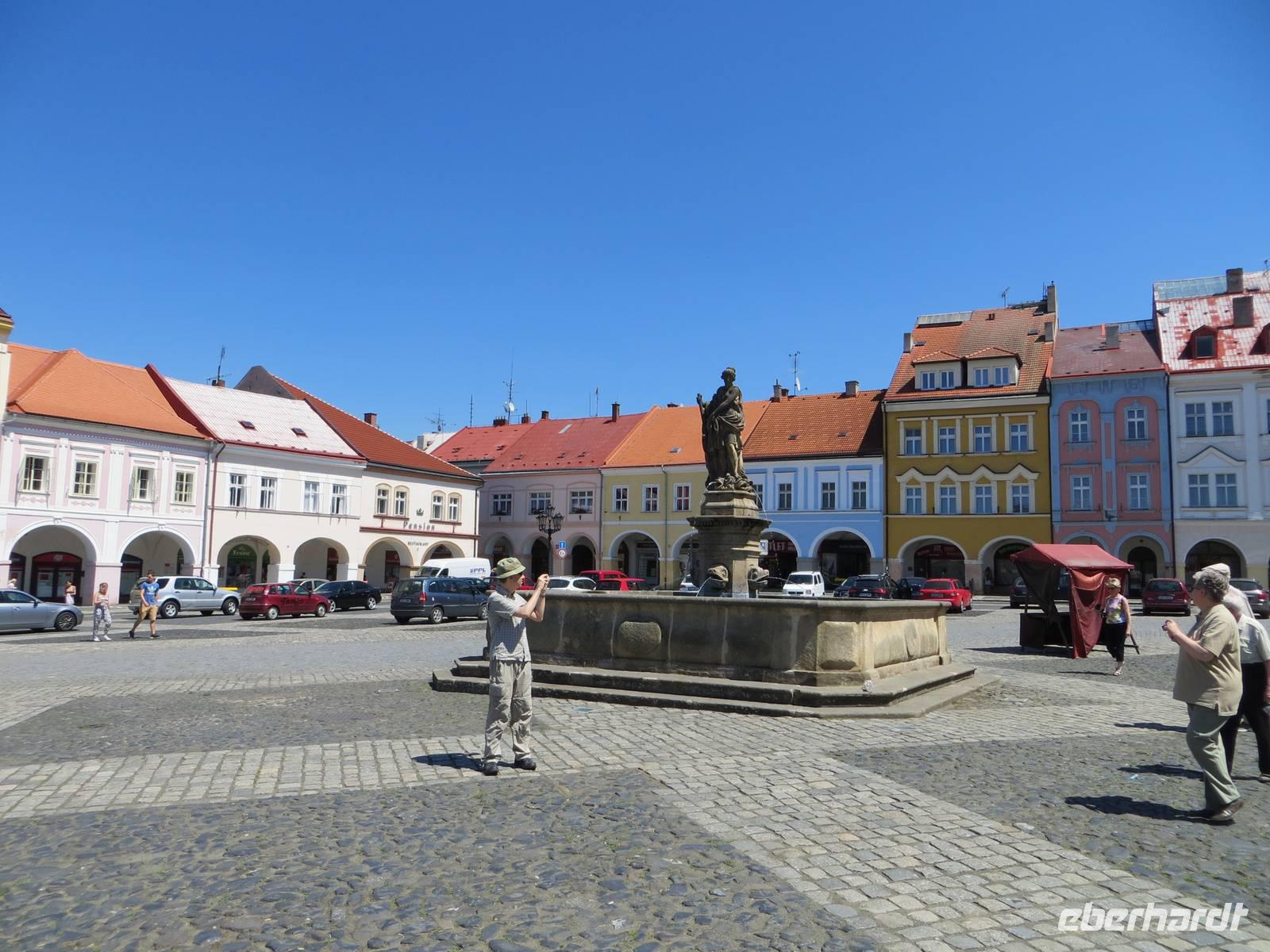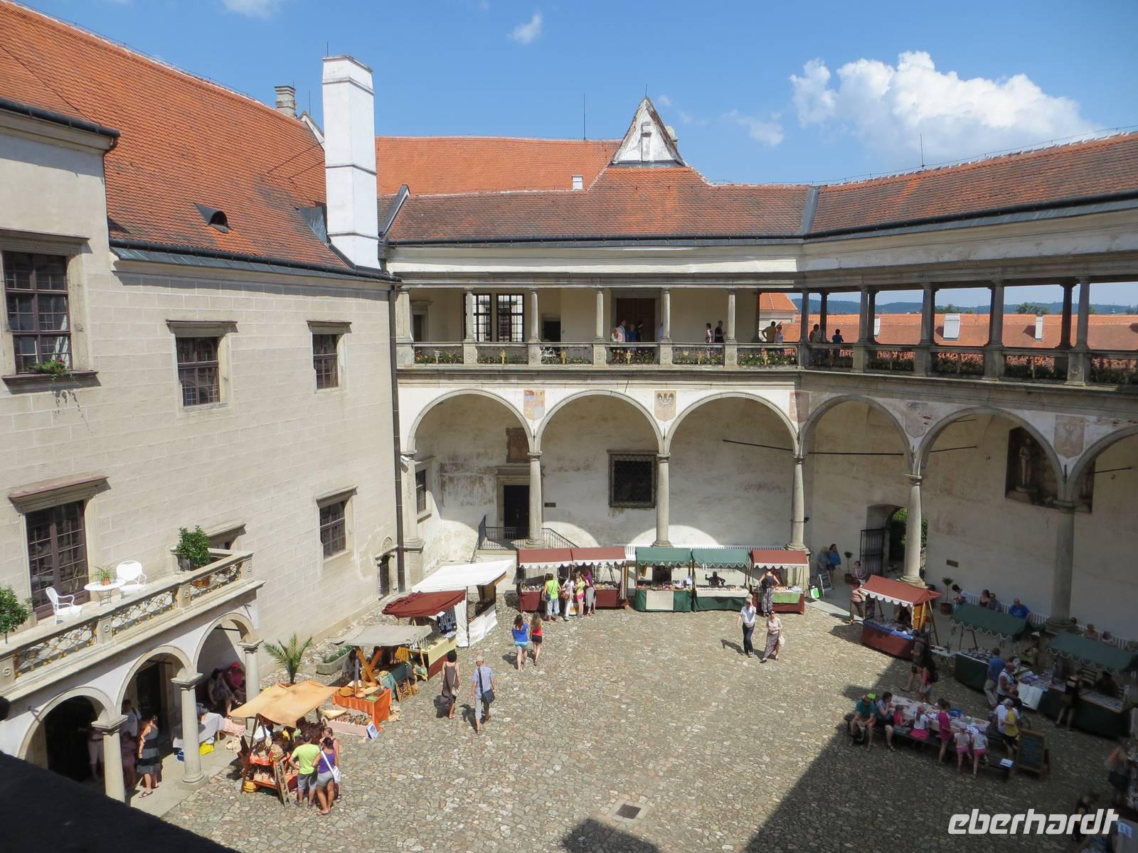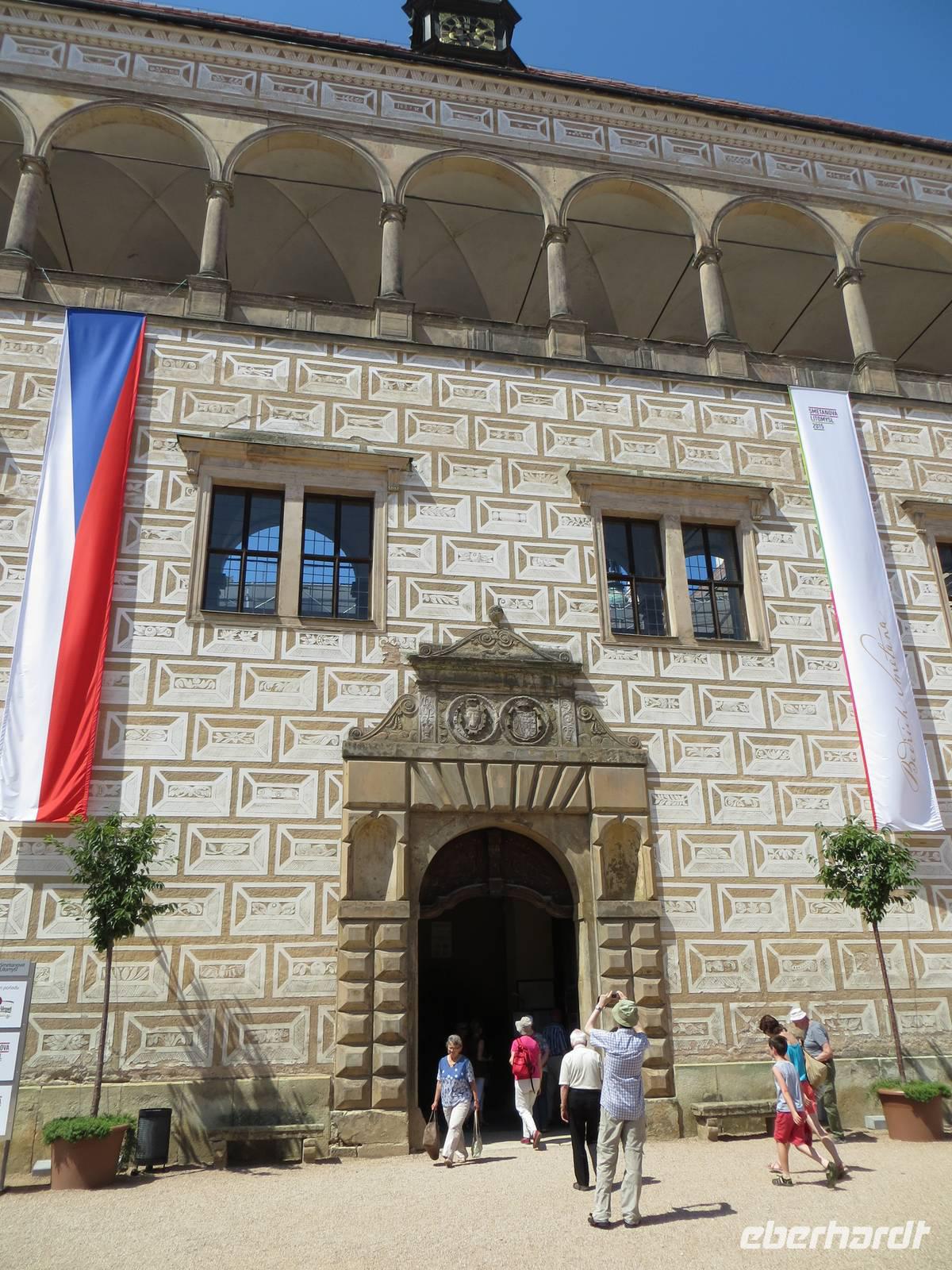 Zur Mittagsstunde ging es weiter nach Telc. Wenige hundert Meter vom Parkplatz entfernt erreichten wir den wohl bedeutendsten Marktplatz Tschechiens, der ob seines Bestandes an Gebäuden der Spätrenaissance im Übergang zum Barock Welt(erbe)bedeutung hat. Die Schlossbesichtigung offerierte uns dann Schlossräume der Renaissance, oft noch im Originalzustand, mit eindrucksvollen Kasettendecken. Kein Wunder, dass in diesen Räumen mancher Film, insbesondere auch Märchenfilm, entstand.