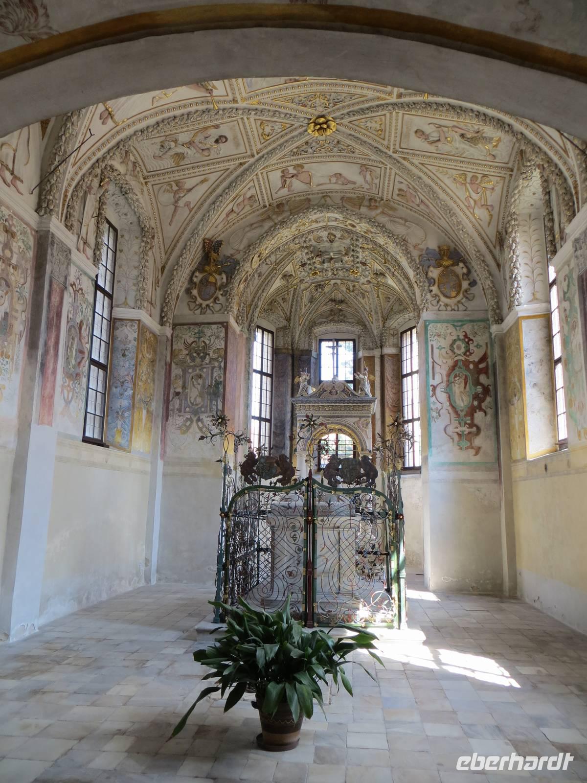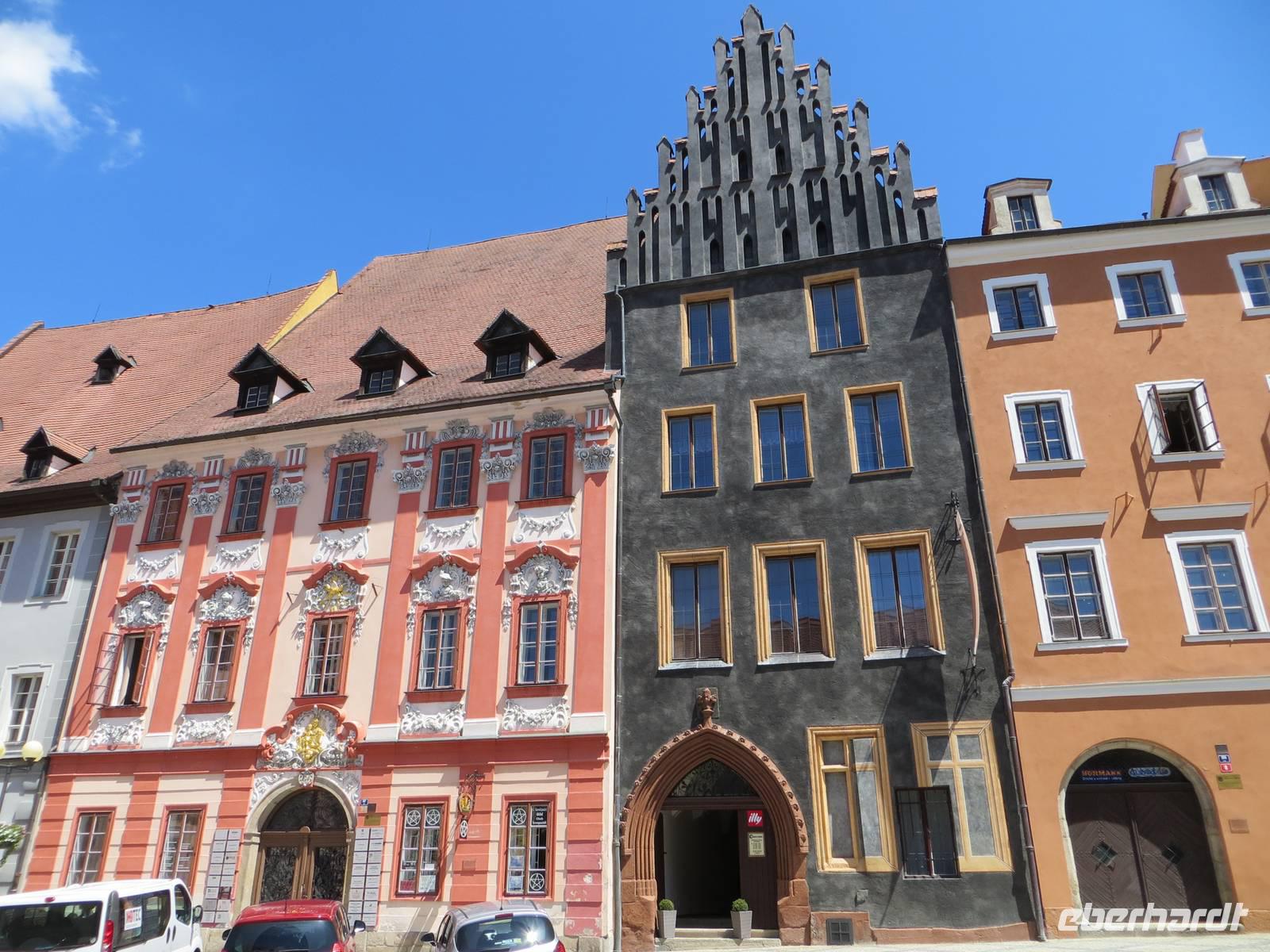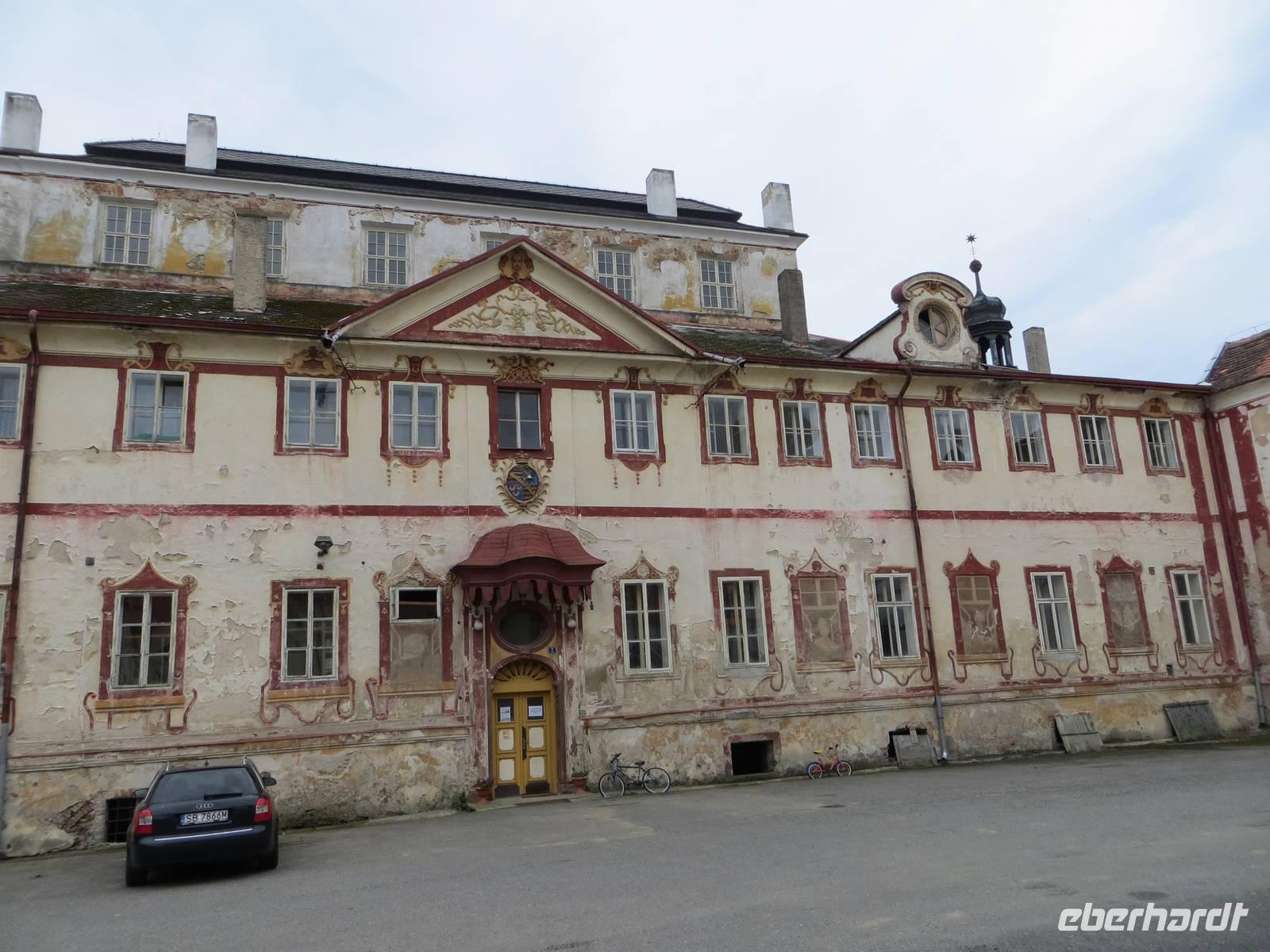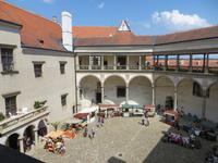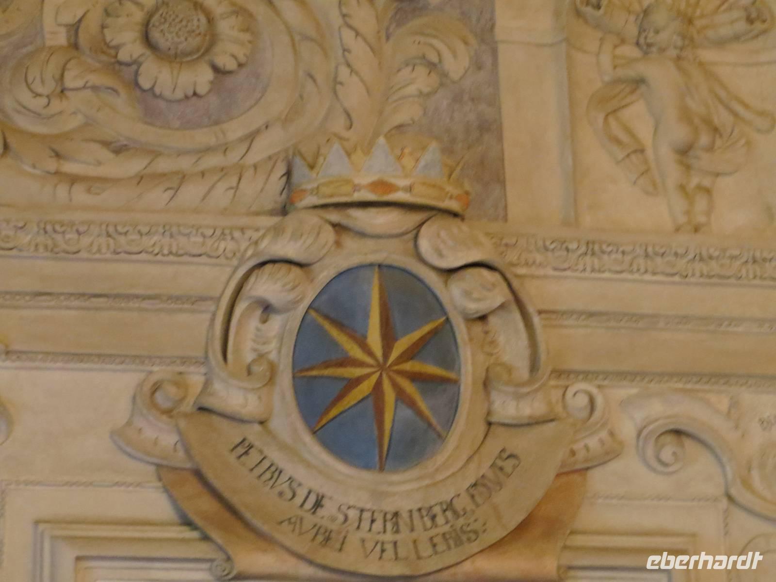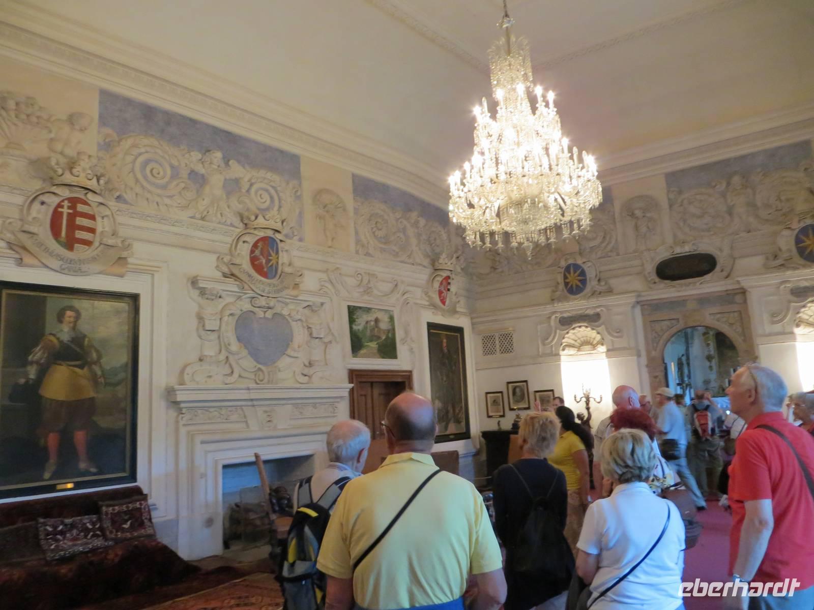 Zur Mittagsstunde ging es weiter nach Telc. Wenige hundert Meter vom Parkplatz entfernt erreichten wir den wohl bedeutendsten Marktplatz Tschechiens, der ob seines Bestandes an Gebäuden der Spätrenaissance im Übergang zum Barock Welt(erbe)bedeutung hat. Die Schlossbesichtigung offerierte uns dann Schlossräume der Renaissance, oft noch im Originalzustand, mit eindrucksvollen Kasettendecken. Kein Wunder, dass in diesen Räumen mancher Film, insbesondere auch Märchenfilm, entstand.