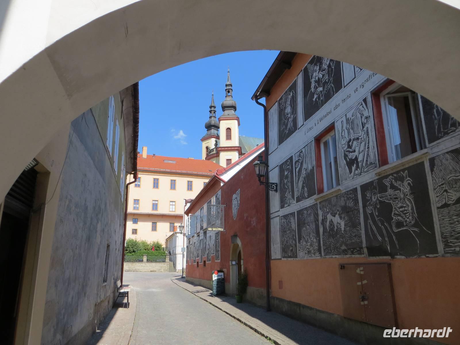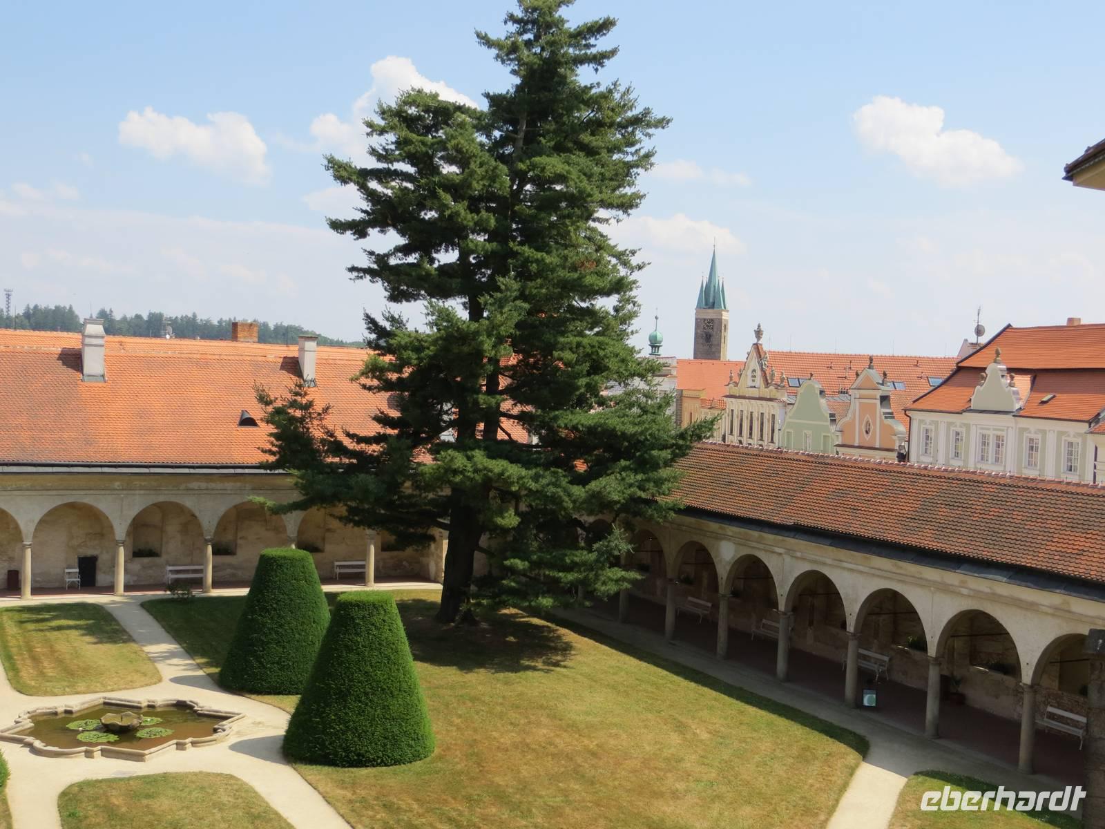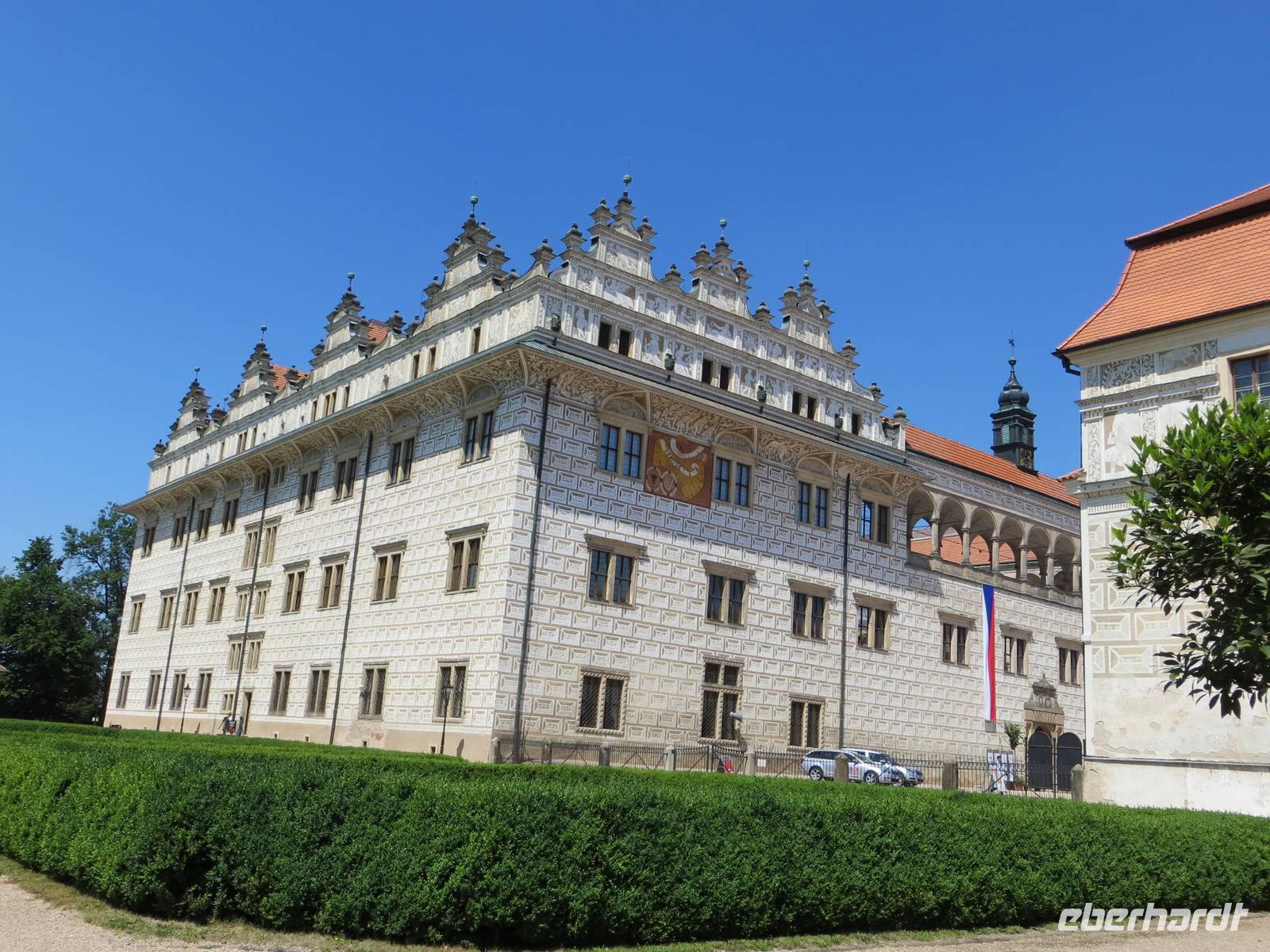 Gegen Nachmittag erreichten wir Litomysl, die Geburtsstadt Smetanas: natürlich nicht ohne vorher „Aus Böhmens Hain und Flur" aufzulegen. Gemeinsam spazierten wir zunächst vom langen Marktplatz mit prächtigen Häusern aus Renaissance und Barock hinauf zum Schloss mit seiner bekannten Sgraffiti-Fassade. Für die hiesigen Musikfestspiele waren im Innenhof des Schlosses eine Bühne und mehr als tausend Plätze errichtet - so konnte man den von den UNESCO-„geehrten" Sgraffiti im Innenhof nur vom obersten Schlossgang sehen. Beeindruckend aber das kleine Schlosstheater - eines der ältesten noch original erhaltenen Theater in Europa.