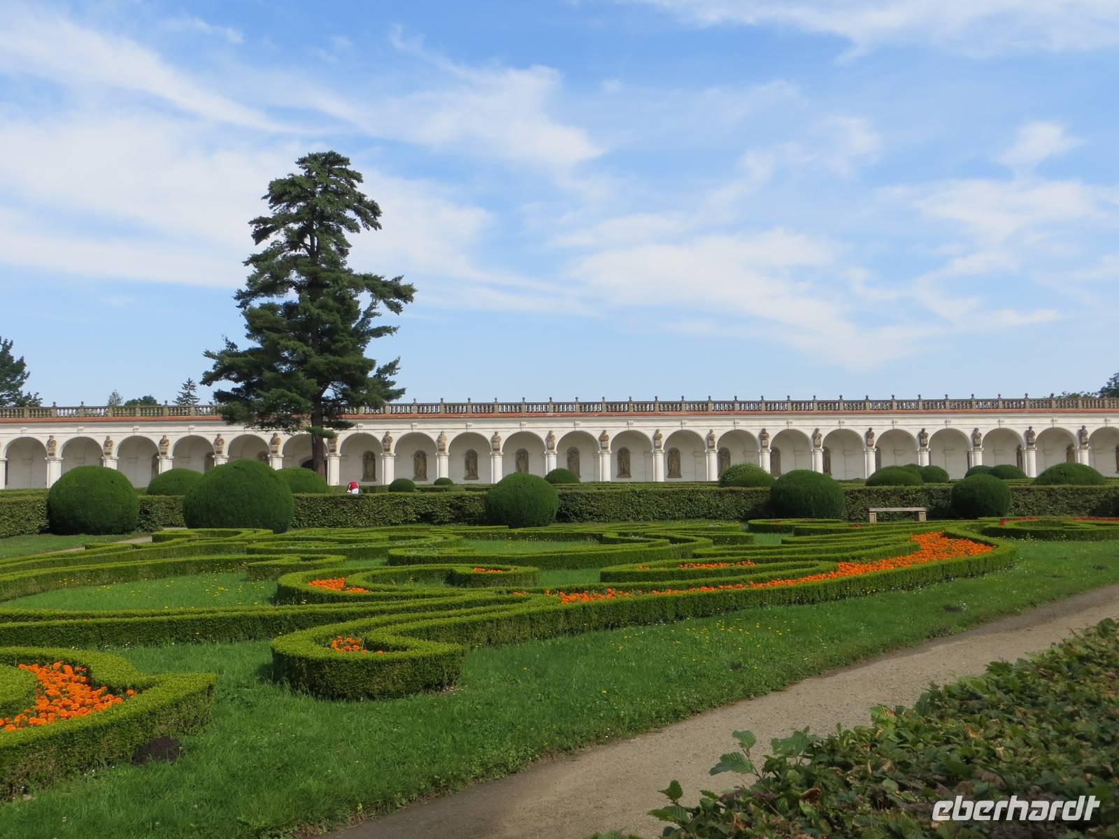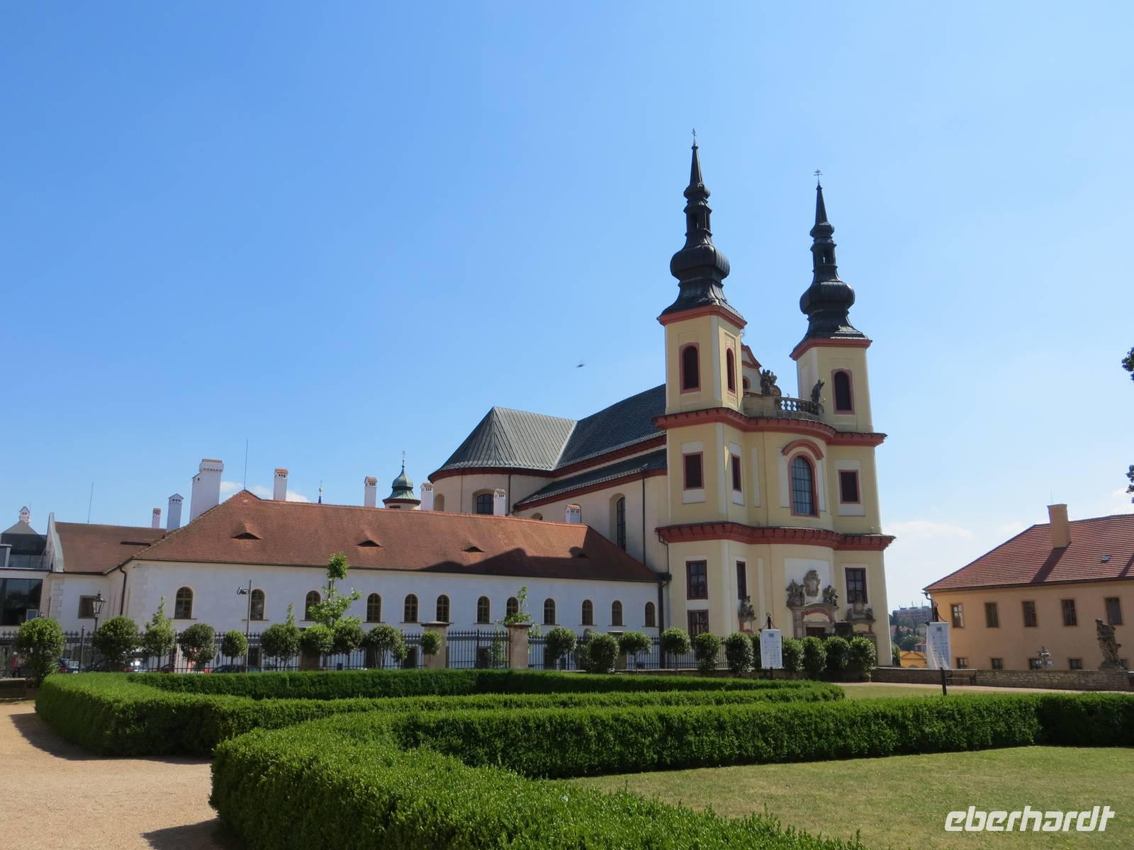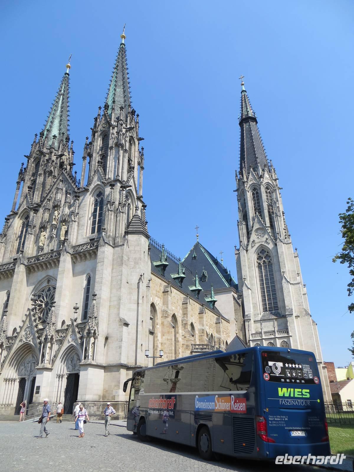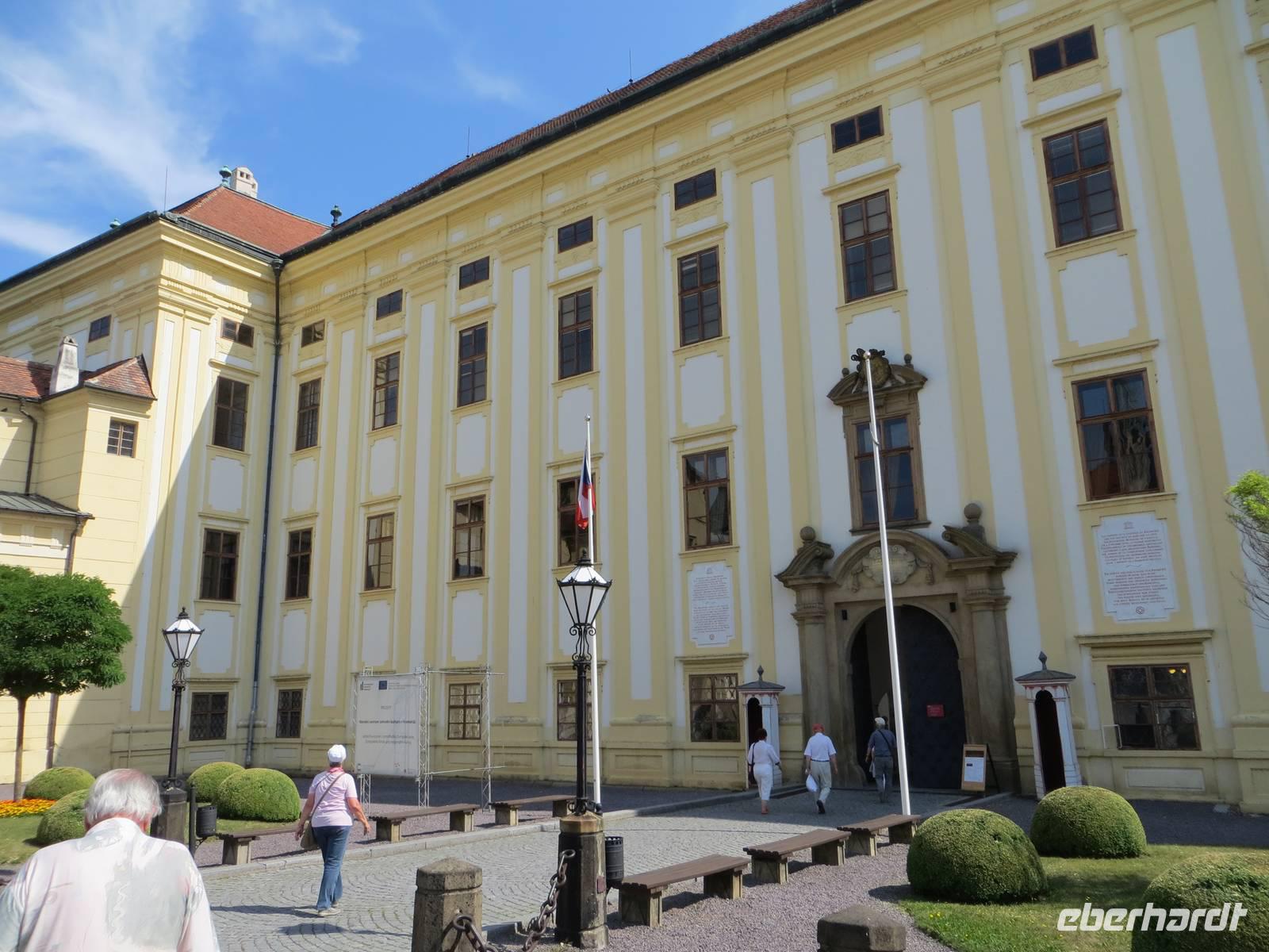 Ein weiterer heißer Reisetag stand bevor: acht Uhr starteten wir nach Kromeriz. Dort schlenderten wir zunächst durch den Blumengarten, eine wohlgeordnete Parklandschaft im französischen Stil mit klassizistischen Kolonnaden. Neu eröffnet seit diesem Jahr nun auch das östliche Areal des Parks und die Orangerien. So gewinnt dieses phantastische Gartenbauensemble noch mehr an Wert. Am UNESCO-Weltkulturerbe-Standort mit Schloss und einem englischen Park bestaunten wir das Schloss. Von besonderer geschichtlicher Bedeutung ist im Schloss der große Saal, in dem sich 1848/49 ein österreichischer Reichstag zu gründen versuchte. Zur heißen Mittagszeit besuchten wir den bischöflichen Weinkeller und kosteten Tropfen aus teils französischen Reben, die in der Region angebaut werden und den Gaumen der Bischöfe noch heute benetzen: Ruländer, Riesling, Sauvignon und Frankovka. Den Imbiss zum Besänftigen des Alkohols nahmen wir einige Schritte entfernt in der ehemaligen Münzstätte des Bischofs ein. So schon ein wenig müde fuhren wir nach Olmütz, der ehemaligen mährischen Metropole mit Erzbischofssitz. Für manchen ist es wohl die nach Prag schönste historische Altstadt Tschechiens; für die meisten Gäste in diesem Jahr war es bei 36 Grad allerdings recht anstrengend. Vom Dom St. Wenzel brachte uns der Bus vorbei an bischöflichen Gebäuden und Universitätsgebäuden bis in die Nähe des Ober- und Untermarktes mit Rathaus und Dreifaltigkeitssäule - wieder ein tschechisches UNESCO-Welterbe.