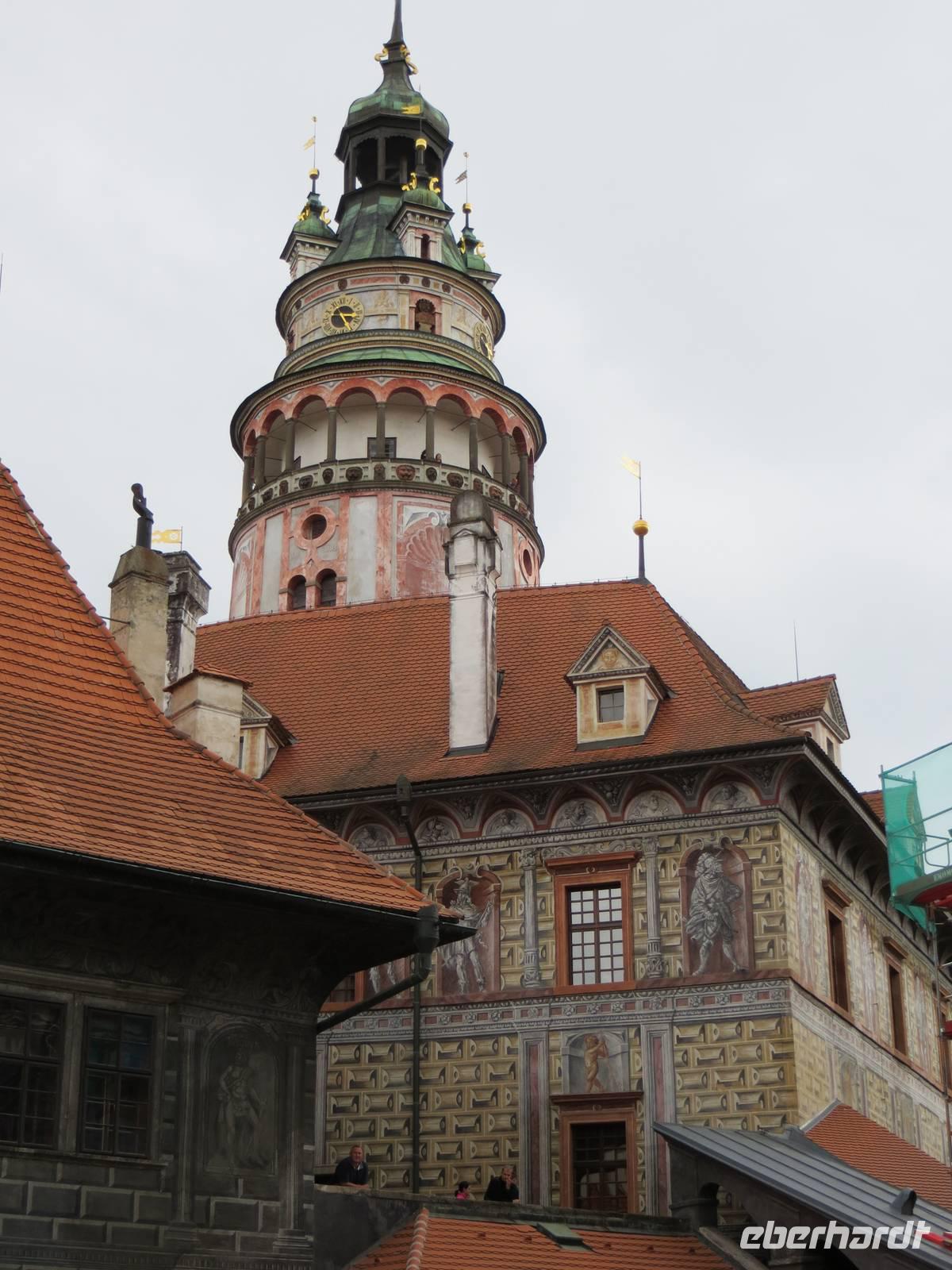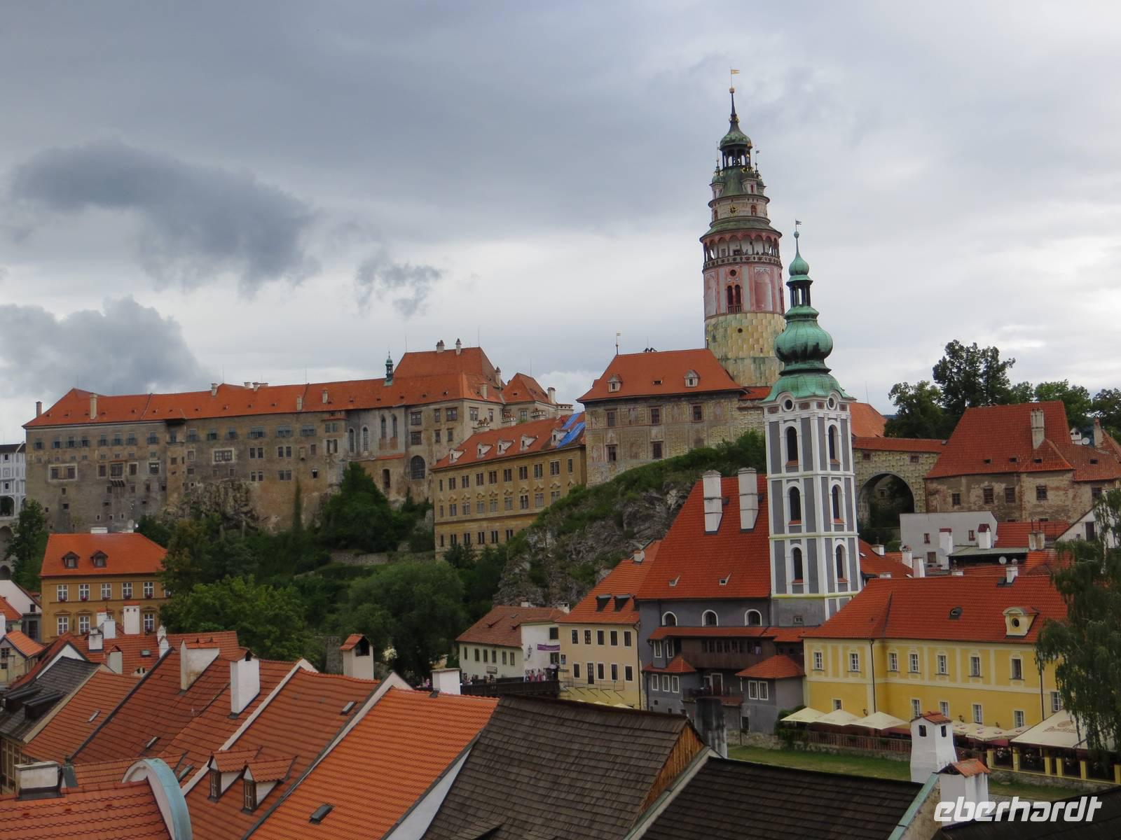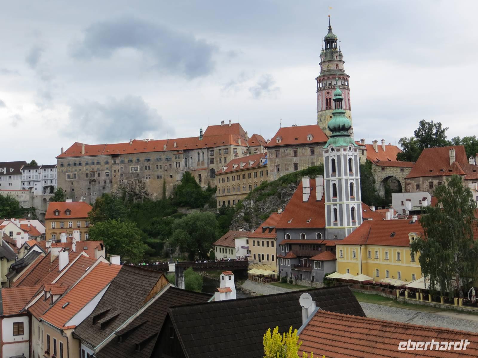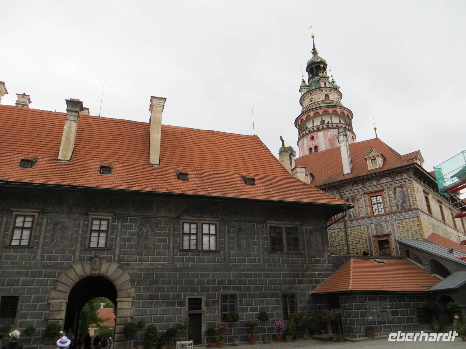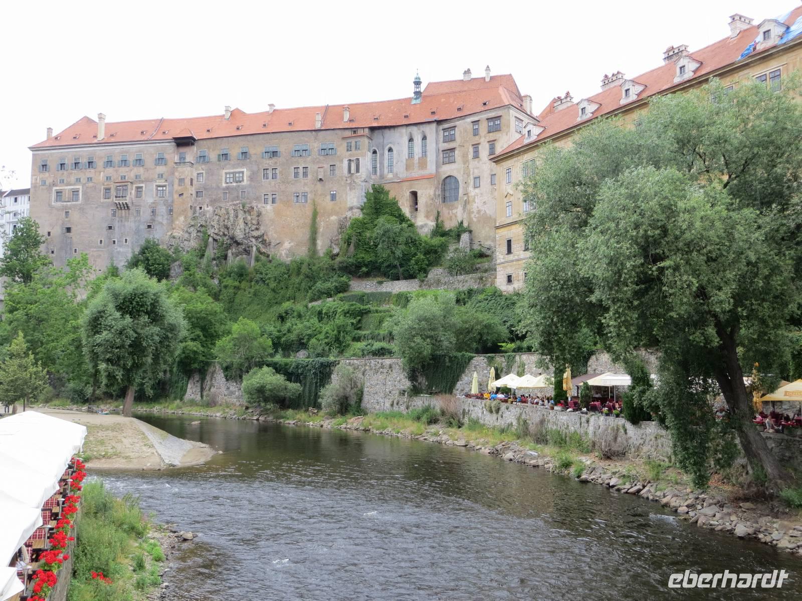 Am Vormittag erreichten wir das im Tudorstil errichtete weiße Schloss Hluboka, inmitten einer schönen, englischen Parklandschaft. Einst den Schwarzenbergs gehörend, verfügt es wohl über die schönsten holzgetäfelten Wände mit oft immensen Schnitzereien. Indess der An- und Abstieg zum Schloss über einige hundert Meter muss bewältigt werden; ein Bähnli half den meisten Gästen. Nach gutem Zureden und mit etwas Mut fuhren wir mit dem Bus in Cesky Krumlov eine (doch nicht!) gesperrte Straße über die Moldau zur Brauerei Eggenberg. Die Brauerei ist zur Besichtigung geschlossen, weshalb wir ja bereits am Vortage die Brauerei Bernard in Humpolec besucht hatten. Einst wurde hier ein „Verlegerabzug" für den Giganten Budweis produziert, heute wird nun hier mit alter Technik in kleinen Mengen ein Privatbier entsprechend der geringen Nachfrage produziert und auf die vertriebsaggressiven Großbrauereinen mit Argwohn geschaut. In der Brauereigaststätte ließen wir uns das Bier zum Entenbraten schmecken. Cesky Krumlov und sein Schloss gehörte einst dem Geschlecht der Rozenbergs, später den Eggenbergs, dann den Schwarzenbergs - dies alles erfuhren wir unserer Visite im Schloss, nachdem alle Gäste bereits individuell die hübsche Altstadt erkundet hatten. In zügiger Fahrt ging es dann entlang der Moldau, durch Budweis mit seiner Brauerei zurück nach Tabor.