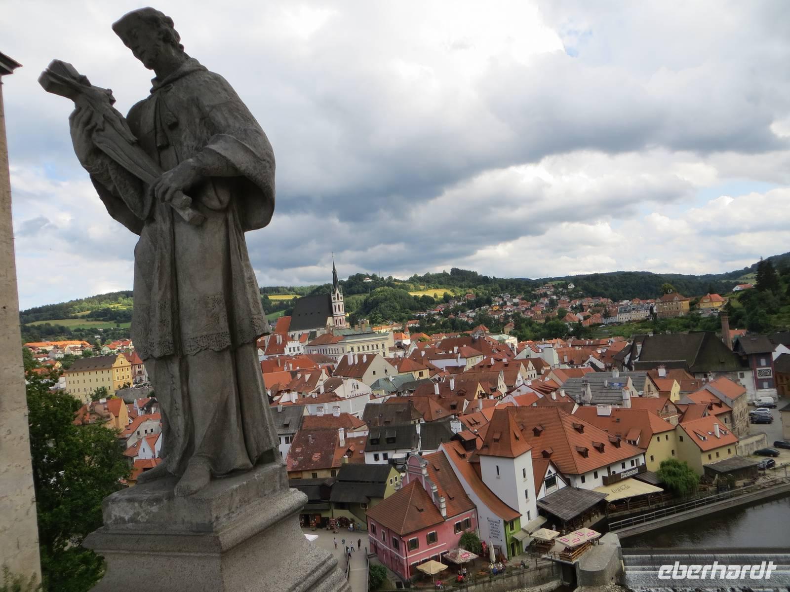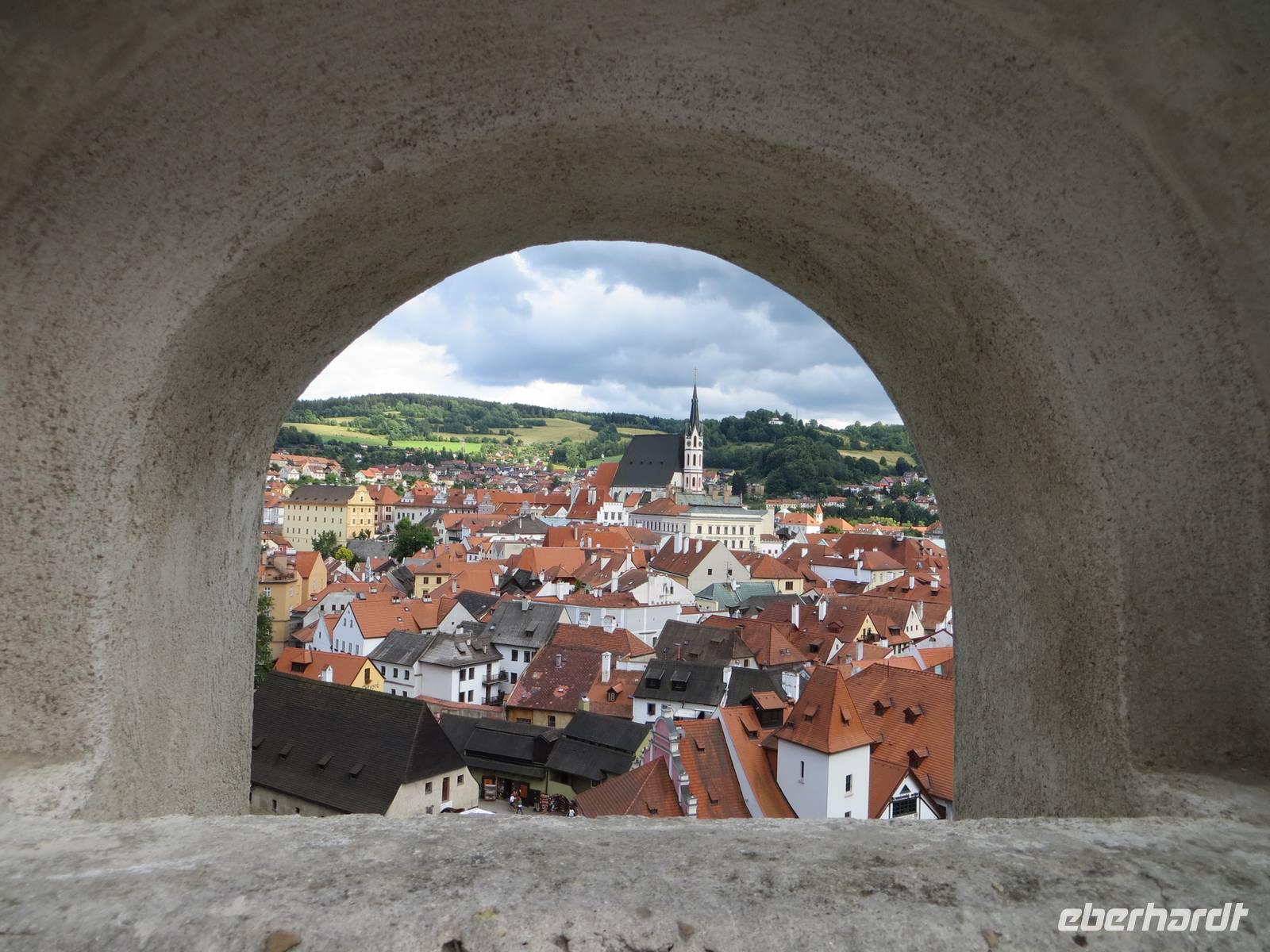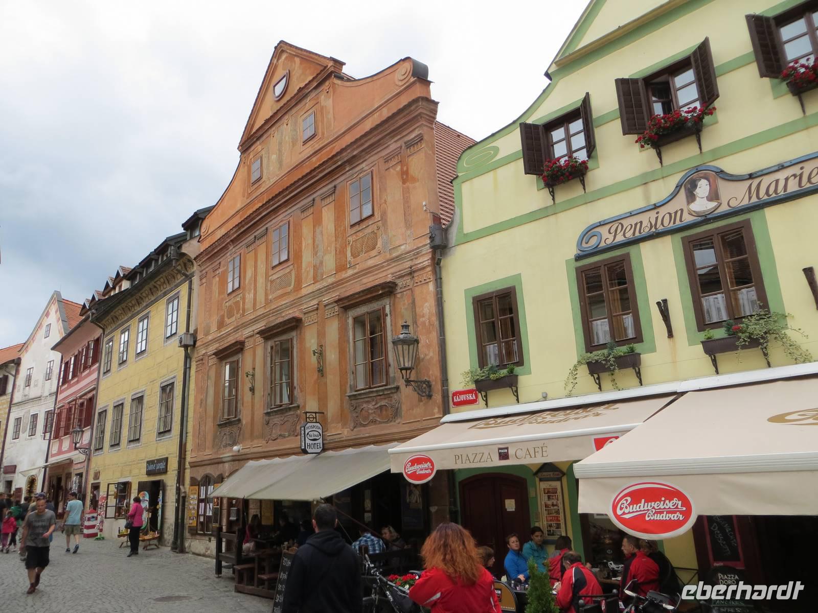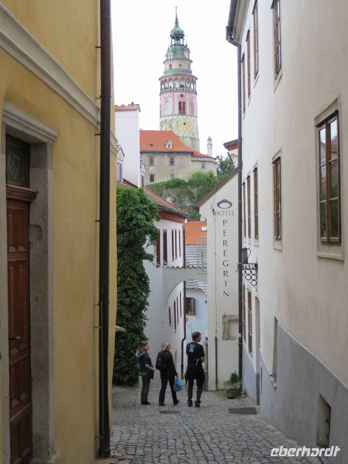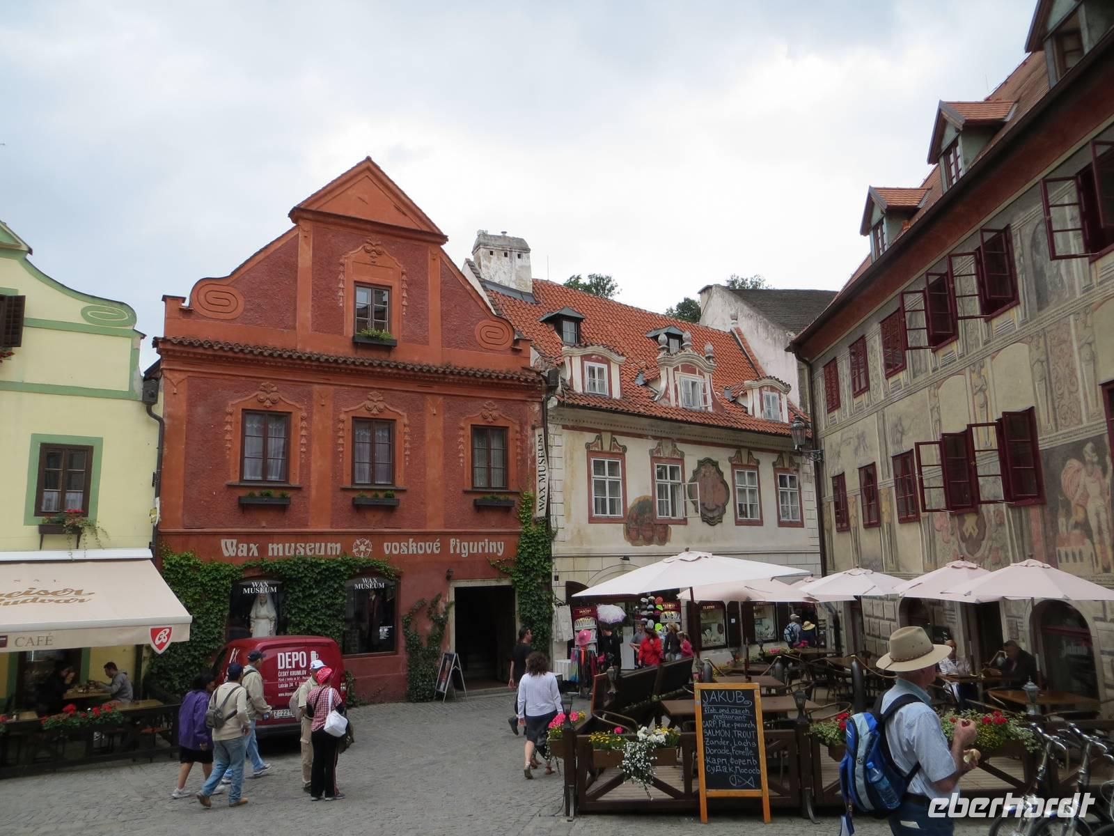 Am Vormittag erreichten wir das im Tudorstil errichtete weiße Schloss Hluboka, inmitten einer schönen, englischen Parklandschaft. Einst den Schwarzenbergs gehörend, verfügt es wohl über die schönsten holzgetäfelten Wände mit oft immensen Schnitzereien. Indess der An- und Abstieg zum Schloss über einige hundert Meter muss bewältigt werden; ein Bähnli half den meisten Gästen. Nach gutem Zureden und mit etwas Mut fuhren wir mit dem Bus in Cesky Krumlov eine (doch nicht!) gesperrte Straße über die Moldau zur Brauerei Eggenberg. Die Brauerei ist zur Besichtigung geschlossen, weshalb wir ja bereits am Vortage die Brauerei Bernard in Humpolec besucht hatten. Einst wurde hier ein „Verlegerabzug" für den Giganten Budweis produziert, heute wird nun hier mit alter Technik in kleinen Mengen ein Privatbier entsprechend der geringen Nachfrage produziert und auf die vertriebsaggressiven Großbrauereinen mit Argwohn geschaut. In der Brauereigaststätte ließen wir uns das Bier zum Entenbraten schmecken. Cesky Krumlov und sein Schloss gehörte einst dem Geschlecht der Rozenbergs, später den Eggenbergs, dann den Schwarzenbergs - dies alles erfuhren wir unserer Visite im Schloss, nachdem alle Gäste bereits individuell die hübsche Altstadt erkundet hatten. In zügiger Fahrt ging es dann entlang der Moldau, durch Budweis mit seiner Brauerei zurück nach Tabor.