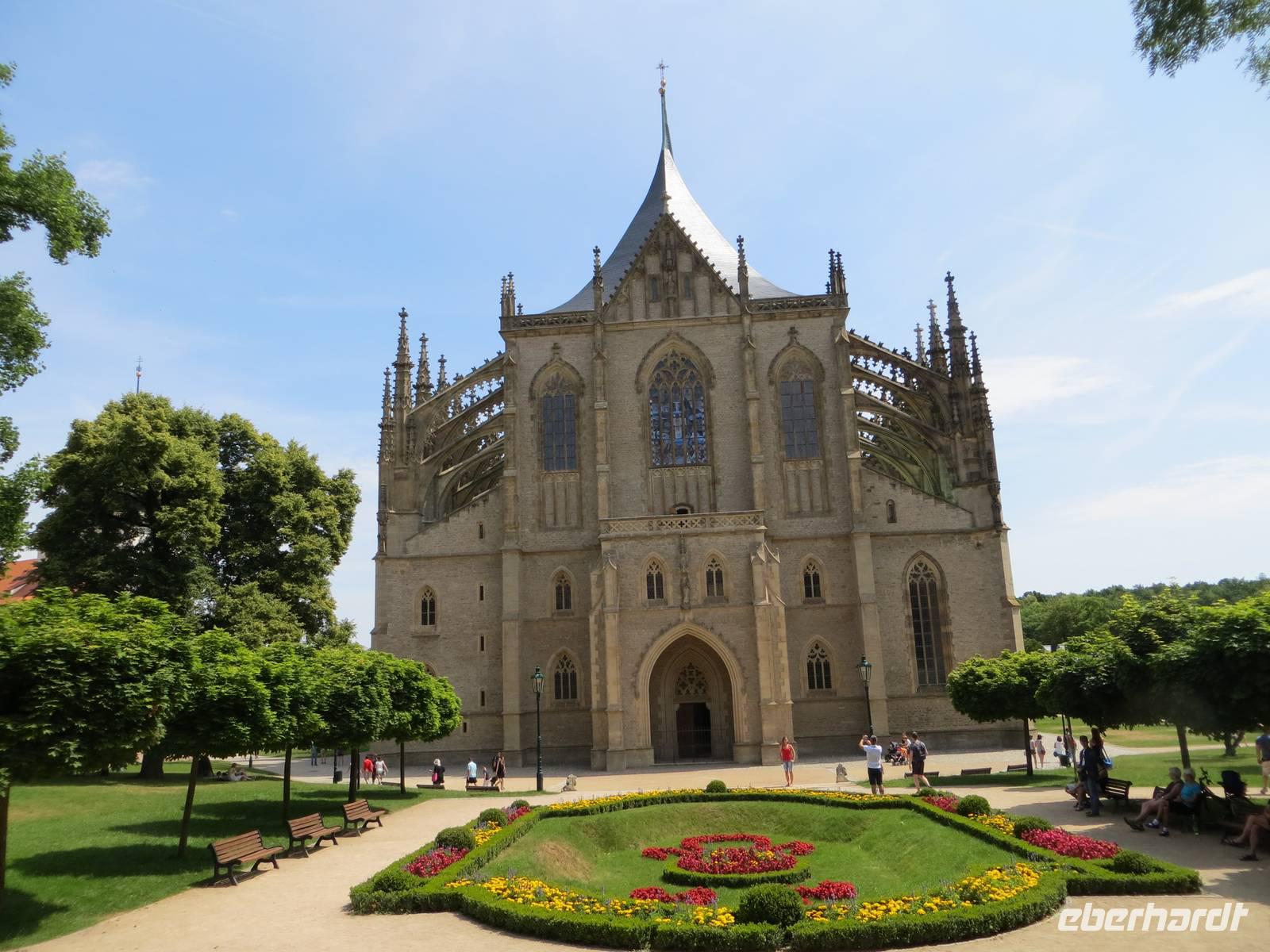 Sonnenschein begleitete uns bei der Ausfahrt aus Prag: Erinnerung, dass Vysegrad die erste Prager Burg war, also Vysegrad von Smetana - aus dem Zyklus Mein Vaterland - eingespielt. Nach einer reichlichen Stunde hatten wir Kolin, Köln an der Elbe, erreicht. Das eher unbekannte Städtchen war einst Königsstadt und erlebte 1757 die Schlacht des Großen Fritzen gegen die Österreicher, eine der ersten Schlachten im 7-jährigen Krieg. St. Bartolomäus war nach langer Rekonstruktion nun geöffnet, so konnten wir diese gotische Kirche besichtigen. Davor hatten wir bereits eine kleine Runde über den Markt mit einem prächtigen Rathaus und durch das ehemalige jüdische Viertel mit einer Synagoge gedreht. Zur Mittagszeit trafen wir in Kuttenberg ein und erkundeten das Örtchen an der Kathedrale St. Barbara beginnend. Die Netzkonstruktion des riesigen Kirchenschiffs ist beeindruckend. Das riesige Jesuitenkolleg auf dem Weinberg ist frisch rekonstruiert und strahlte uns beim Weg über die Terrasse - als Weg vom Kolleg zur Kirche einst entstanden - entgegen. Aufgeräumte Gässchen mit zahlreichen Kneipen machten den Bummel und eine Rast im Örtchen Kutna Hora sehr angenehm.
