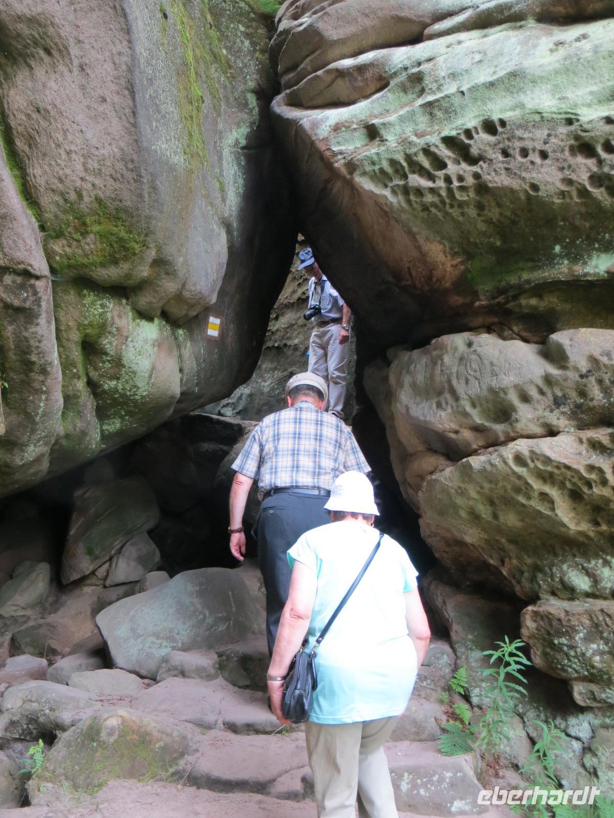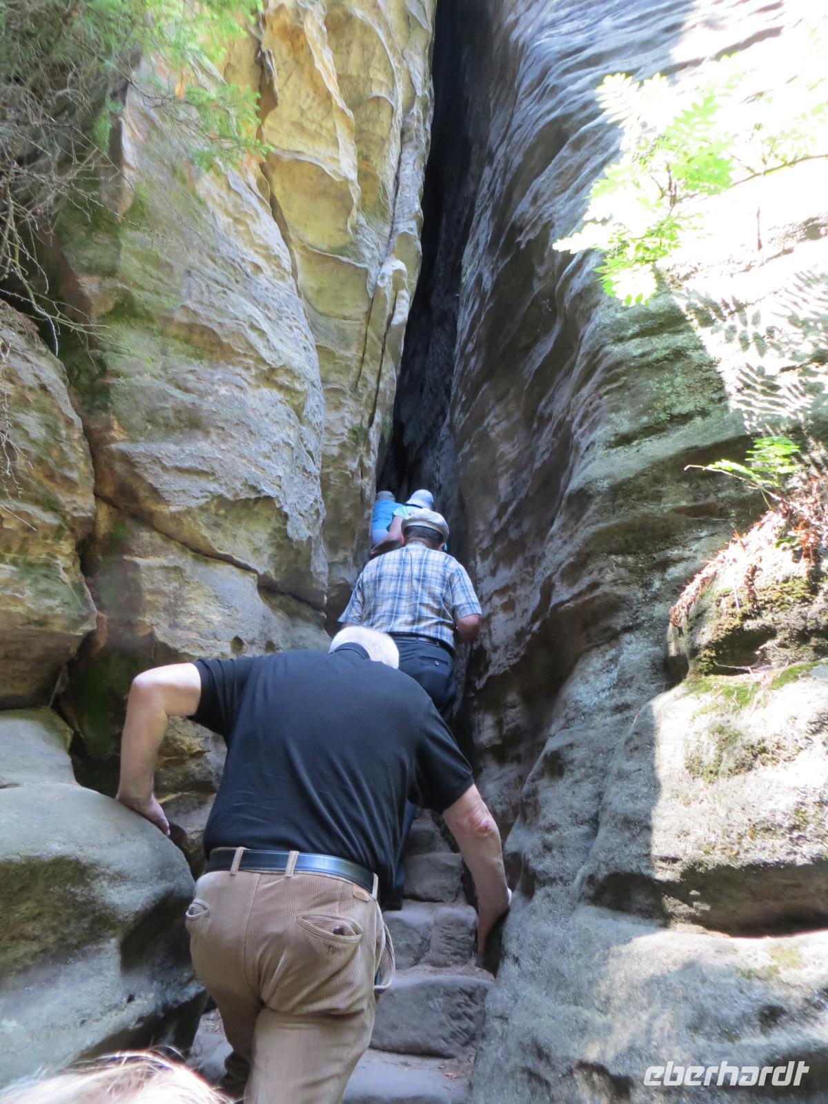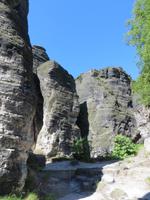 Nach einer Fahrt über Vrchlabi und an Jicin vorbei erreichten wir den südwestlichen Rand des Böhmischen Paradieses. Hier befindet sich, in einem Gebirgstälchen abseits üblicher erhabener Burgen, die Burg Kost, eine der besterhaltensten spätgotischen Burgen Böhmens mit Ergänzungsbauten in der Renaissance. Bereits die Lage der Burg in der Felsenwelt mit Teichen voller Entengrütze ist romantisch. In der Renaissance wurden Wände des Burgpalastes mit einem „Briefumschlag-Sgraffito" verziert. Bei unserem Bummel durch Burgräume , die Küche und über einen Wehrgang zum markanten Weißen Turm erfuhren wir mehr über die jahrhundertealte Geschichte böhmischer Fürsten und ihrer Rückkehr auf die Schlösser nach 1991. Die Familie der Kinskys ist weit gefächert und reicht bis in unsere Reisegegenwart - Danke Herr Kinsky. Die Mittagspause verbrachten wir in der hübschen Innenstadt von Jicin. Wallenstein plante hier einst den Ausbau der Residenz des Herzogtums Frydlant. Am Nachmittag erreichten wir das Böhmische Paradies bei 30 Grad Hitze. Dennoch spazierten fast alle Gäste auf einem knapp zwei Kilometer langen Rundweg durch die Prachover Felsen: zunächst über Stufen ging es bald eine natürliche Treppe im engen Felsspalt nach oben. Der kleine Anstieg lohnte sich; von hier oben beeindruckende Blicke auf die Felsen des Böhmischen Paradieses bis hinüber zur Burg Trosky. Den Abstieg in einem Tälchen kühlten dessen noch fast feuchte Wände zu beiden Seiten des Weges. Andere Gäste entschieden sich für einige hundert Meter des Bummelns in der Felsenwelt bis sie im Kessel einer prächtigen Arena aus Sandsteinnadeln im Angesicht deren Höhe den Rückweg antraten und entschieden sich dann für Kaffee oder Bier im Grünen am Eingan des Areals. Auf zügiger Fahrt durch grünes Riesengebirgsvorland ging es dann zurück nach Spindleruv Mlyn.