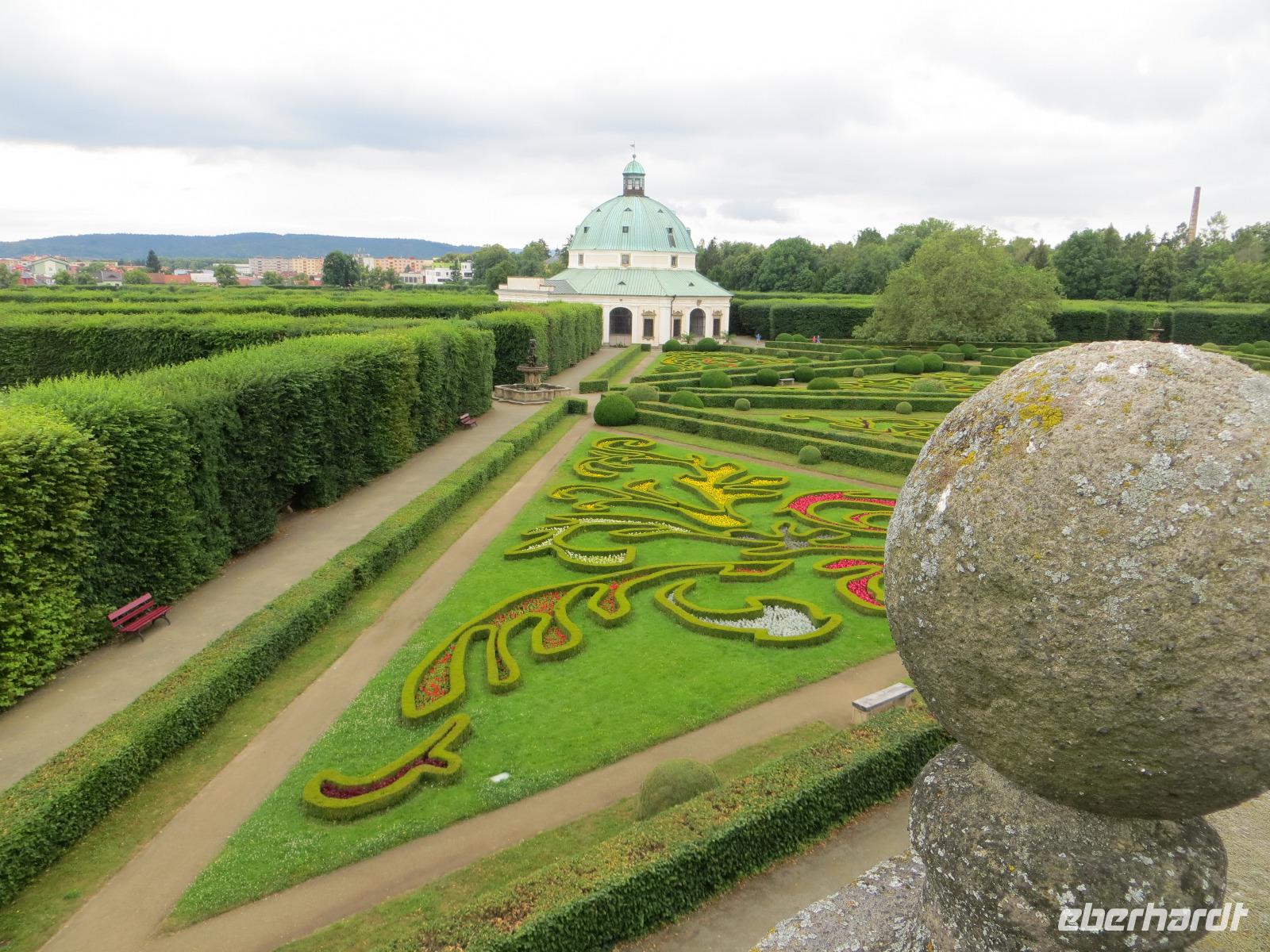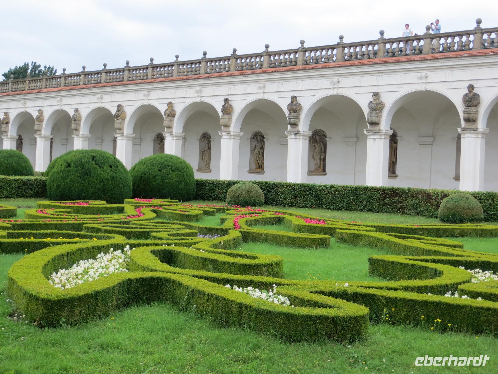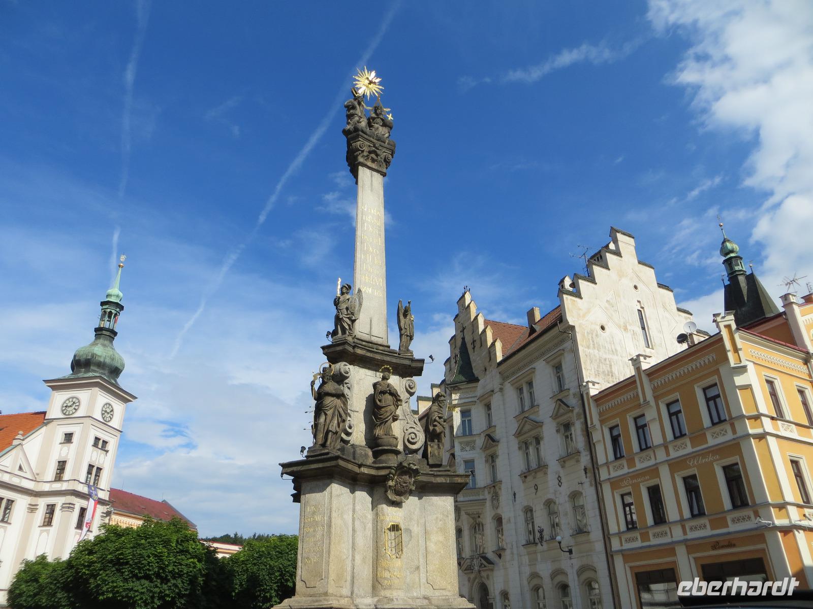 Nach einem heißen Sonnabend hatte es sich in der Nacht mit Regen ein wenig abgekühlt. Acht Uhr starteten wir nach Kromeriz. Am Blumengarten erfuhren wir, dass unser Besuch im Schloss hausintern nicht durchgestellt war. So retteten wir wenigstens eine Führung in englischer Sprache, die wir jedoch sofort antreten mussten. Die meisten Gäste verstanden das touristenaffine Erklärungs-Englisch im Schloss. Vieles erklärt sich auch von Selbst: eine tolle Bibliothek, mit Elfenbeinintarsien versehene Tische, die Garderobe des Erzbischofs und seine verschiedenen Räumlichkeiten. Von besonderer Bedeutung sind jener Saal, wo sich 1848/49 die österreichische Nationalversammlung traf und einige Erinnerungsstücke an einen Besuch des russischen Zaren Alexander III. Anschließend schlenderten wir durch einen Teil des als englischen Park angelegten Gartens am Schloss. Von hier führen wir die wenigen hundert Meter zum Blumengarten von Kromeriz, eine wohlgeordnete Parklandschaft im französischen Stil mit klassizistischen Kolonnaden. Neu eröffnet seit vergangenem Jahr sind nun auch das östliche Areal des Parks und die Orangerien. So gewinnt dieses phantastische Gartenbauensemble noch mehr an Wert. Kromeriz ist so UNESCO-Weltkulturerbe-Standort mit Schloss, Schlosspark und Blumengarten. Bereits am zeitigen Nachmittag erreichten wir Olmütz, die ehemalige mährische Metropole mit Erzbischofssitz. Für manchen ist es wohl die nach Prag schönste historische Altstadt Tschechiens. Vom Dom St. Wenzel bummelten wir vorbei an bischöflichen Gebäuden und Universitätsgebäuden bis in die Nähe des Unter- und Obermarktes mit Rathaus und Dreifaltigkeitssäule - wieder ein tschechisches UNESCO-Welterbe.