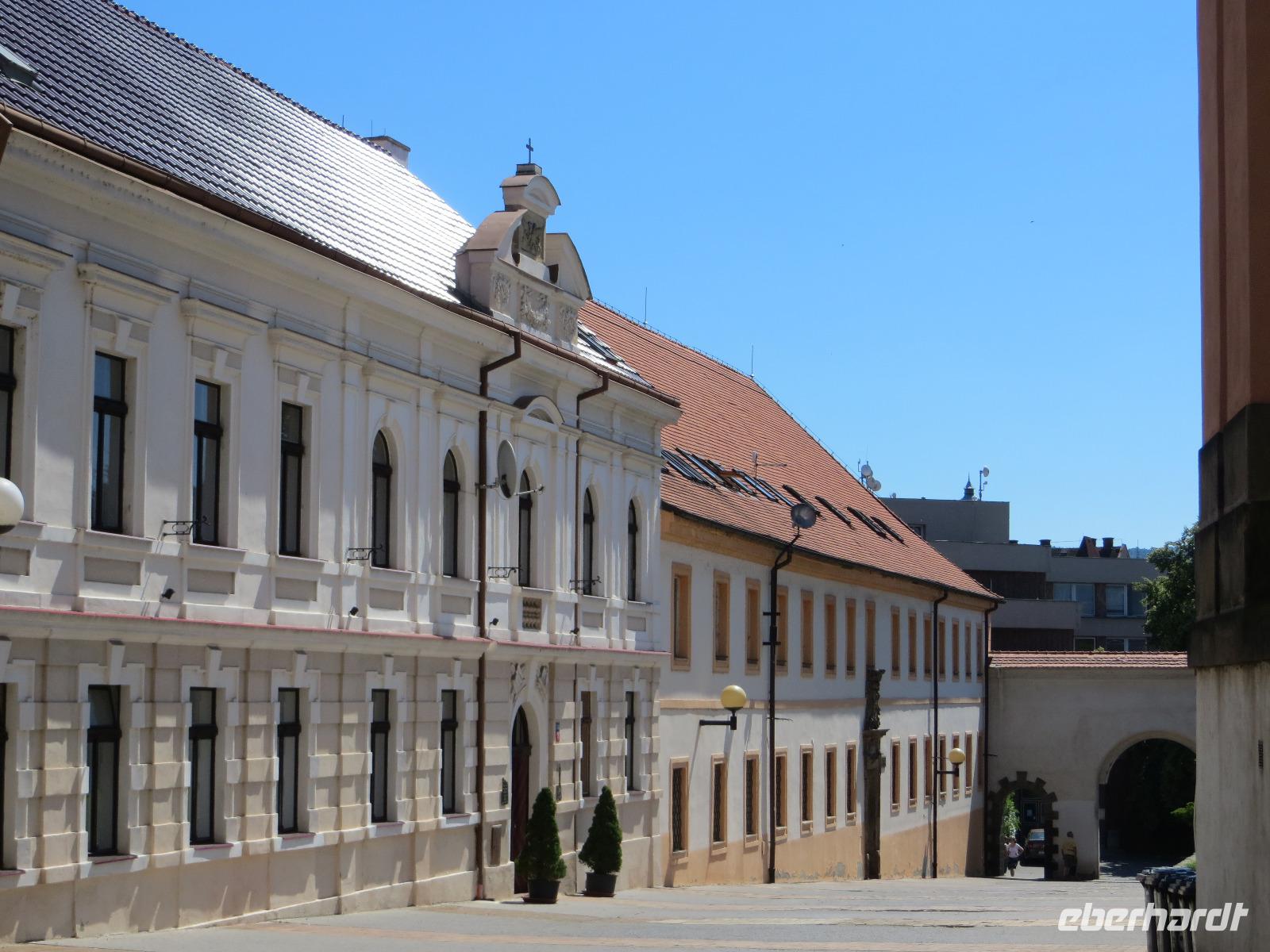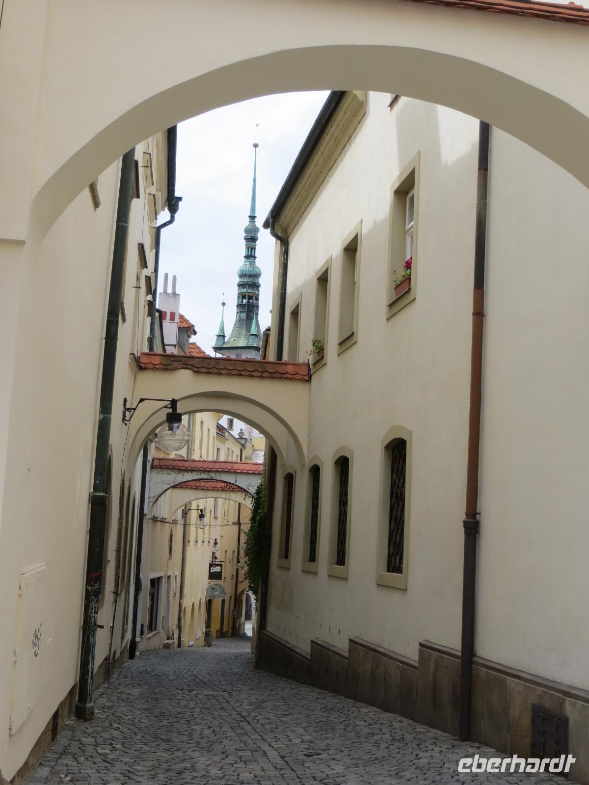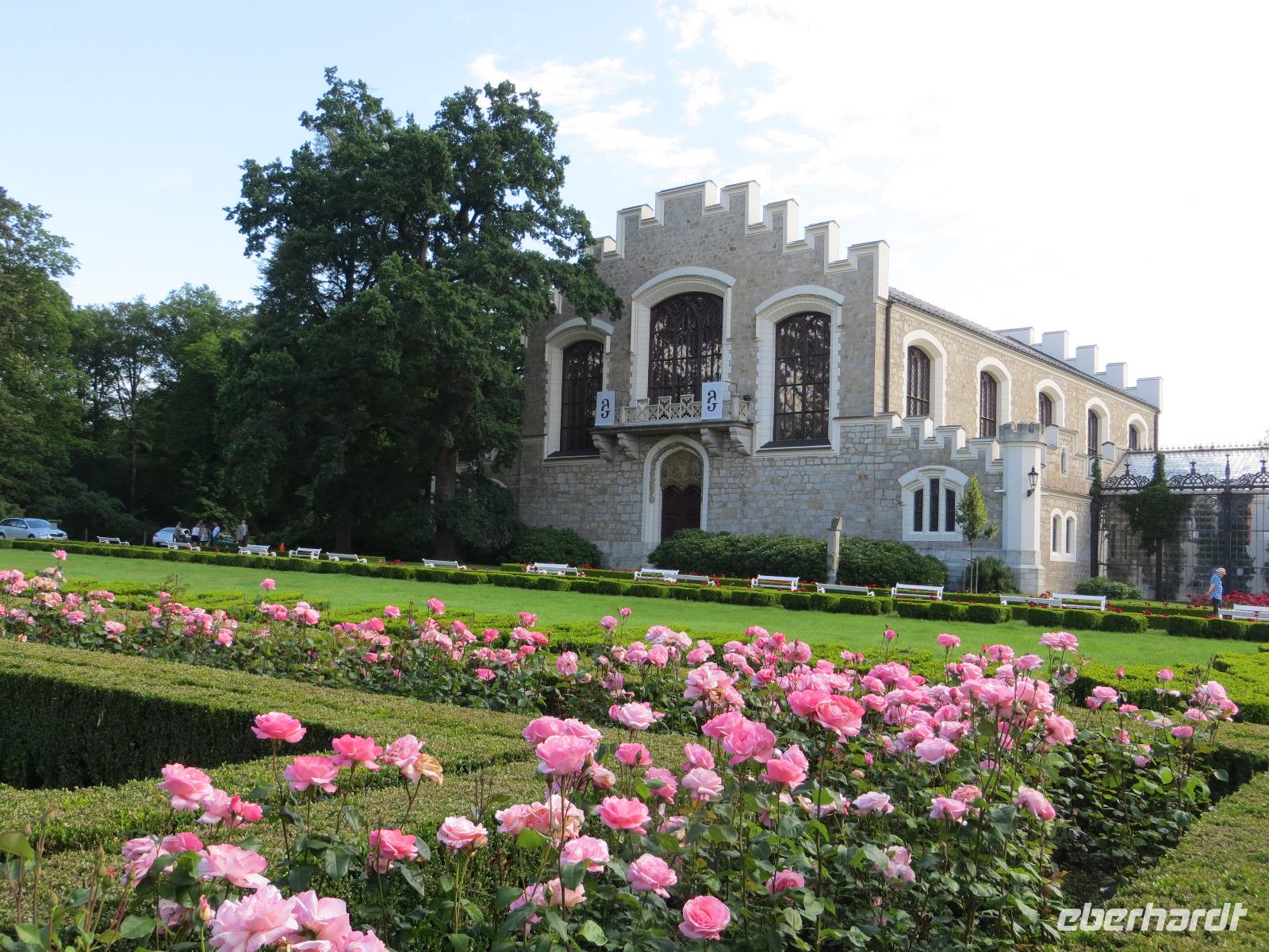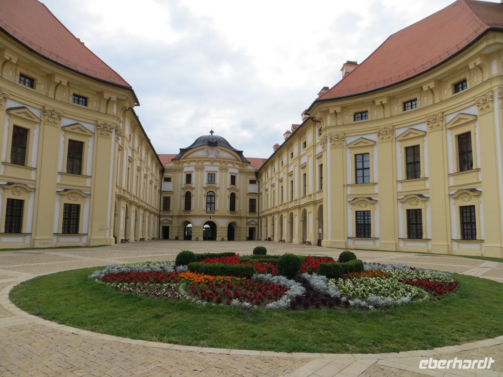 Nach einem heißen Sonnabend hatte es sich in der Nacht mit Regen ein wenig abgekühlt. Acht Uhr starteten wir nach Kromeriz. Am Blumengarten erfuhren wir, dass unser Besuch im Schloss hausintern nicht durchgestellt war. So retteten wir wenigstens eine Führung in englischer Sprache, die wir jedoch sofort antreten mussten. Die meisten Gäste verstanden das touristenaffine Erklärungs-Englisch im Schloss. Vieles erklärt sich auch von Selbst: eine tolle Bibliothek, mit Elfenbeinintarsien versehene Tische, die Garderobe des Erzbischofs und seine verschiedenen Räumlichkeiten. Von besonderer Bedeutung sind jener Saal, wo sich 1848/49 die österreichische Nationalversammlung traf und einige Erinnerungsstücke an einen Besuch des russischen Zaren Alexander III. Anschließend schlenderten wir durch einen Teil des als englischen Park angelegten Gartens am Schloss. Von hier führen wir die wenigen hundert Meter zum Blumengarten von Kromeriz, eine wohlgeordnete Parklandschaft im französischen Stil mit klassizistischen Kolonnaden. Neu eröffnet seit vergangenem Jahr sind nun auch das östliche Areal des Parks und die Orangerien. So gewinnt dieses phantastische Gartenbauensemble noch mehr an Wert. Kromeriz ist so UNESCO-Weltkulturerbe-Standort mit Schloss, Schlosspark und Blumengarten. Bereits am zeitigen Nachmittag erreichten wir Olmütz, die ehemalige mährische Metropole mit Erzbischofssitz. Für manchen ist es wohl die nach Prag schönste historische Altstadt Tschechiens. Vom Dom St. Wenzel bummelten wir vorbei an bischöflichen Gebäuden und Universitätsgebäuden bis in die Nähe des Unter- und Obermarktes mit Rathaus und Dreifaltigkeitssäule - wieder ein tschechisches UNESCO-Welterbe.