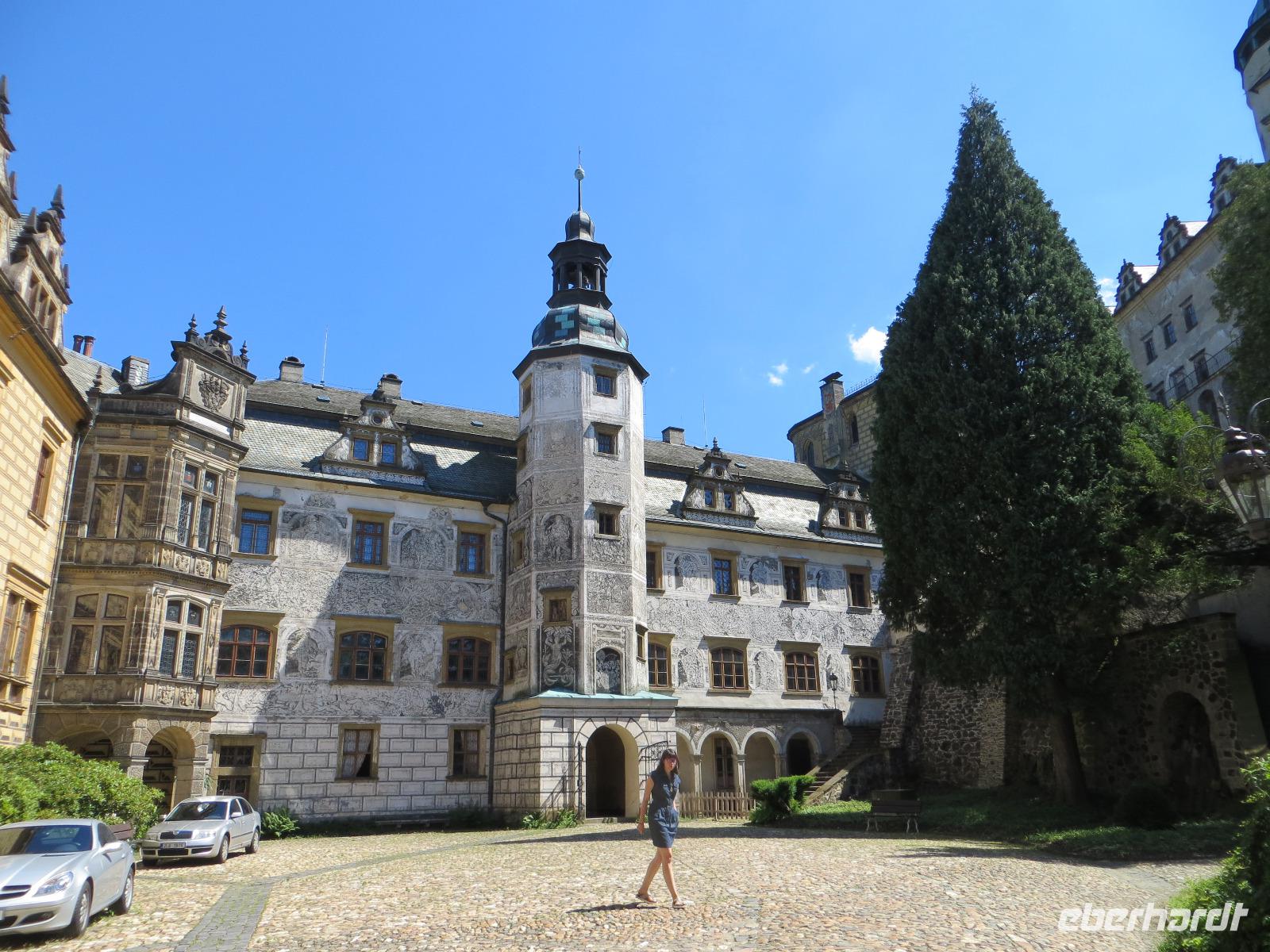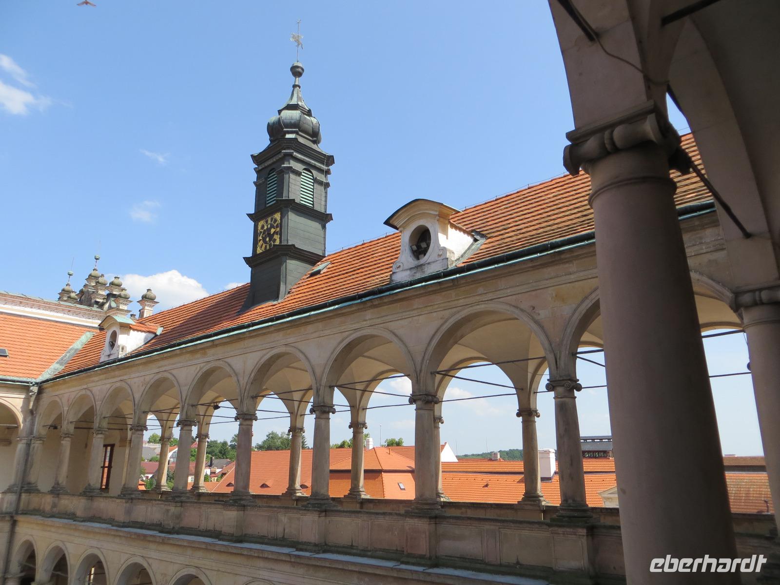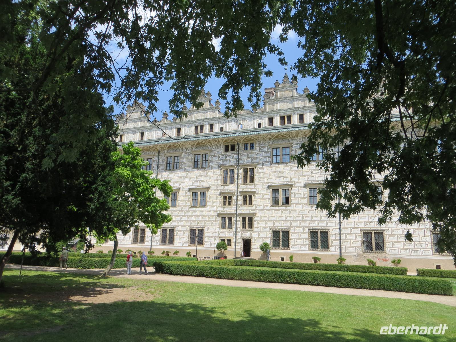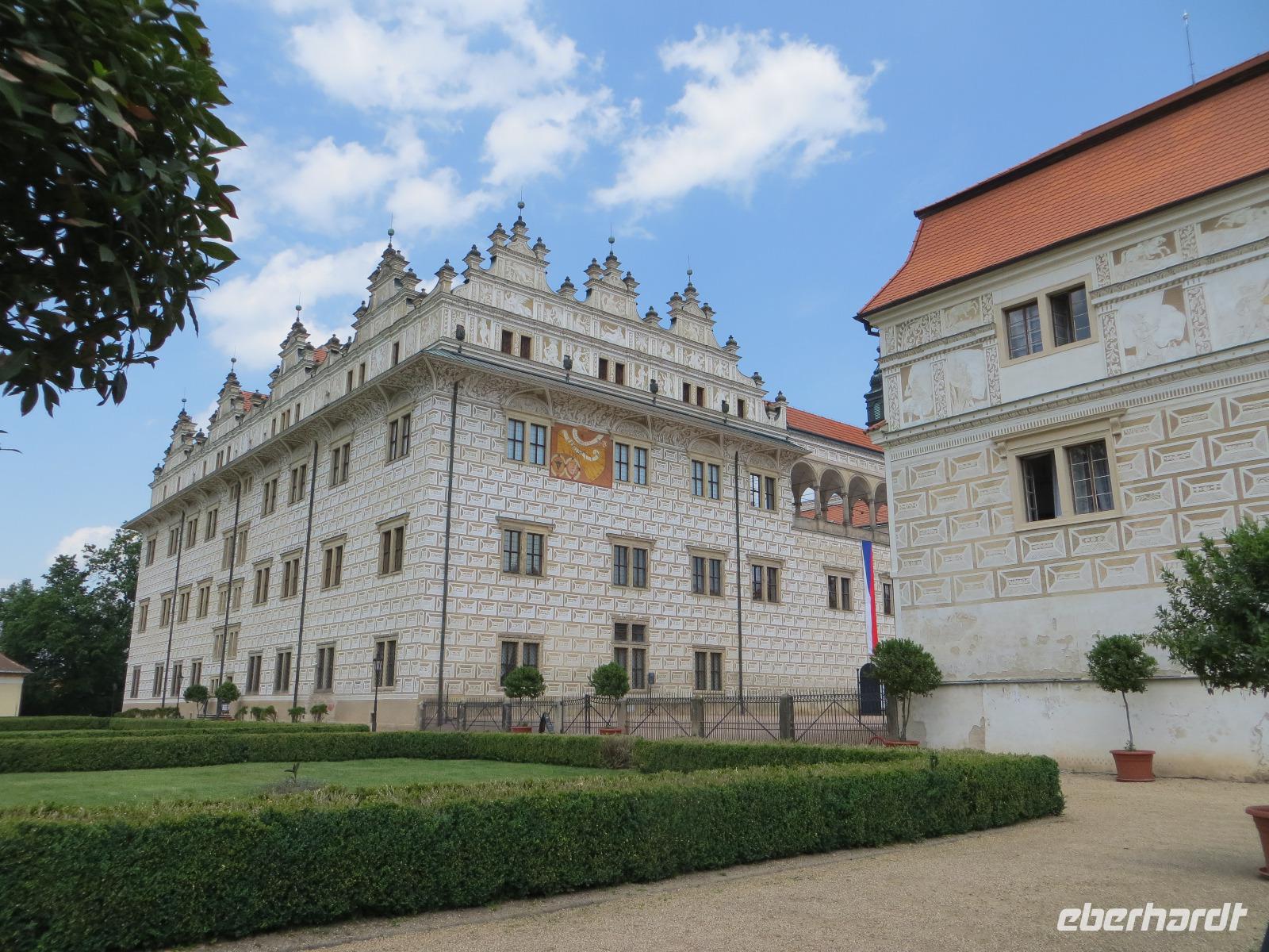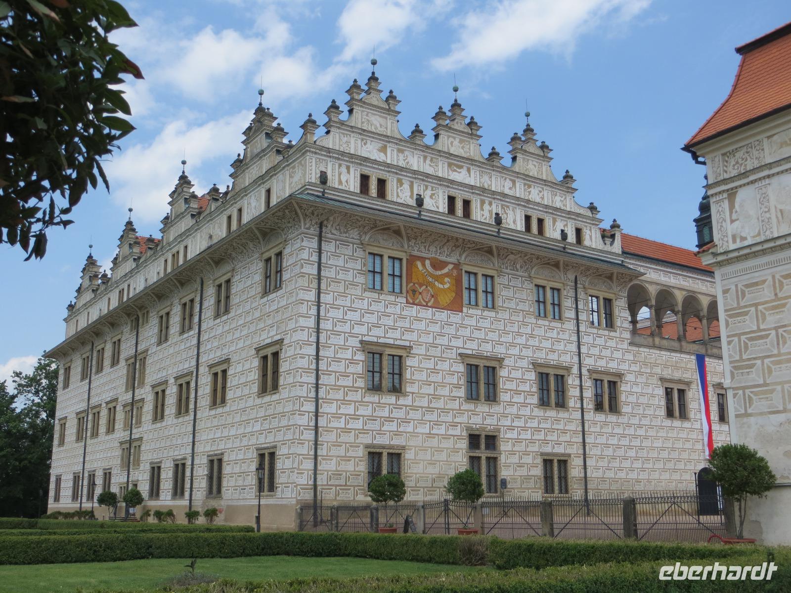 Am zeitigen Nachmittag erreichten wir Litomysl, die Geburtsstadt Smetanas. Mit ausreichend Zeit bis zur Schlossbesichtigung bummelten wir zunächst durch den einstigen Klostergarten. Noch war auch Zeit zum Fotografieren der bekannten Sgraffito-Fassade des Schlosses. Für die hiesigen Smetana-Musikfestspiele waren im Innenhof des Schlosses eine Bühne und mehr als tausend Plätze errichtet - so konnte man den von den UNESCO-„geehrten" Sgraffiti im Innenhof nur vom obersten Schlossgang sehen. Beeindruckend aber das kleine Schlosstheater - eines der ältesten noch original erhaltenen spätbarocken Schlosstheater in Europa.