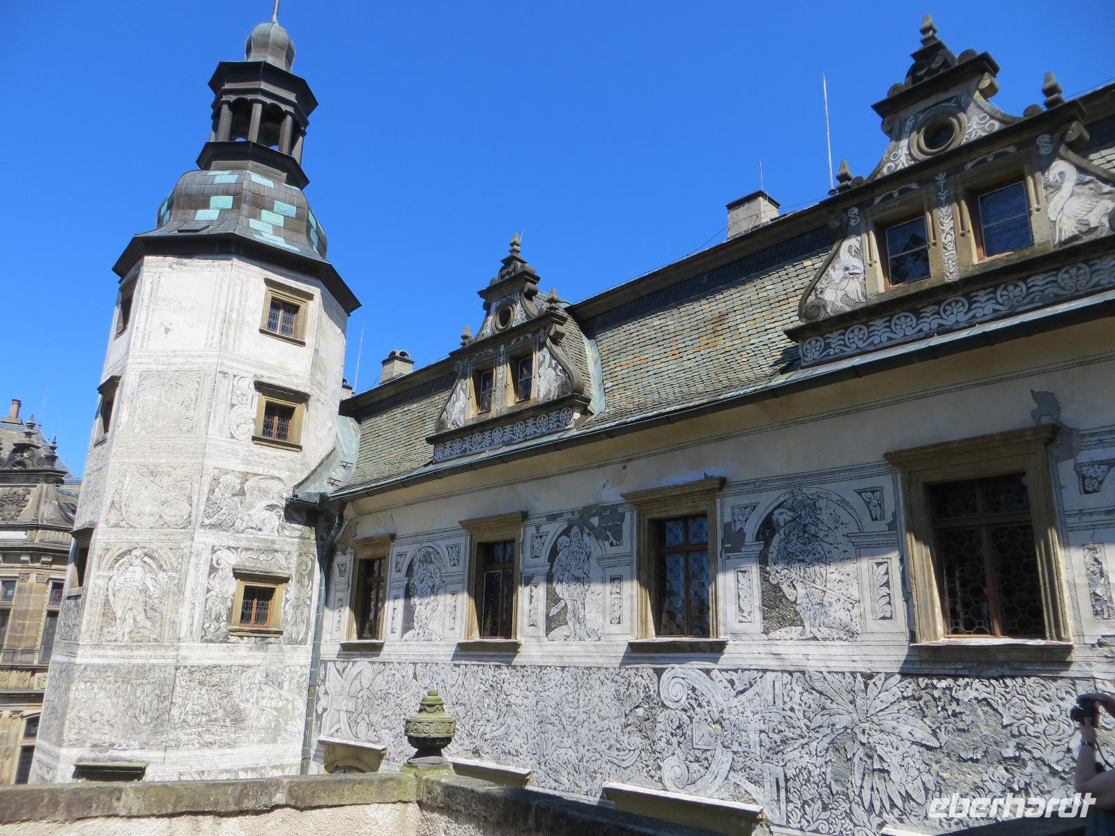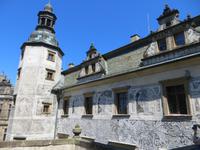 Von Decin ging es zwischen Elbsandstein und Böhmischen Mittelgebirge, am Rande der Lausitzer Berge mit seinen böhmischen Glaszentren - deren Produkte wir auf manchem Schloss als Kristallleuchter wiederfinden sollten - vorbei nach Frydlant. Im 16. Jahrhundert wurde hier ein Renaissanceschloss erbaut, das für sein Sgrafitto bekannt ist. Oft als das Schloss Wallensteins tituliert, erfuhren wir bei der Schlossbesichtigung, dass es zwar zwölf Jahre in dessen Besitz aber nie von ihm bewohnt war. Nach Wallensteins Ermordung fiel das Schloss an einen Widersacher. Die prägenden Einflüsse des 19. Jahrhunderts kann man heute gut beschauen; so gilt das Schloss als ein gutes Beispiel der Verquickung von Renaissance und Neorenaissance. Mit unserem tschechischen Bus waren es dann noch zwei Stunden Fahrt über Liberec - Turnov - Jilemnice - Vrchlabe, bis wir unser Hotel Clarion am Berghang inSpindleruv Mlyn erreichten. Wir waren beim Abendessen zwar nicht die einzigen Gäste, aber es war alles angenehm organisiert..