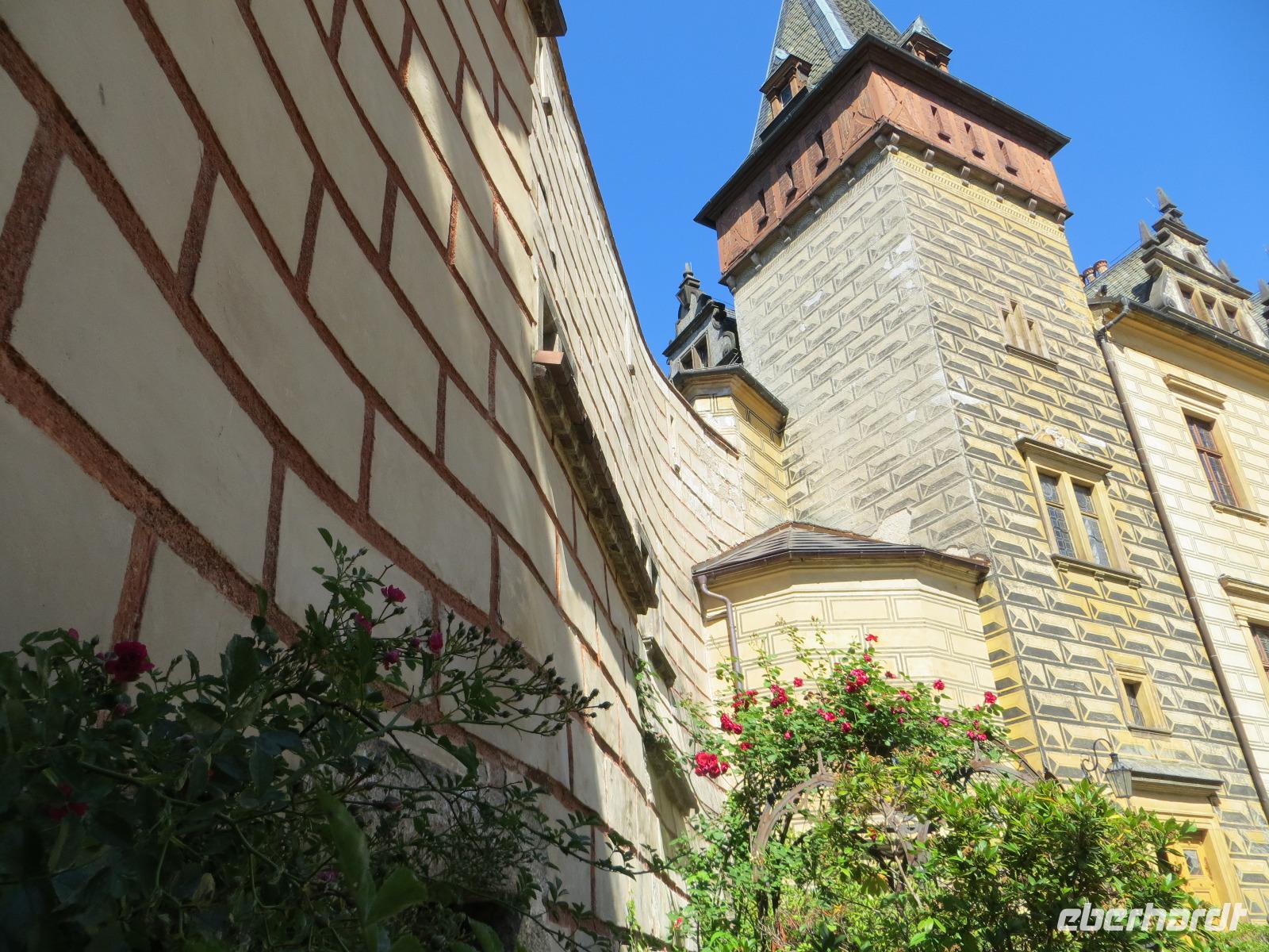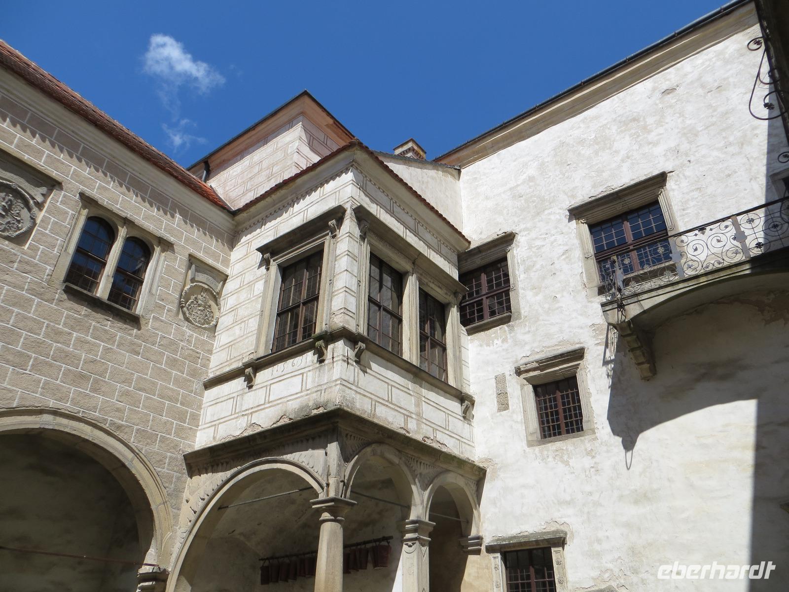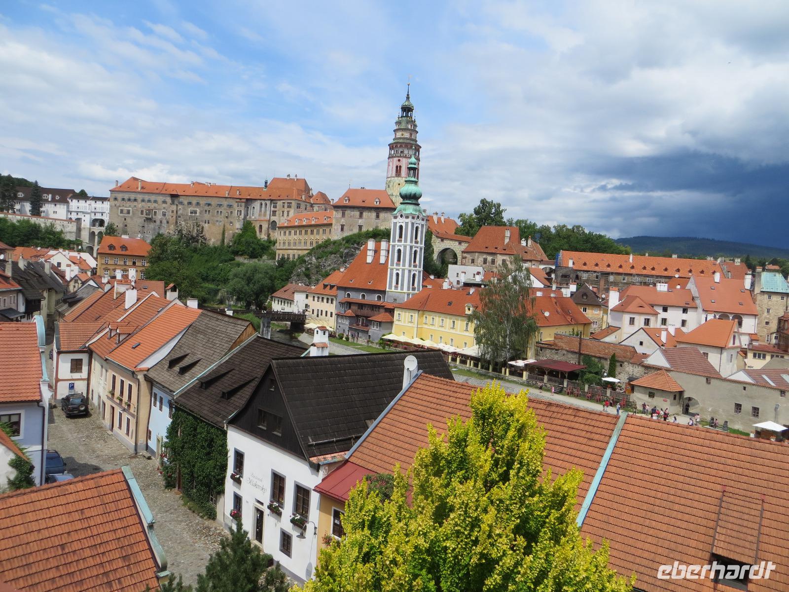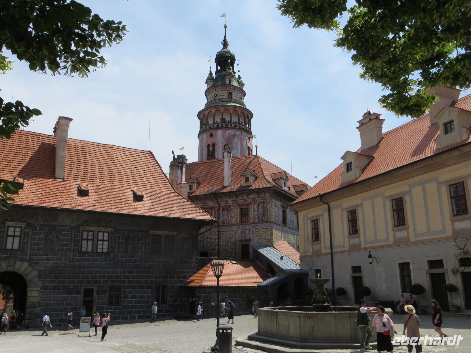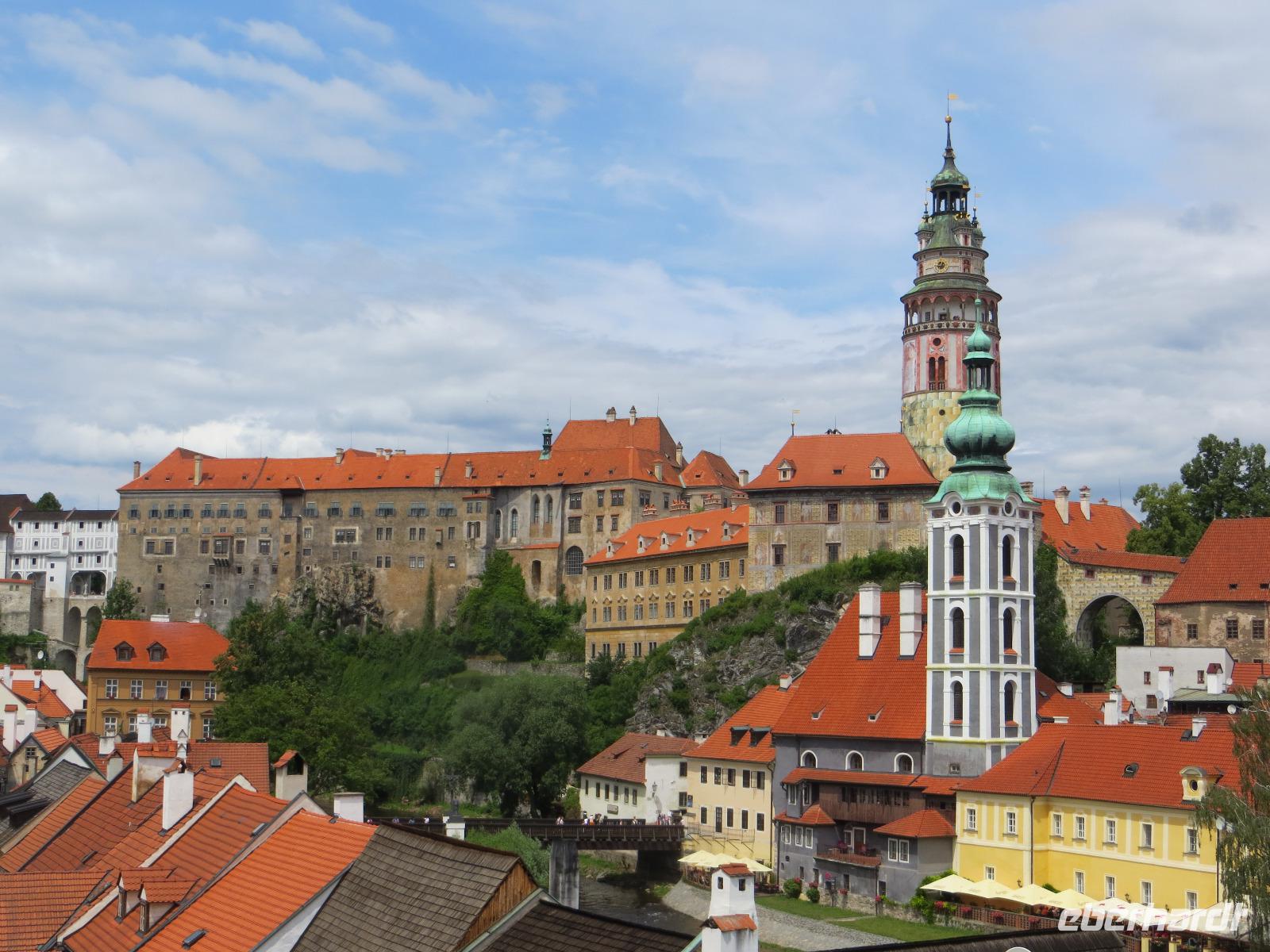 Schon gegen neun Uhr erreichten wir das im Tudorstil errichtete weiße Schloss Hluboka, inmitten einer schönen, englischen Parklandschaft. Einst den Schwarzenbergs gehörend, verfügt es wohl über die schönsten holzgetäfelten Wände eines Schlosses unserer Reise mit oft immensen Schnitzereien. Nach dem Abstieg vom Schloss auf leichter Höhe über der Moldau fuhren wir nach Cesky Krumlov. Aus Erfahrung wussten wir, dass wir über eine scheinbar gesperrte Straße gut einen altstadtnahen Parkplatz an der Brauerei Eggenberg erreichen können, um schnellen Fusses die Altstadt erreichen zu können. So war nach einem kleinen gemeinsamen Orientierungsspaziergang ausreichend Zeit für individuelles Erkunden. Cesky Krumlov und sein Schloss gehörte einst dem Geschlecht der Rozenbergs, später den Eggenbergs, dann den Schwarzenbergs - dies alles erfuhren wir unserer Visite im Schloss... und bei letztem Namen sind wir wieder ganz in der Gegenwart, war doch der jetzige Schwarzenberg auch Außenminister, Präsidentschaftskandidat 2013 und Parteigründer der PRO 09, einer alternativen, liberal-konservativen Partei im Nachbarland. In zügiger Fahrt ging es am späten Nachmittag entlang der Moldau, durch Budweis mit seiner Brauerei zurück nach Tabor.