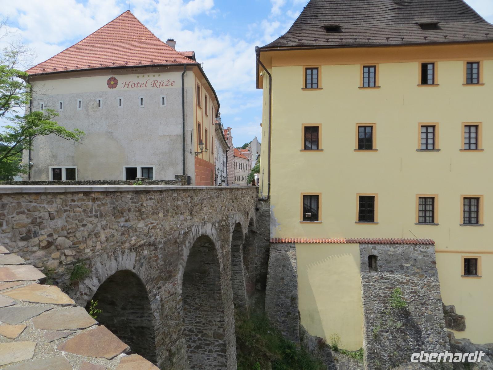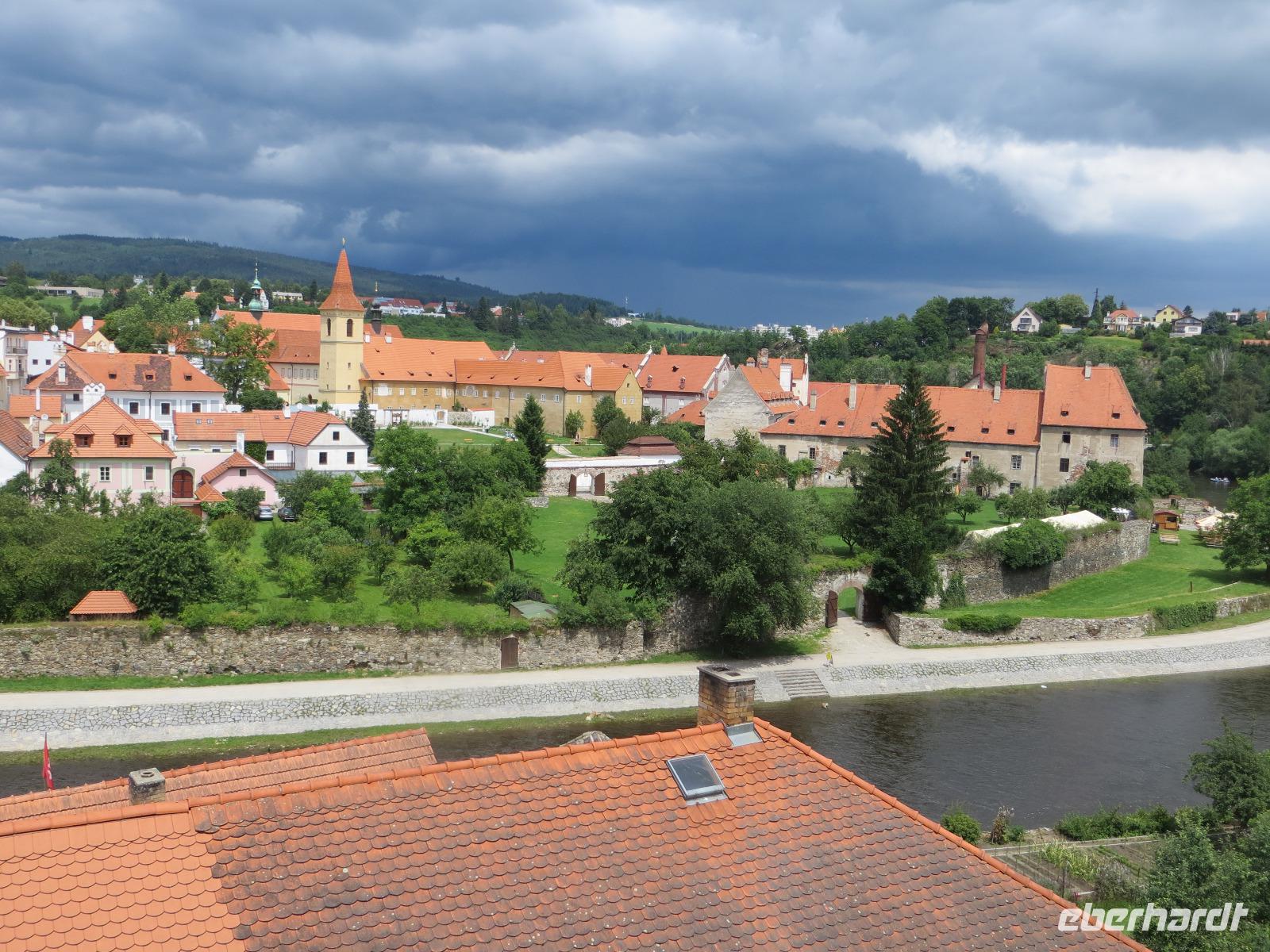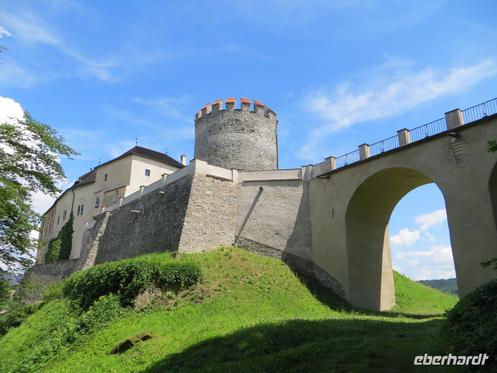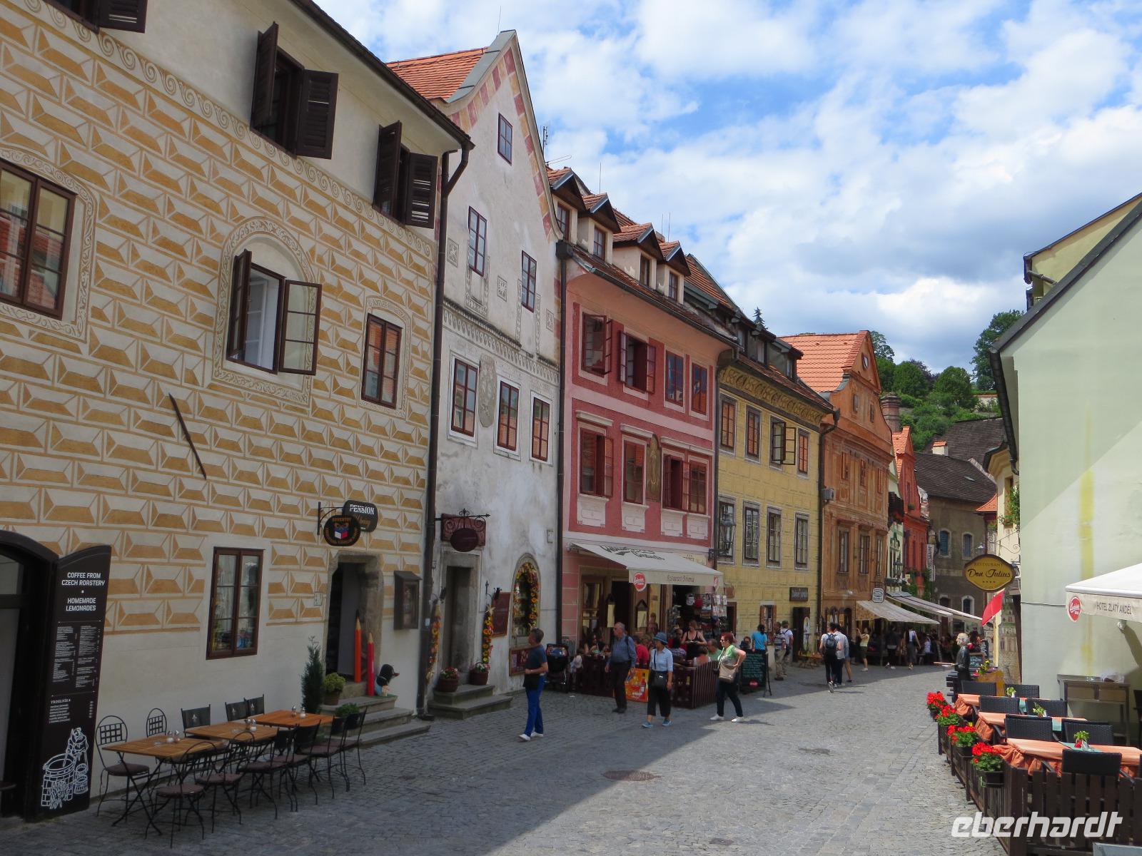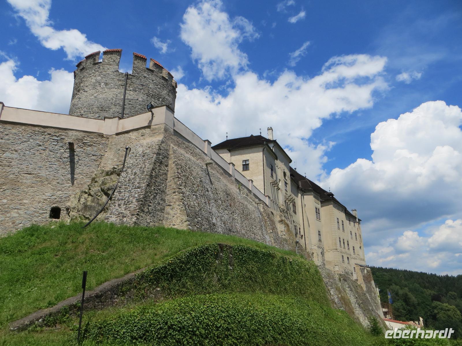 Schon gegen neun Uhr erreichten wir das im Tudorstil errichtete weiße Schloss Hluboka, inmitten einer schönen, englischen Parklandschaft. Einst den Schwarzenbergs gehörend, verfügt es wohl über die schönsten holzgetäfelten Wände eines Schlosses unserer Reise mit oft immensen Schnitzereien. Nach dem Abstieg vom Schloss auf leichter Höhe über der Moldau fuhren wir nach Cesky Krumlov. Aus Erfahrung wussten wir, dass wir über eine scheinbar gesperrte Straße gut einen altstadtnahen Parkplatz an der Brauerei Eggenberg erreichen können, um schnellen Fusses die Altstadt erreichen zu können. So war nach einem kleinen gemeinsamen Orientierungsspaziergang ausreichend Zeit für individuelles Erkunden. Cesky Krumlov und sein Schloss gehörte einst dem Geschlecht der Rozenbergs, später den Eggenbergs, dann den Schwarzenbergs - dies alles erfuhren wir unserer Visite im Schloss... und bei letztem Namen sind wir wieder ganz in der Gegenwart, war doch der jetzige Schwarzenberg auch Außenminister, Präsidentschaftskandidat 2013 und Parteigründer der PRO 09, einer alternativen, liberal-konservativen Partei im Nachbarland. In zügiger Fahrt ging es am späten Nachmittag entlang der Moldau, durch Budweis mit seiner Brauerei zurück nach Tabor.