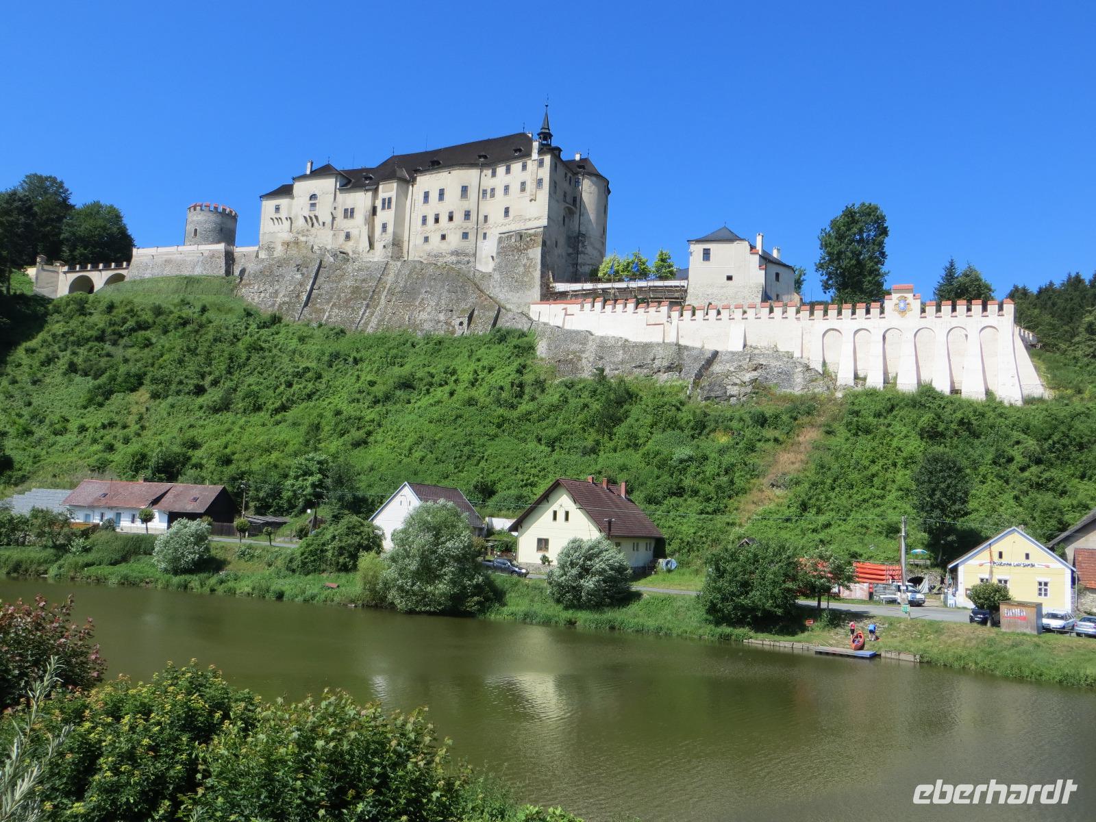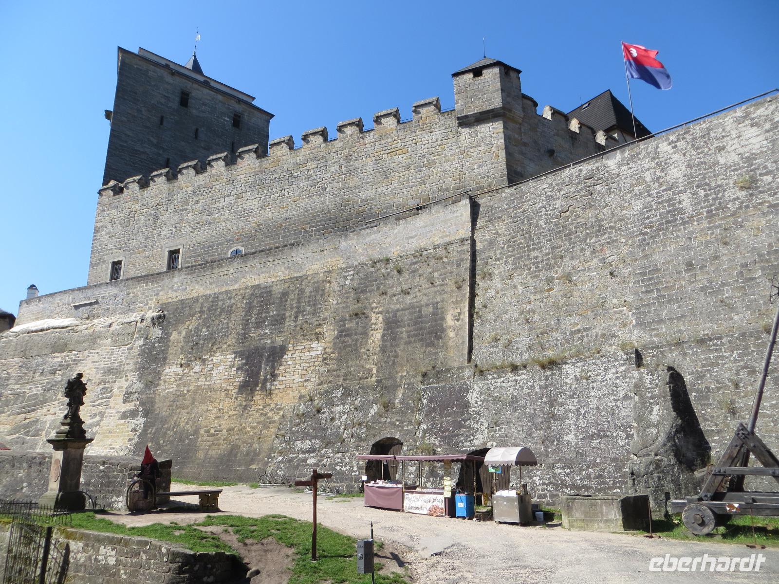 Bereits am zeitigen Vormittag hatten wir den Besichtigungstermin auf der Burg des böhmischen Königs Karl IV., der später auch Kaiser des Heiligen Römischen Reiches Deutscher Nation wurde. Der zentrale Parkplatz für die den Tschechen und internationalen Touristen so bedeutsame Burg liegt etwa zwei Kilometer vom Burgeingang entfernt und es geht aufwärts. Als kleine Überraschung zum Abschluss der Reise ließen wir uns von Minibussen nach oben bringen. Die einstündige Führung durch die Burg versetzte uns zurück in das 14. Jahrhundert, auch wenn manches erst beim neogotischen UmbauEnde des 19. Jahrhunderts erneuert wurde und die Königskrone recht einfaches Imitat -vergoldetes Silber mit Buntglas - ist. Beim Abweg hinunter durch das Dorf gelangen noch einige schöne Fotos von der Burganlage hoch oben in den bewaldeten Hügeln.