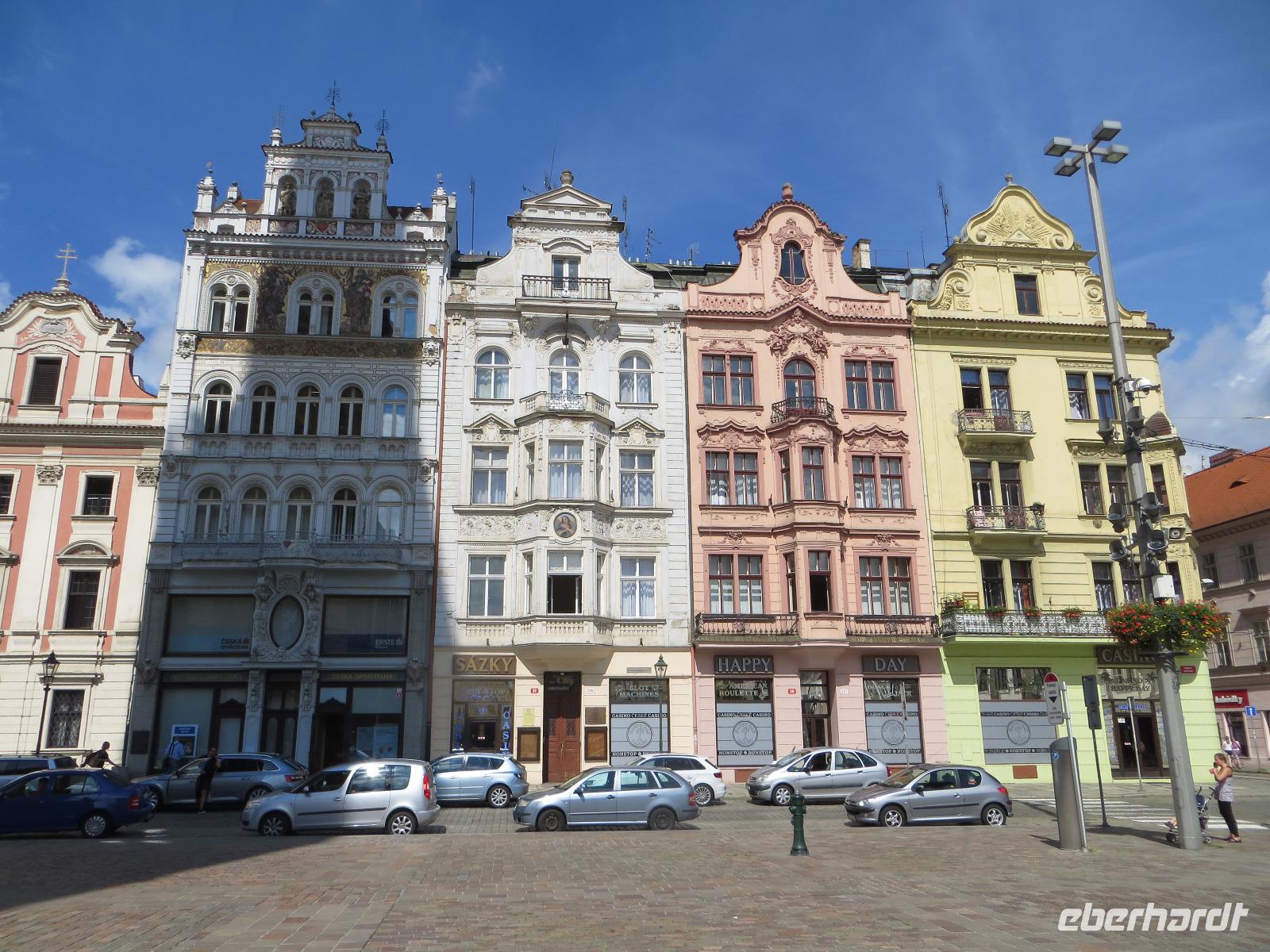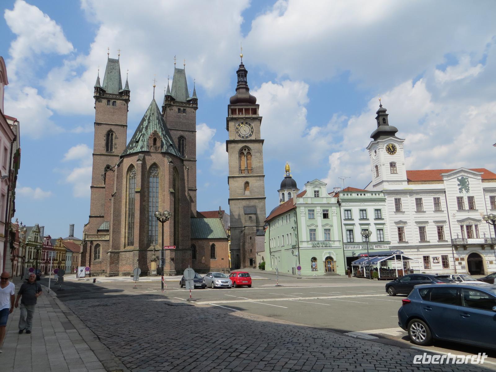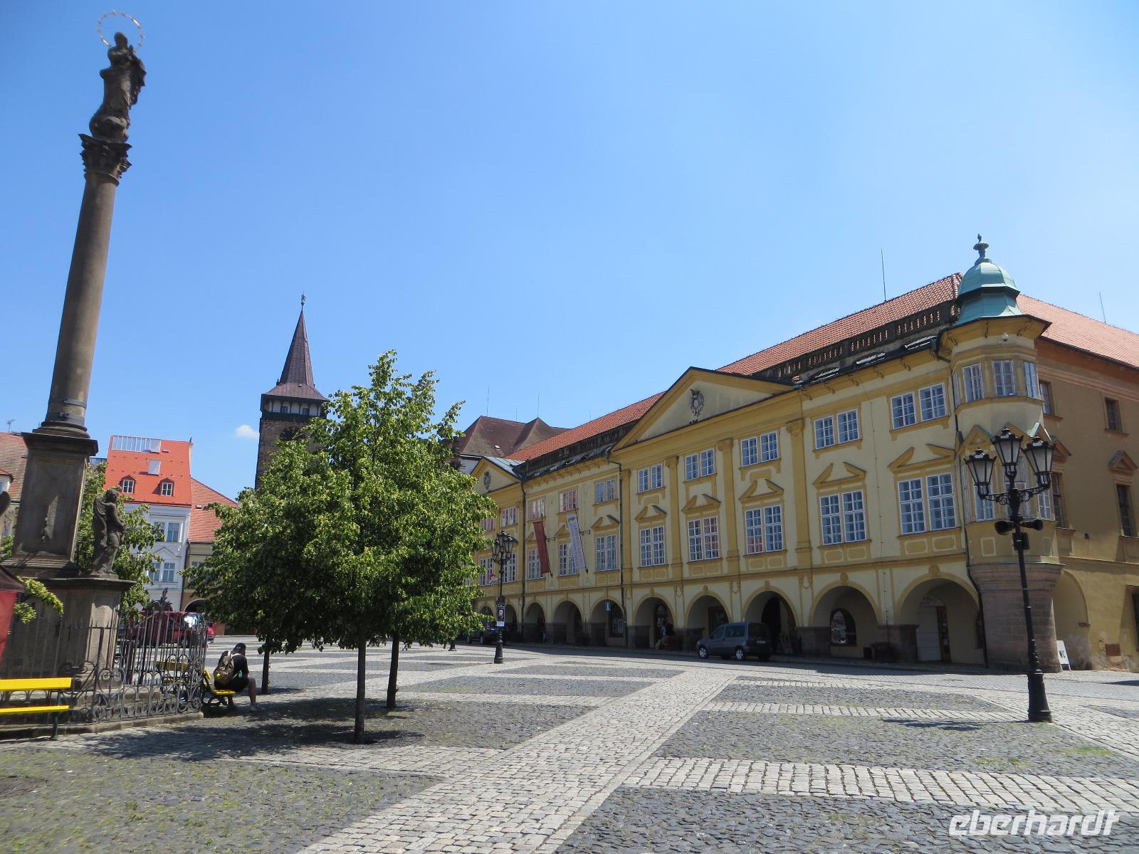 Königgrätz ging mit der zu damaliger Zeit größten Schlacht in die Geschichte ein: am 3.Juli 1866 trafen auf den Hügeln westlich von Königgrätz vierhunderttausend Soldaten der Österreicher und verbündeten Sachsen auf die Preußen. Die Schlacht besiegelte die Vorherrschaft Preußens im deutschen Raum und war Vorbote der deutschen Reichseinigung unter preußischer Führung. Auf dem Hügel bei Chlum, wenige Kilometer vor Königrätz, erinnerten wir uns des schrecklichen Geschehens fast auf den Tag genau vor 150 Jahren. In Königgrätz, dem Königingrätz, stiegen wir hinauf zur Altstadt. Über den Kleinen Markt bummelten wir in den sonnig-heißen Gassen am Theater vorbei Richtung Bischöflichem Gymnasium und dann zum Weißen Turm und der Heilig-Geist-Kirche, der (neo)gotischen Dominante der Stadt. Beim Eintritt wurden wir überrascht vom Gesang einer Gruppe, die offenkundig für eine Hochzeit probte. Die Kirche basiert auf einer gotischen Gründung, die ältesten Inventarien, ein Flügelaltar und ein zinnerner Taufwasserbehälter stammen aus den ersten Jahren des 15. Jahrhunderts. Zu individuellem Bummel verabschiedeten wir uns auf dem Großen Platz in Anblick von Weißem Turm, barocker Kapelle und Jesuiten-Kolleg und Bischofspalast. Mancher bummelte noch hinab zur Elbe, in deren Nähe zahlreiche markante Gebäude des „Salons der Republik" - vorrangig der Jugendstilarchitektur - zu sehen sind.