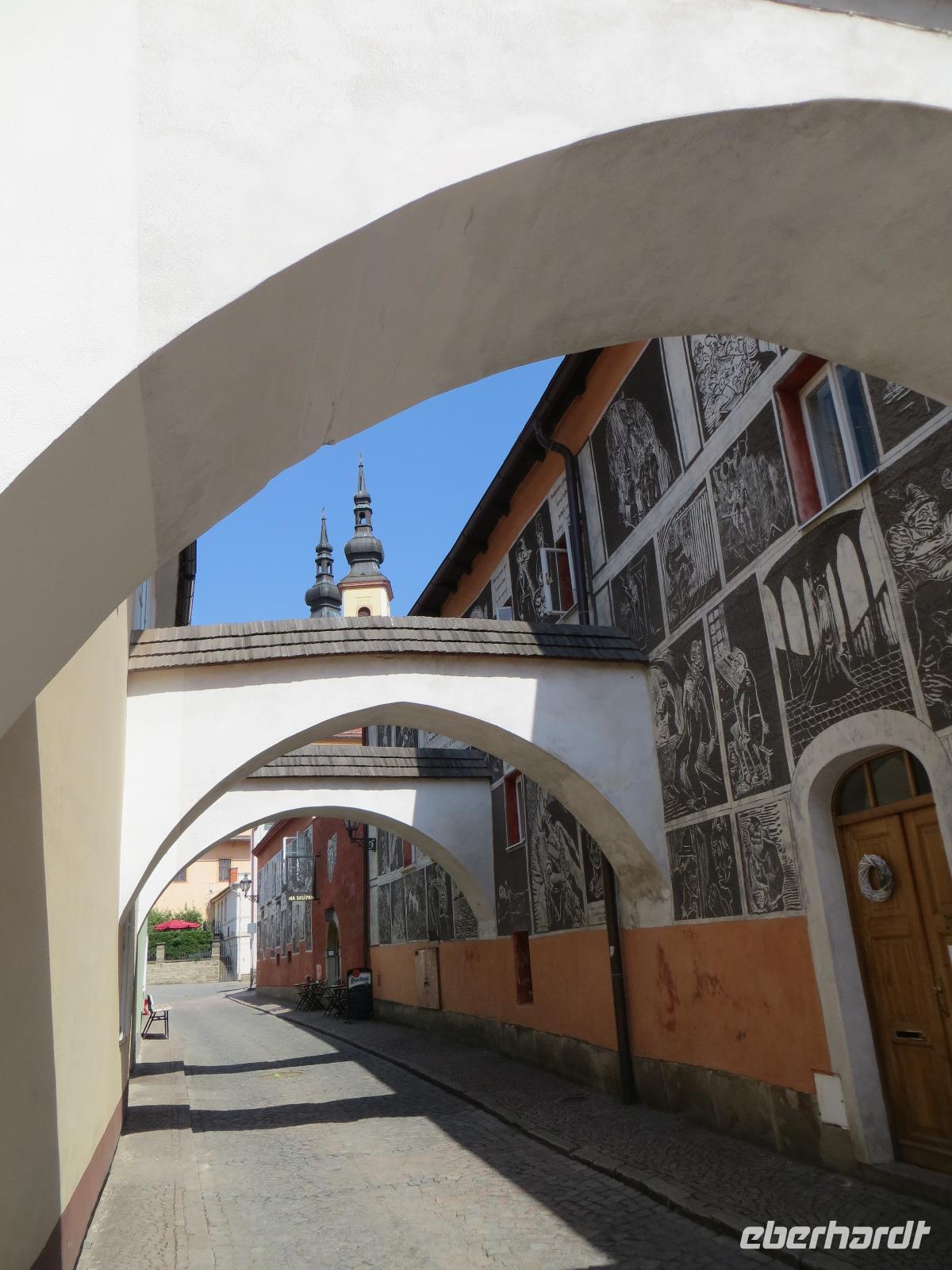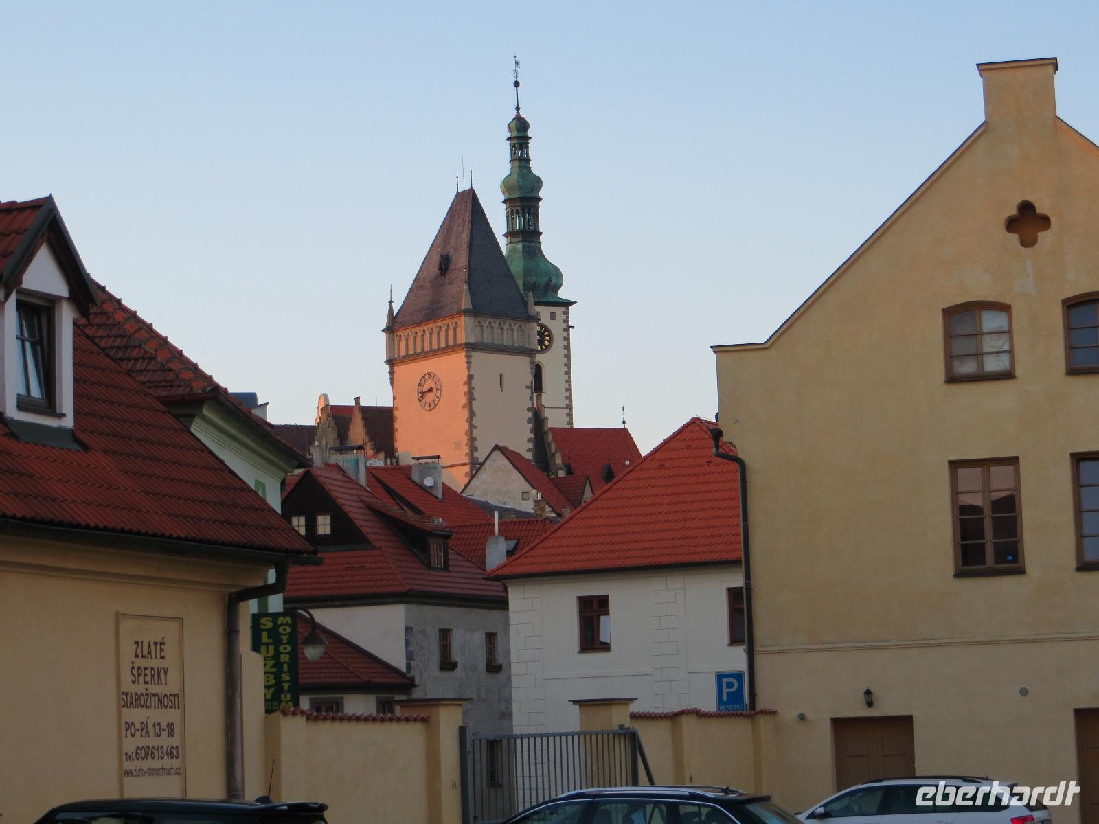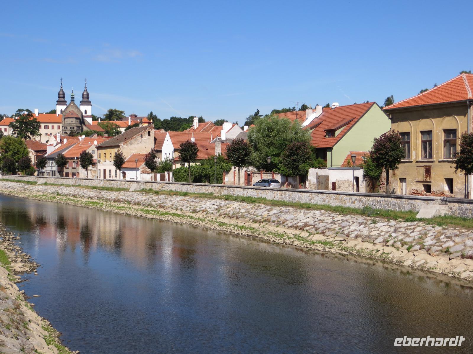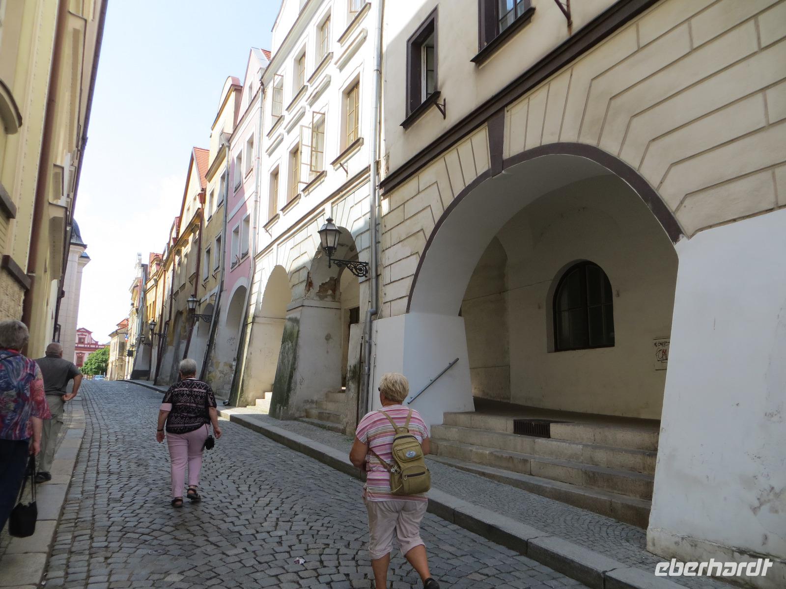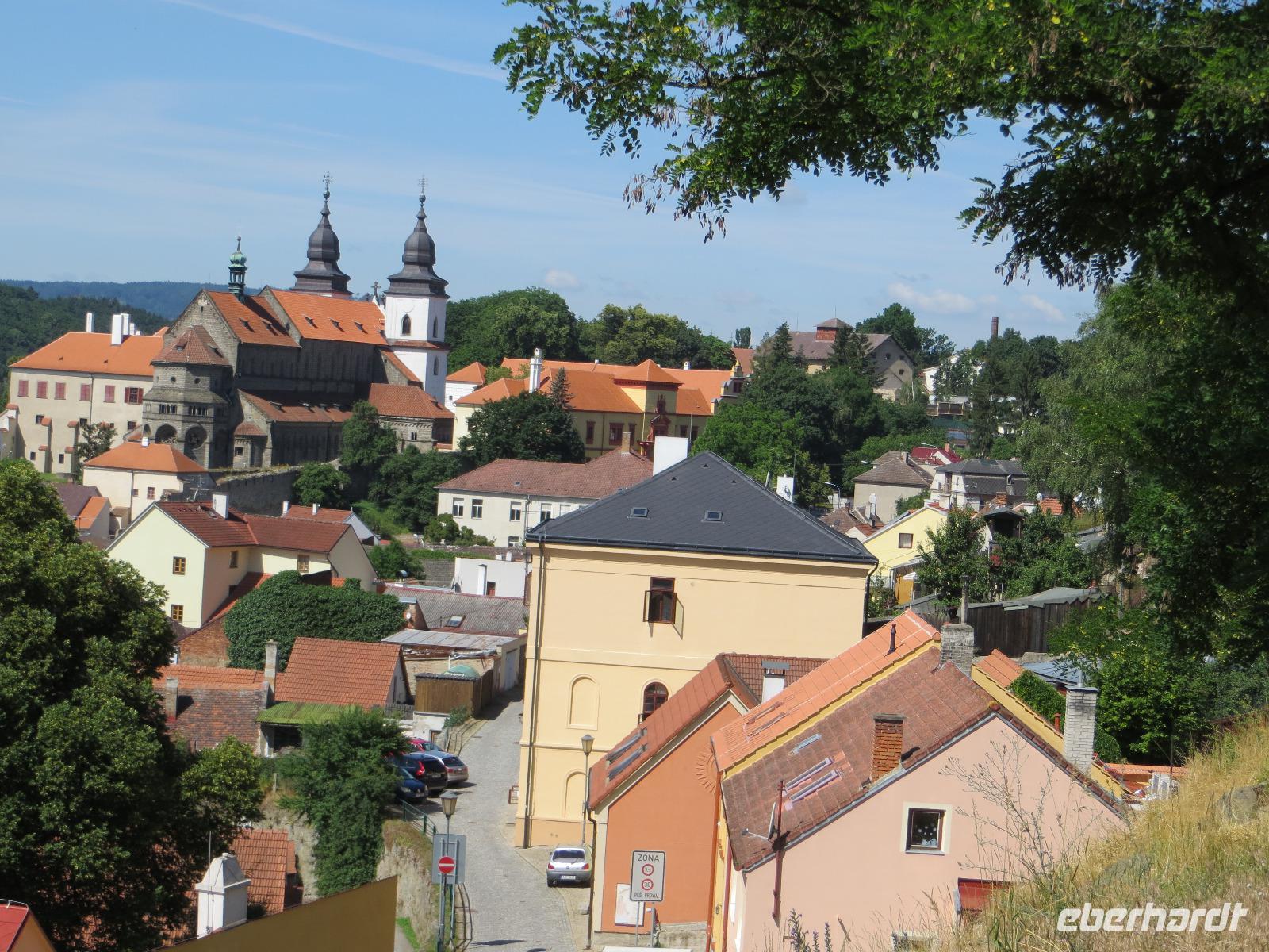 Wieder schönes Sommerwetter begleitete uns auf unserer Tour nach Trebic und Telc, um zwei UNESCO-Welterbestandorte kennen zu lernen. In Trebic war die alte Brücke unter der Bazilika am Rande des Jüdischen Viertels abgerissen, so dass wir südlich parkten und unseren Weg im jüdischen Viertel begannen. Durch enge Gassen zwischen irgendwann einmal rekonstruierten Häusern, die mittlerweile teilweise ihre Farbe wieder verlieren, stiegen wir auf zum jüdischen Friedhof, einem der größten in der Tschechischen Republik. Von dort ging es zum Schloss mit seiner spätromanisch-frühgotischen Bazilika St. Prokop. Diese Baziliga von Trebic ist wahrscheinlich die älteste Kirche auf unserem Reiseweg. Wir hatten Glück und erreichten sogar eine der wenigen Besichtigungszeiten, so dass wir den Innenausbau und die romanische Krypta besichtigen konnten.