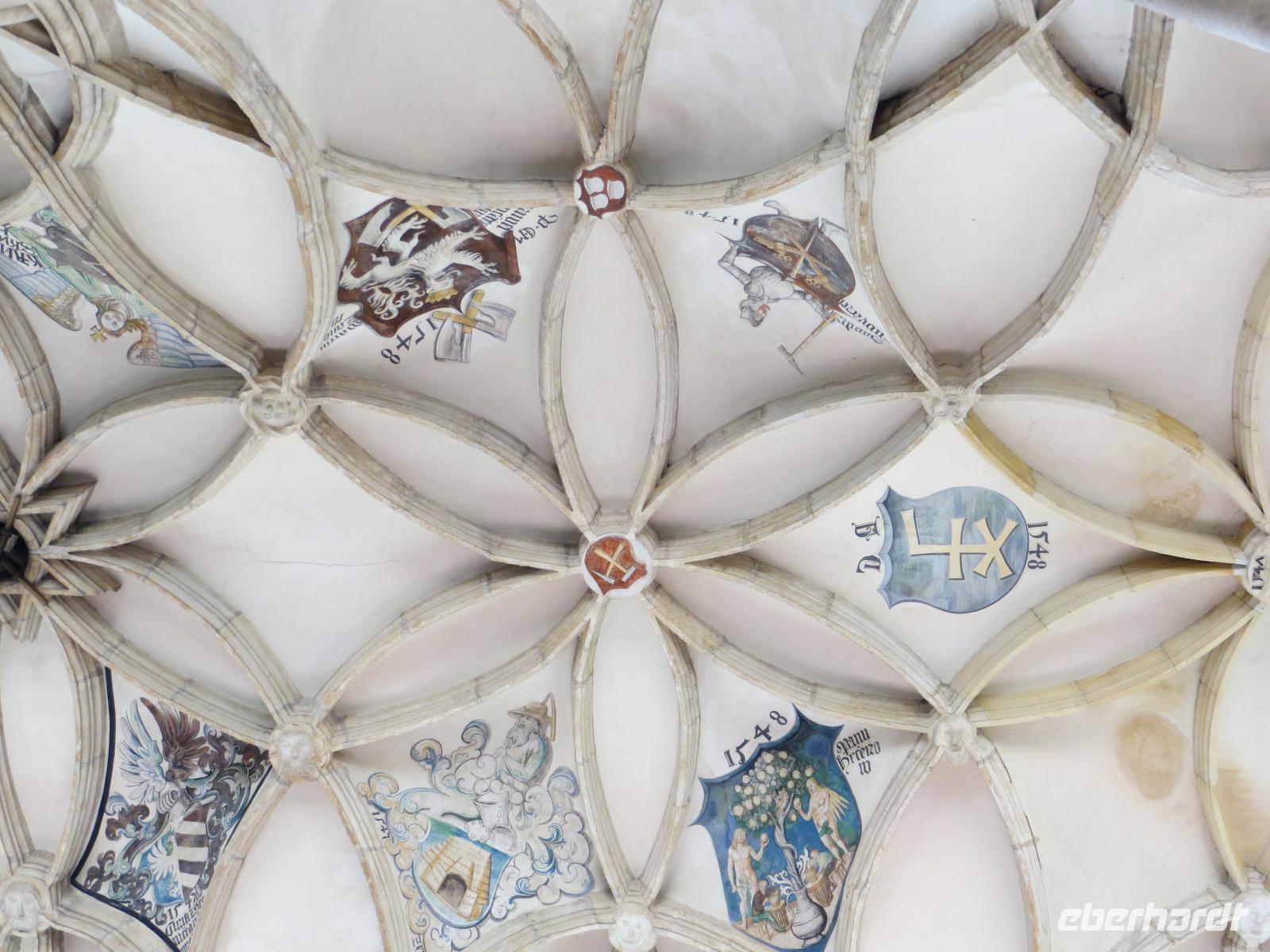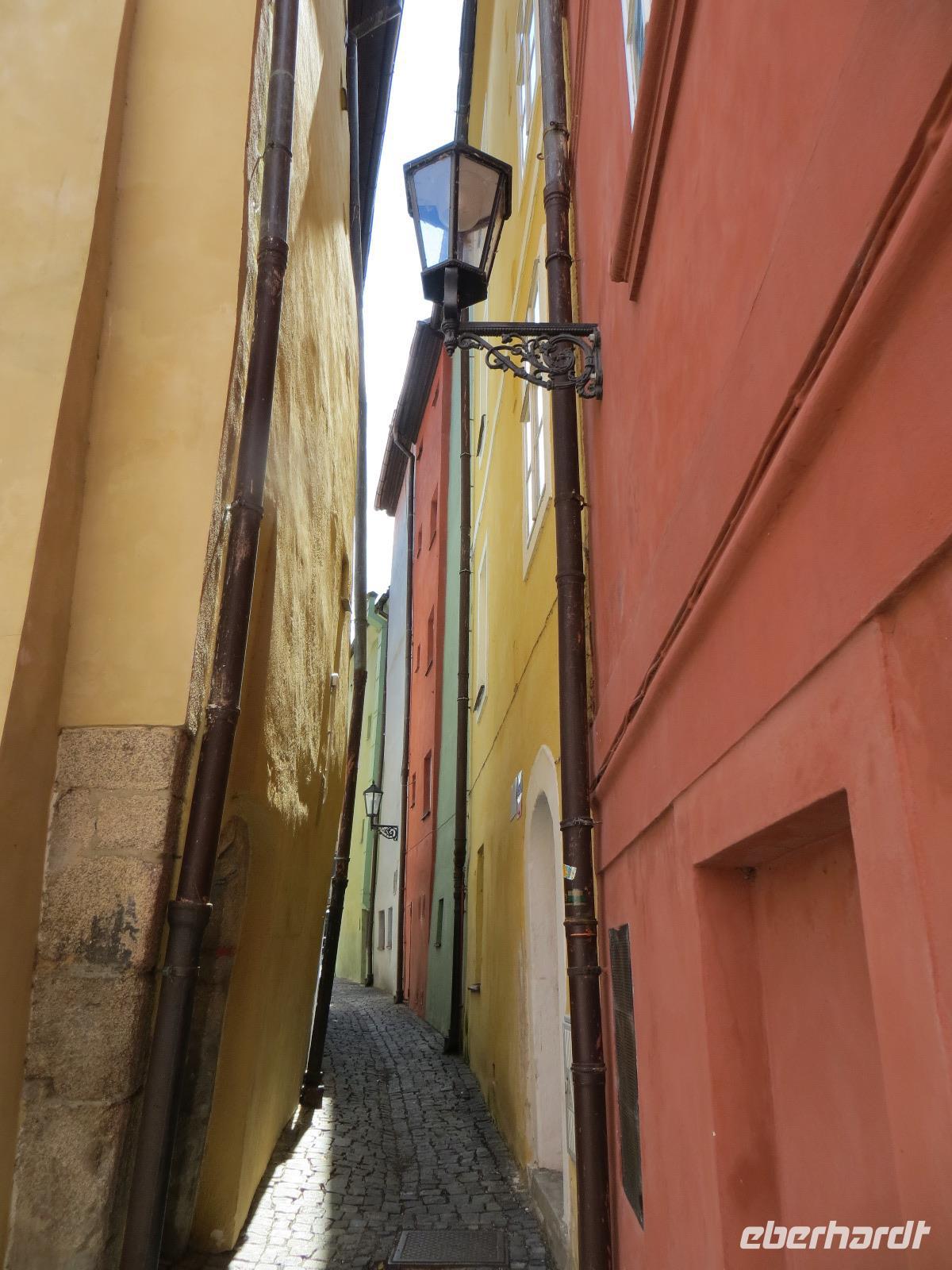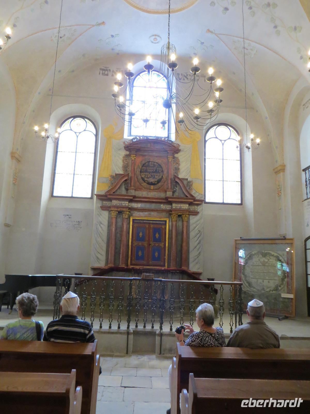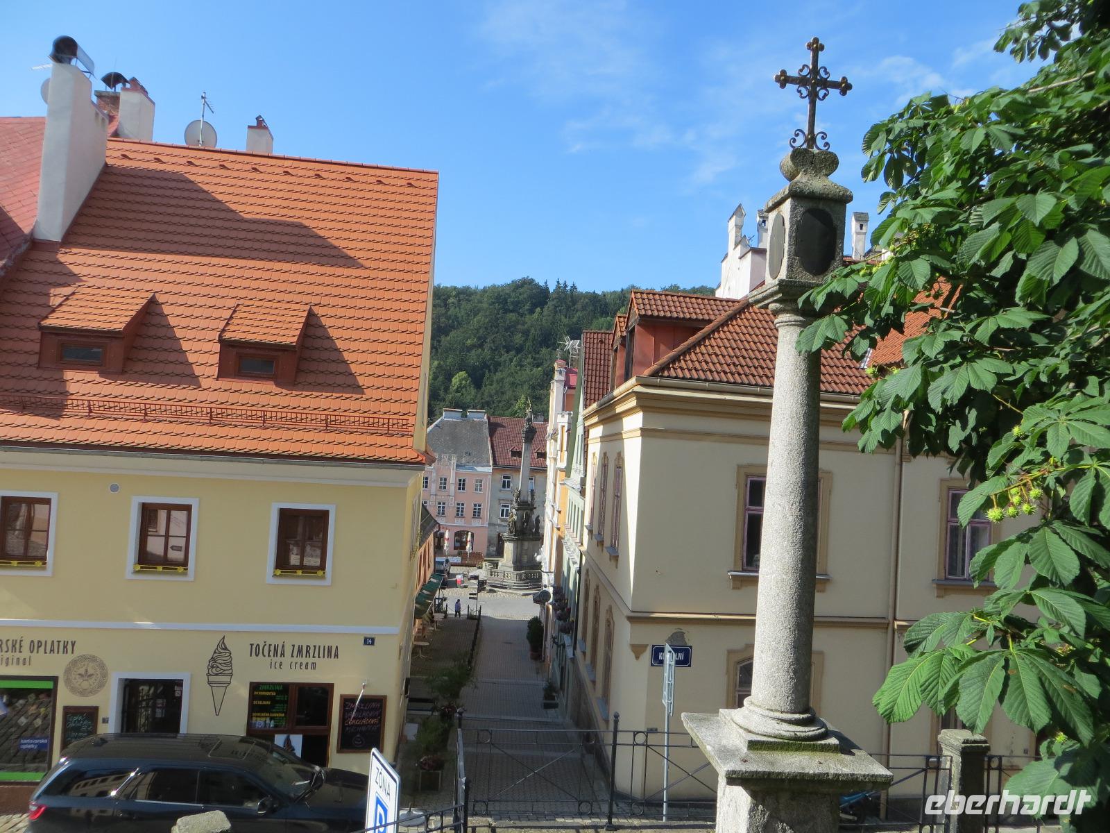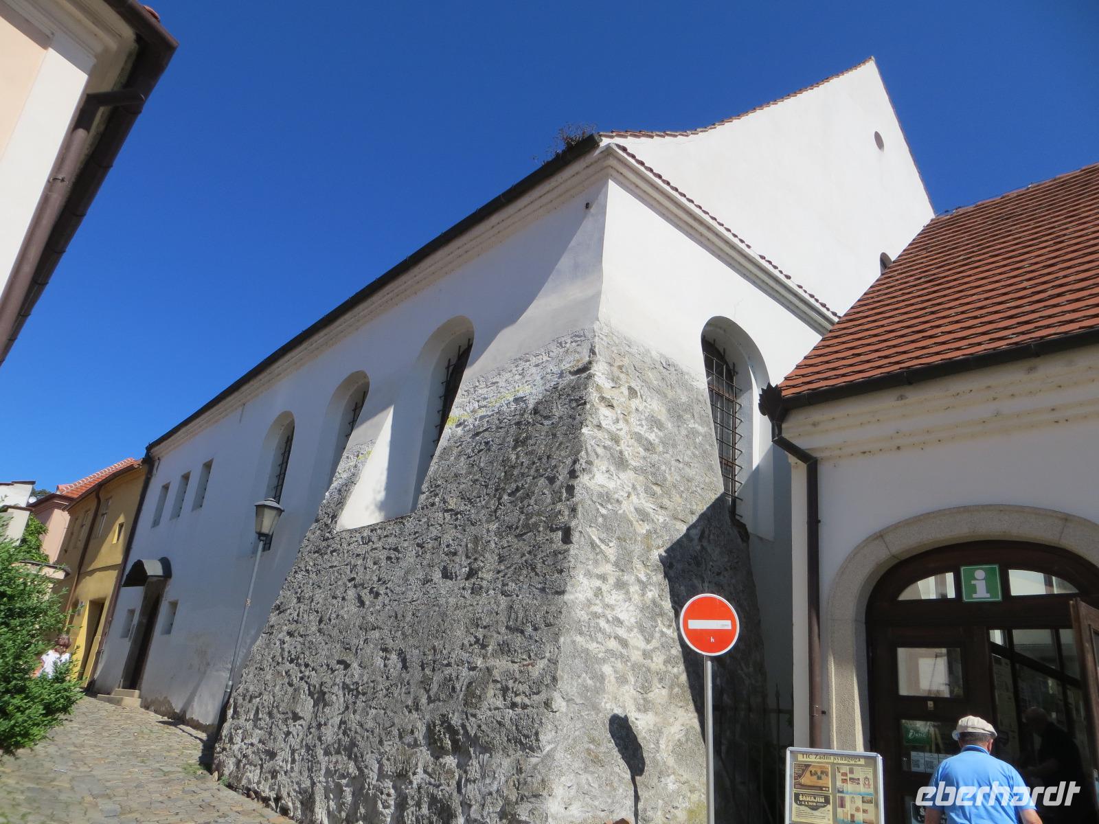 Wieder schönes Sommerwetter begleitete uns auf unserer Tour nach Trebic und Telc, um zwei UNESCO-Welterbestandorte kennen zu lernen. In Trebic war die alte Brücke unter der Bazilika am Rande des Jüdischen Viertels abgerissen, so dass wir südlich parkten und unseren Weg im jüdischen Viertel begannen. Durch enge Gassen zwischen irgendwann einmal rekonstruierten Häusern, die mittlerweile teilweise ihre Farbe wieder verlieren, stiegen wir auf zum jüdischen Friedhof, einem der größten in der Tschechischen Republik. Von dort ging es zum Schloss mit seiner spätromanisch-frühgotischen Bazilika St. Prokop. Diese Baziliga von Trebic ist wahrscheinlich die älteste Kirche auf unserem Reiseweg. Wir hatten Glück und erreichten sogar eine der wenigen Besichtigungszeiten, so dass wir den Innenausbau und die romanische Krypta besichtigen konnten.