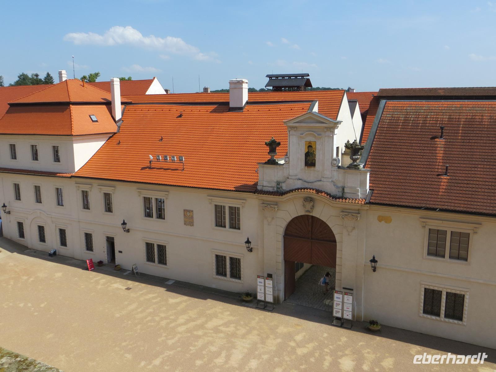Der spätere Operndirektor der Wiener Oper und Komponist G. Mahler stammt aus dem kleinen mährischen Dorf Kaliste bei Humpolec. Ihm gedachten wir mit dem 4. Satz aus seiner 9. Sinfonie als wir wenige Kilometer vom Dorf entfernt Richtung Sazavatal fuhren. Weiter ging es in zügiger Autobahnfahrt und über ein kurzes Stück Landstraße nach Cesky Sternberk. Nach leichtem Aufstieg erreichten wir rechtzeitig die auf einem Felsen, hoch über der Sazava gebaute Burg der Sternberks. Es gelang uns die Führung ein wenig vorzuziehen Der heute - wie schon im vergangenen Jahr ???? - zweiundneunzigjähige Besitzer der Burg wohnt im ersten Stockwerk - zeigte sich uns aber nicht. Bei der Burgbesichtigung wurden wir nochmals an manches Geschichtsereignis erinnert, das wir auf unserer Reise bereits tangierten. Mit dem Regelzug, aus zwei Triebwagen bestehend, fuhren wir durch das üppig grüne Sazavatal nach Kacov. Nach zwanzig Minuten war das Vergnügen leider schon beendet und der Bus erwartete uns am Ausstieg neben der Sazava. Von hier ging es dann in zügiger Fahrt auf Landstraßen - die Autobahn war wohl wieder verstopft - über Zruc nach Humpolec zur Brauerei Bernard. Bei dieser Familienbrauerei handelt es sich mittlerweile um die sechstgrößte Brauerei Tschechiens; hat aber dennoch nur 2 % Marktanteil, weil der Gigant in Pilsen mit seinen Tochterunternehmen vierzig Prozent Marktanteil hat. Das was wir an Produktionsanlagen sahen und an Bier kosteten war wohlfein. Zwei neue Industrieroboter von KUKA zur finalen Bearbeitung der 50 - Liter-Fässer waren die neueste technische Errungenschaft der Brauerei. Anschließend es bei schönstem Spätnachmittagslicht durch Felder Richtung der Hussitenstadt Tabor. Im Anblick vom Berg Blanik und in Erwartung unseres Einzuges in Tabor lauschten wir Smetanas 5. Und 6. Satz aus dem Zyklus Mein Vaterland. Das Hotel Dvorak in Tabor bot nach dem Abendessen beste Möglichkeiten zum stadtnahen Bummel.