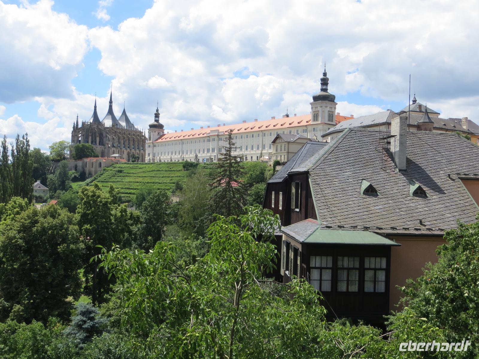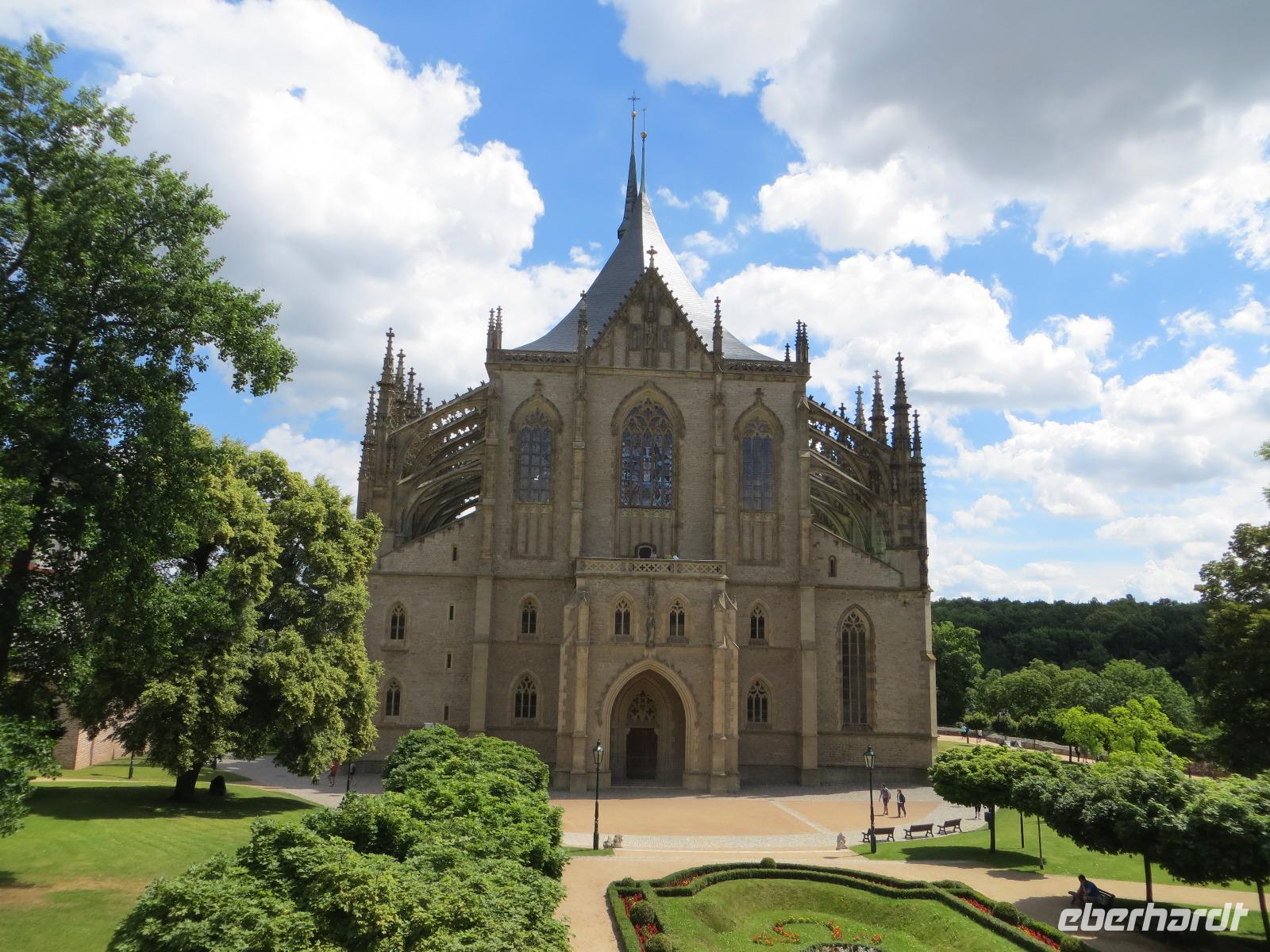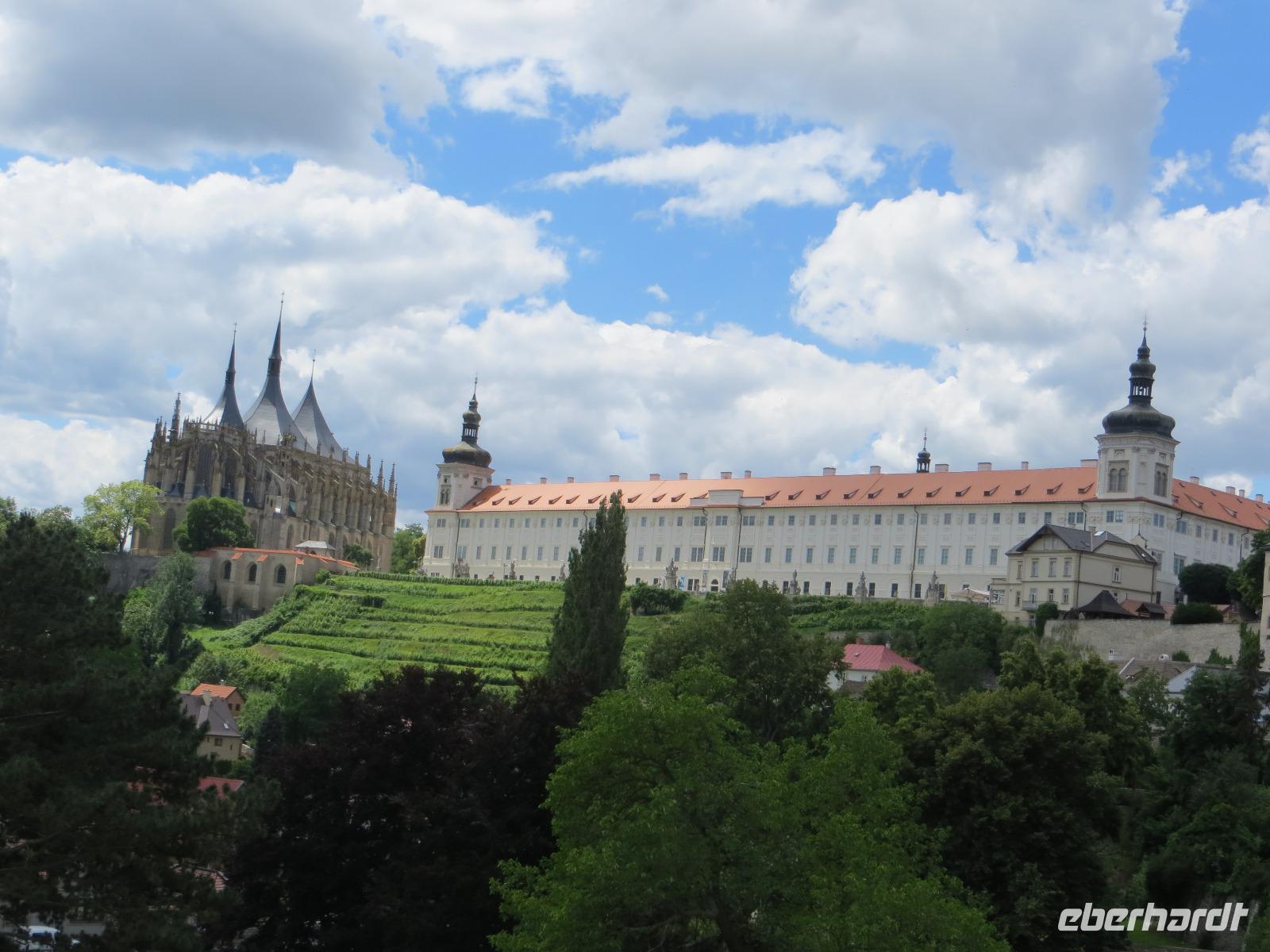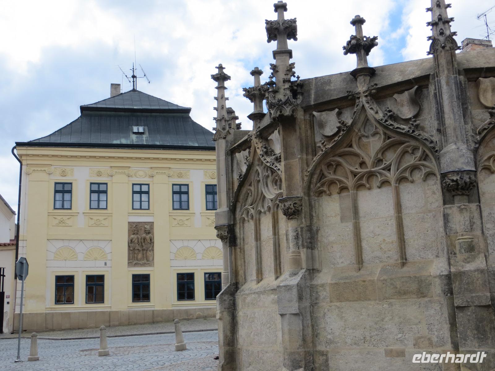 Dann schloss man uns St. Bartholomäus auf, eine gotische Kirche, die stark vom Stararchitekten seiner Zeit Petr Parler geprägt wurde. Zur Mittagszeit trafen wir in Kuttenberg ein und erkundeten das Örtchen an der Kathedrale St. Barbara - auch von Jan und Petr Parler - beginnend. Die Netzkonstruktion des riesigen Kirchenschiffs ist beeindruckend. Das riesige Jesuitenkolleg auf dem Weinberg ist frisch rekonstruiert und strahlte uns beim Weg über die Terrasse - als Weg vom Kolleg zur Kirche einst entstanden - entgegen. Aufgeräumte Gässchen mit zahlreichen Kneipen machten den Bummel und eine Rast im Örtchen Kutna Hora sehr angenehm. Wunderhübsch auch der Welsche Hof, die einstige Münze, und die rekonstruierte Kirche St. Jakobus.