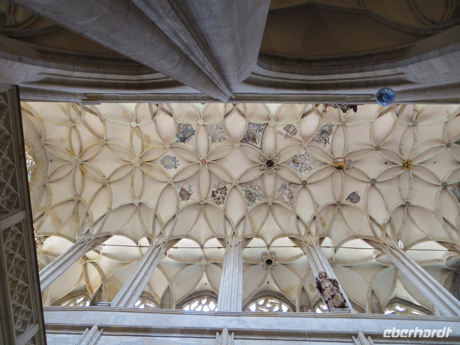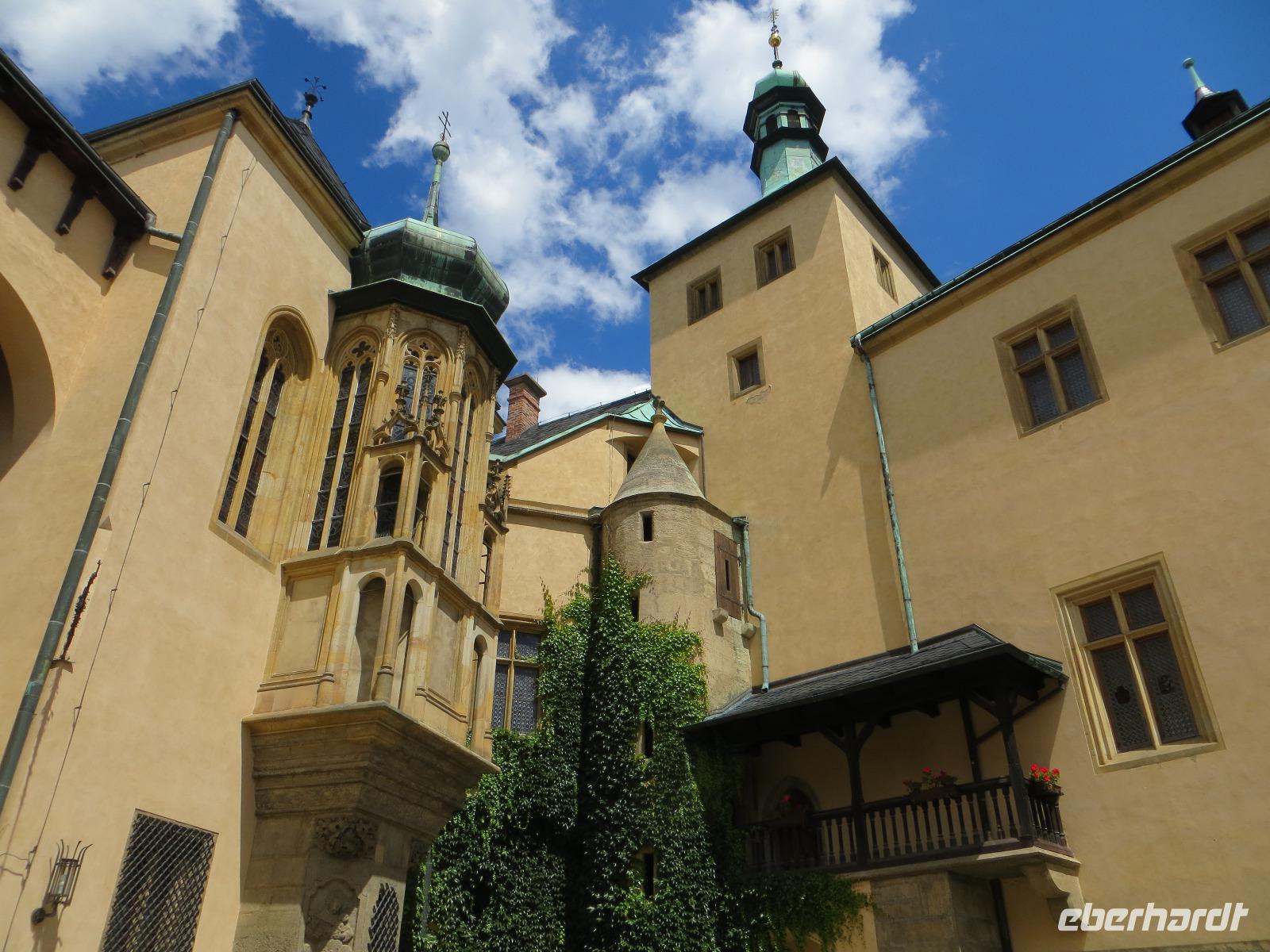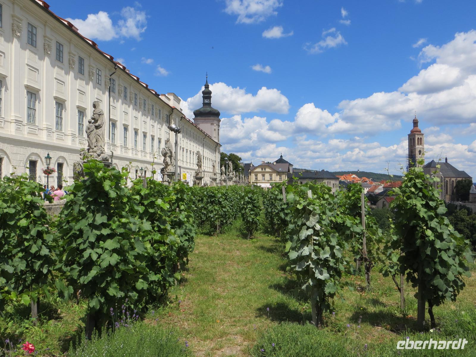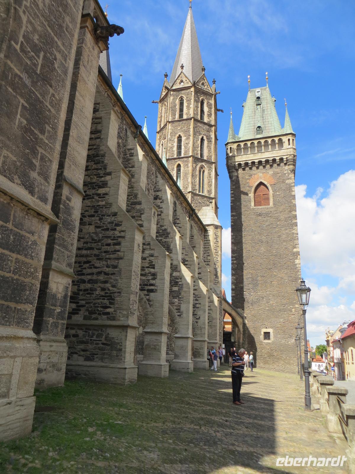 Dann schloss man uns St. Bartholomäus auf, eine gotische Kirche, die stark vom Stararchitekten seiner Zeit Petr Parler geprägt wurde. Zur Mittagszeit trafen wir in Kuttenberg ein und erkundeten das Örtchen an der Kathedrale St. Barbara - auch von Jan und Petr Parler - beginnend. Die Netzkonstruktion des riesigen Kirchenschiffs ist beeindruckend. Das riesige Jesuitenkolleg auf dem Weinberg ist frisch rekonstruiert und strahlte uns beim Weg über die Terrasse - als Weg vom Kolleg zur Kirche einst entstanden - entgegen. Aufgeräumte Gässchen mit zahlreichen Kneipen machten den Bummel und eine Rast im Örtchen Kutna Hora sehr angenehm. Wunderhübsch auch der Welsche Hof, die einstige Münze, und die rekonstruierte Kirche St. Jakobus.