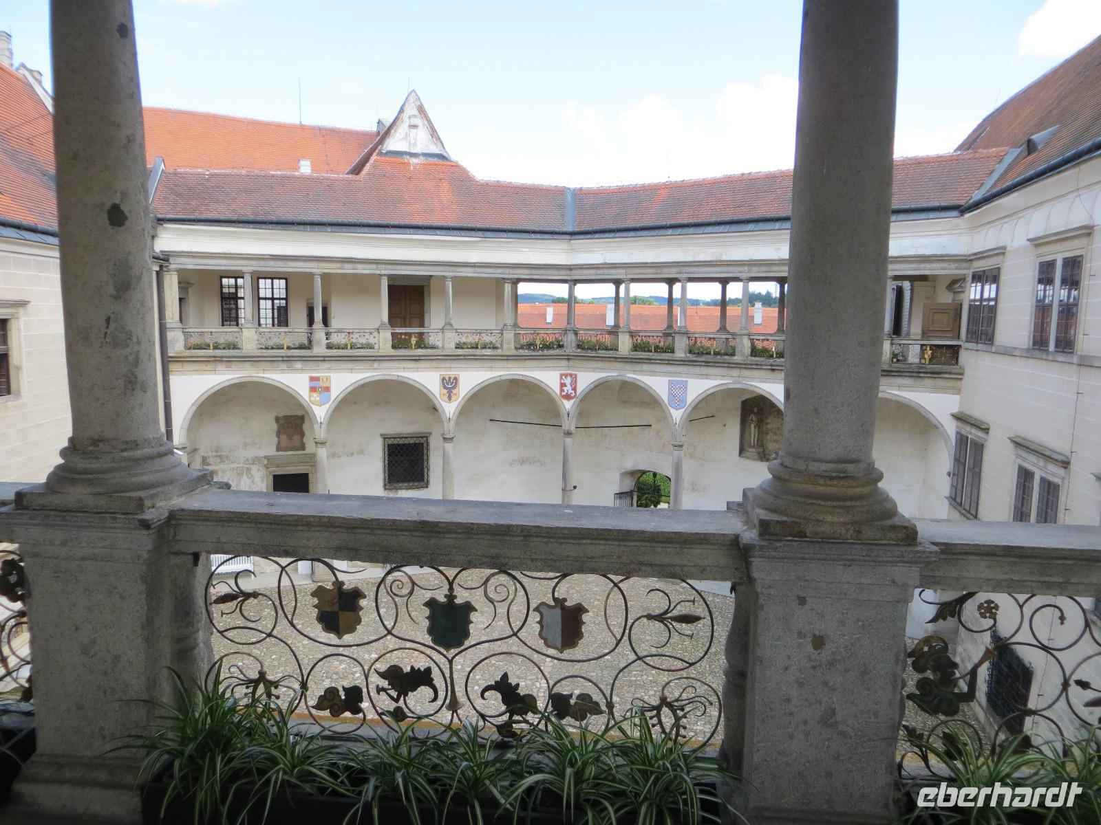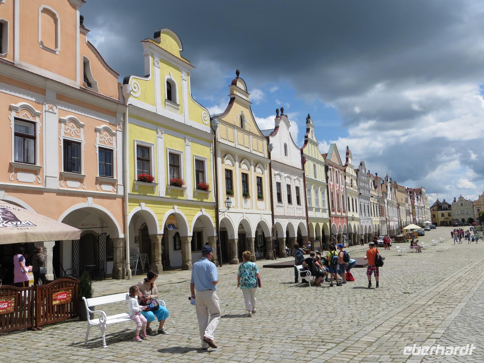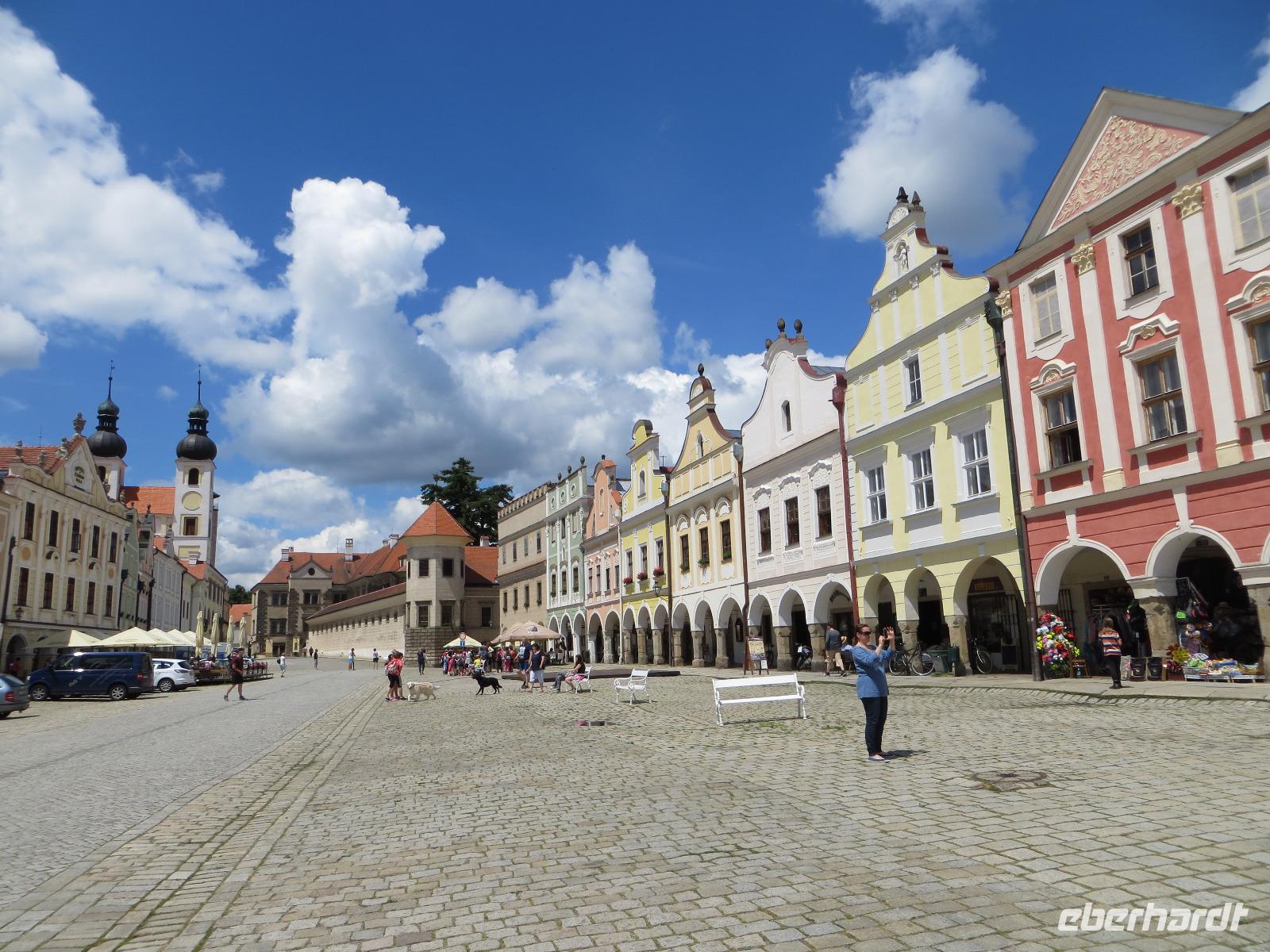 Zur Mittagsstunde ging es weiter nach Telc. Wenige hundert Meter vom Parkplatz entfernt erreichten wir den wohl bedeutendsten Marktplatz Tschechiens, der ob seines Bestandes an wohl siebzig Gebäuden der Spätrenaissance im Übergang zum Barock Welt(erbe)bedeutung hat. Alle Gäste hatten ausreichend Zeit zum individuellen Bummeln und zur Mittagspause. Die Schlossbesichtigung am Nachmittag offerierte uns Schlossräume der Renaissance, oft noch im Originalzustand, mit eindrucksvollen Kassettendecken. Kein Wunder, dass in diesen Räumen mancher Film, insbesondere auch Märchenfilm, entstand.