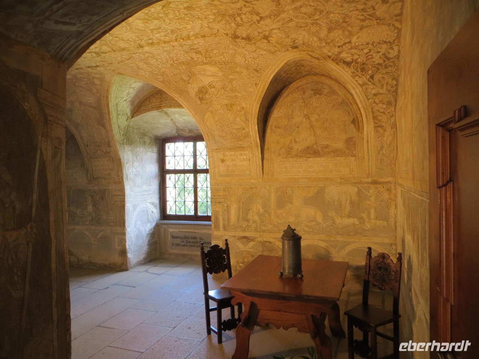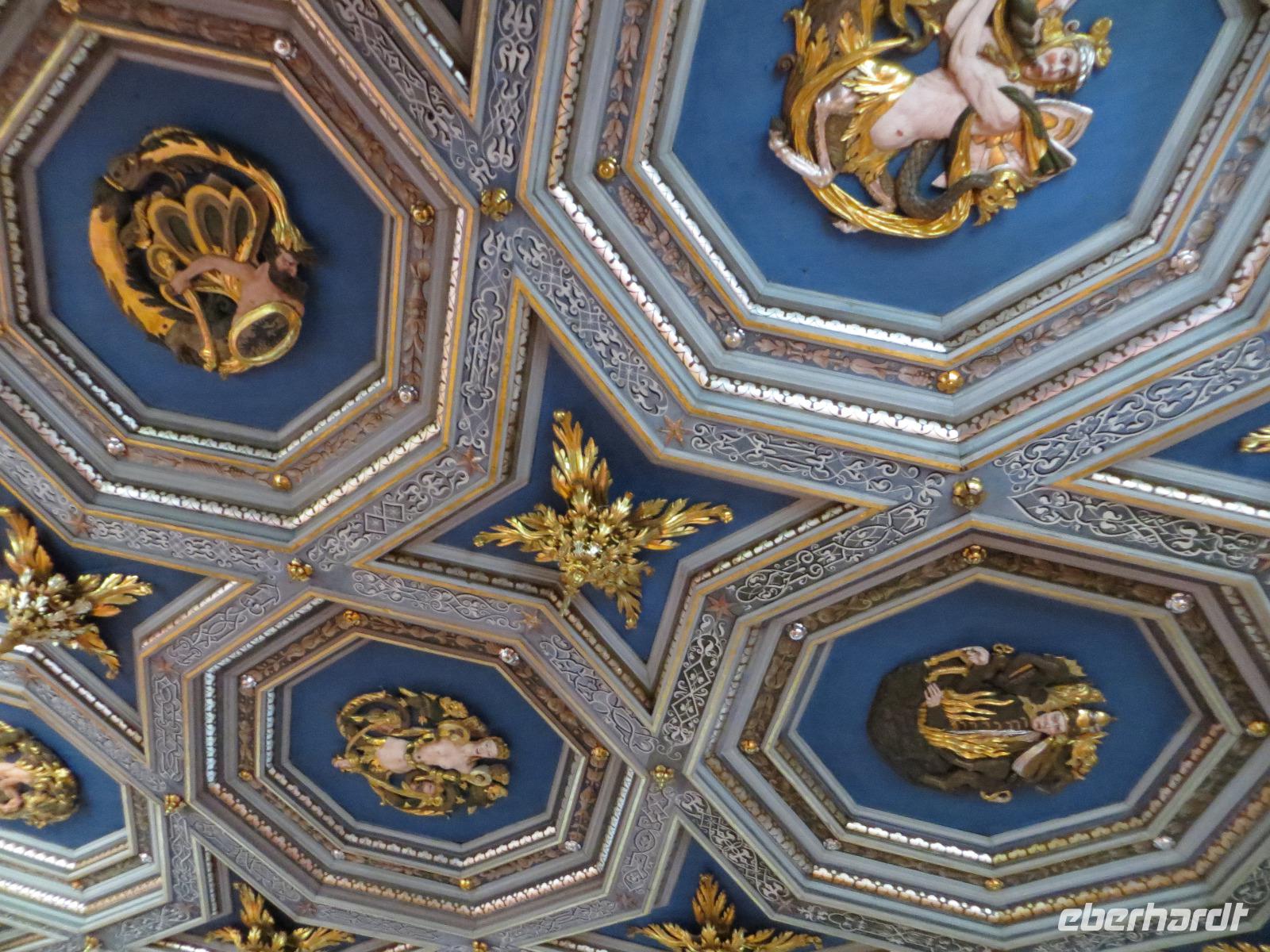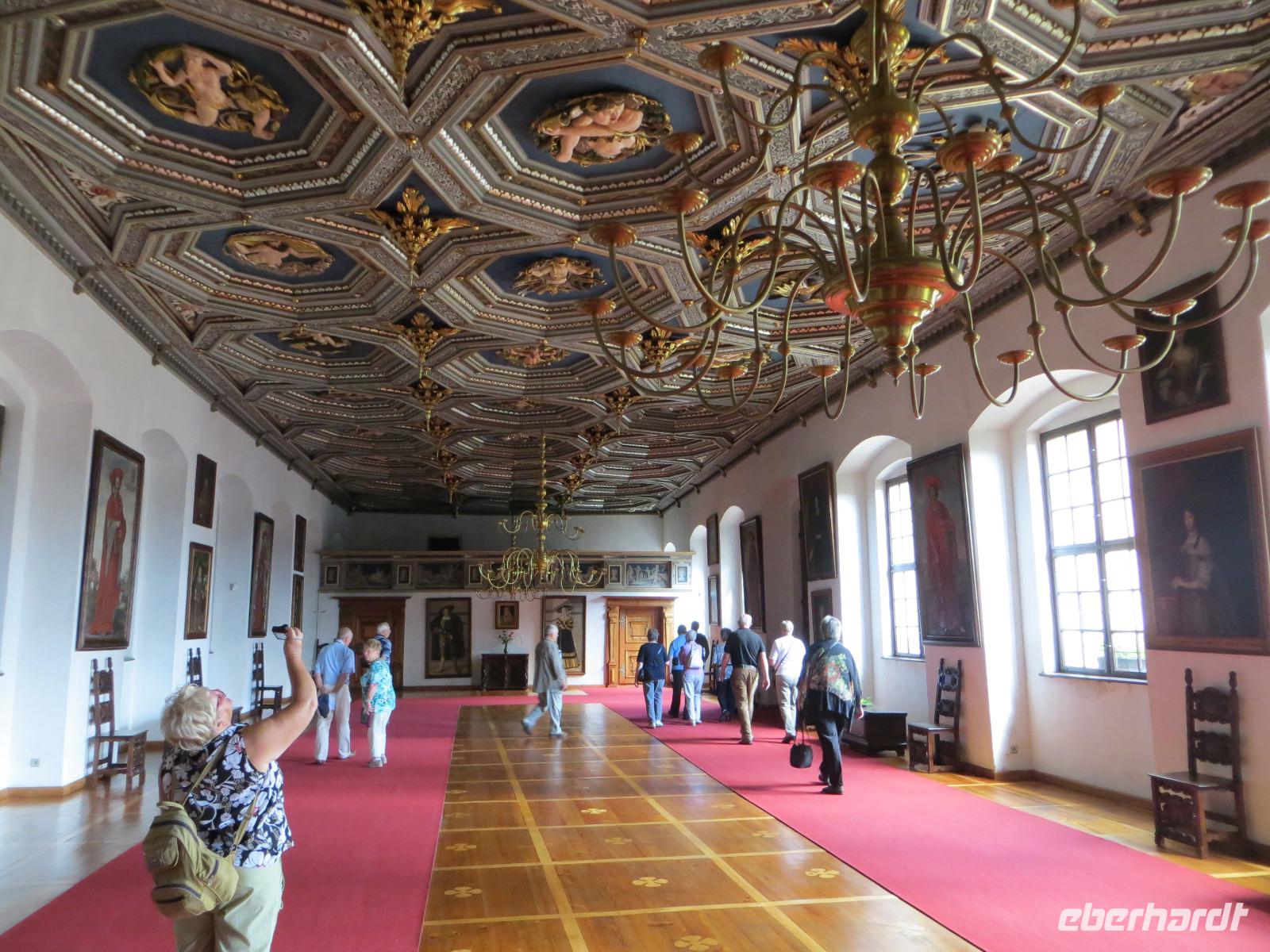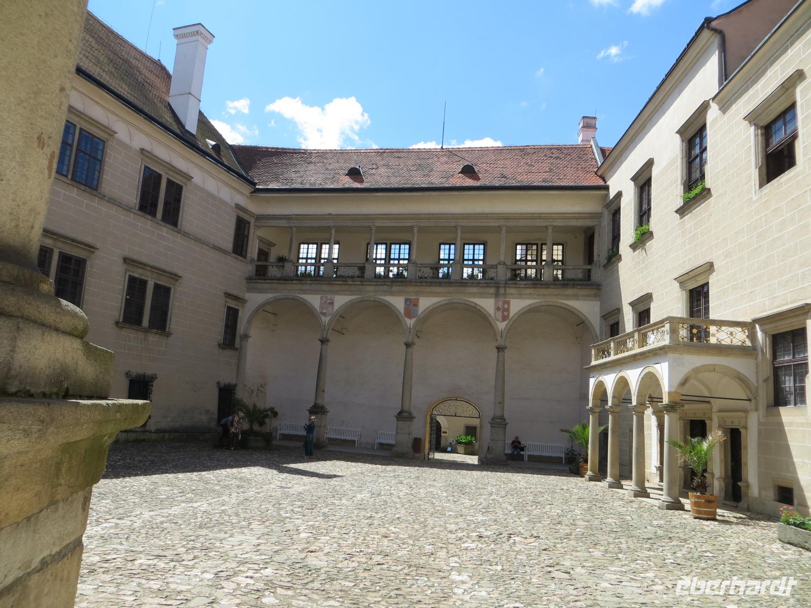 Zur Mittagsstunde ging es weiter nach Telc. Wenige hundert Meter vom Parkplatz entfernt erreichten wir den wohl bedeutendsten Marktplatz Tschechiens, der ob seines Bestandes an wohl siebzig Gebäuden der Spätrenaissance im Übergang zum Barock Welt(erbe)bedeutung hat. Alle Gäste hatten ausreichend Zeit zum individuellen Bummeln und zur Mittagspause. Die Schlossbesichtigung am Nachmittag offerierte uns Schlossräume der Renaissance, oft noch im Originalzustand, mit eindrucksvollen Kassettendecken. Kein Wunder, dass in diesen Räumen mancher Film, insbesondere auch Märchenfilm, entstand.