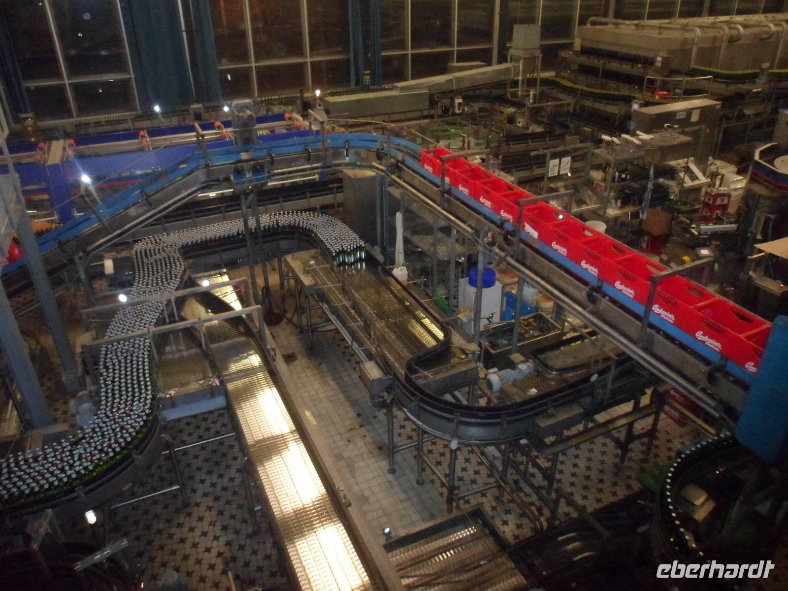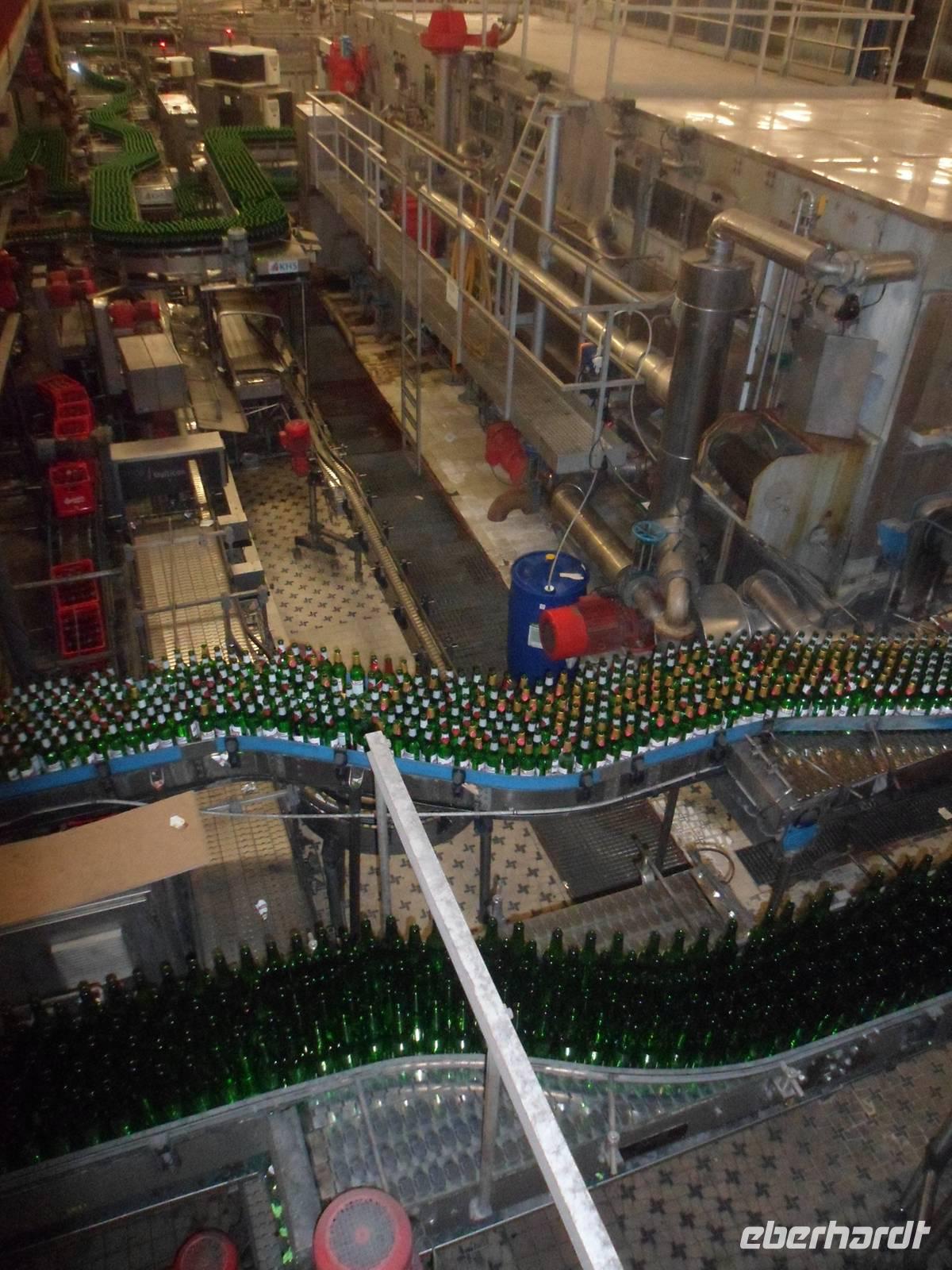 Nach vielen Treppen steigen nach unten und oben betraten wir über die neue Verbindungsbrücke die riesige Abfüllhalle. Hier konnten wir den Ablauf von der Verpackung bis hin zur abgegebenen Flasche beobachten. Es war so interessant, dass einige Gäste nicht weitergehen wollten - nur noch zusehen, wie die Bierflaschen auf den Bändern gereinigt, befüllt und verpackt werden.