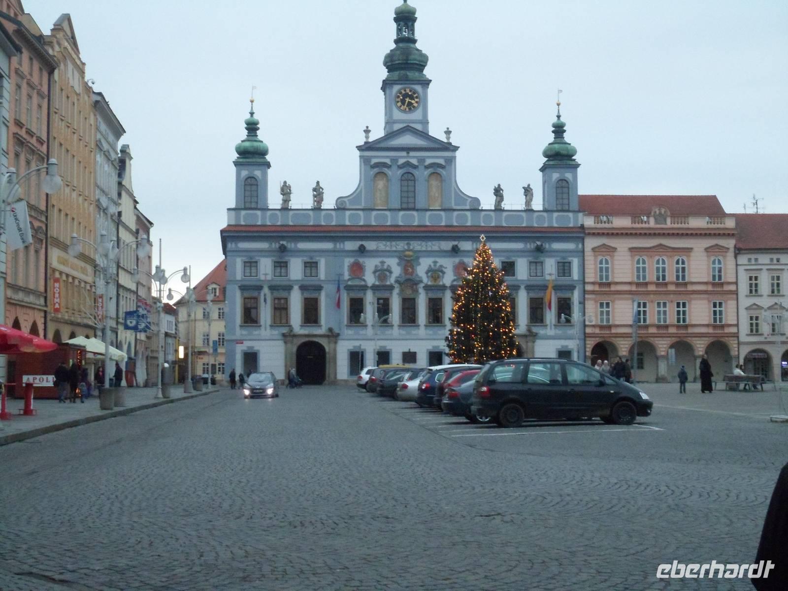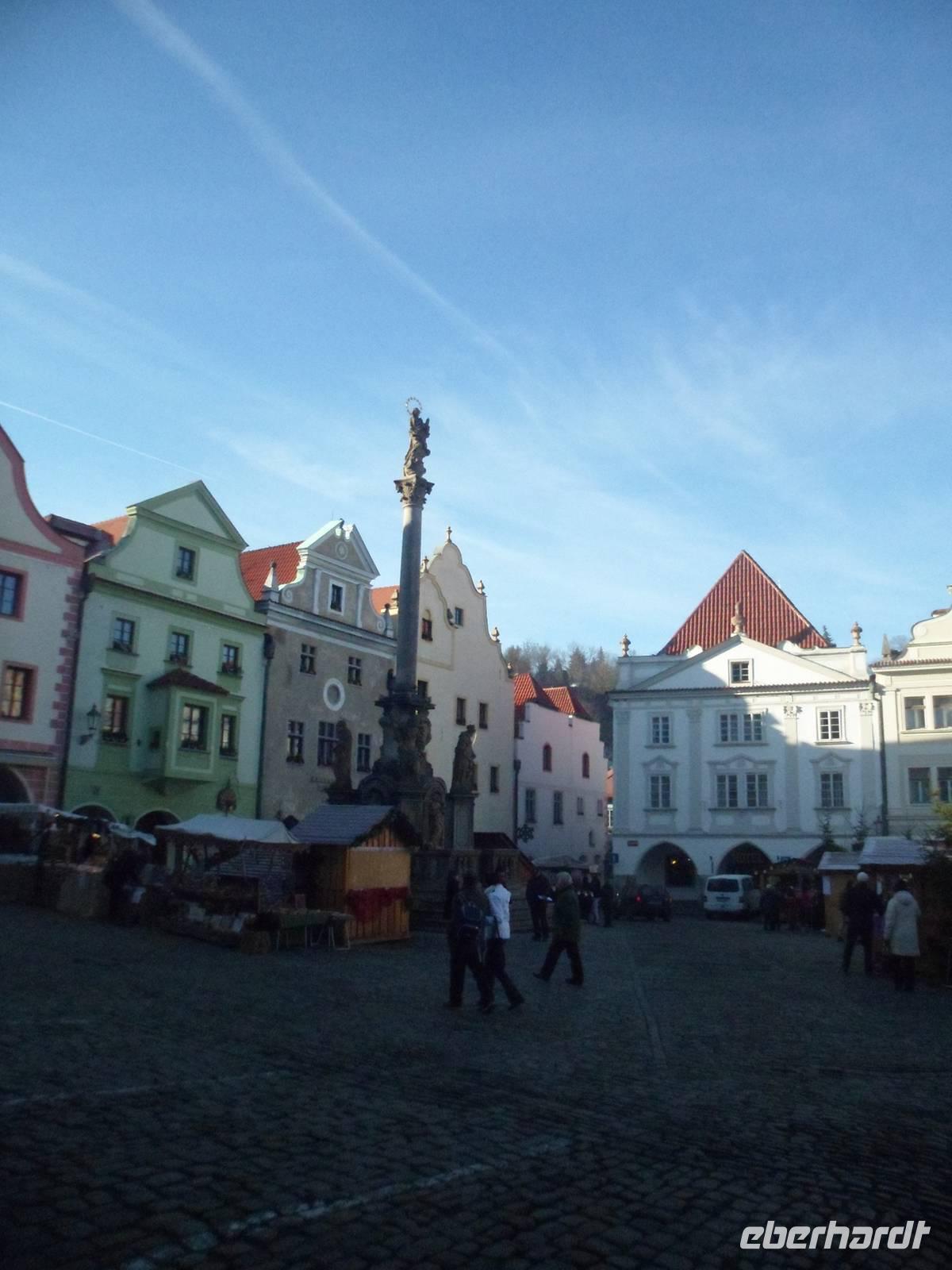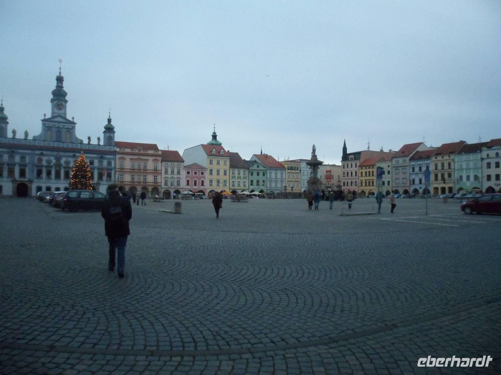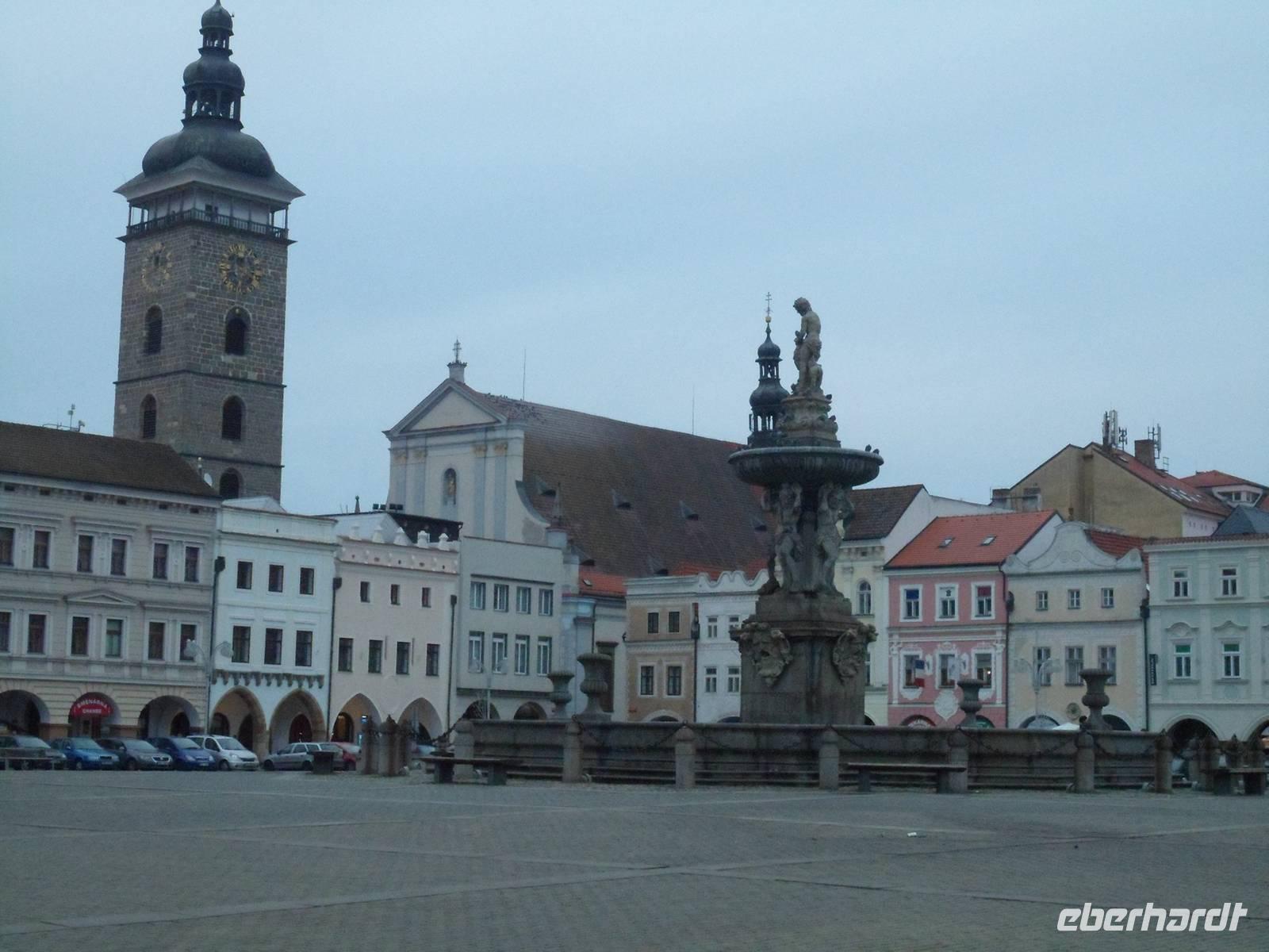 Inmitten des Platzes steht der barocke Samson-Brunnen, der größte seiner Art in Tschechien. Obenauf sieht man Samson mit einem Löwen kämpfen. Unser Rundgang führte uns zum Wahrzeichen der Stadt, den 72 m hohen Schwarzen Turm (höchste Gebäude der Stadt) neben den Dom St.-Nikolaus. Zur Aussichtsterrasse führen 225 Stufen, von der man an klaren Tagen bis zum Böhmerwald und den Alpen blicken kann.