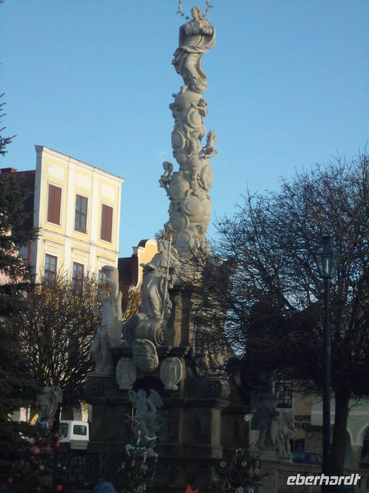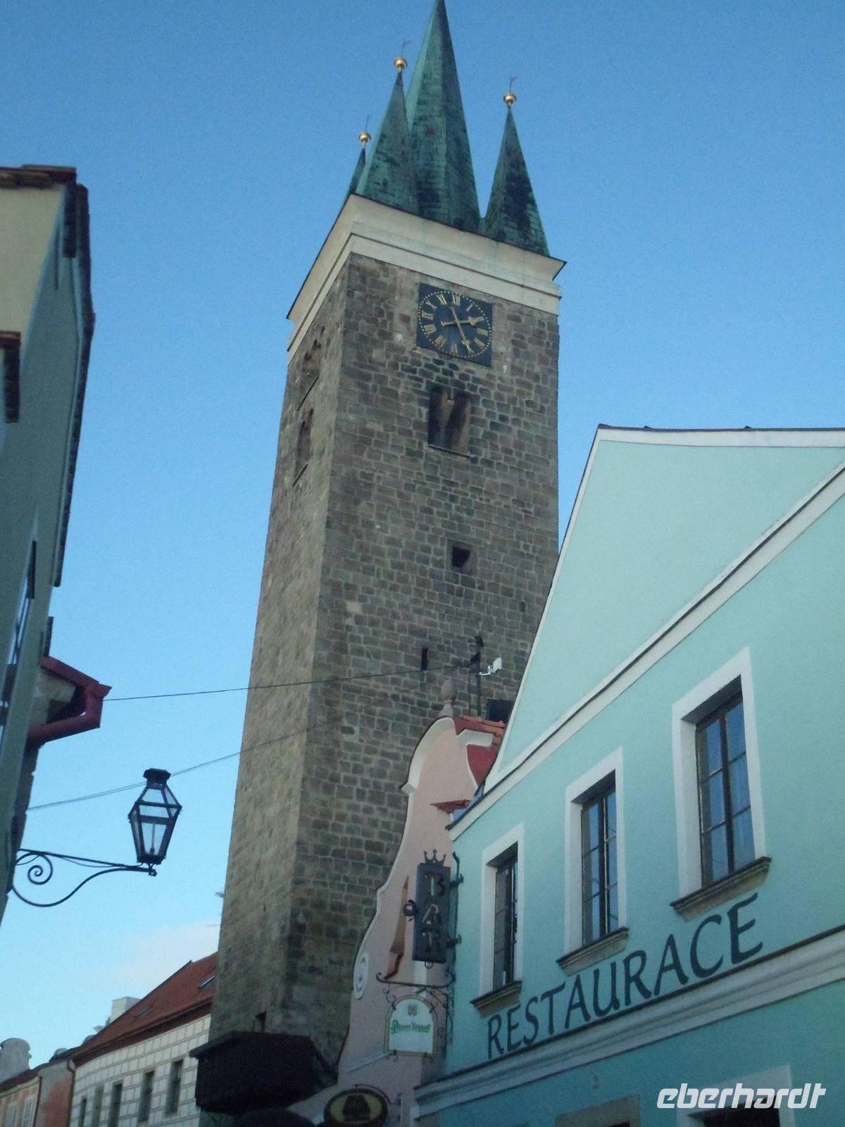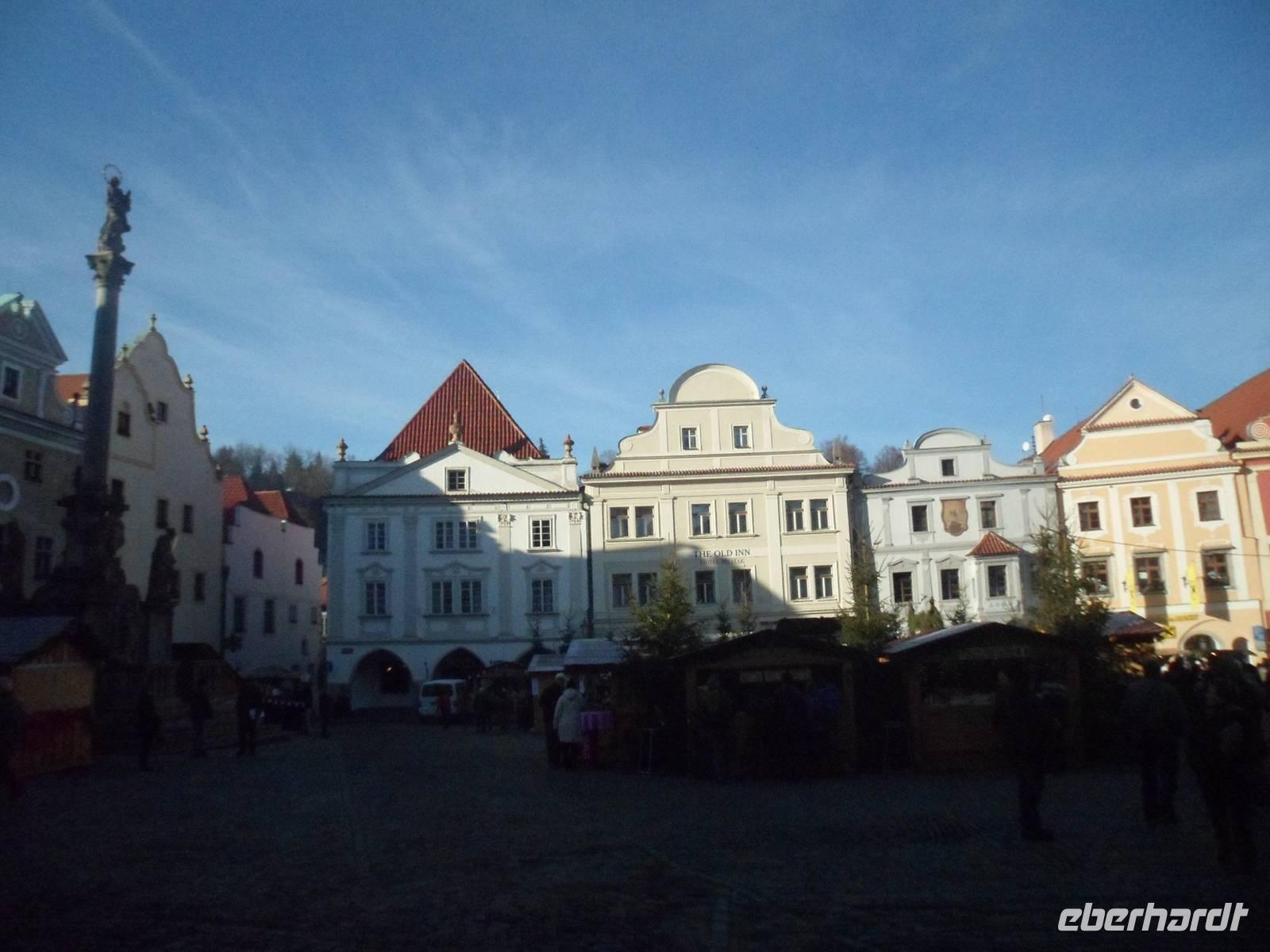 Inmitten des Platzes steht der barocke Samson-Brunnen, der größte seiner Art in Tschechien. Obenauf sieht man Samson mit einem Löwen kämpfen. Unser Rundgang führte uns zum Wahrzeichen der Stadt, den 72 m hohen Schwarzen Turm (höchste Gebäude der Stadt) neben den Dom St.-Nikolaus. Zur Aussichtsterrasse führen 225 Stufen, von der man an klaren Tagen bis zum Böhmerwald und den Alpen blicken kann.