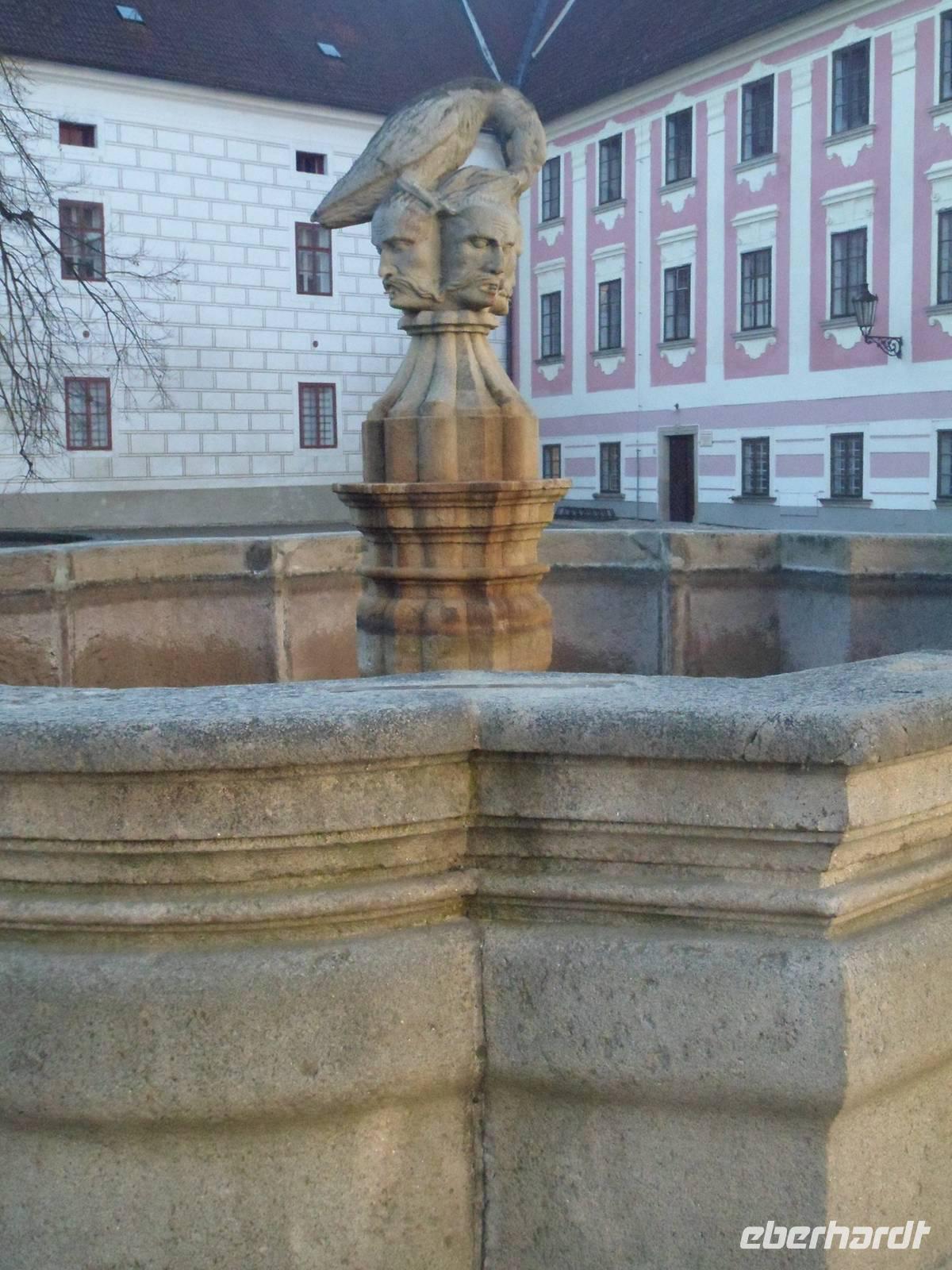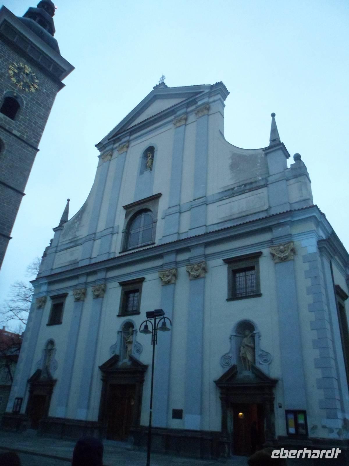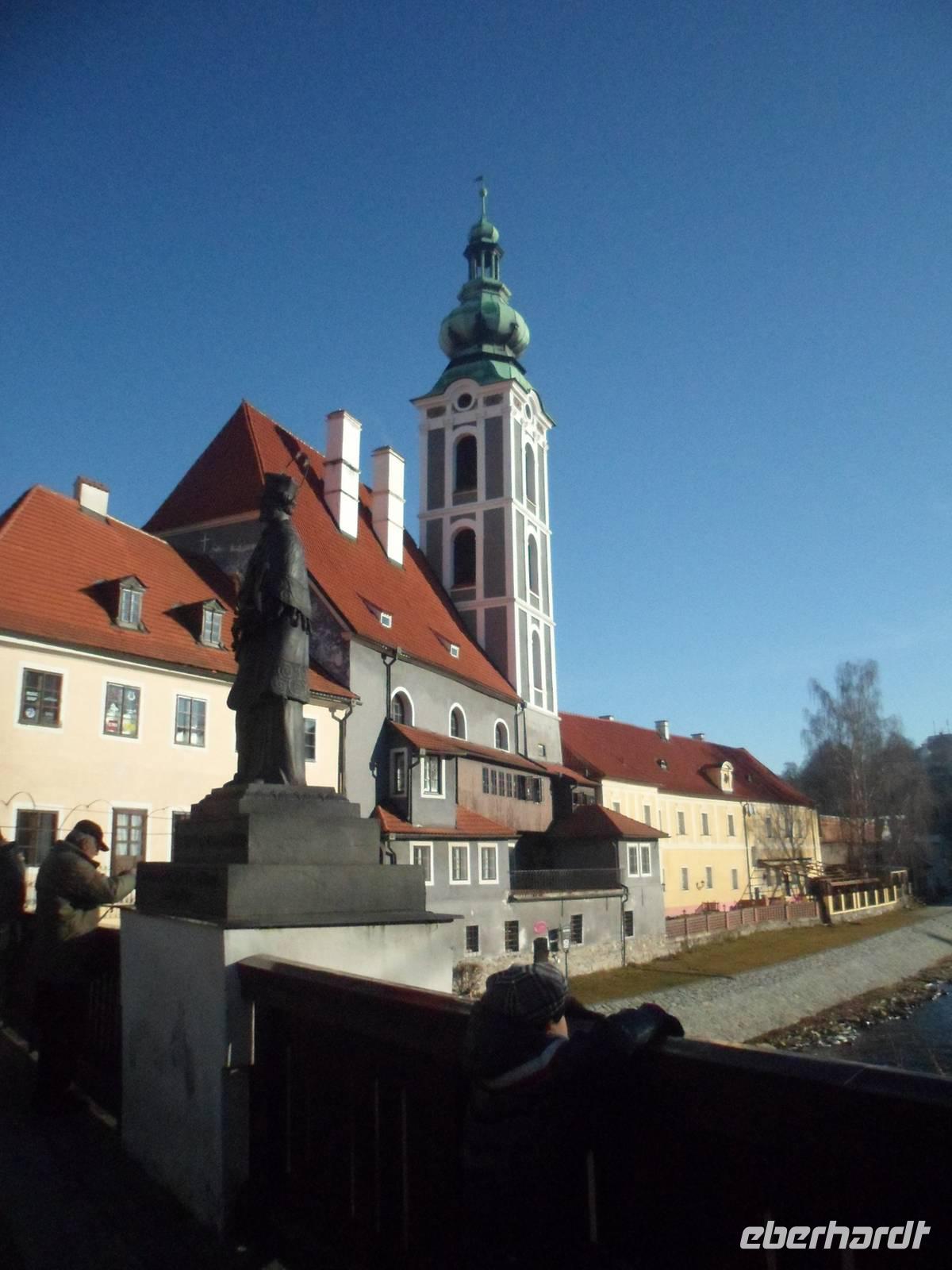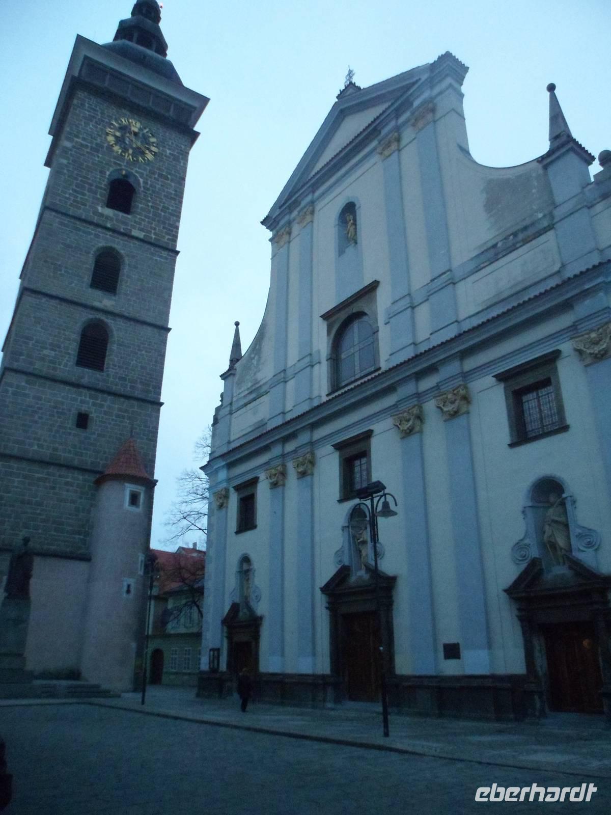 Inmitten des Platzes steht der barocke Samson-Brunnen, der größte seiner Art in Tschechien. Obenauf sieht man Samson mit einem Löwen kämpfen. Unser Rundgang führte uns zum Wahrzeichen der Stadt, den 72 m hohen Schwarzen Turm (höchste Gebäude der Stadt) neben den Dom St.-Nikolaus. Zur Aussichtsterrasse führen 225 Stufen, von der man an klaren Tagen bis zum Böhmerwald und den Alpen blicken kann.